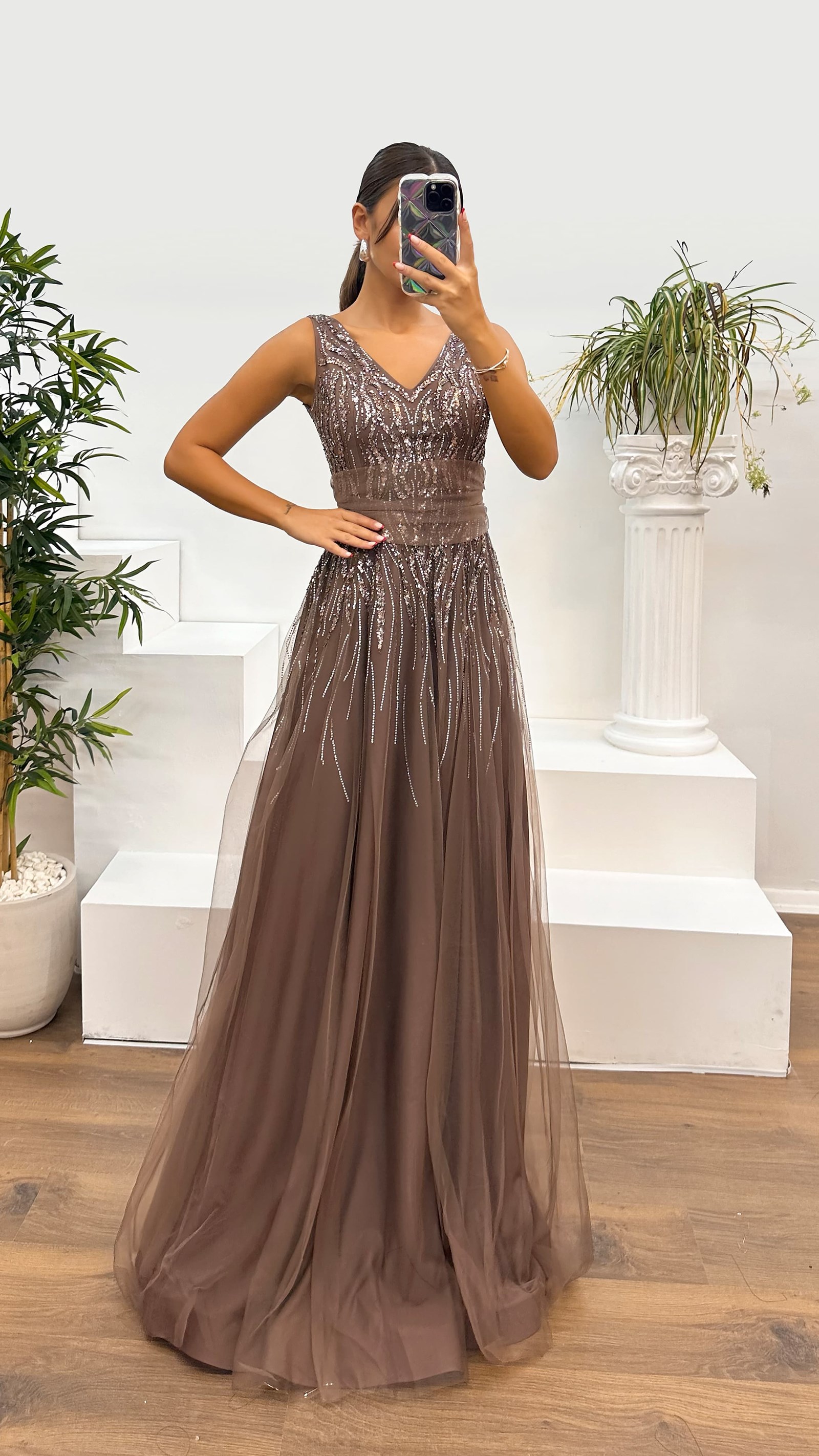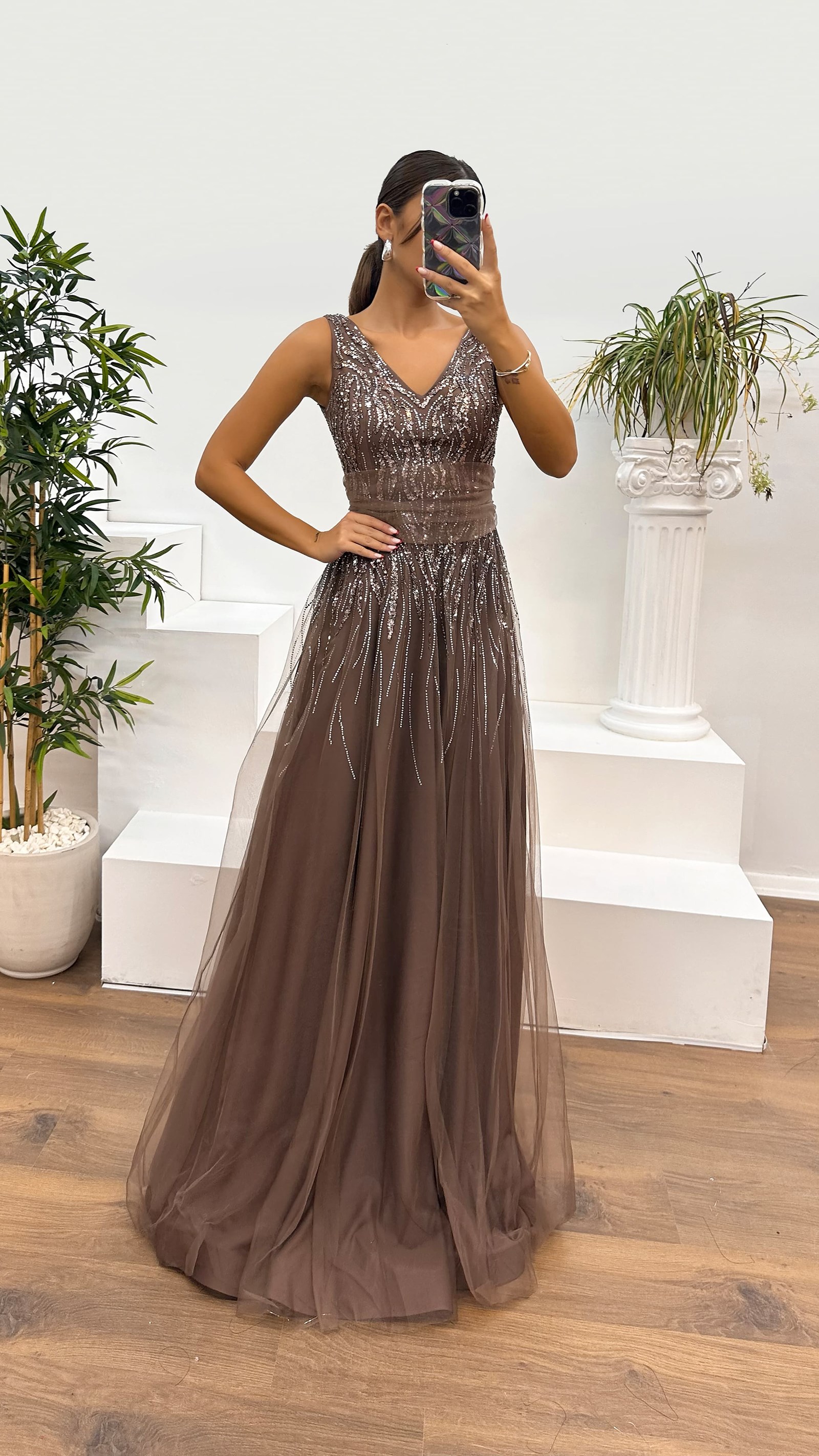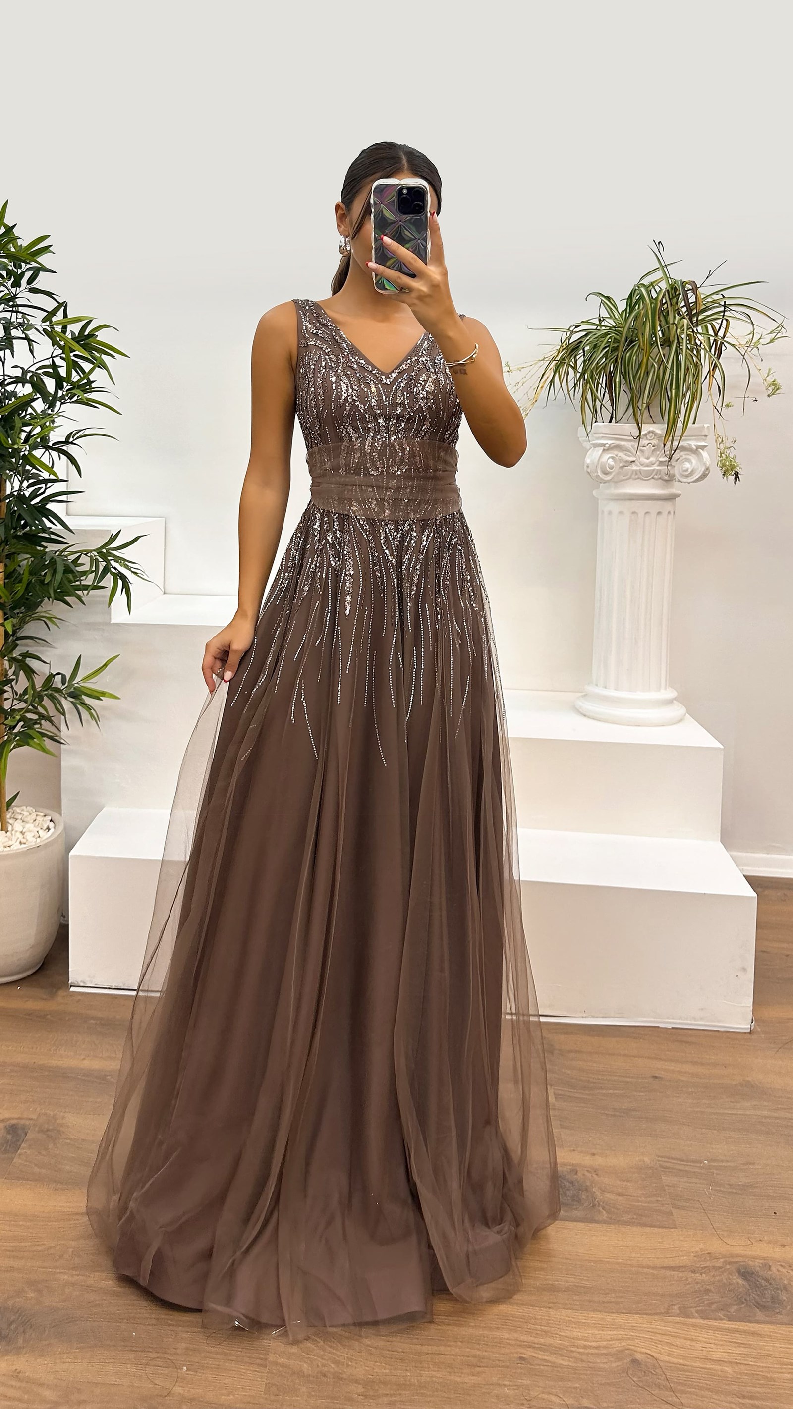 • Kahverengi V Yaka İşlemeli Tül Abiye Elbise