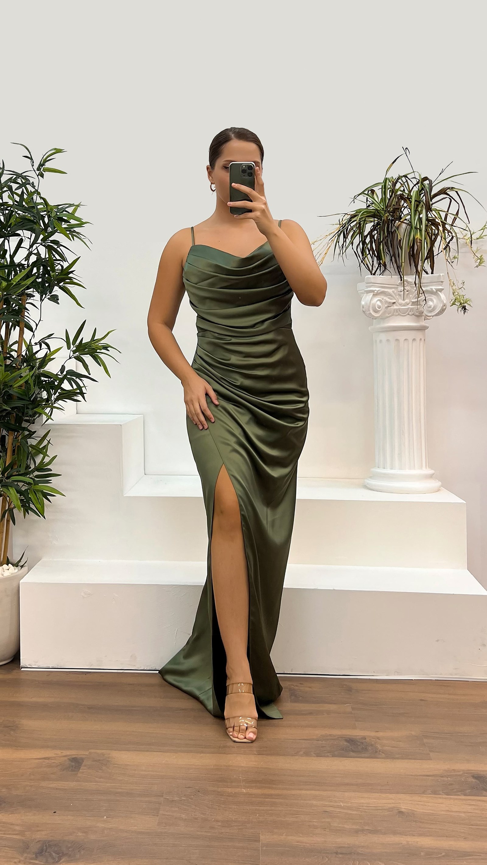 • Haki İp Askılı Drapeli Saten Büyük Beden Abiye Elbise