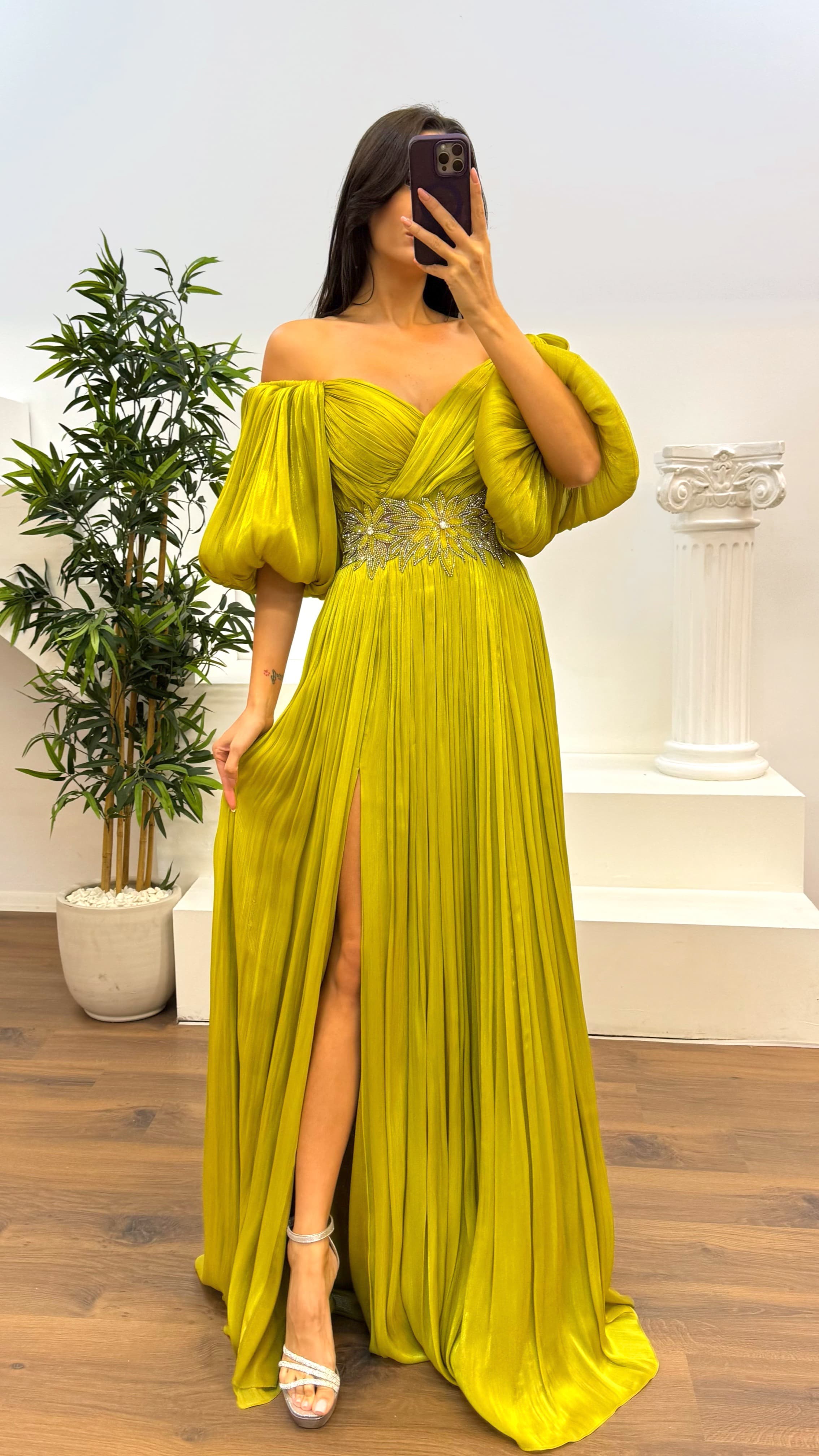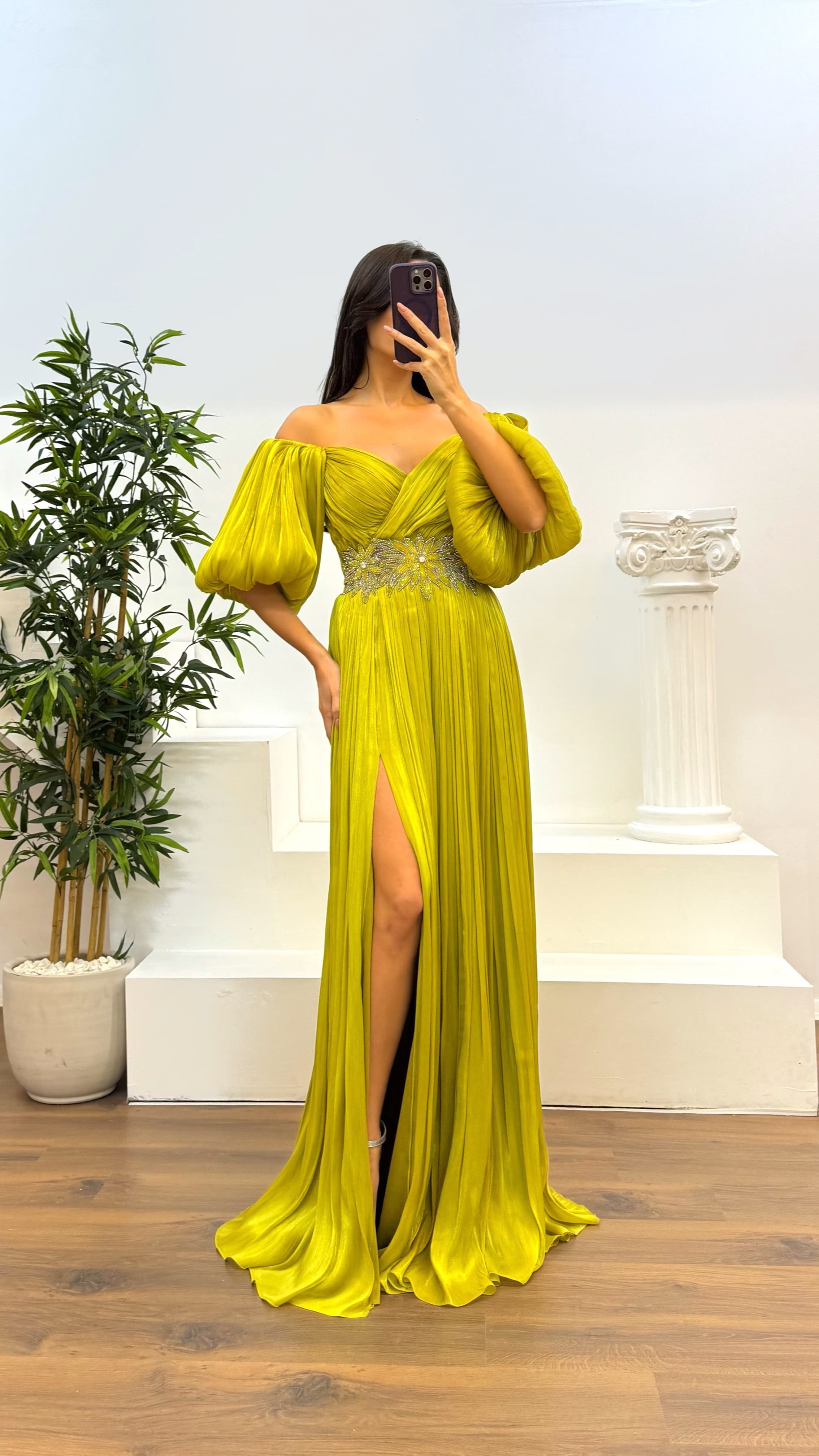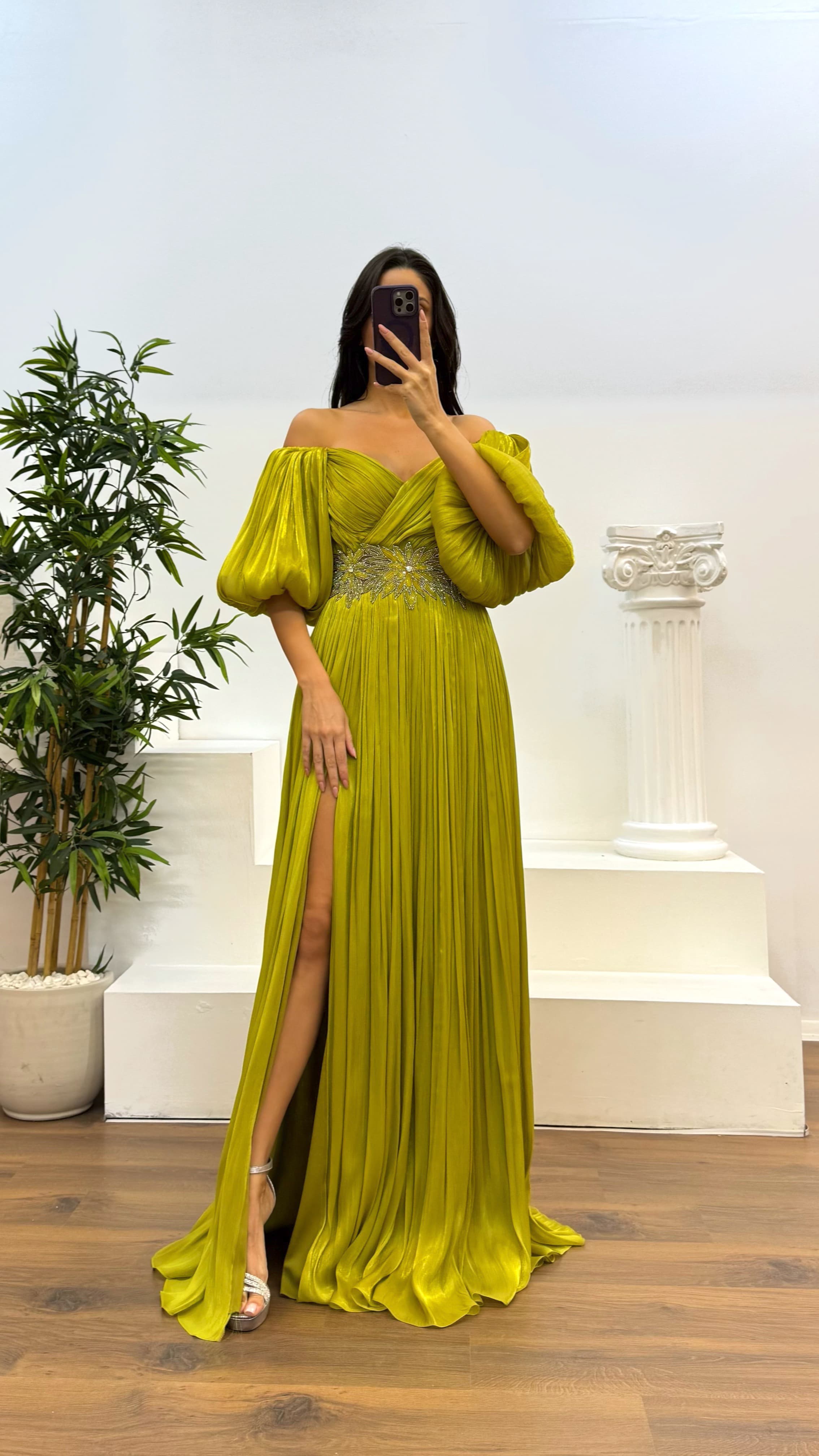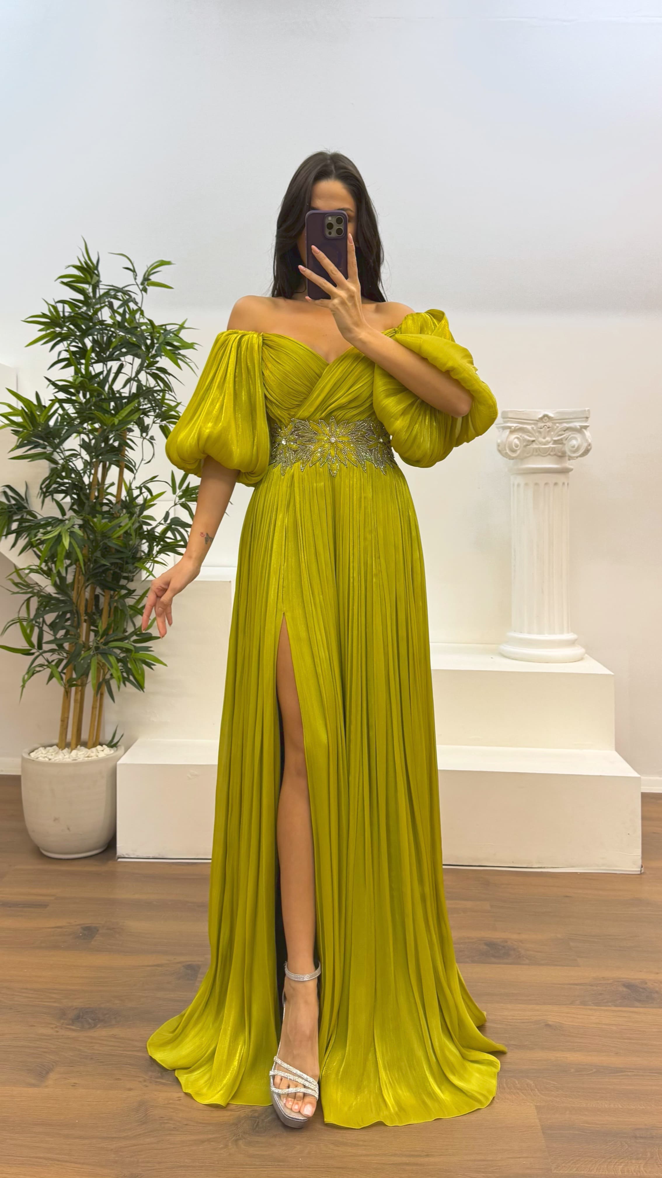 Abito da Sera Plissettato con Maniche a Pallone Il prodotto è compatibile con le taglie dalla 36 alla 42, con coppe per il seno, foderato, chiusura con zip sul retro, con spacco e dettagli in vita, progettato come un abito da sera. Lunghezza del prodotto: 160 cm. Tipo di tessuto: chiffon 66% viscosa 34% poliestere.