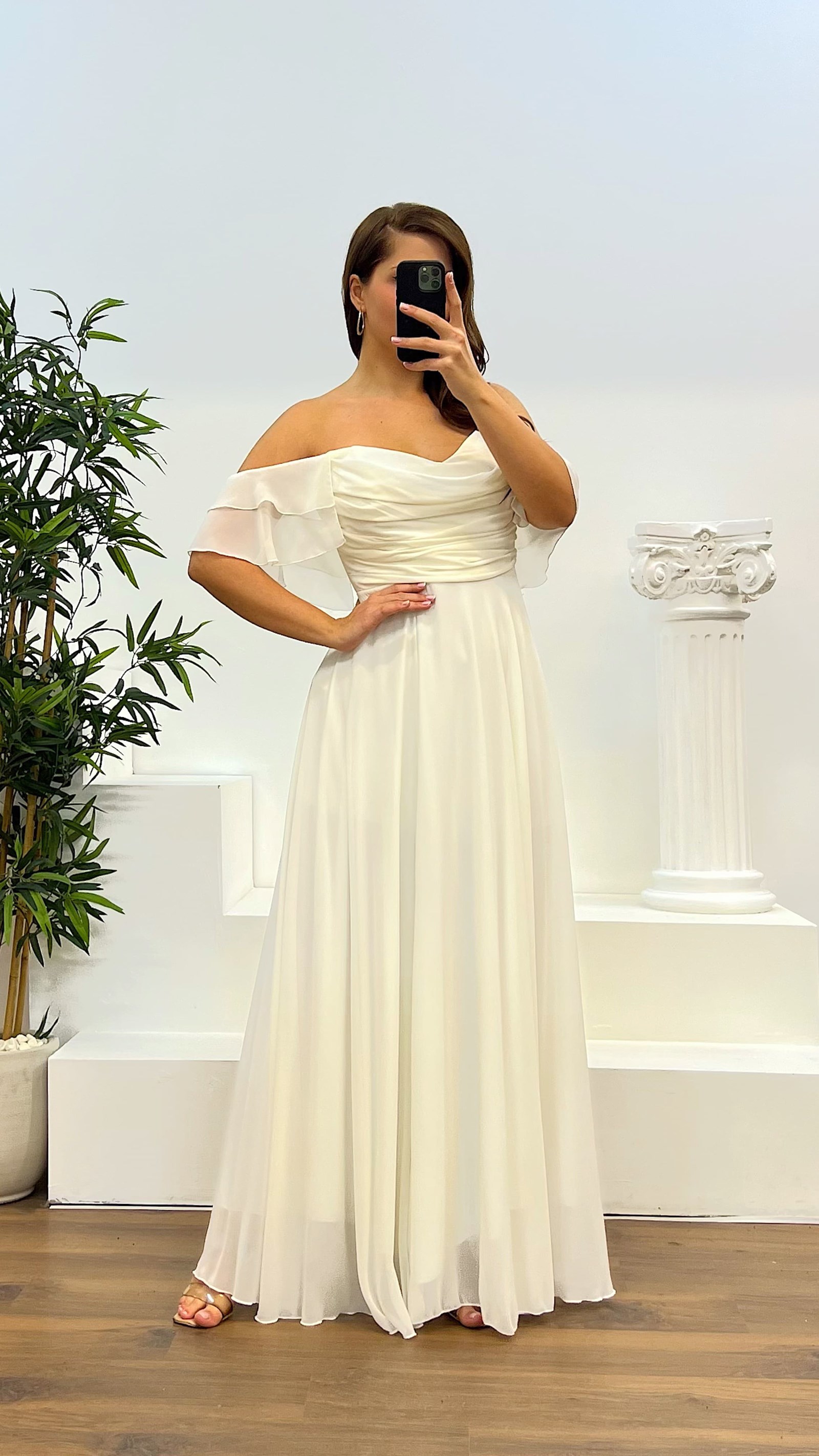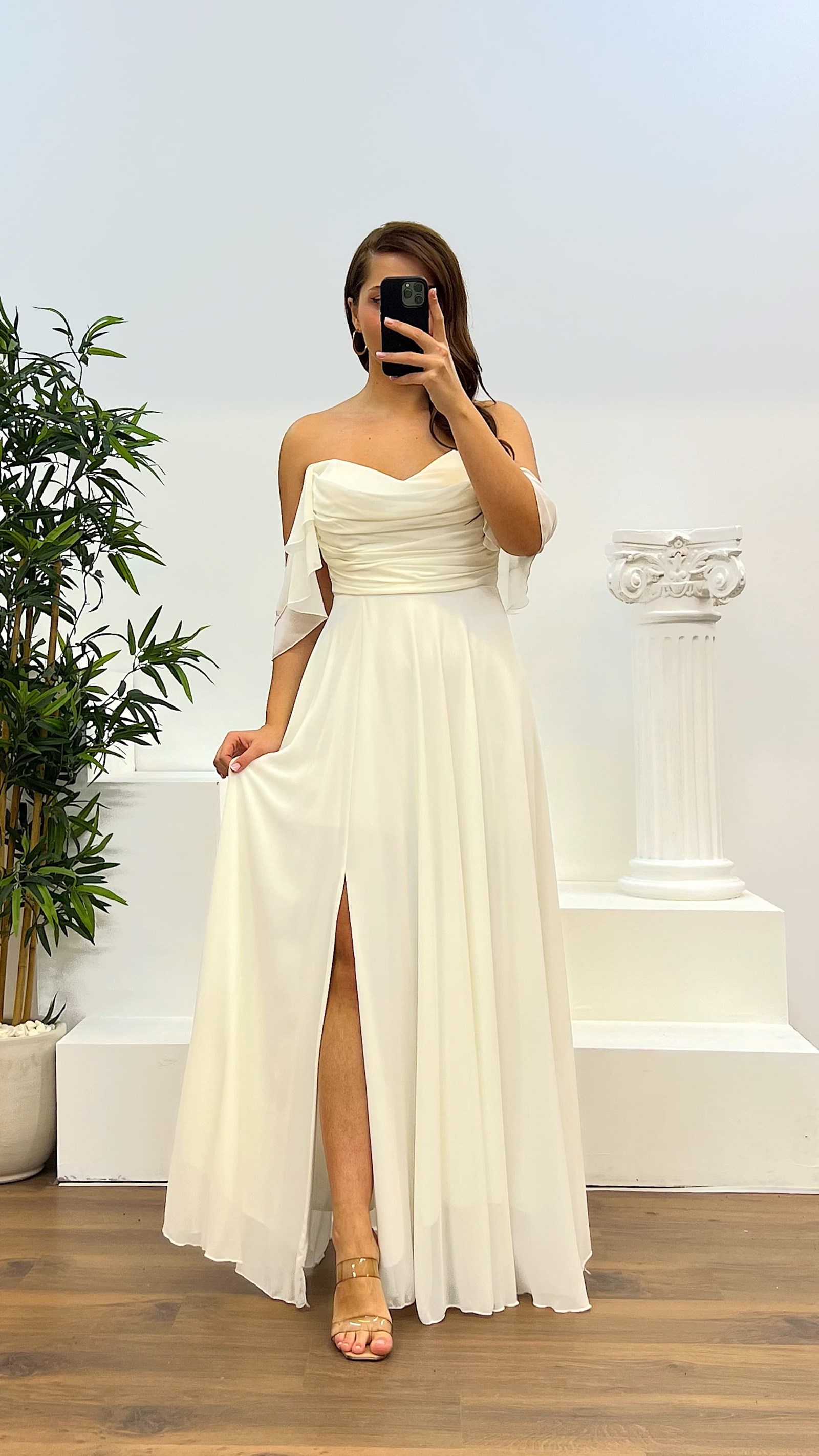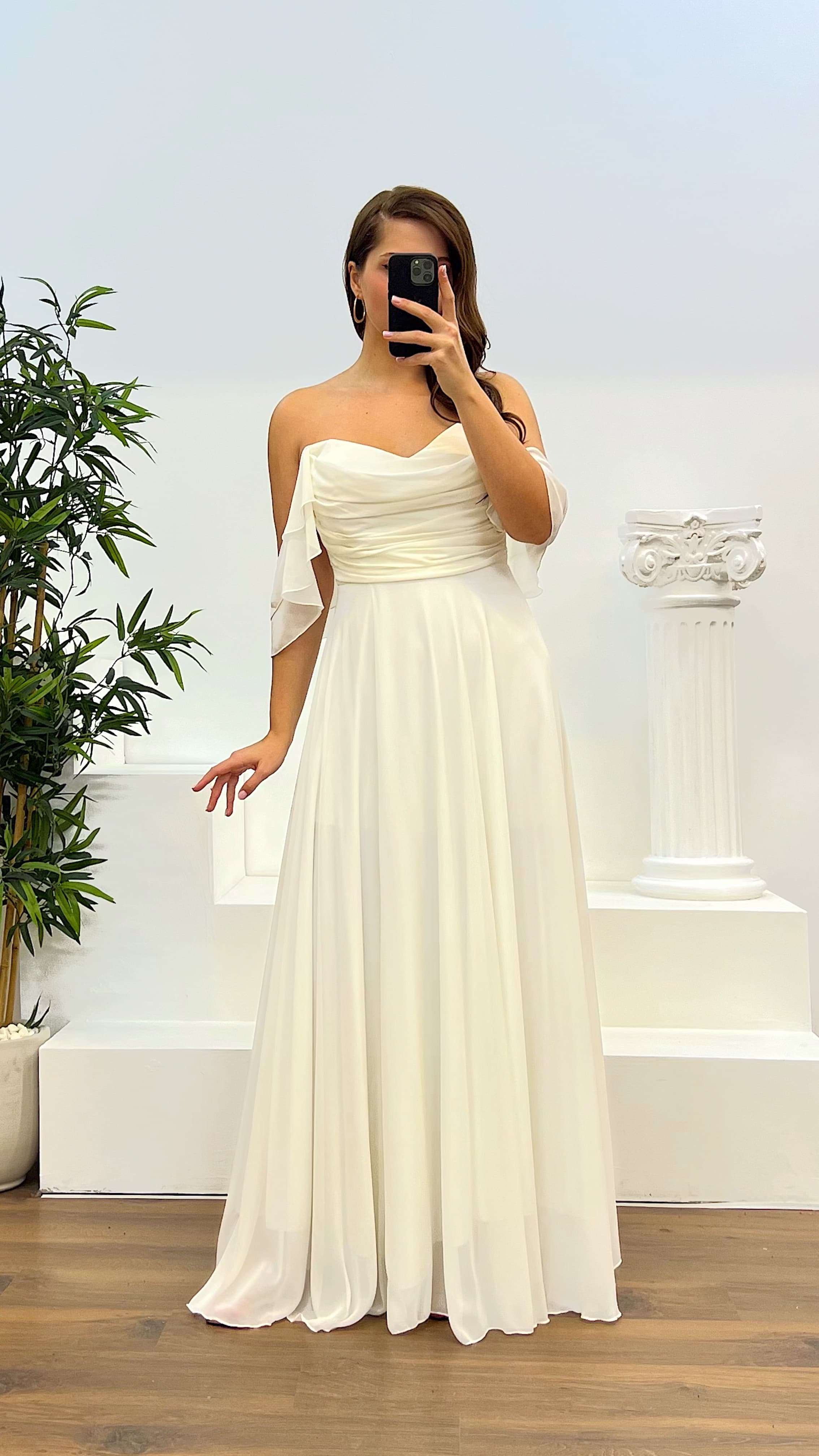 Abito da sera con drappeggio sul seno Il prodotto è compatibile con le taglie dalla 46 alla 50, con imbottitura sul seno, foderato, con chiusura a zip sul retro e spacco laterale. La lunghezza del prodotto è di 60 cm. Tipo di tessuto: chiffon 66% viscosa 34% poliestere.