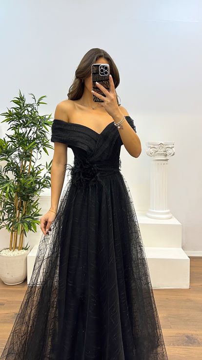 • Siyah Madonna Yaka Tül Abiye Elbise