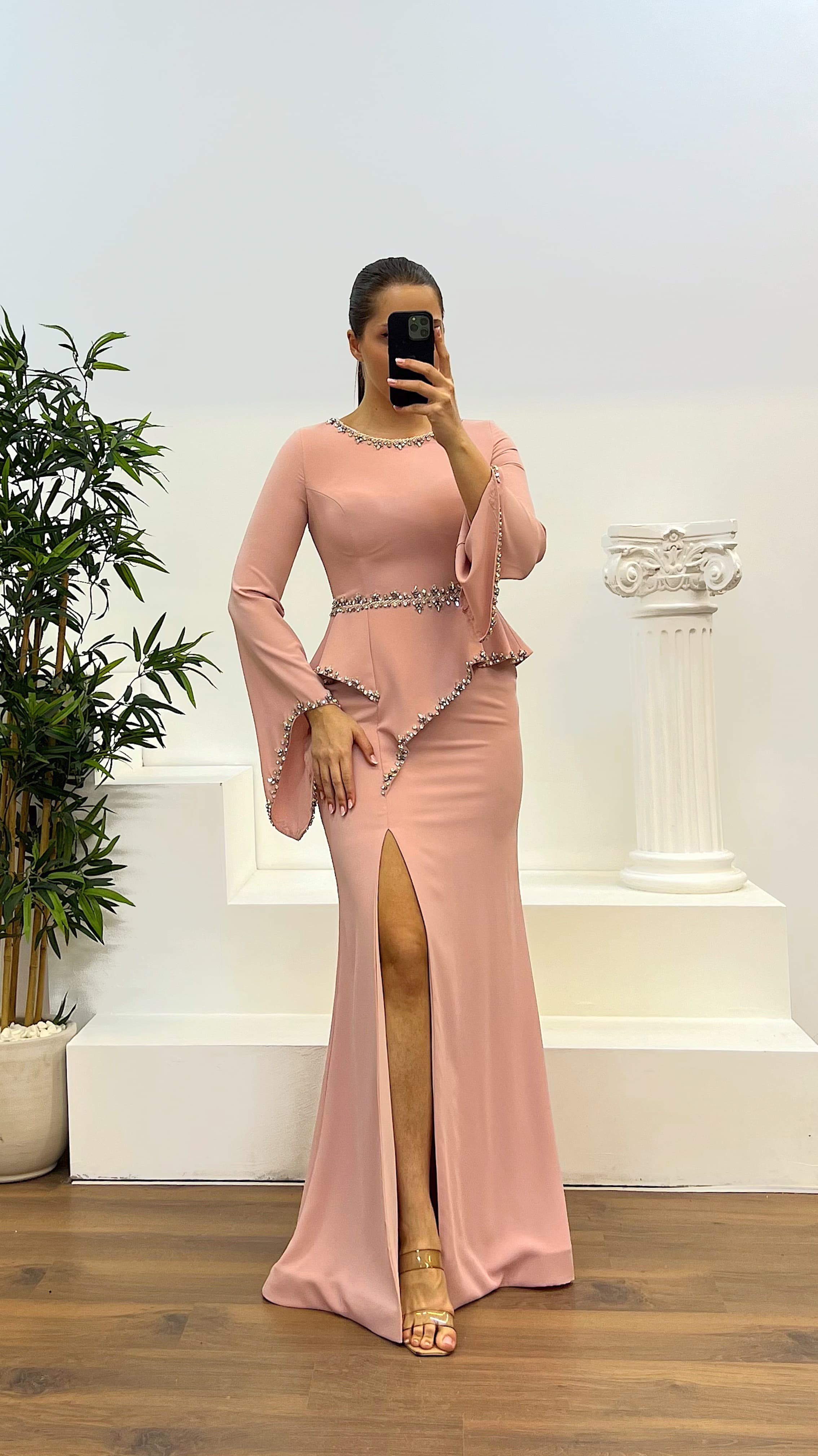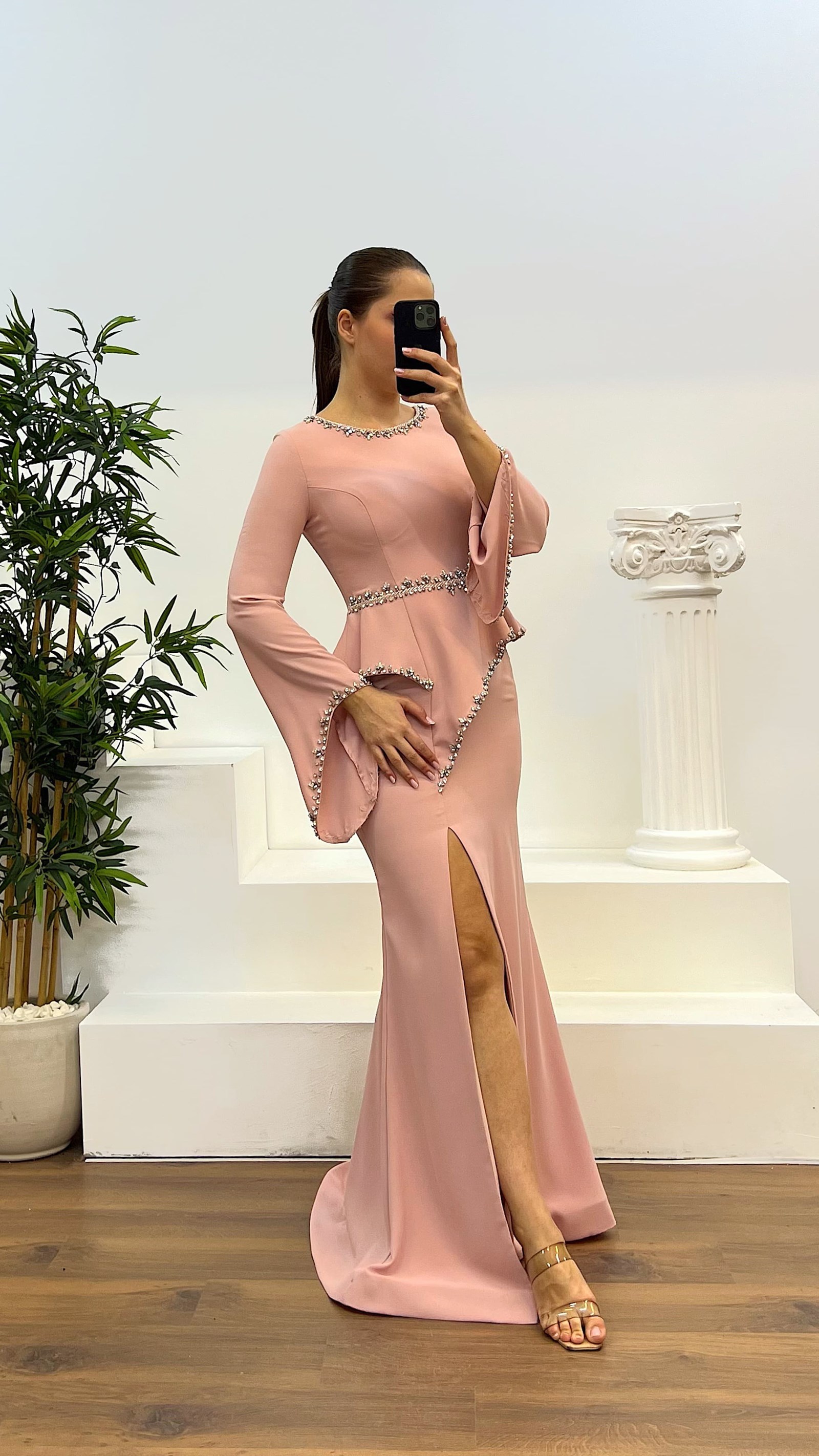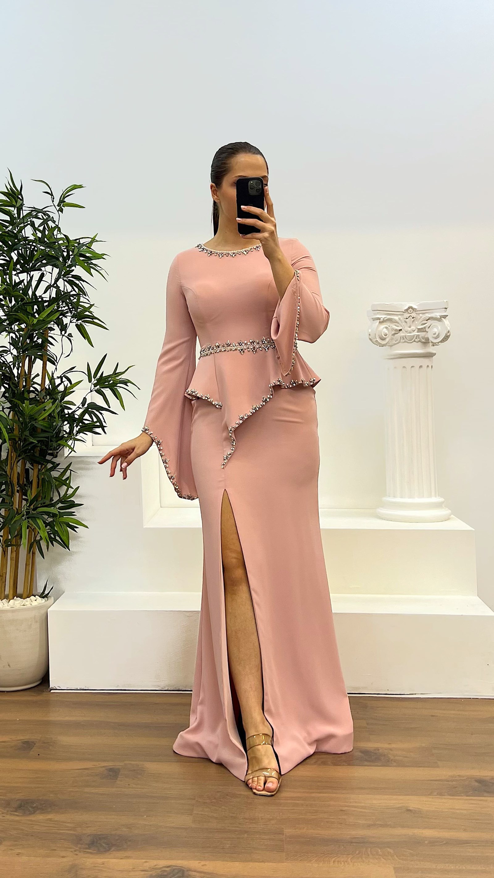• Pudra Taş işlemeli Volanli Kol Detay Büyük Beden Tasarım Elbise