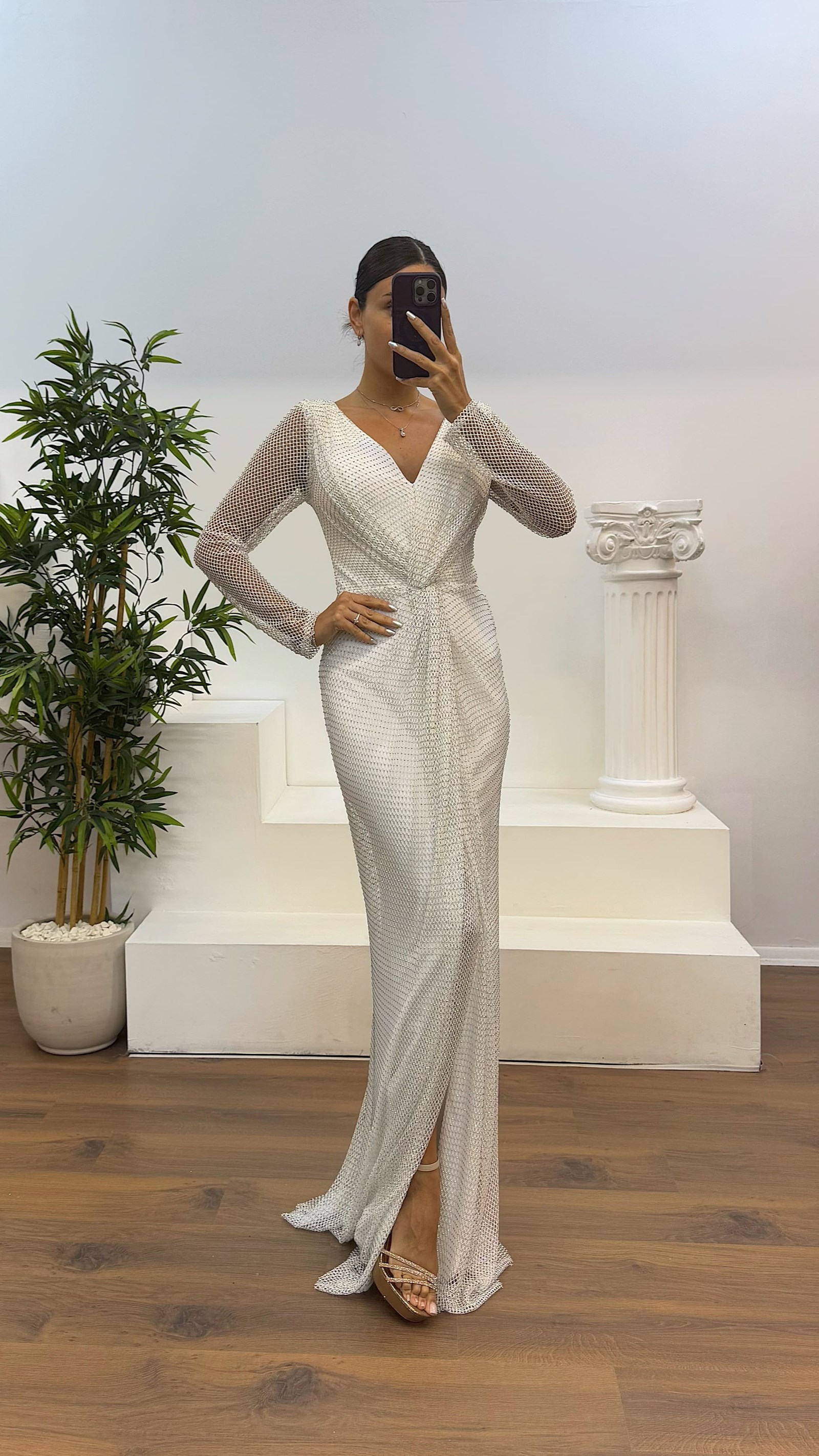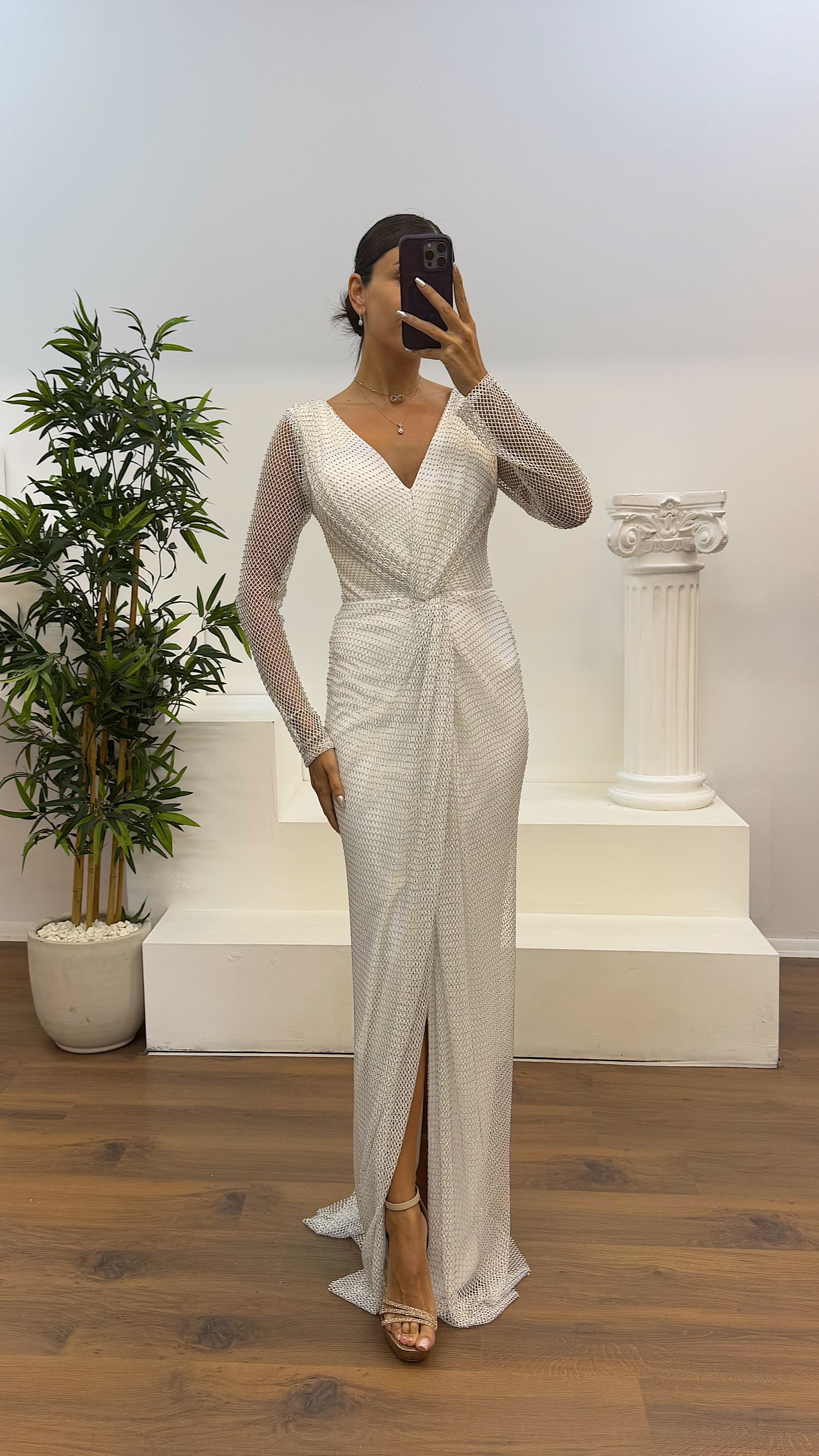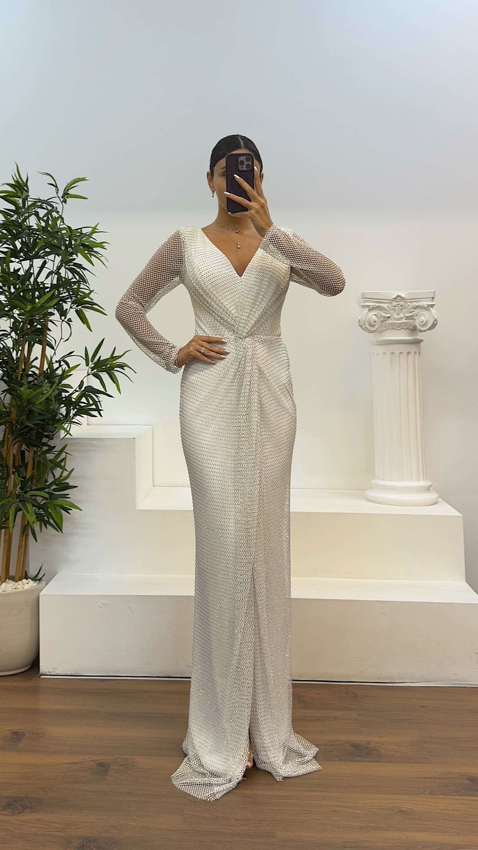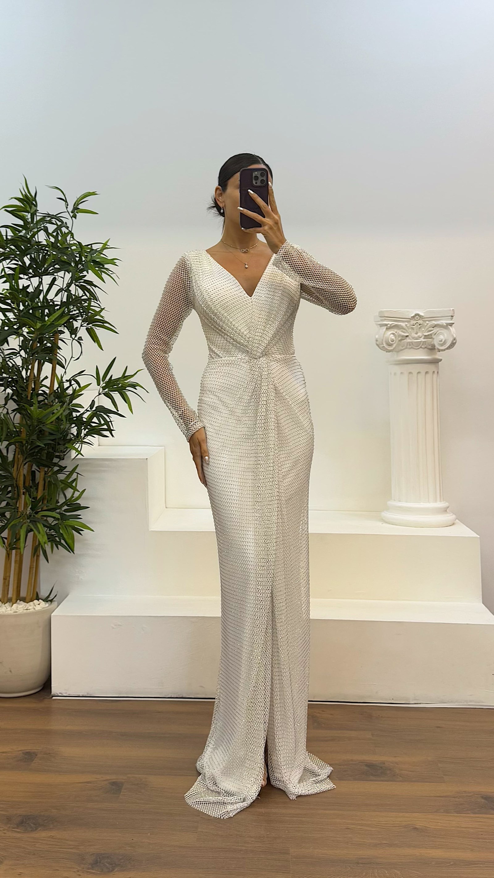 Abito da sera in rete con scollo a V Il prodotto è compatibile con le taglie dalla 36 alla 42, progettato con imbottiture per il seno, foderato, con cerniera sul retro e spacco. Lunghezza del prodotto: può variare tra i 165 e i 170 cm. Lunghezza delle maniche del prodotto: 60 cm. Tipo di tessuto: tessuto in rete con pietre.