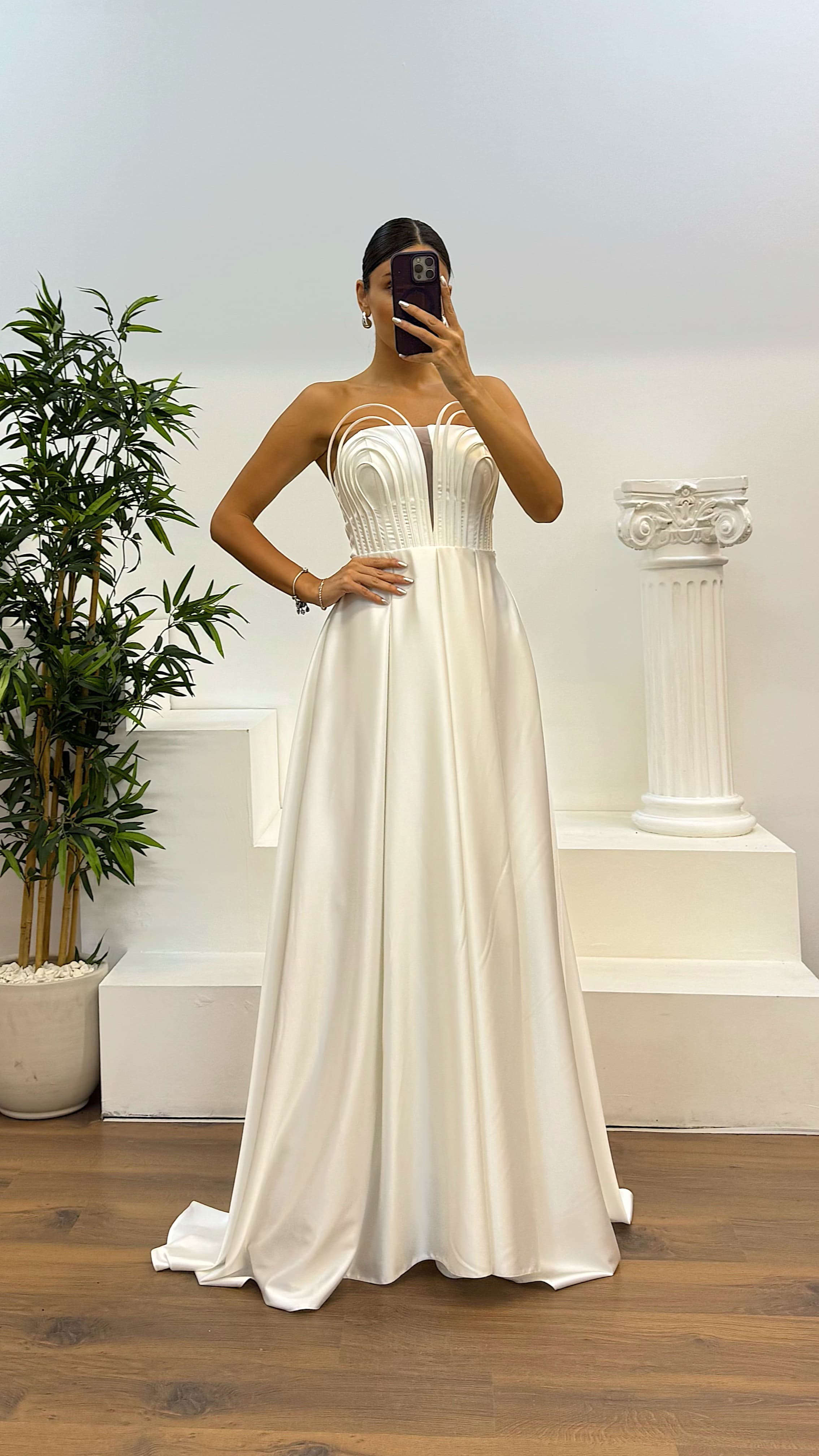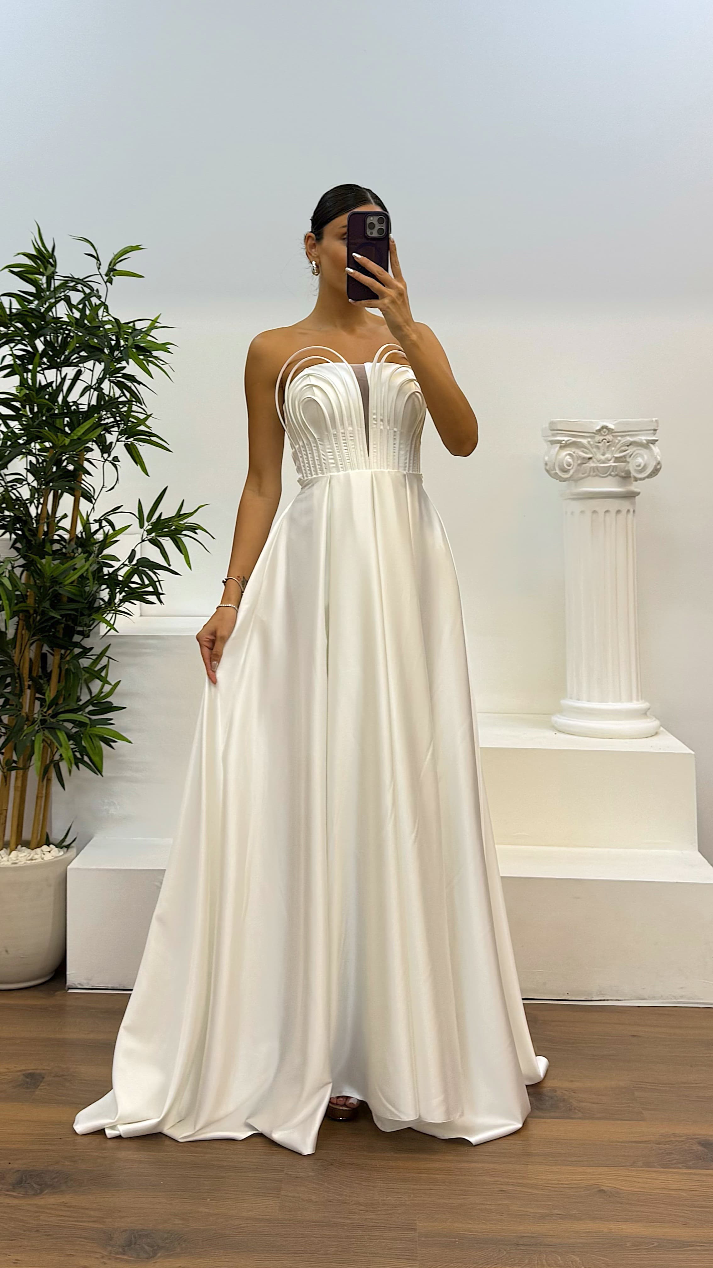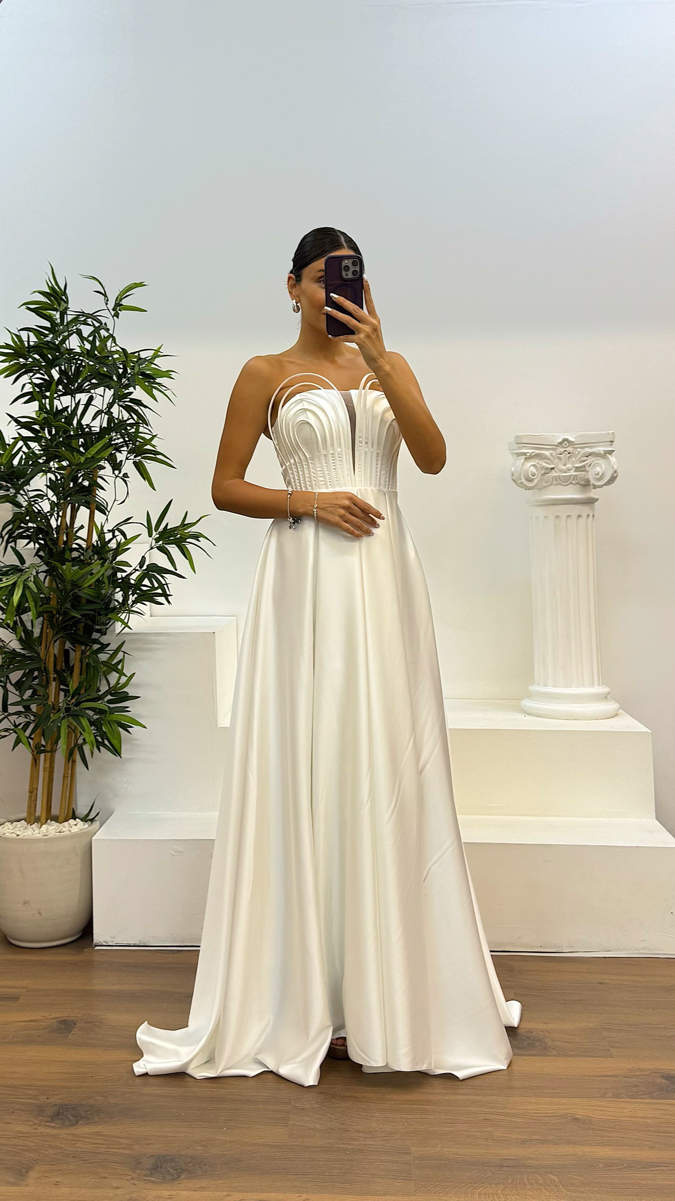 • Kemik Straplez Göğüs Detay Abiye Elbise