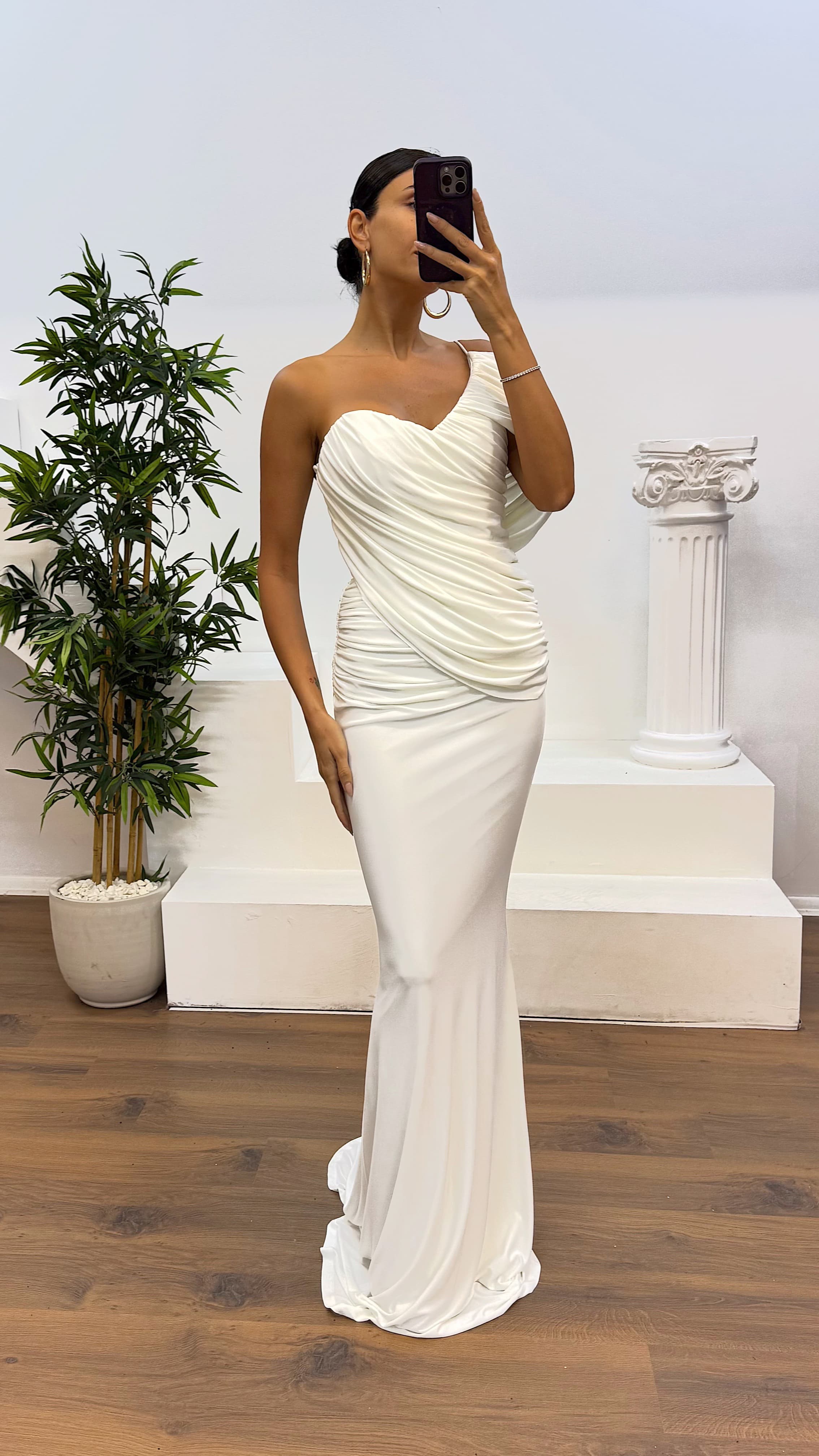 Abito da sera con dettagli drappeggiati sulle maniche Questo abito è progettato per adattarsi alle taglie dalla 36 alla 44. È dotato di imbottiture per il busto, fodera, chiusura con zip sul retro, spalline sottili e un elegante design drappeggiato. Lunghezza dell'abito: Può variare tra i 165 e i 170 cm a seconda della taglia. Tipo di tessuto: Jersey lycra, poliestere