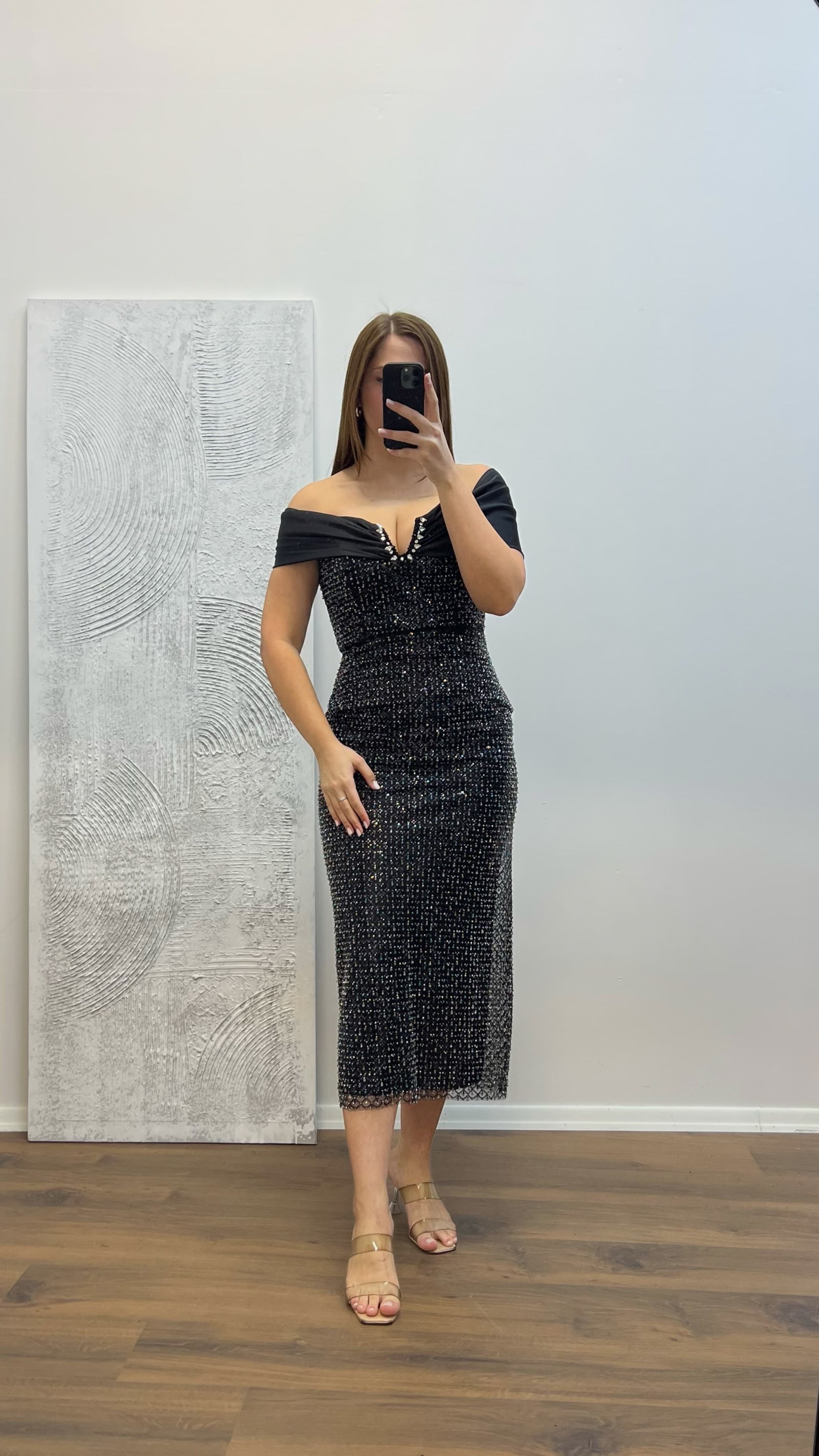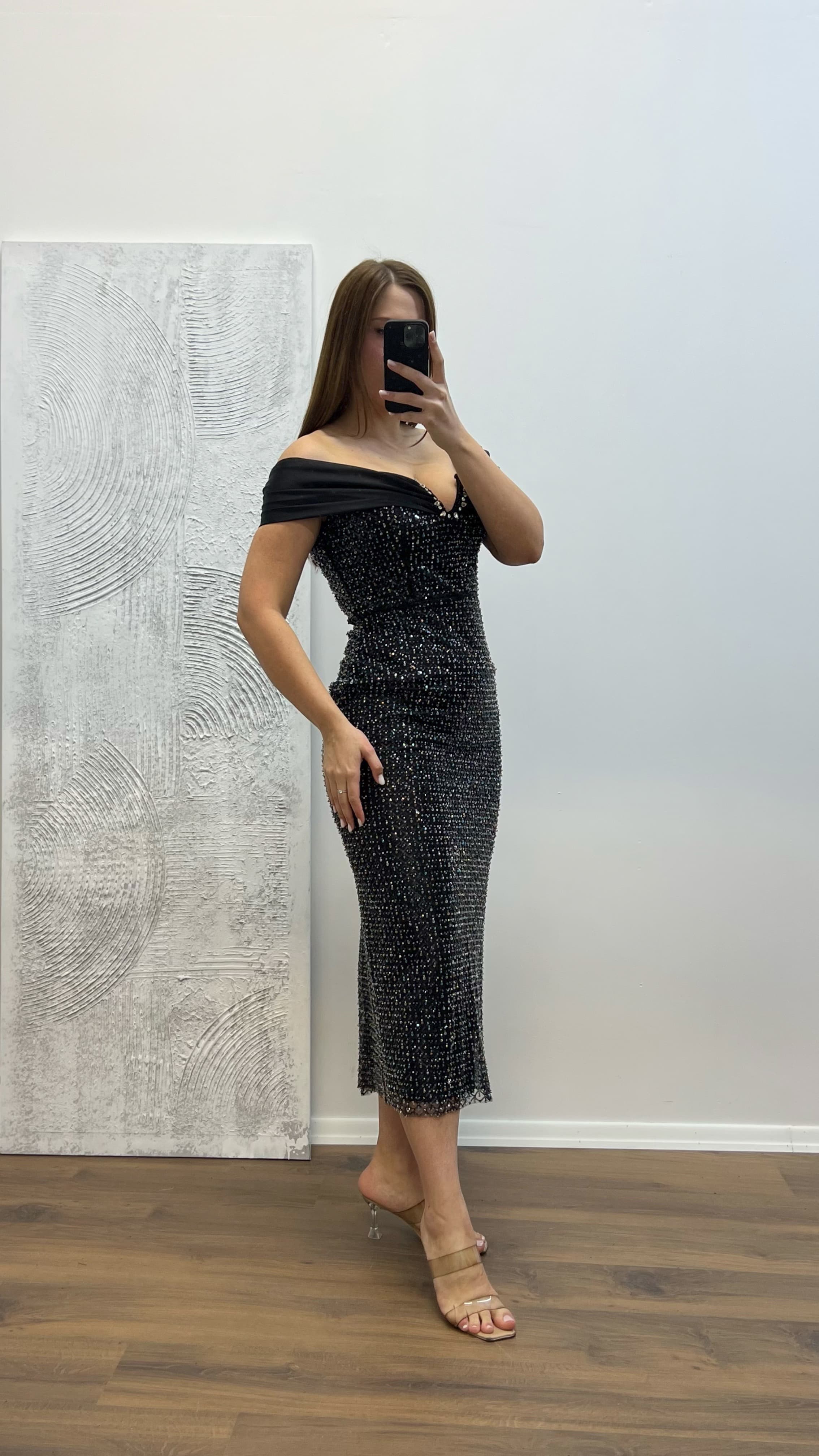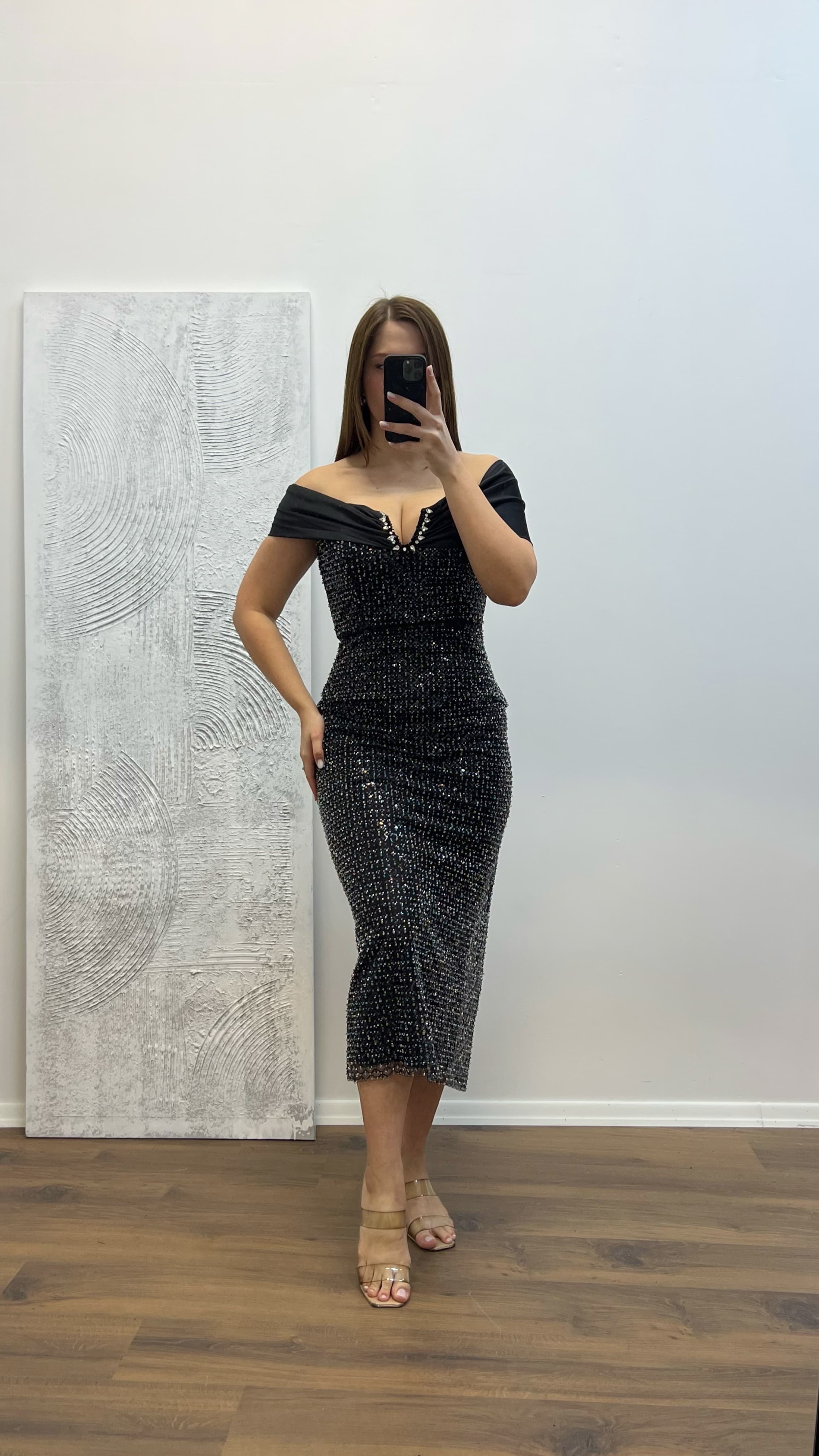 • Siyah Straplez İşlemeli Büyük Beden Abiye Elbise