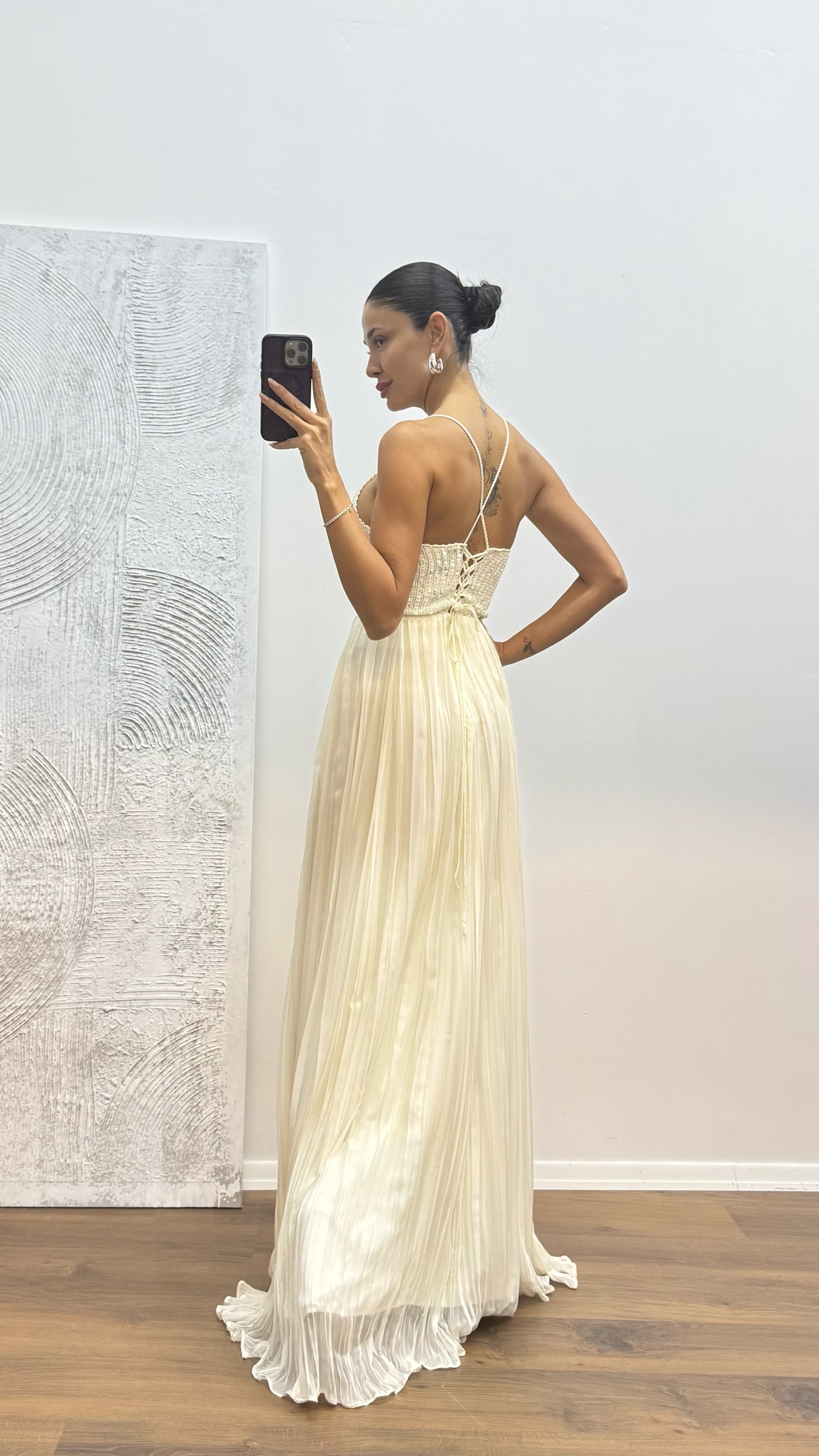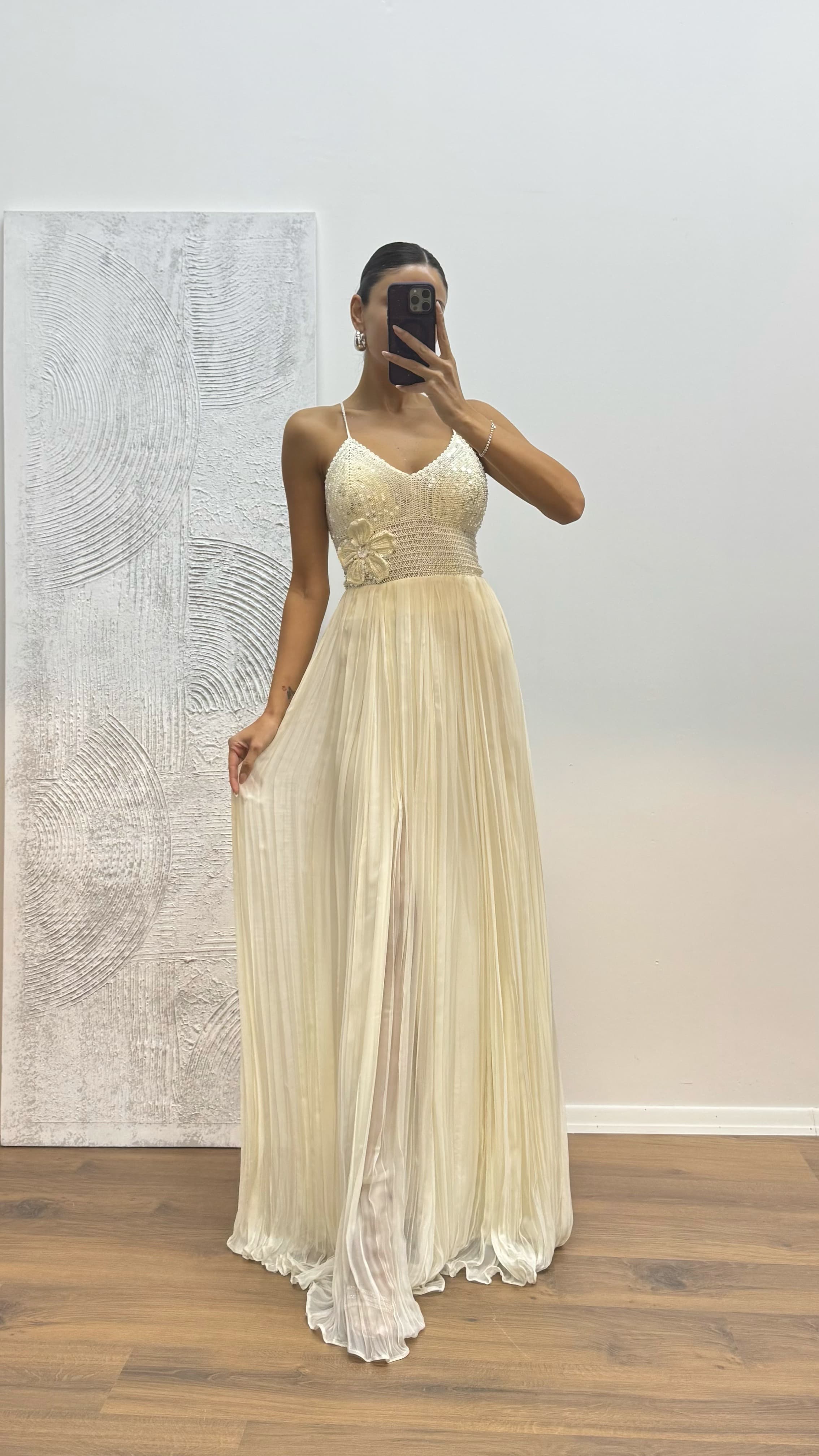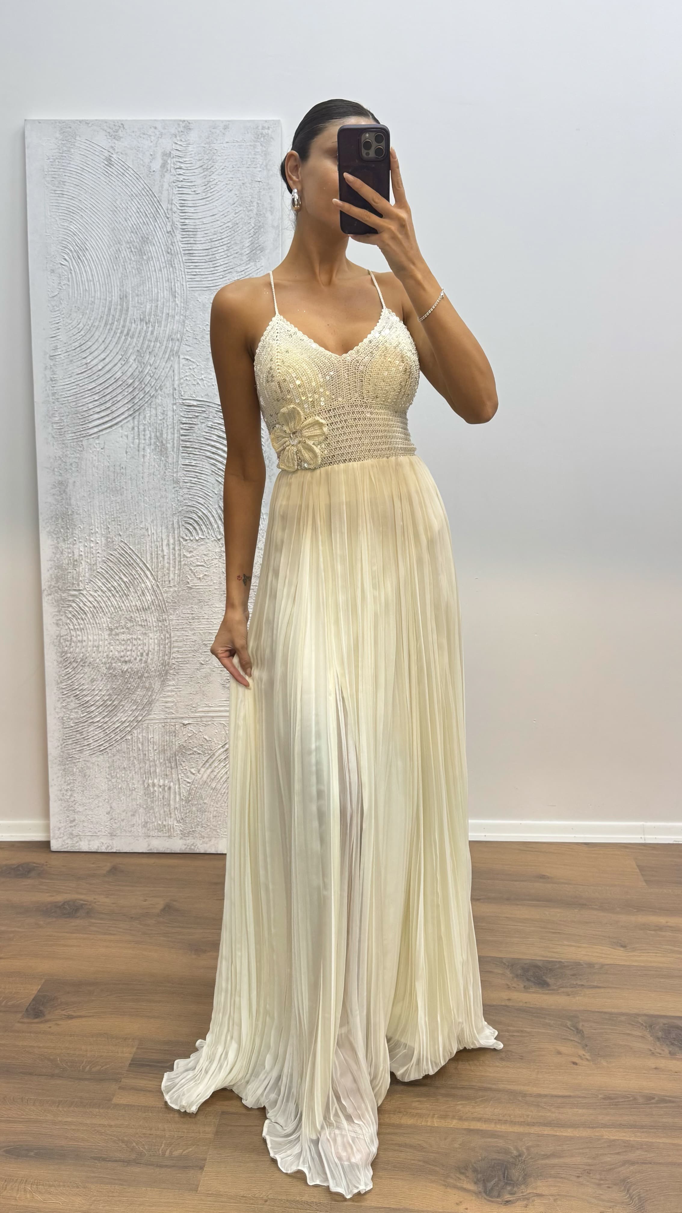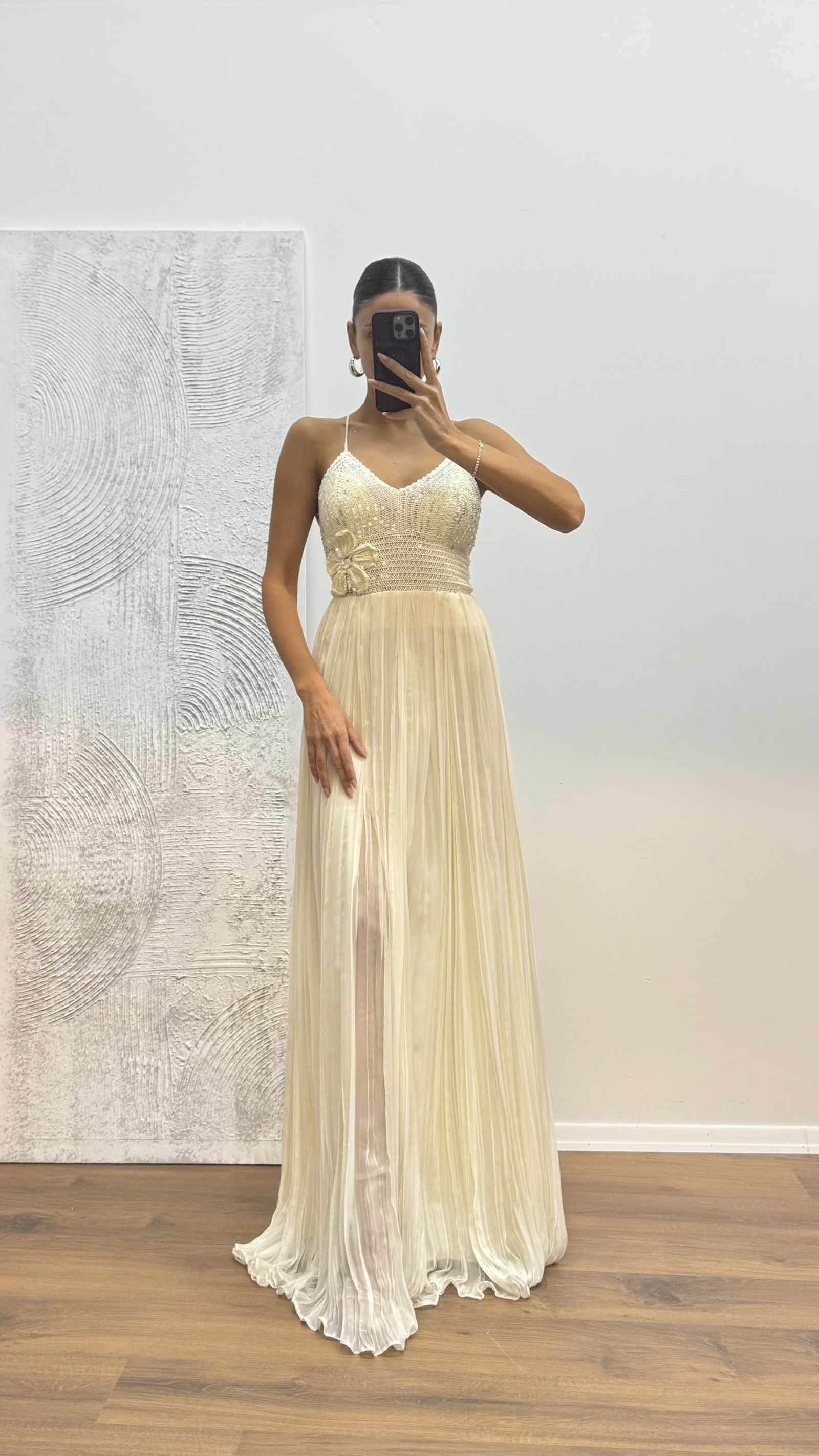 Abito da sera in maglia con spalline Il prodotto è adatto per taglie dalla 36 alla 42. Presenta coppe imbottite, è foderato, con spalline incrociate e chiusura con cerniera. L'abito ha una texture lavorata a maglia con dettagli floreali. Lunghezza: varia tra 165 e 170 cm. Tessuto: Chiffon – 66% viscosa, 34% poliestere.