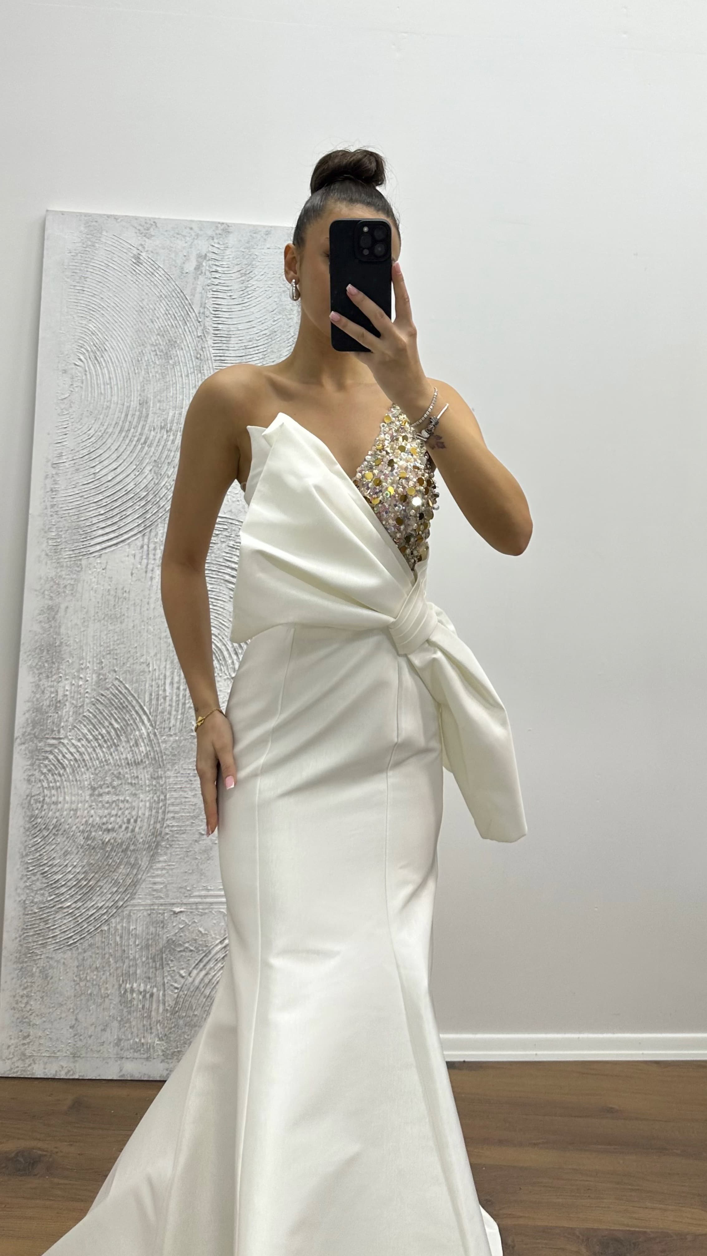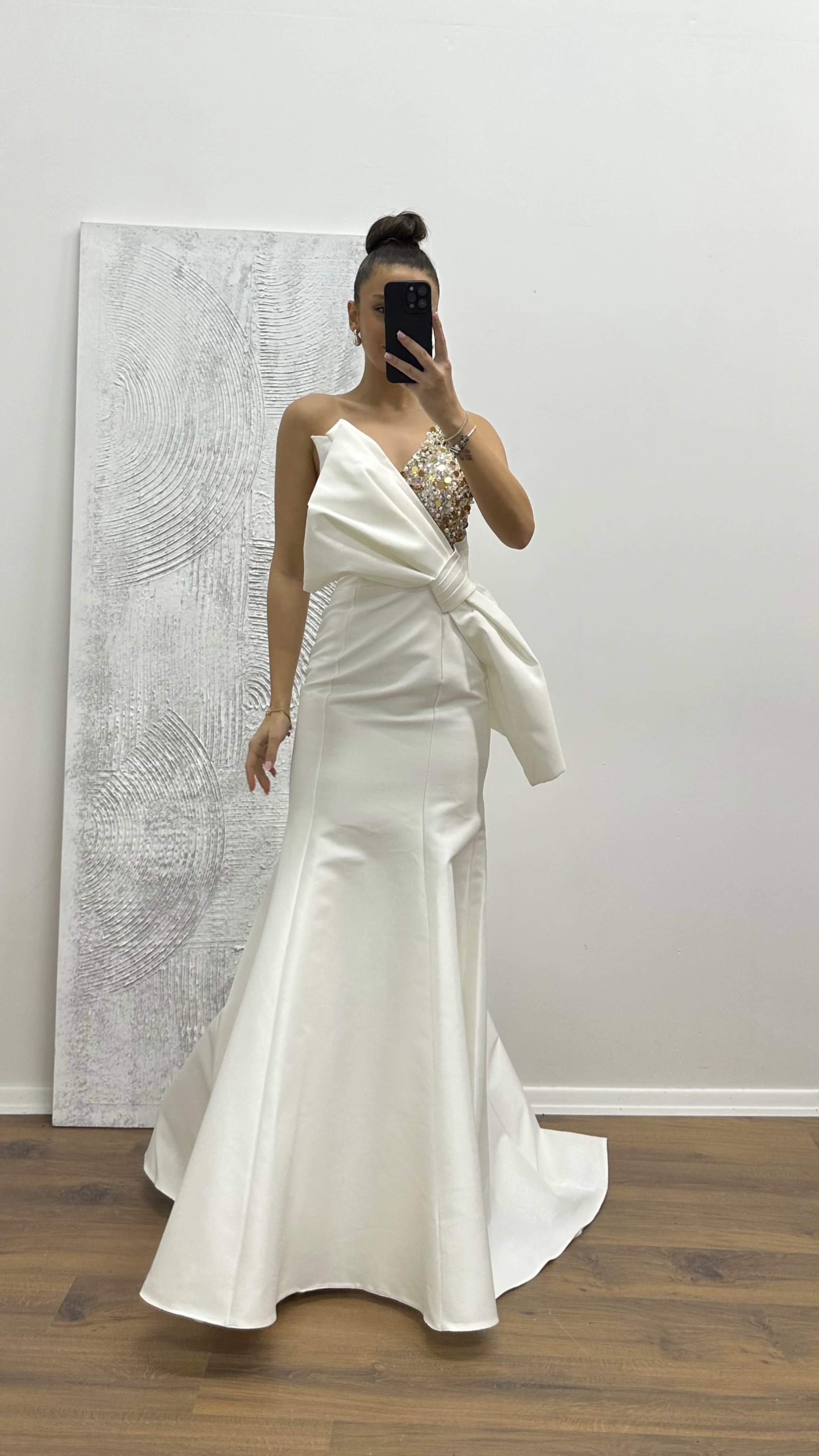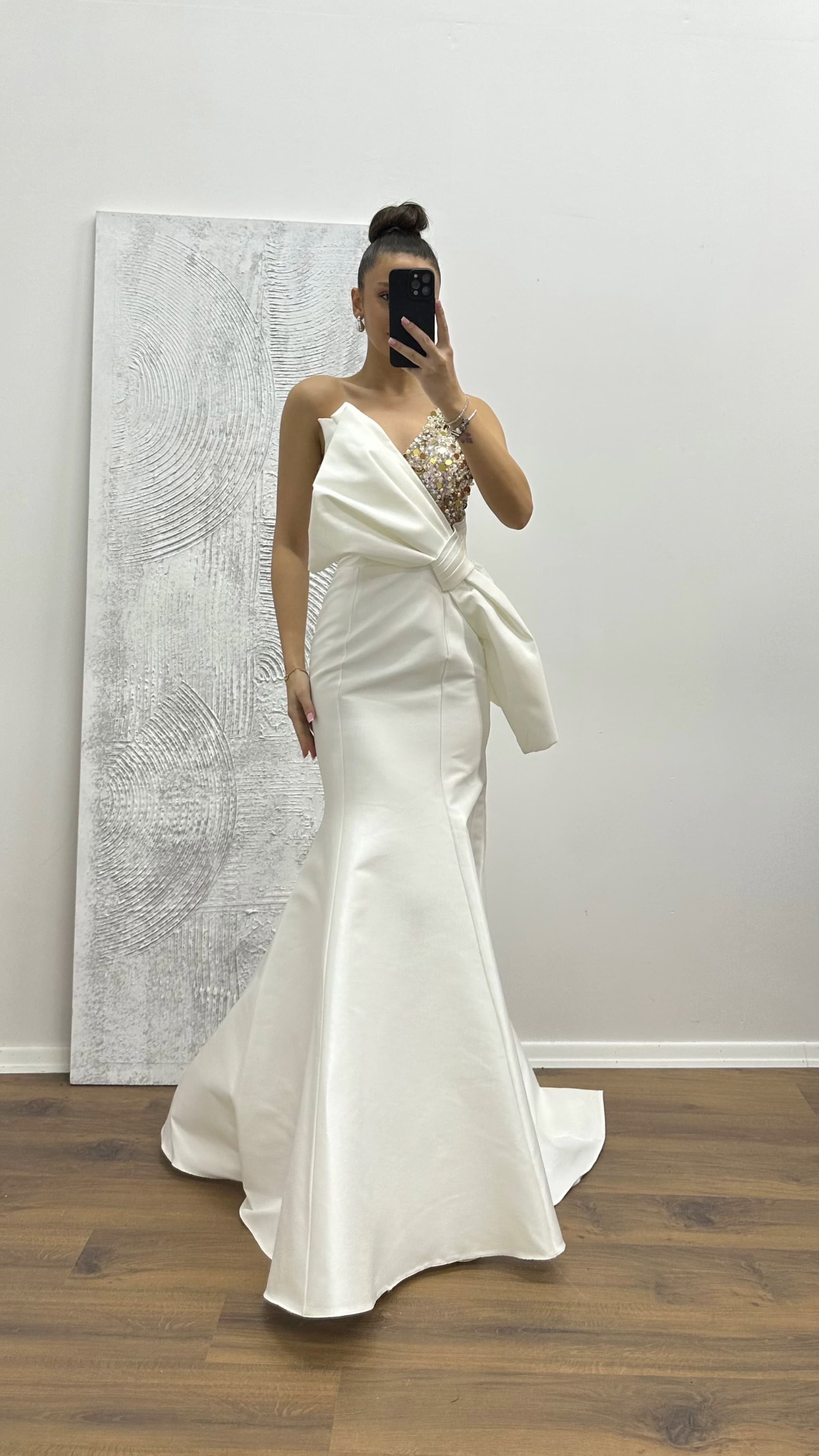 Abito da Sera Monospalla con Dettaglio Fiocco Adatto per taglie dalla 36 alla 40, con coppe imbottite, foderato, chiusura con zip posteriore, design monospalla con ricami e dettaglio fiocco. Lunghezza dell’abito: Può variare tra 165 e 170 cm. Tipo di tessuto: Raso poliestere-viscosa