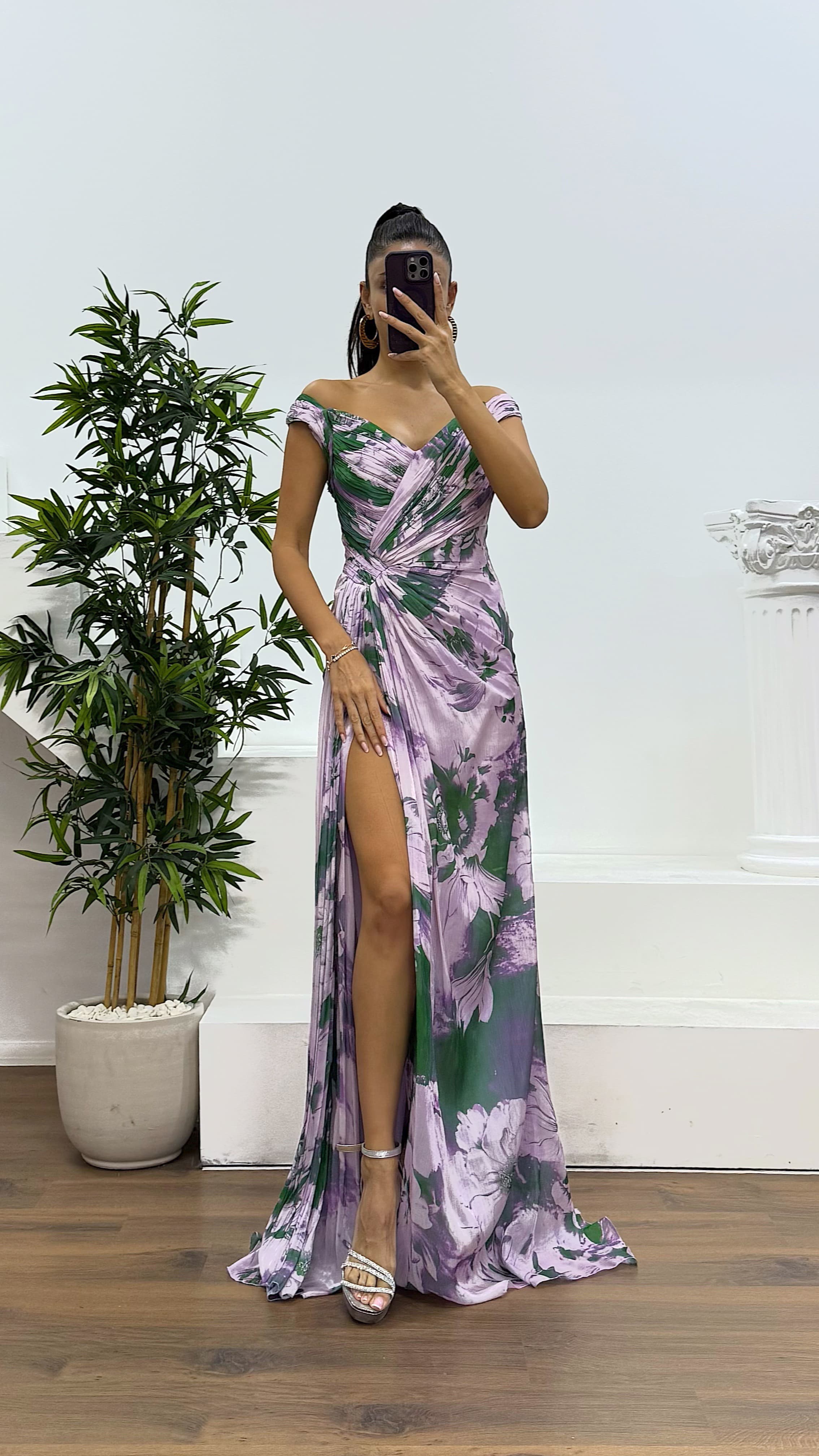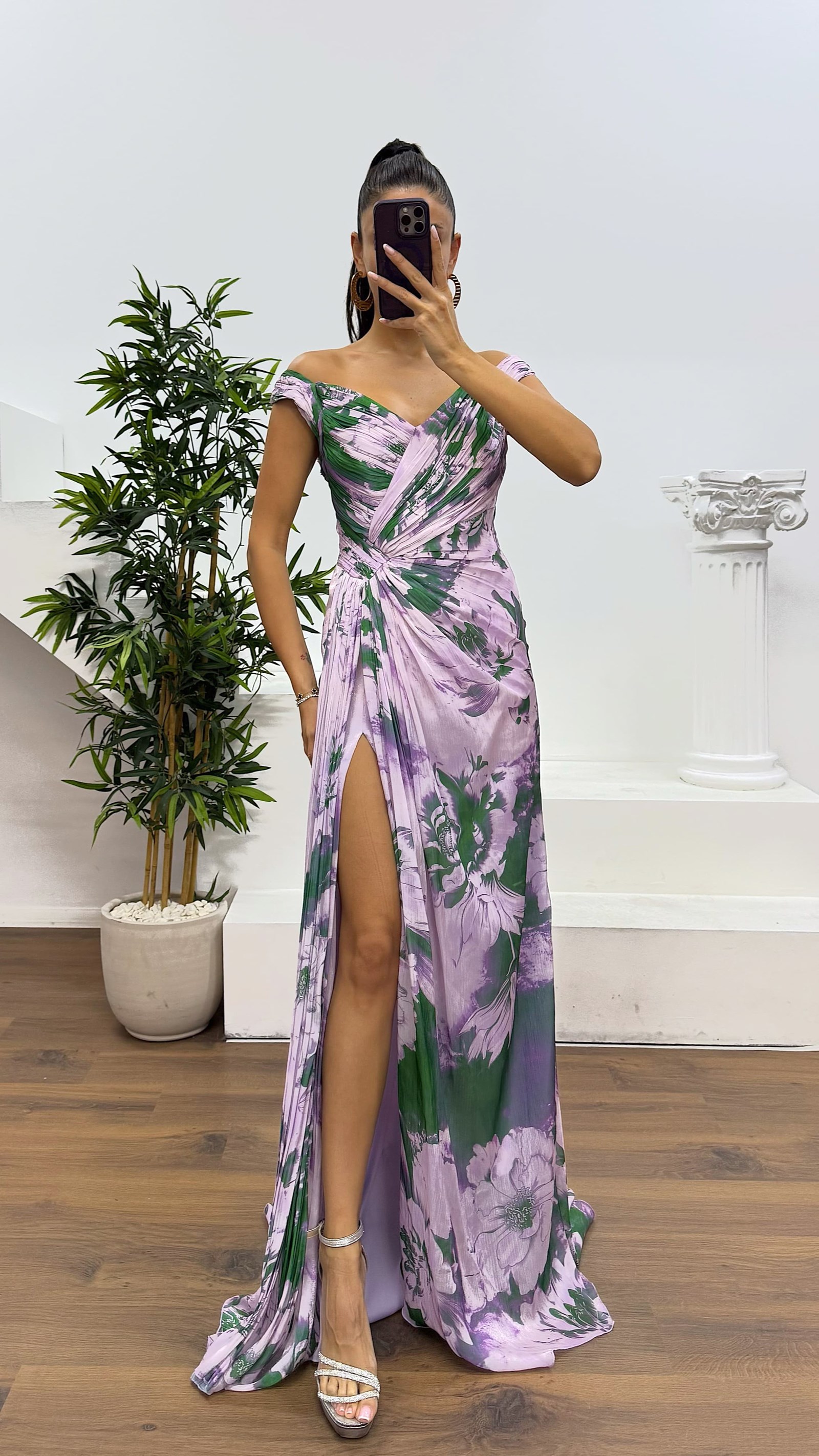 Abito da sera con spalline e fantasia Il prodotto è adatto alle taglie dalla 36 alla 44, ha coppe imbottite, è foderato, chiusura con zip sul retro e spacco. Lunghezza del prodotto: Può variare tra 170 e 175 cm. Tipo di tessuto: Chiffon – 66% viscosa, 34% poliestere