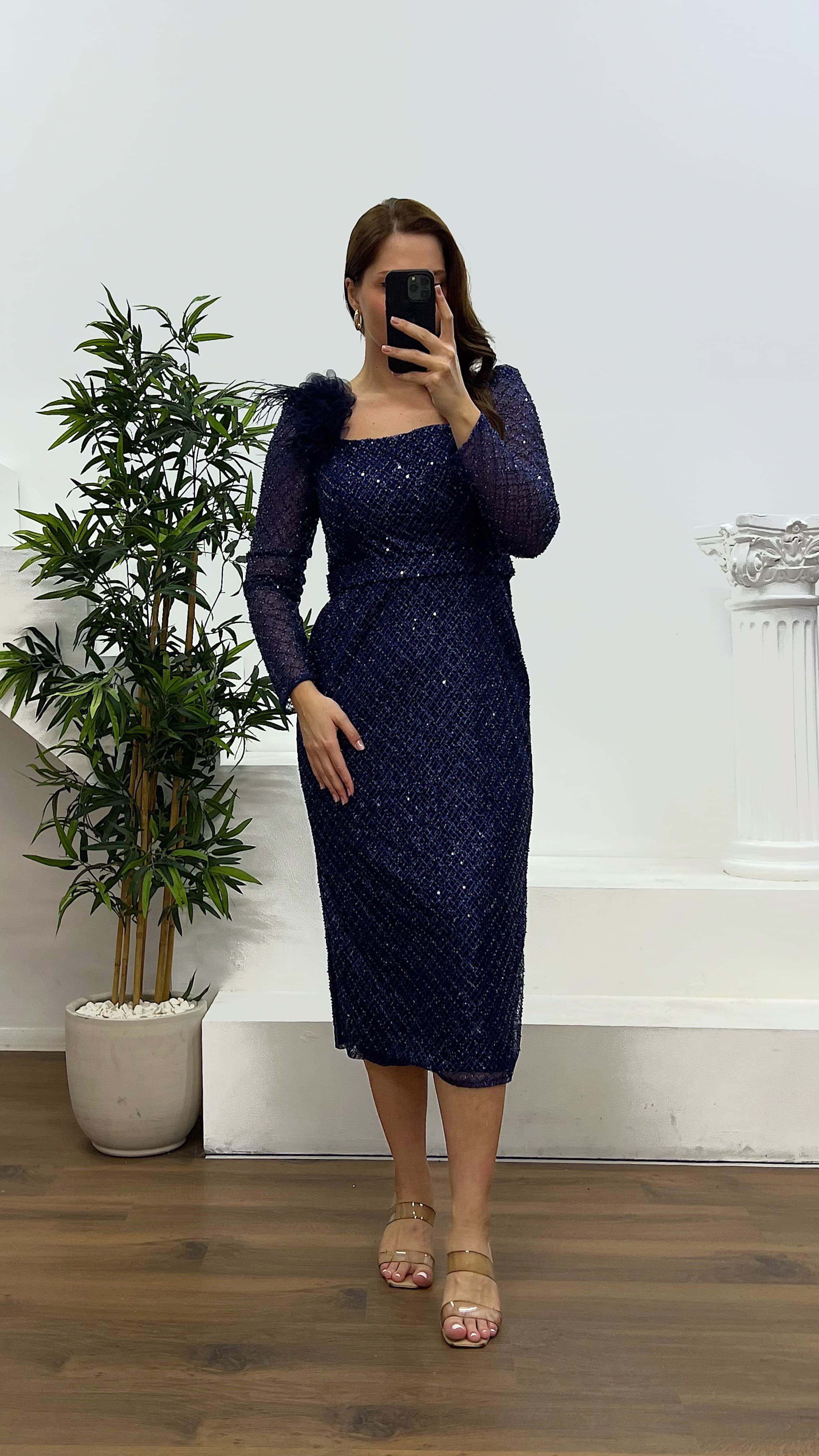Abito da sera con scollo a V e dettagli floreali Il prodotto è progettato come abito da sera con dettagli floreali, adatto alle taglie dalla 44 alla 48. Dotato di coppe imbottite, foderato, con chiusura a zip sul retro. Lunghezza: 100 cm Lunghezza maniche: 65 cm Tipo di tessuto: paillettes con tulle, 100% poliestere