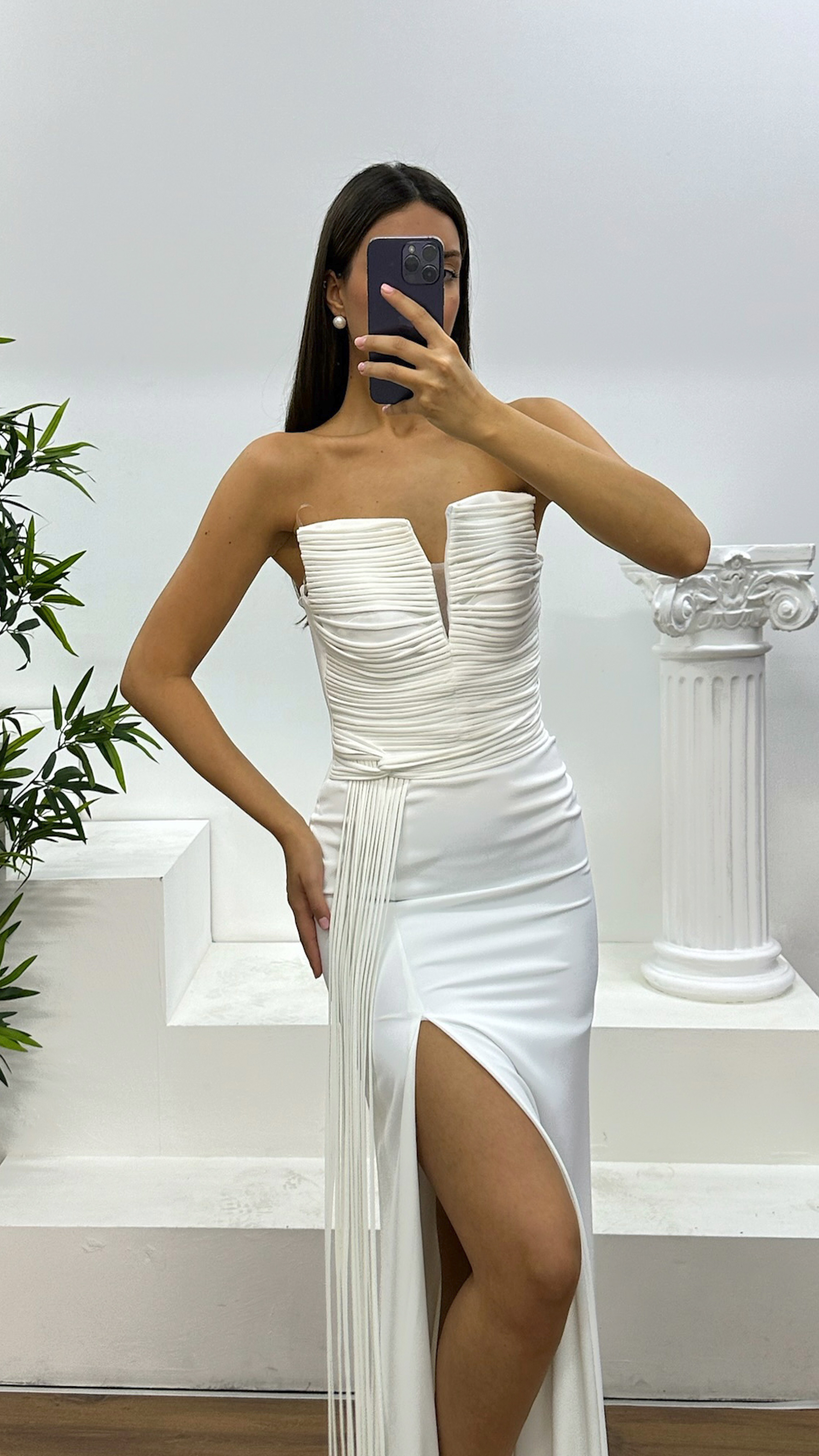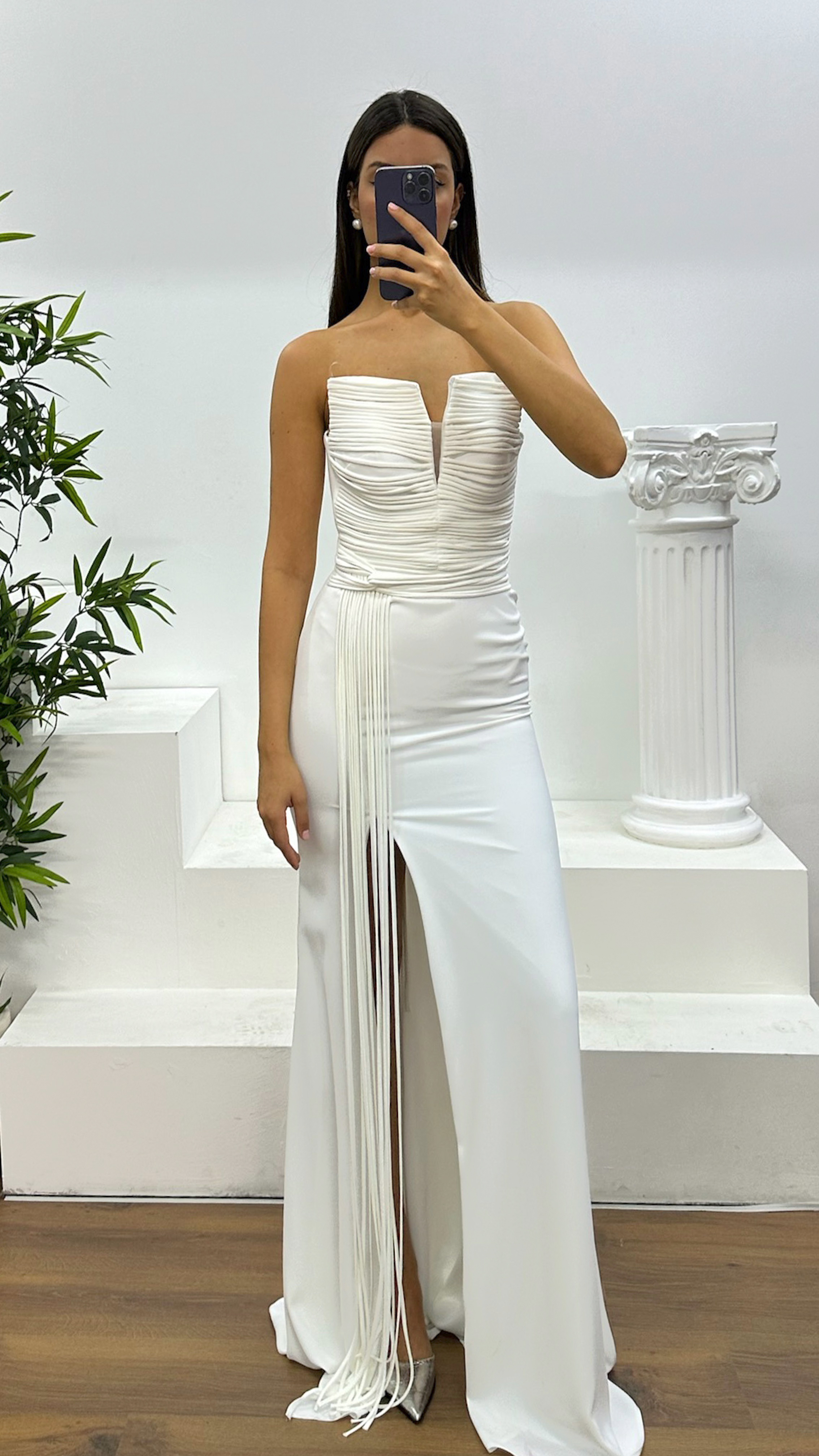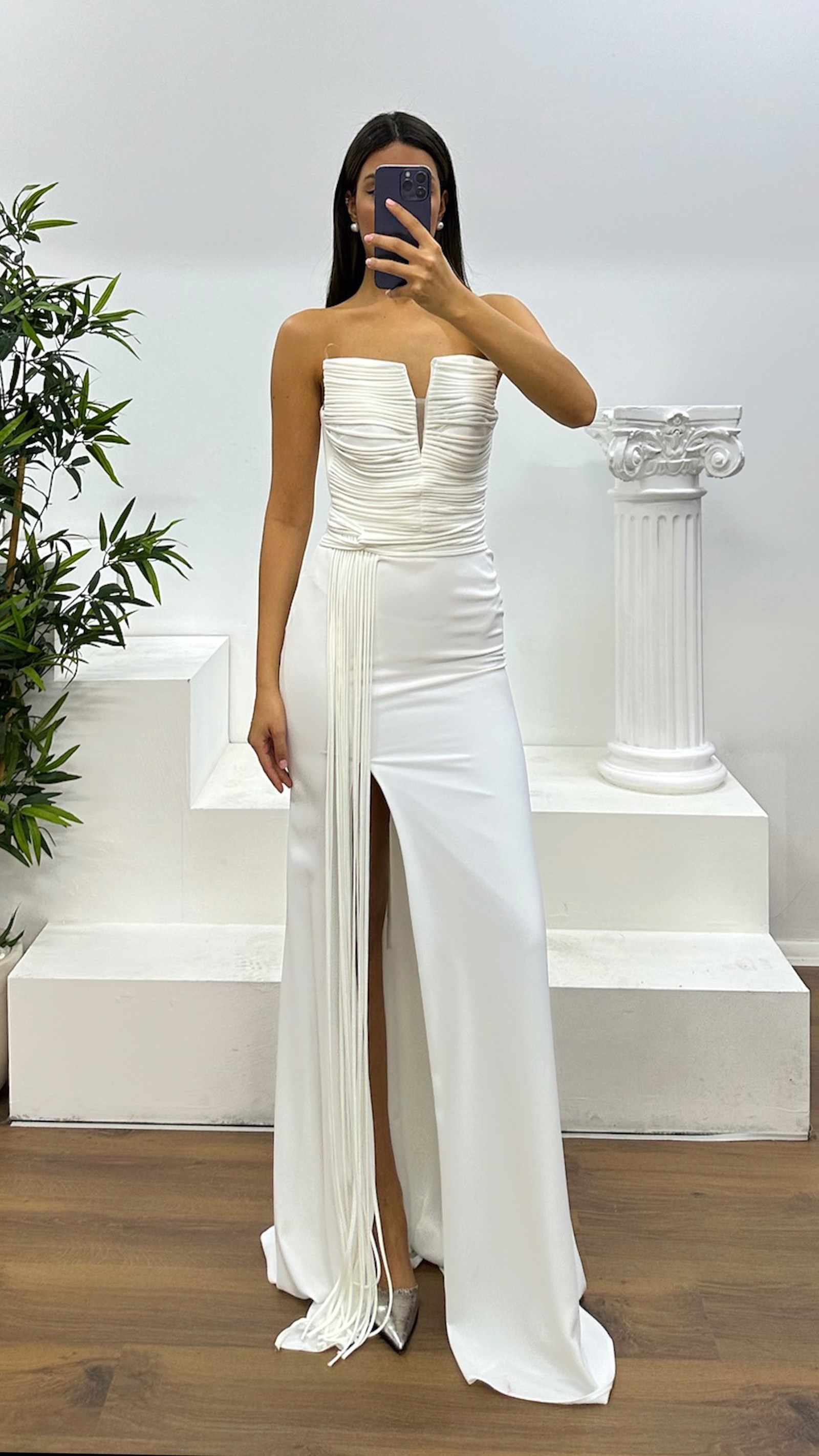 Abito da sera senza spalline con dettagli a frange Il prodotto è progettato come abito da sera con dettagli a frange, adatto per taglie dalla 36 alla 44, con coppe imbottite, fodera, lacci incrociati sulla schiena e chiusura con zip. Lunghezza del prodotto: Può variare tra 170 e 175 cm. Tipo di tessuto: Atlas, 100% poliestere.