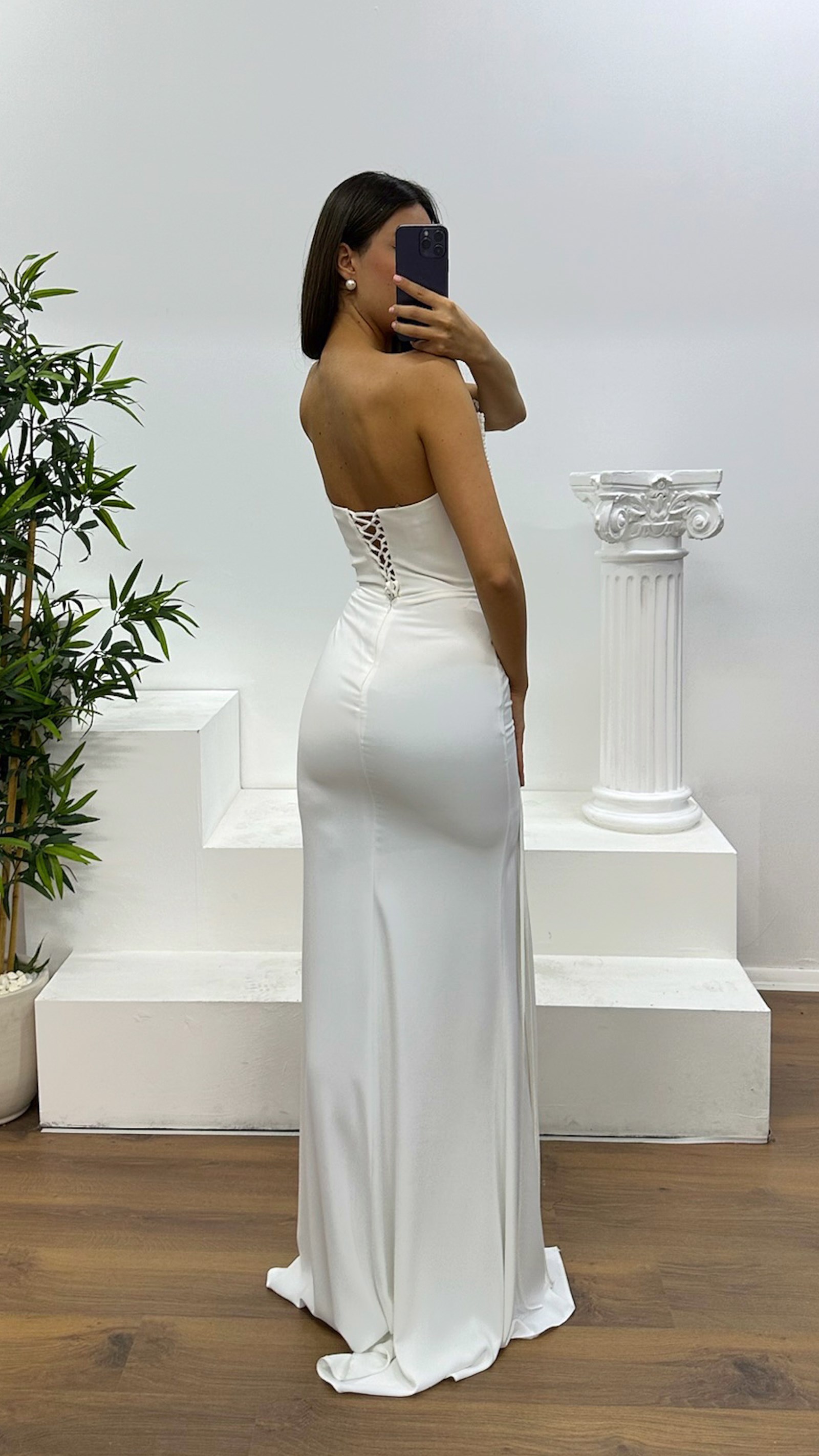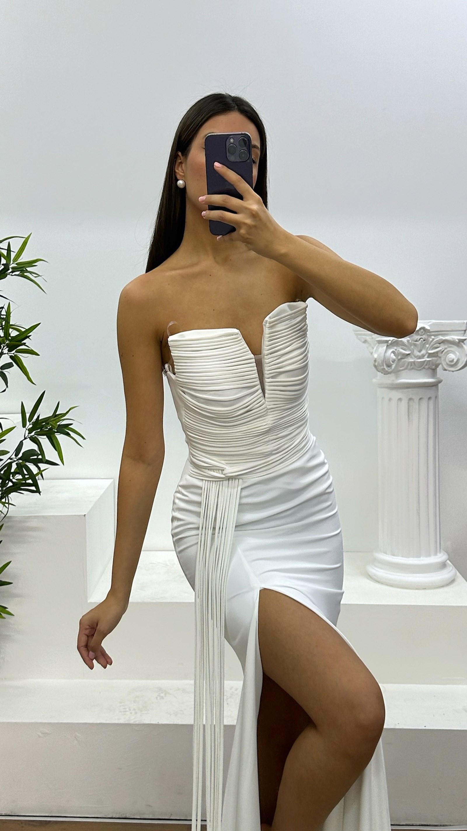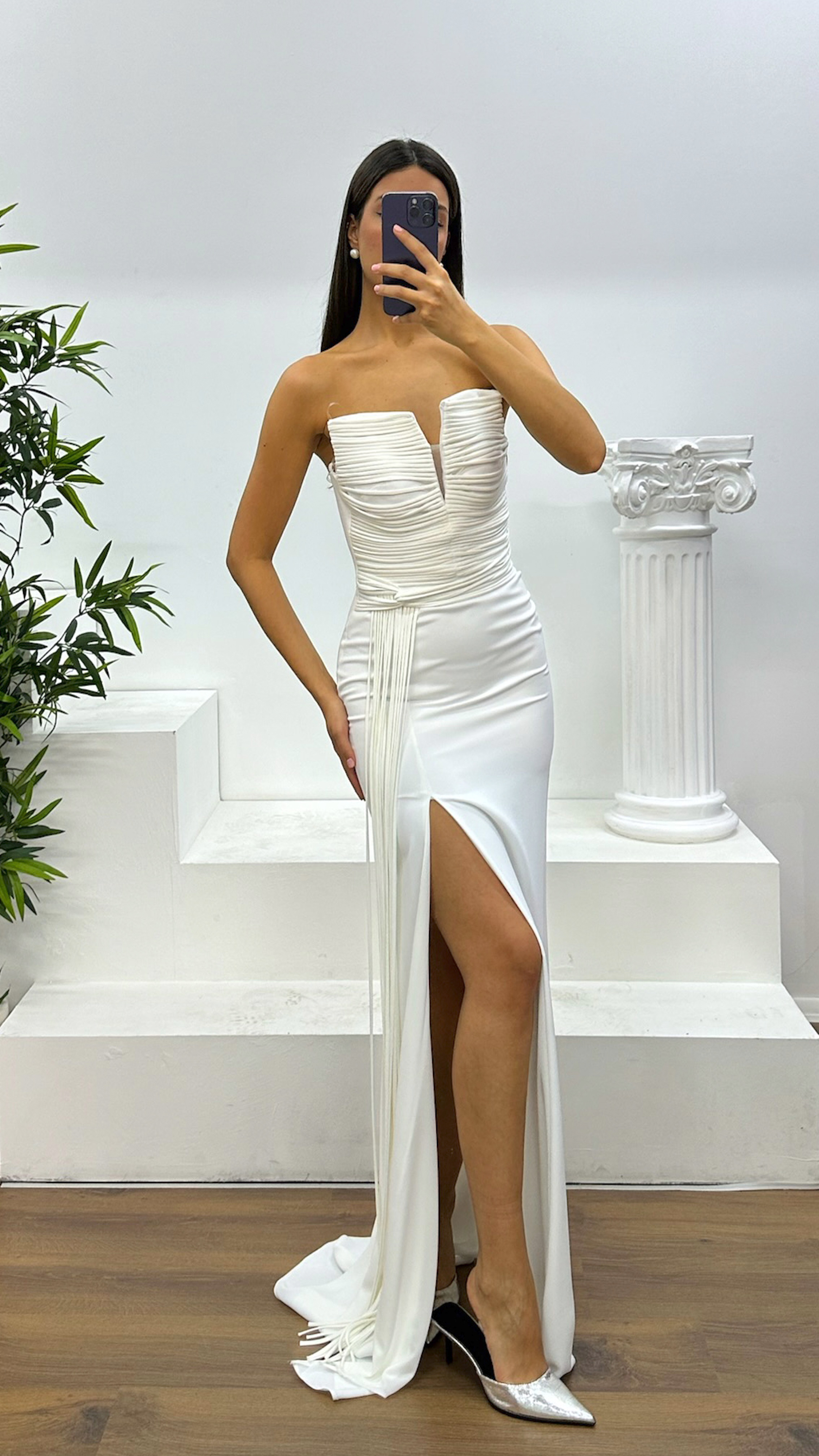 Abito da sera senza spalline con dettagli a frange Il prodotto è progettato come abito da sera con dettagli a frange, adatto per taglie dalla 36 alla 44, con coppe imbottite, fodera, lacci incrociati sulla schiena e chiusura con zip. Lunghezza del prodotto: Può variare tra 170 e 175 cm. Tipo di tessuto: Atlas, 100% poliestere.
