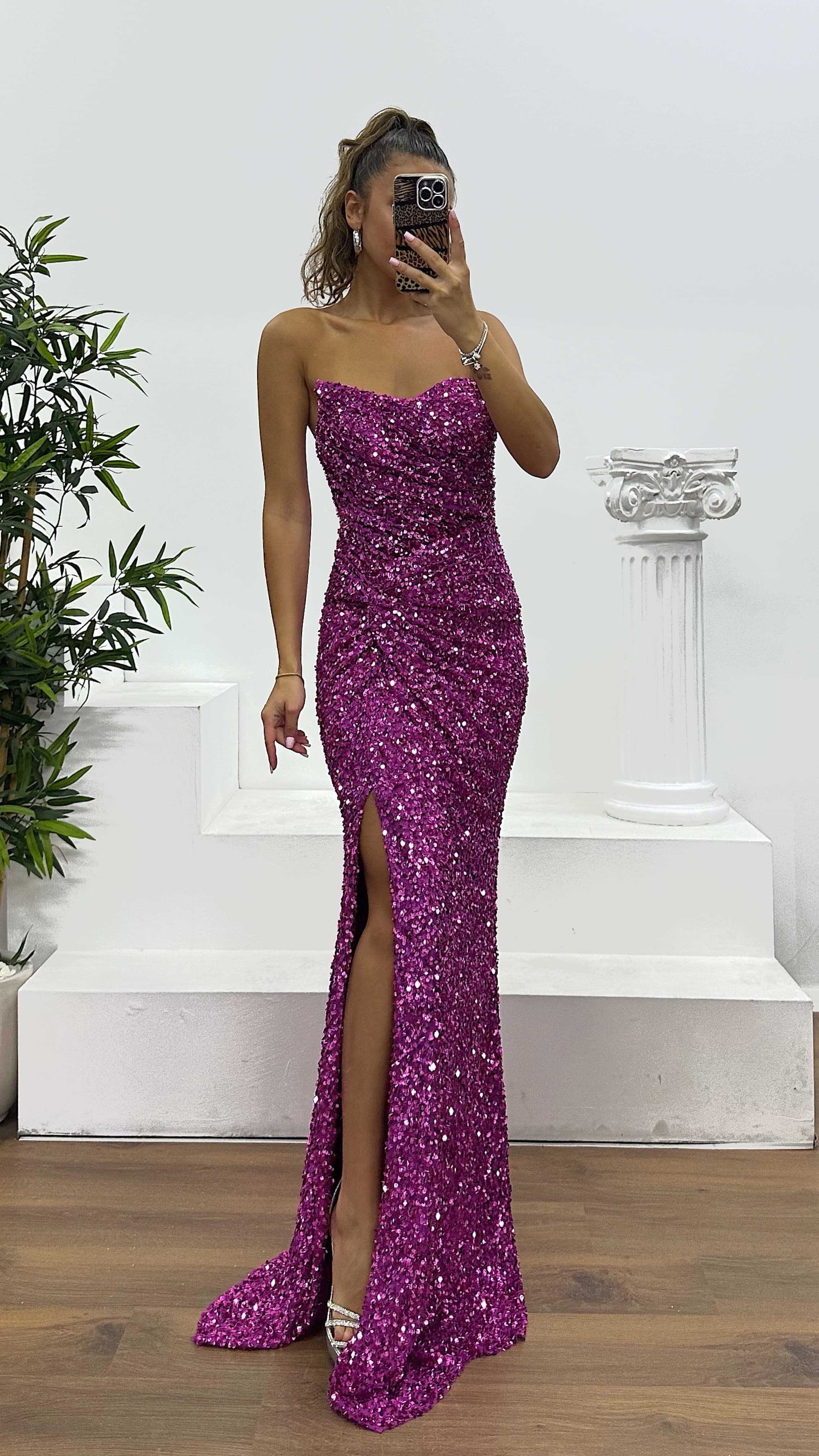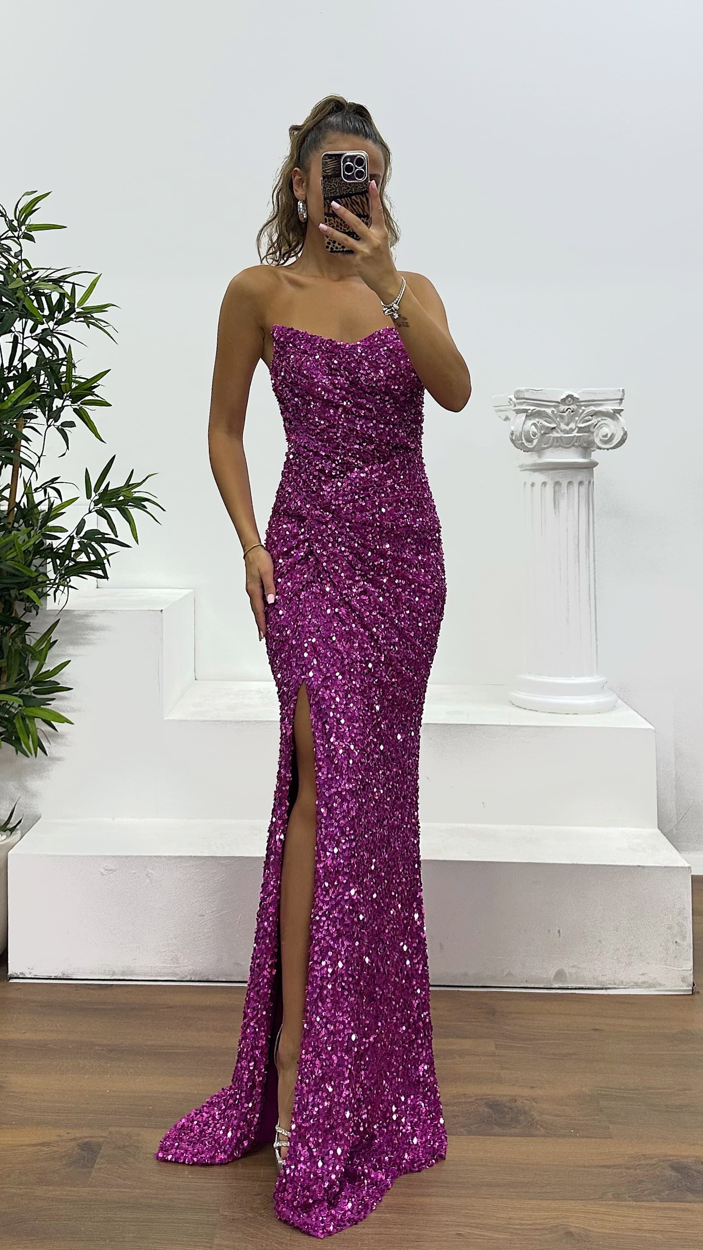 • Fuşya Straplez Pul Payet Abiye Elbise