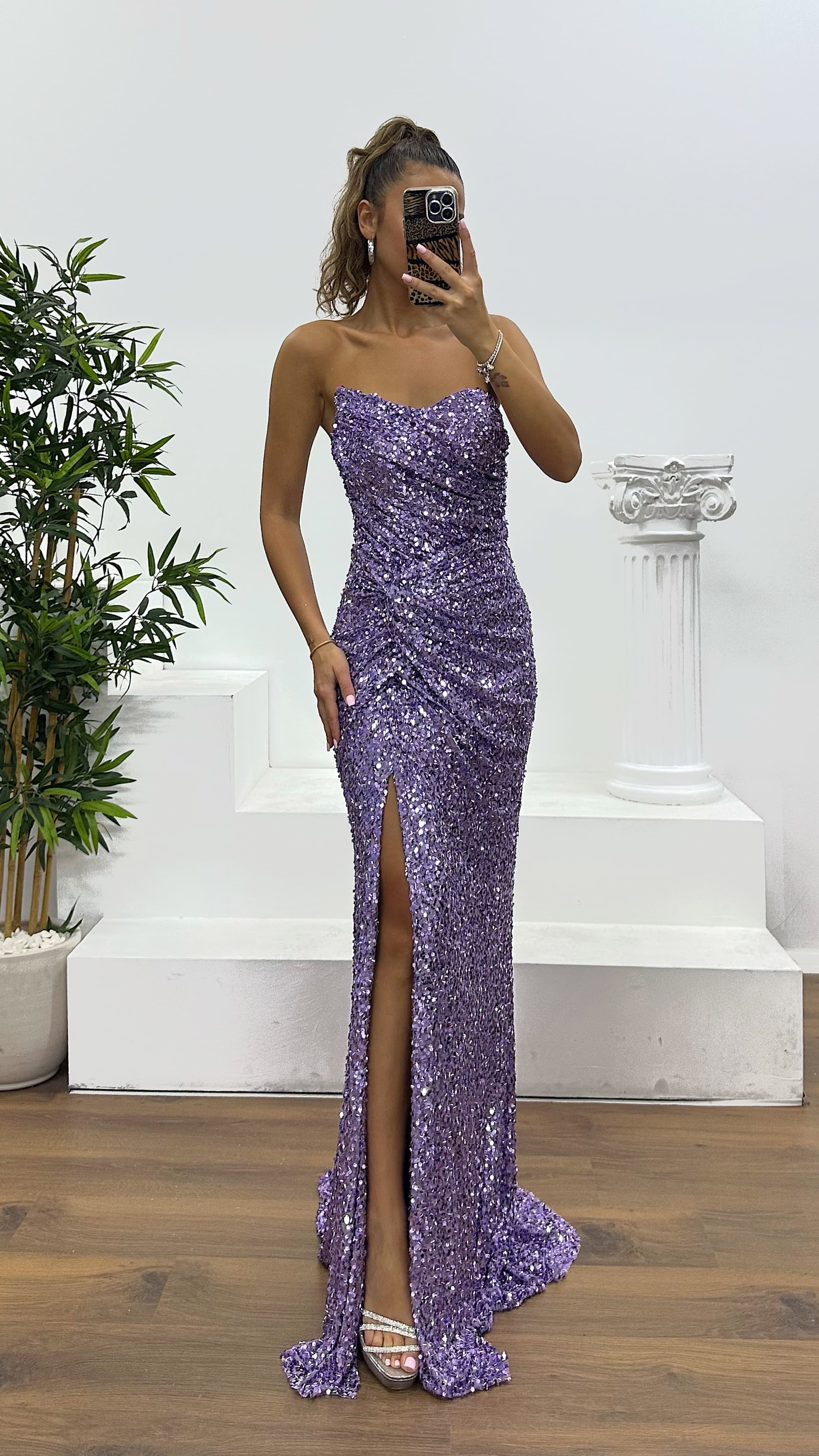 Abito da sera senza spalline con paillettes Il prodotto è progettato come un abito da sera con spacco, adatto alle taglie dalla 36 alla 44, con coppe al seno, foderato e con chiusura a zip posteriore. Lunghezza del prodotto: può variare tra 170 e 175 cm. Tipo di tessuto: paillettes, 100% poliestere.