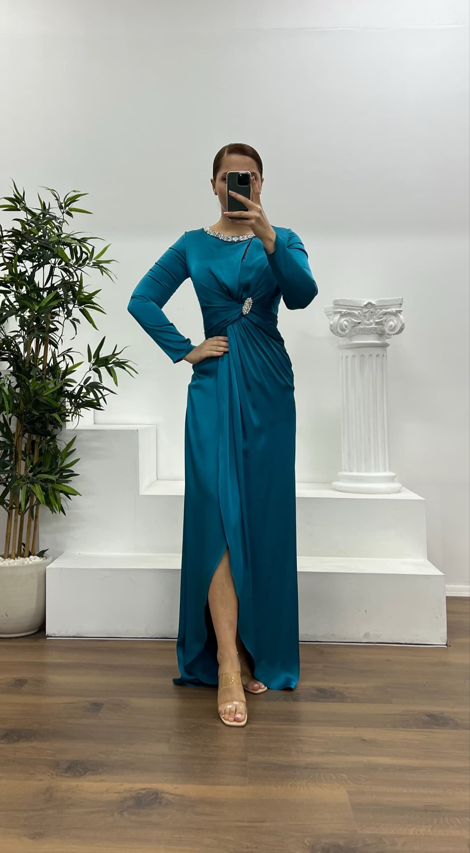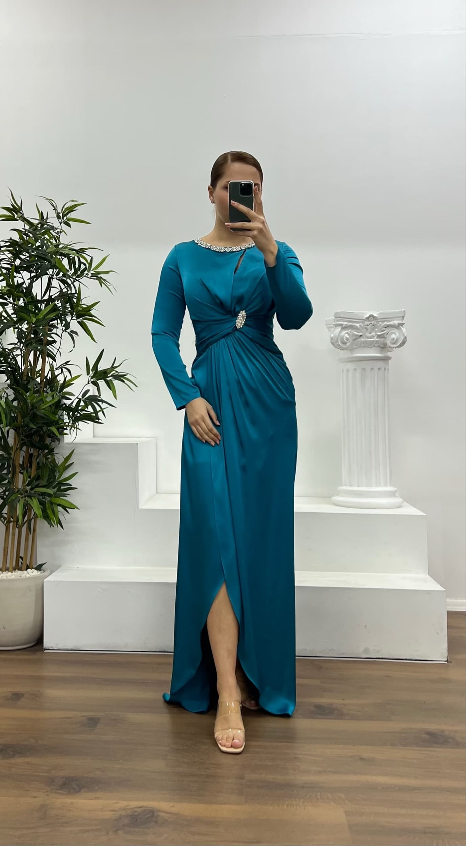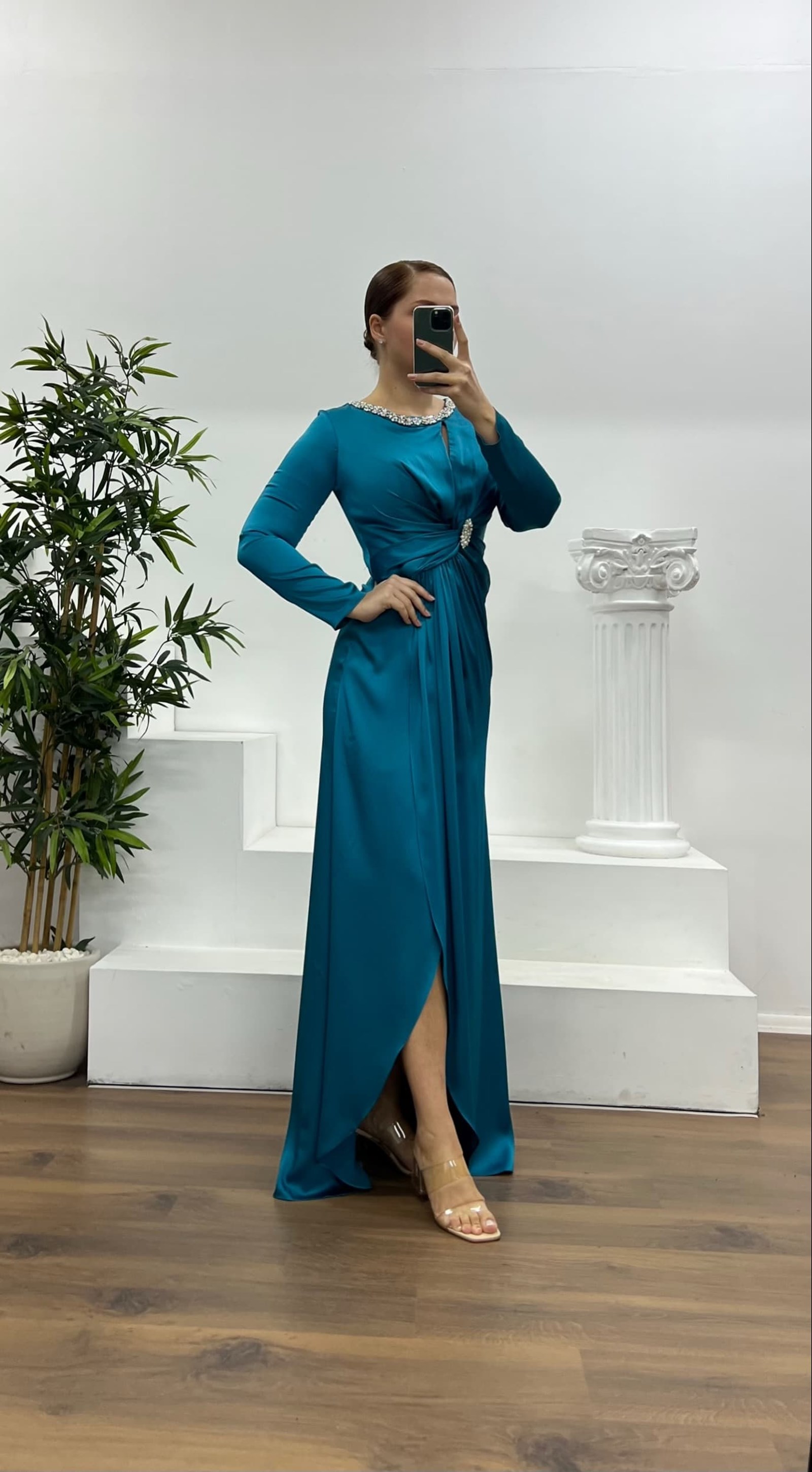 • Petrol Yaka Taş Detay İşlemeli Saten Abiye Elbise