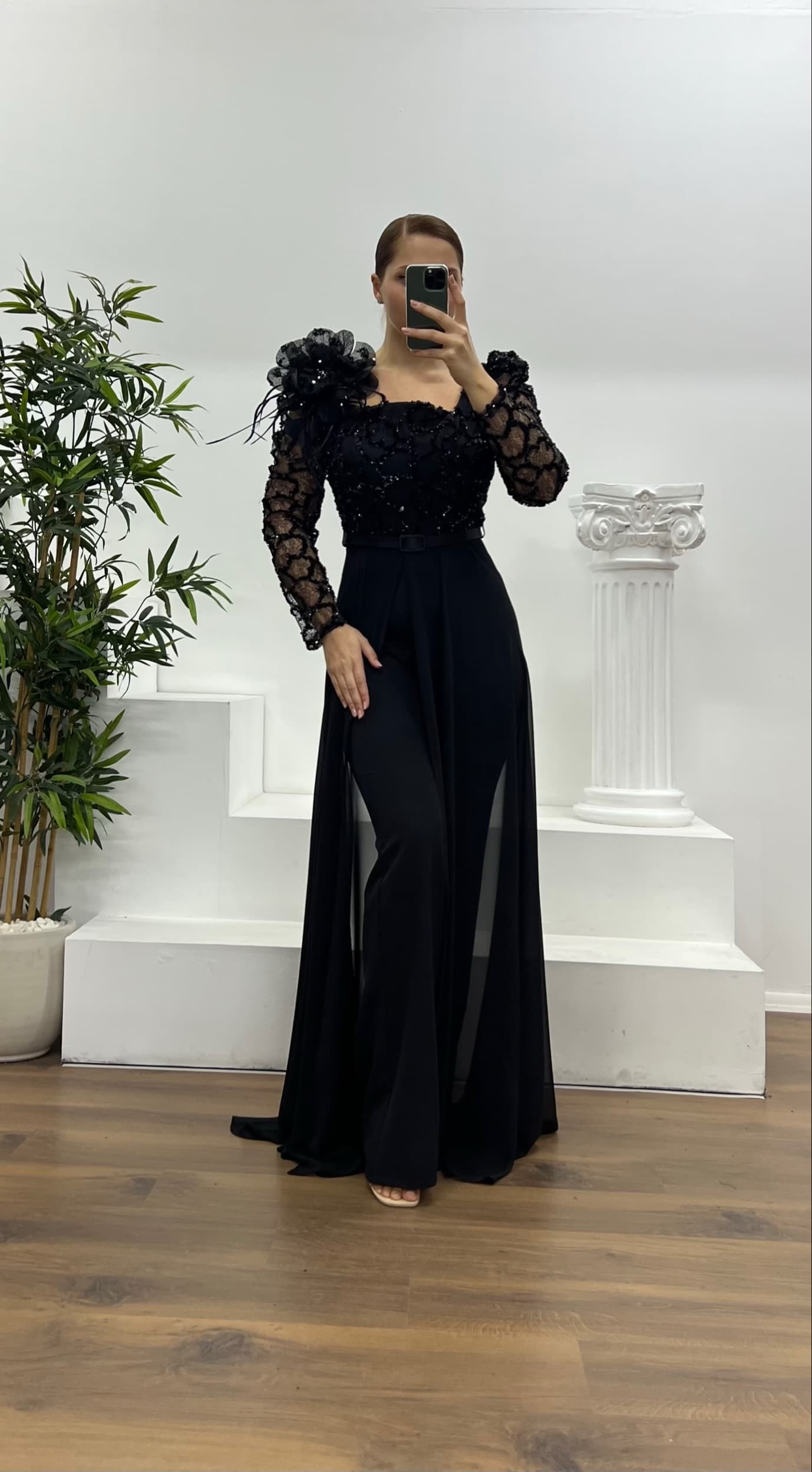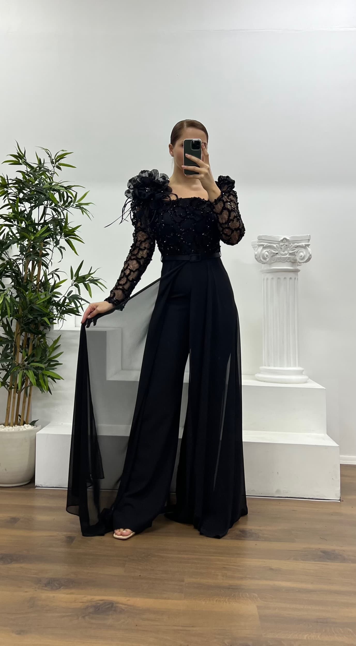 Tuta da sera ricamata Il prodotto è adatto alle taglie 44–48, con coppe imbottite, foderato, chiusura con zip posteriore, cintura rimovibile e dettagli floreali. Lunghezza: 170–175 cm (può variare). Tessuto: tessuto paillettato 100% poliestere – chiffon 66% viscosa, 34% poliestere. Una scelta ideale per distinguerti con eleganza a matrimoni, fidanzamenti, lauree o eventi speciali.