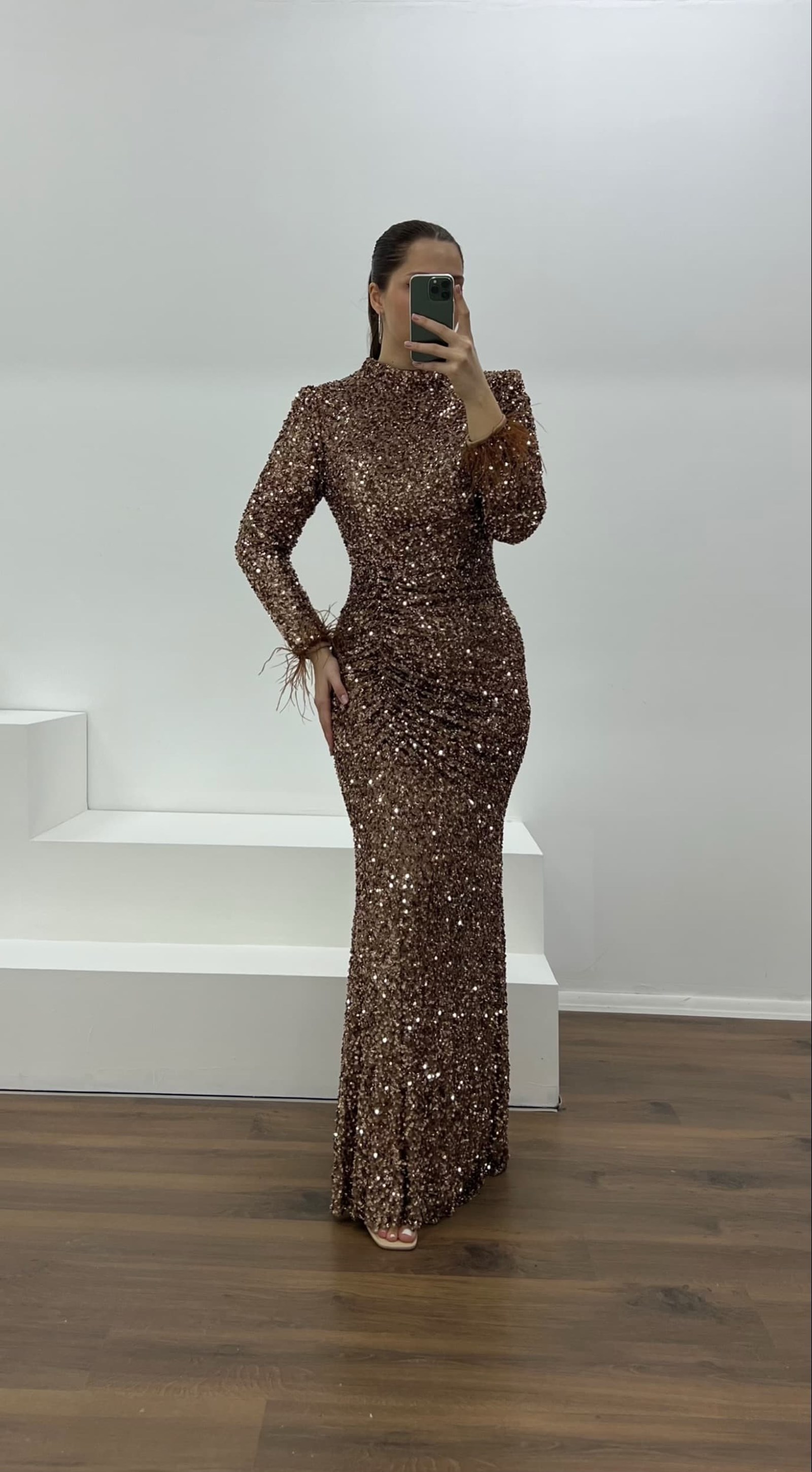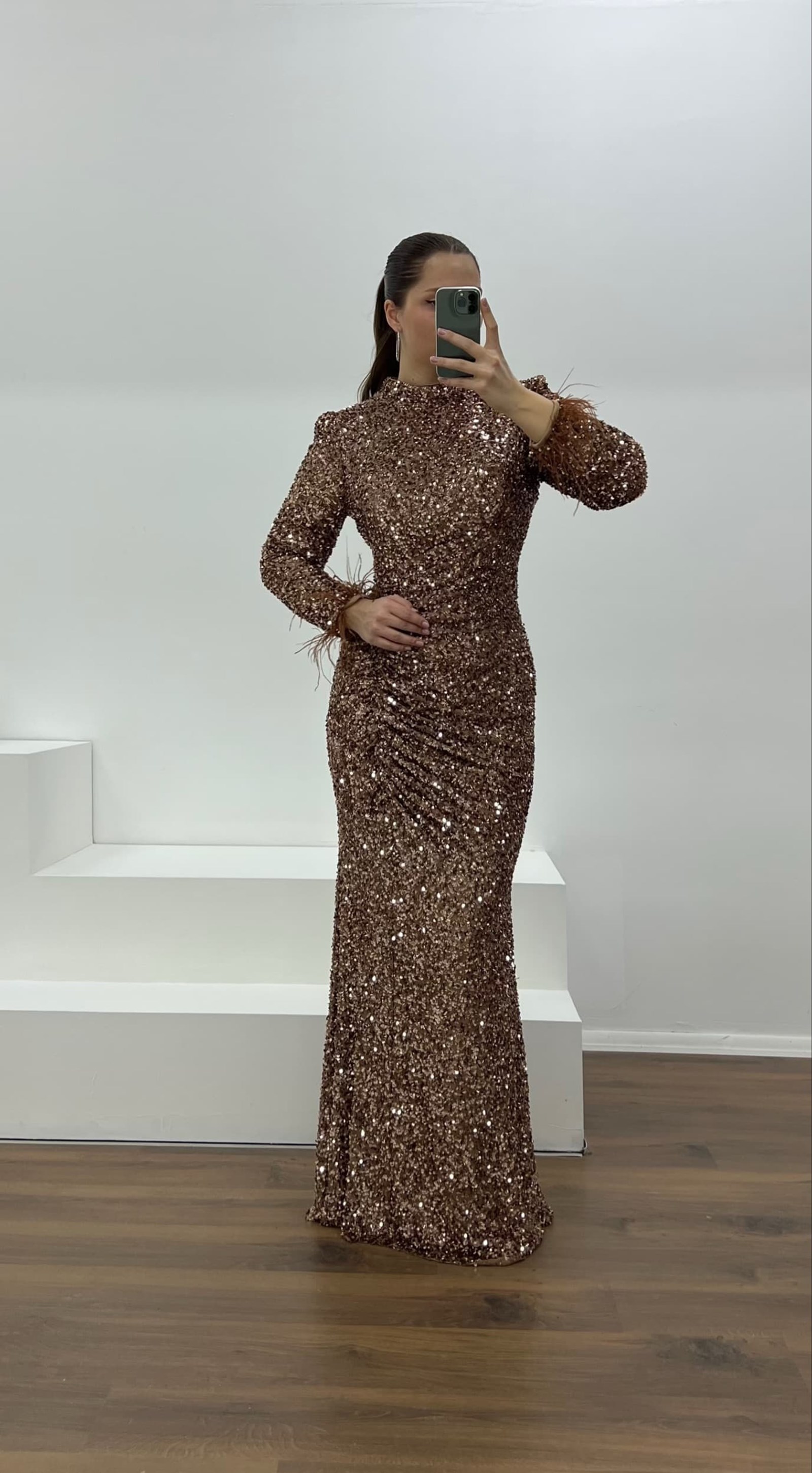 • Bakır Kolları Tüy Detay Pul Payet Büyük Beden Abiye Elbise