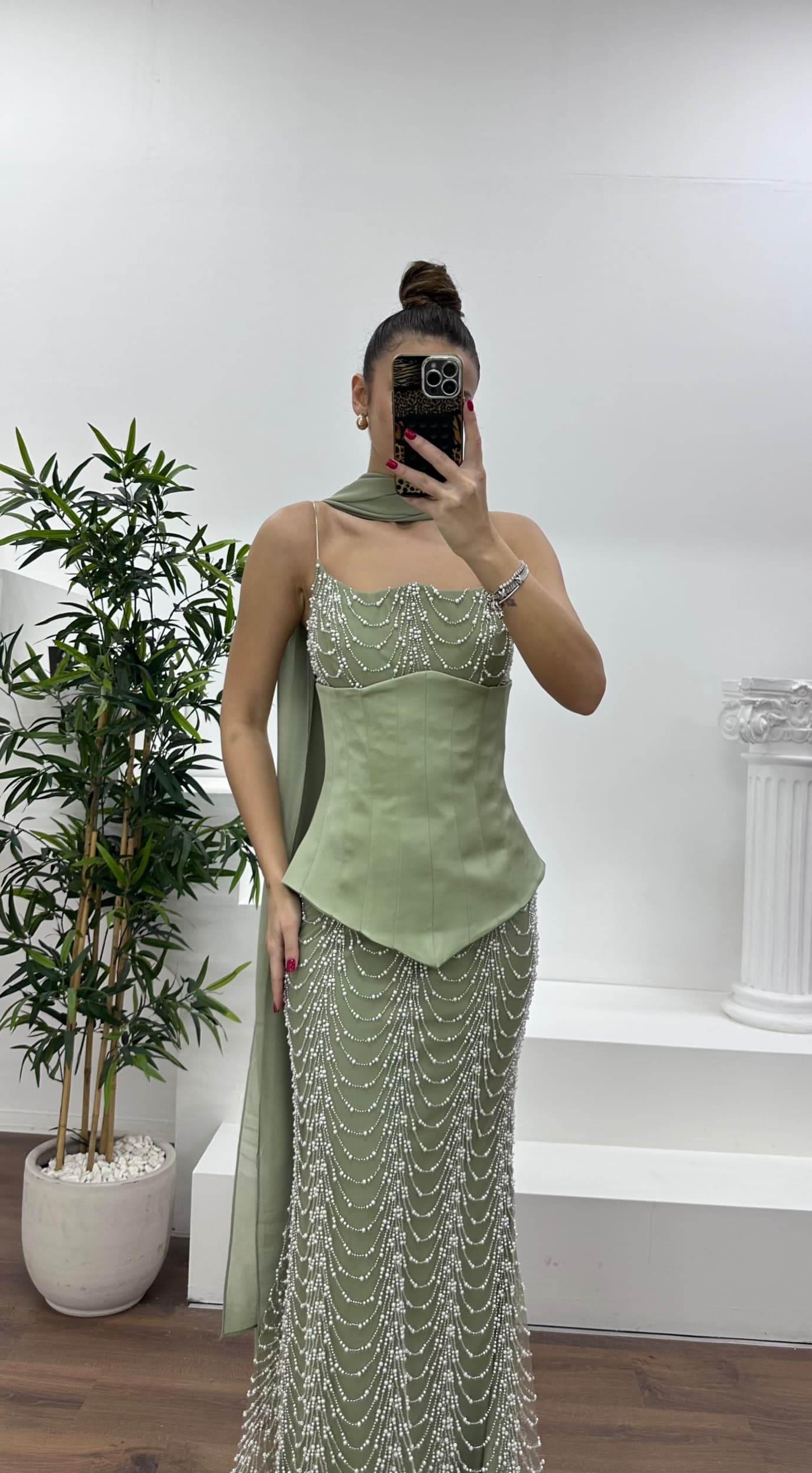 • Haki Straplez Korse Detay İşlemeli Abiye Elbise