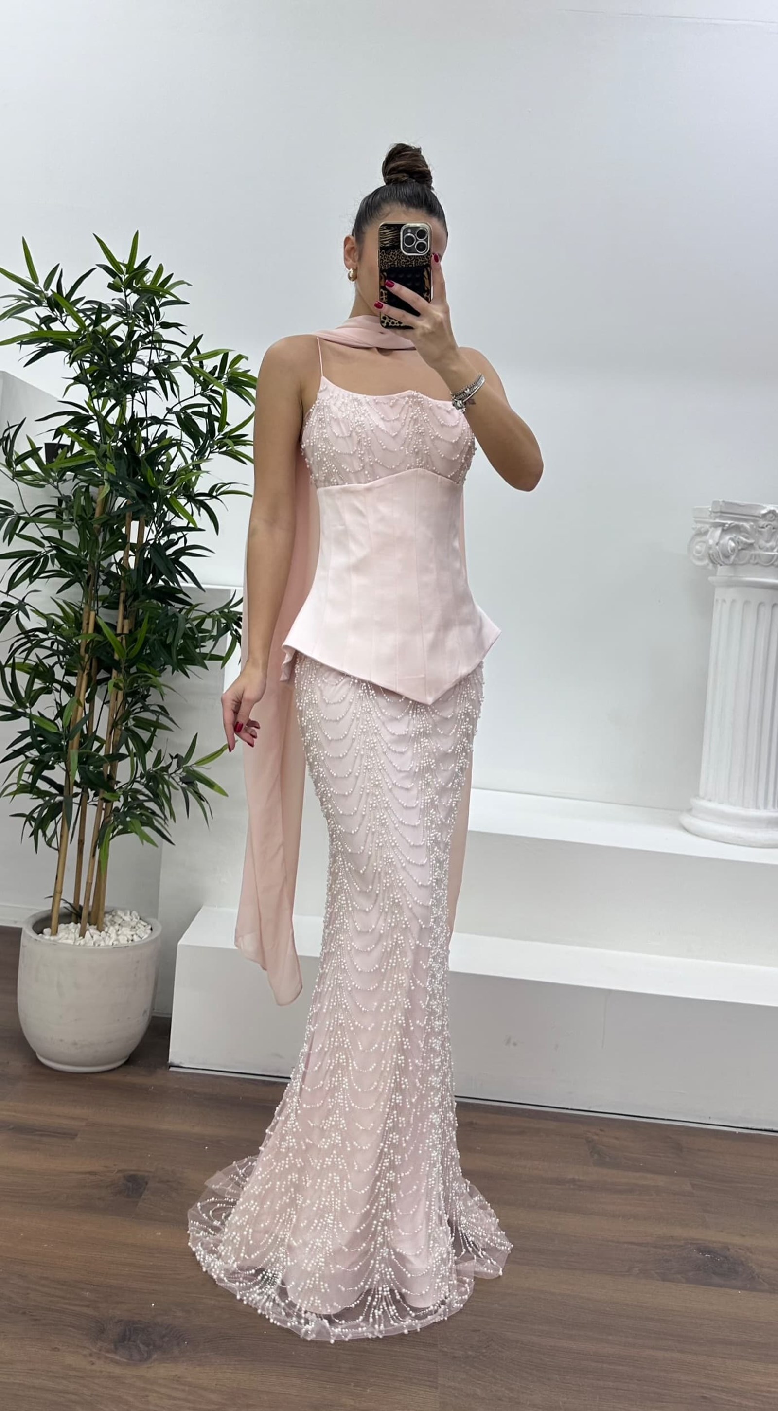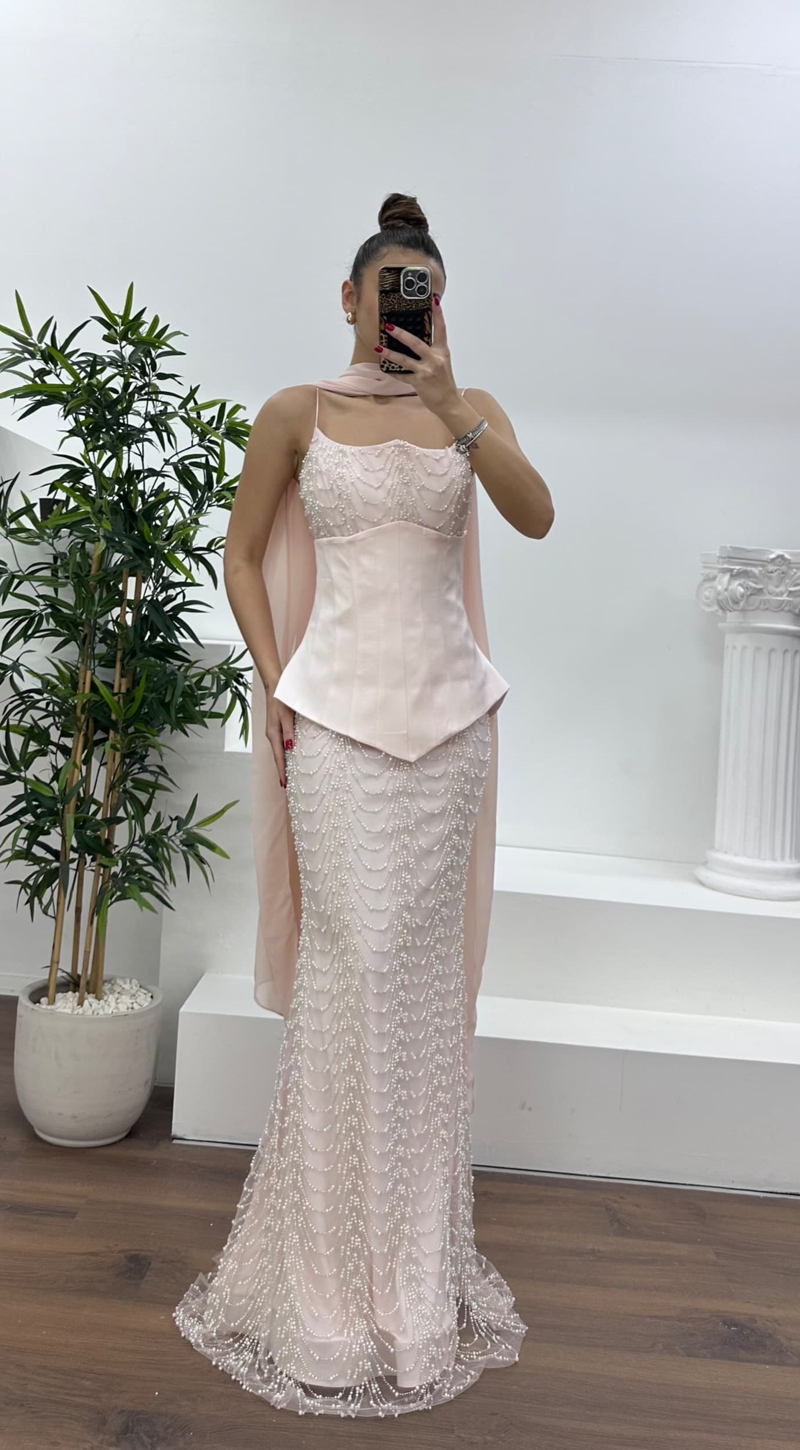 Abito da sera senza spalline stile corsetto ricamato Adatto alle taglie 36–42. Con coppe imbottite, fodera, spalline incrociate sul retro, zip, spalline sottili, dettaglio scialle e tessuto ricamato. Lunghezza: Può variare tra 170–175 cm. Tessuto: Tulle ricamato, 3% elastan, 97% poliestere. Una scelta ideale per occasioni speciali.
