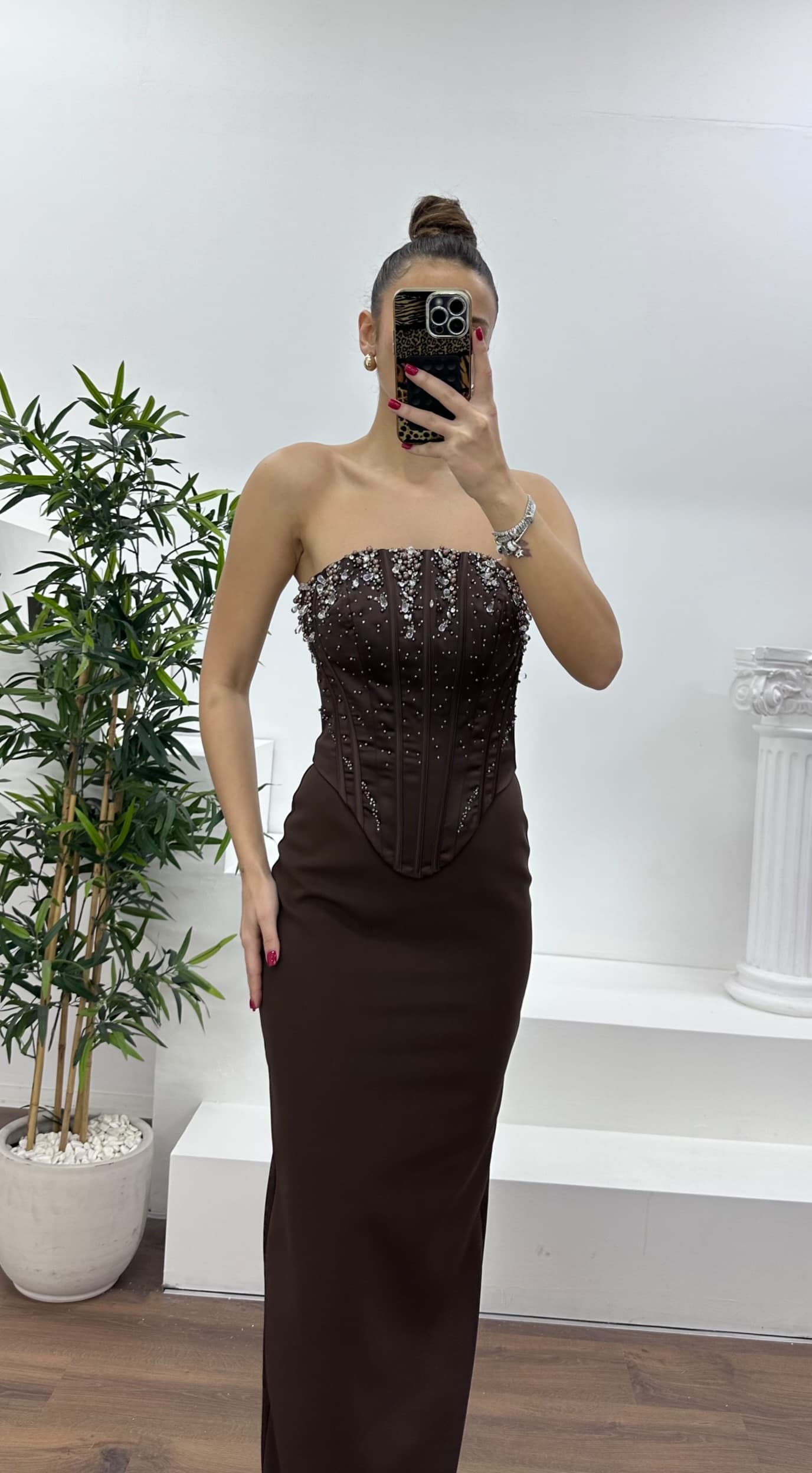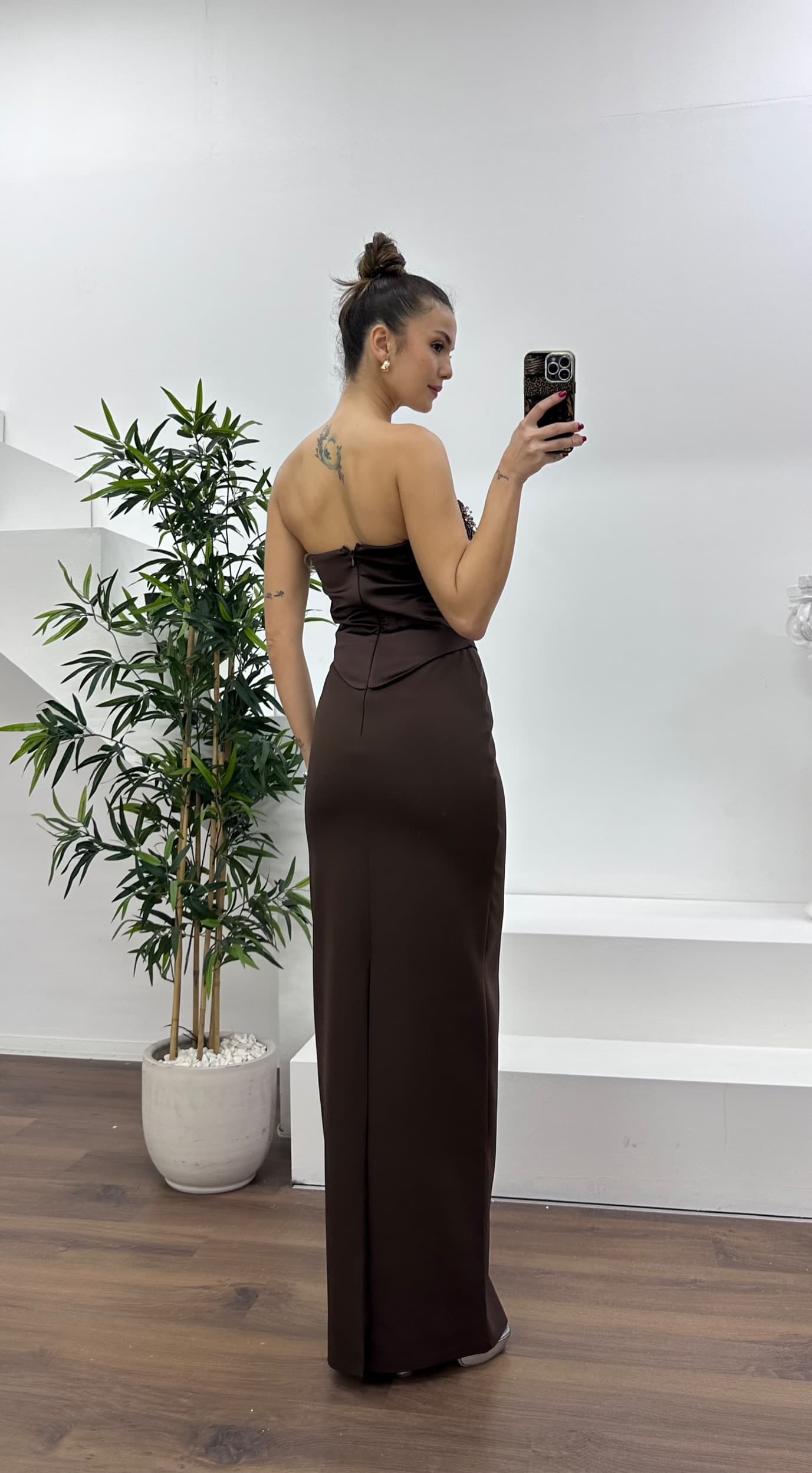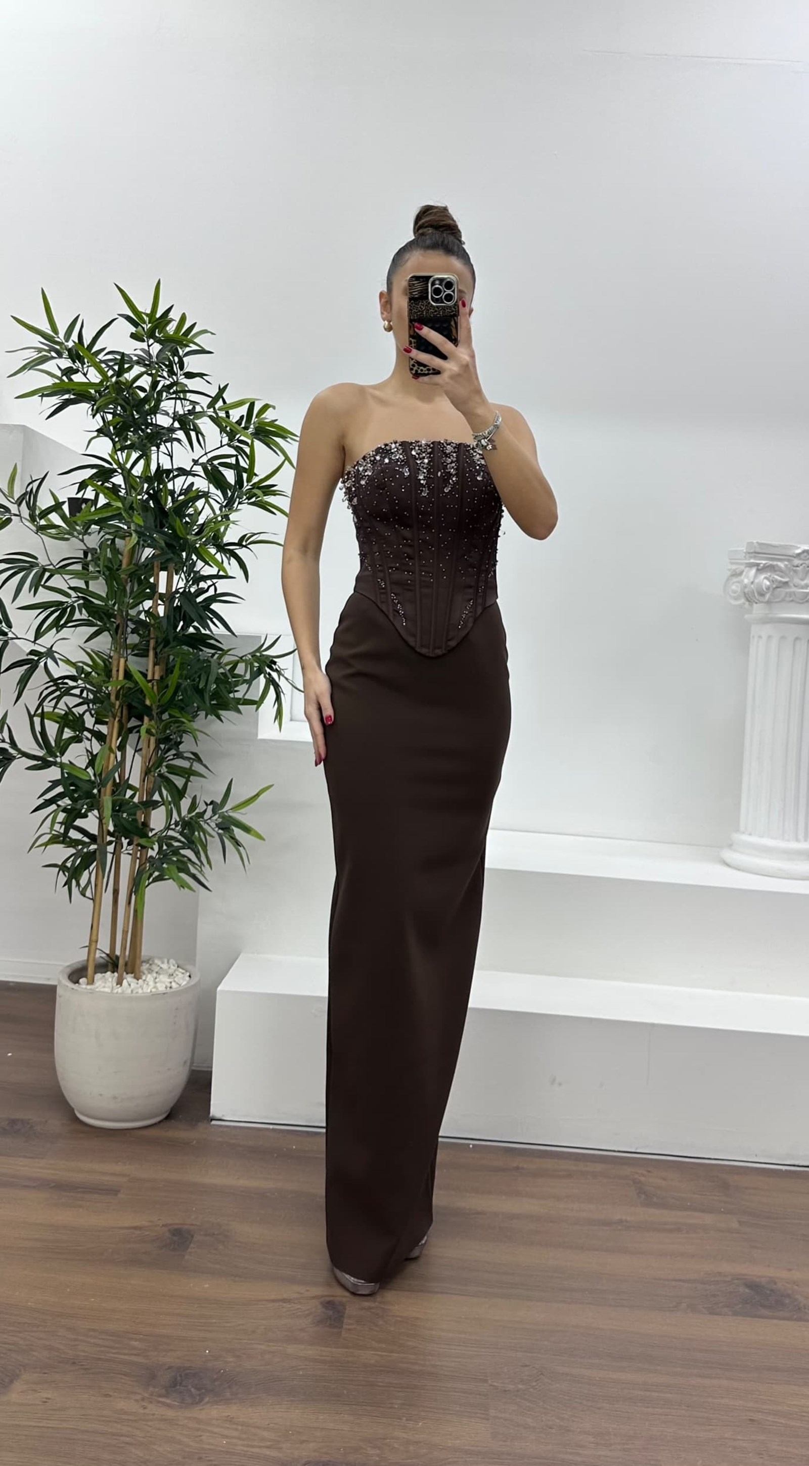 • Kahve Straplez İşleme Detay Abiye Elbise