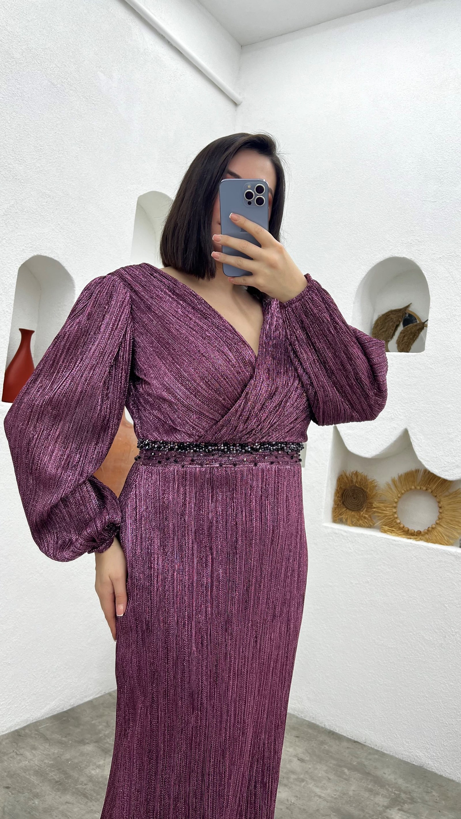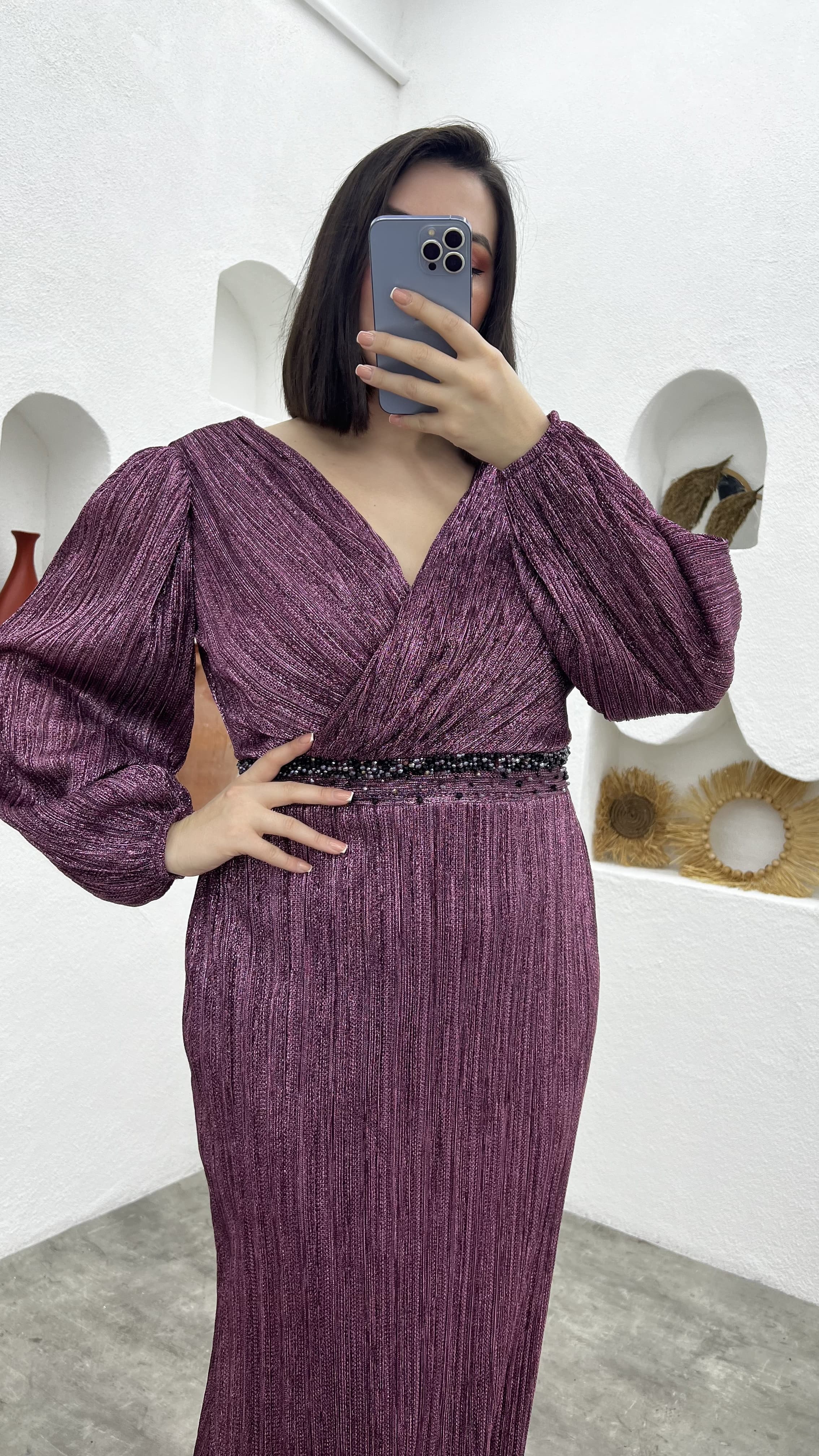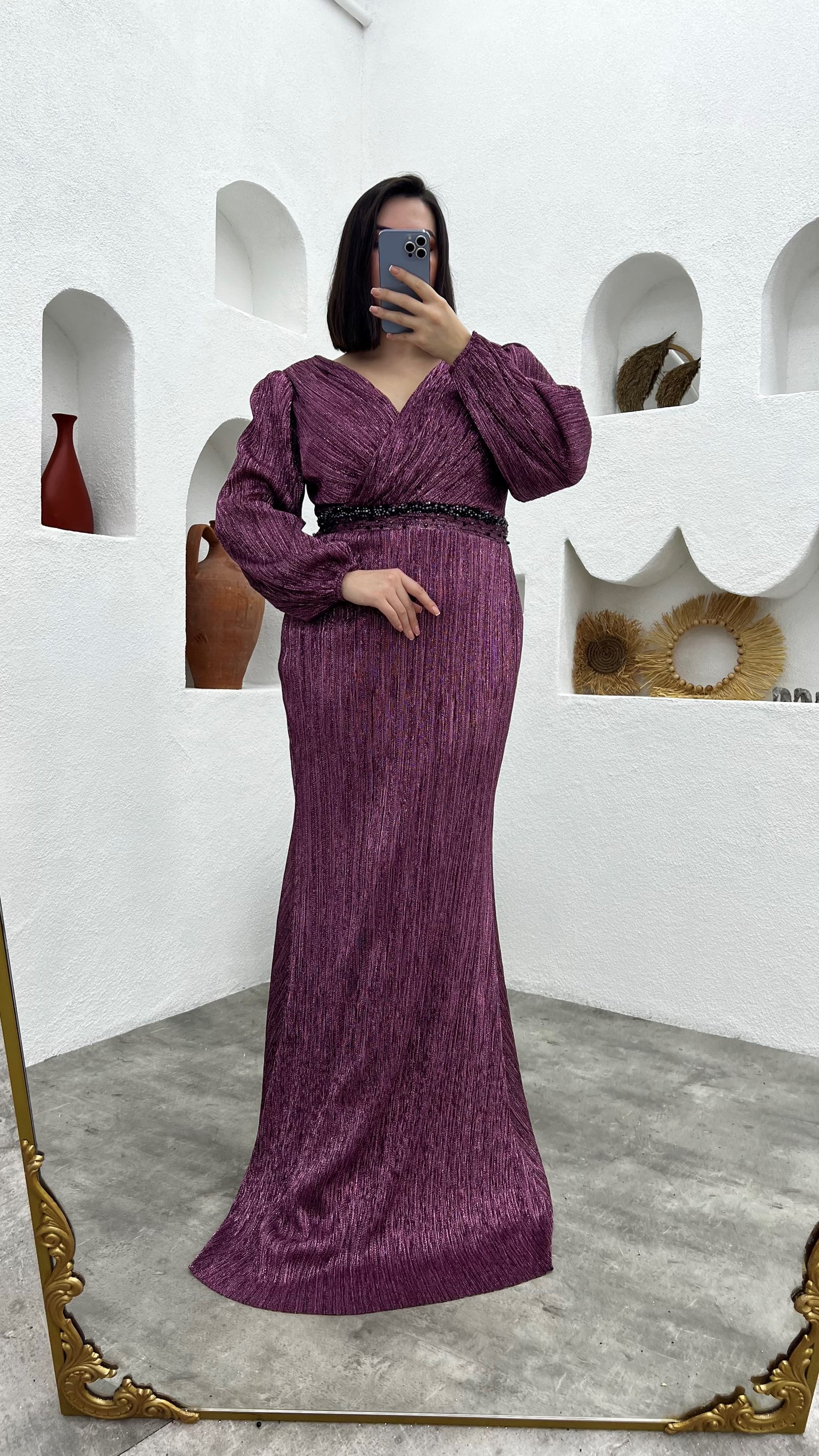 • Gül Kurusu Kruvaze Yaka Beli Motifli Büyük Beden Abiye Elbise