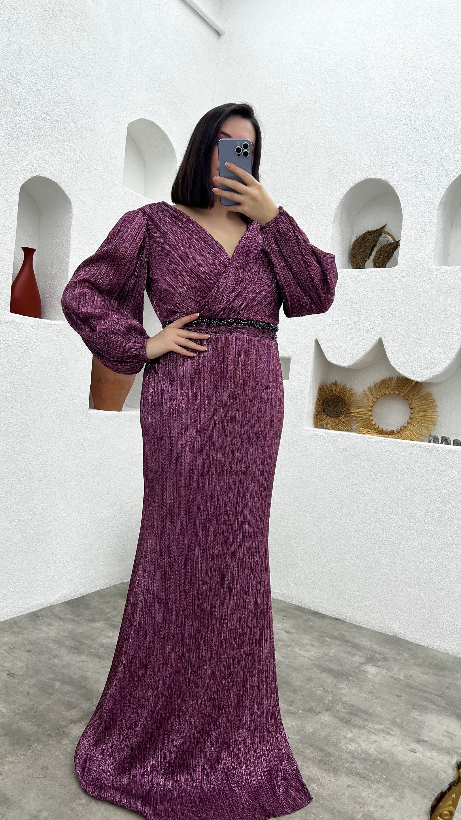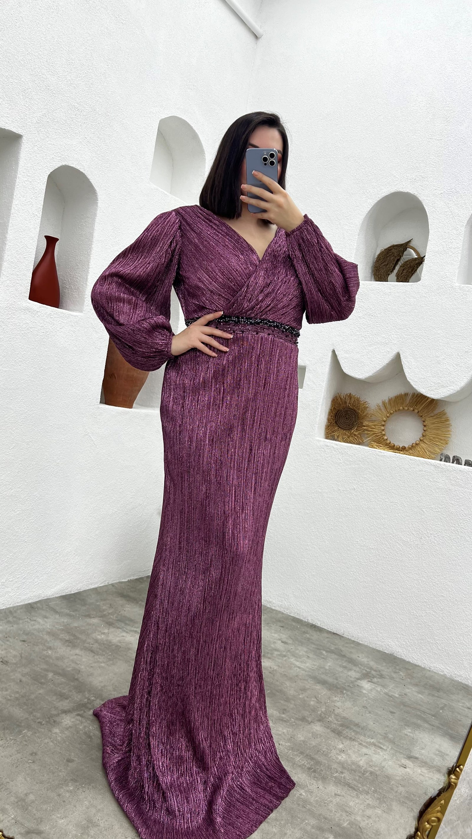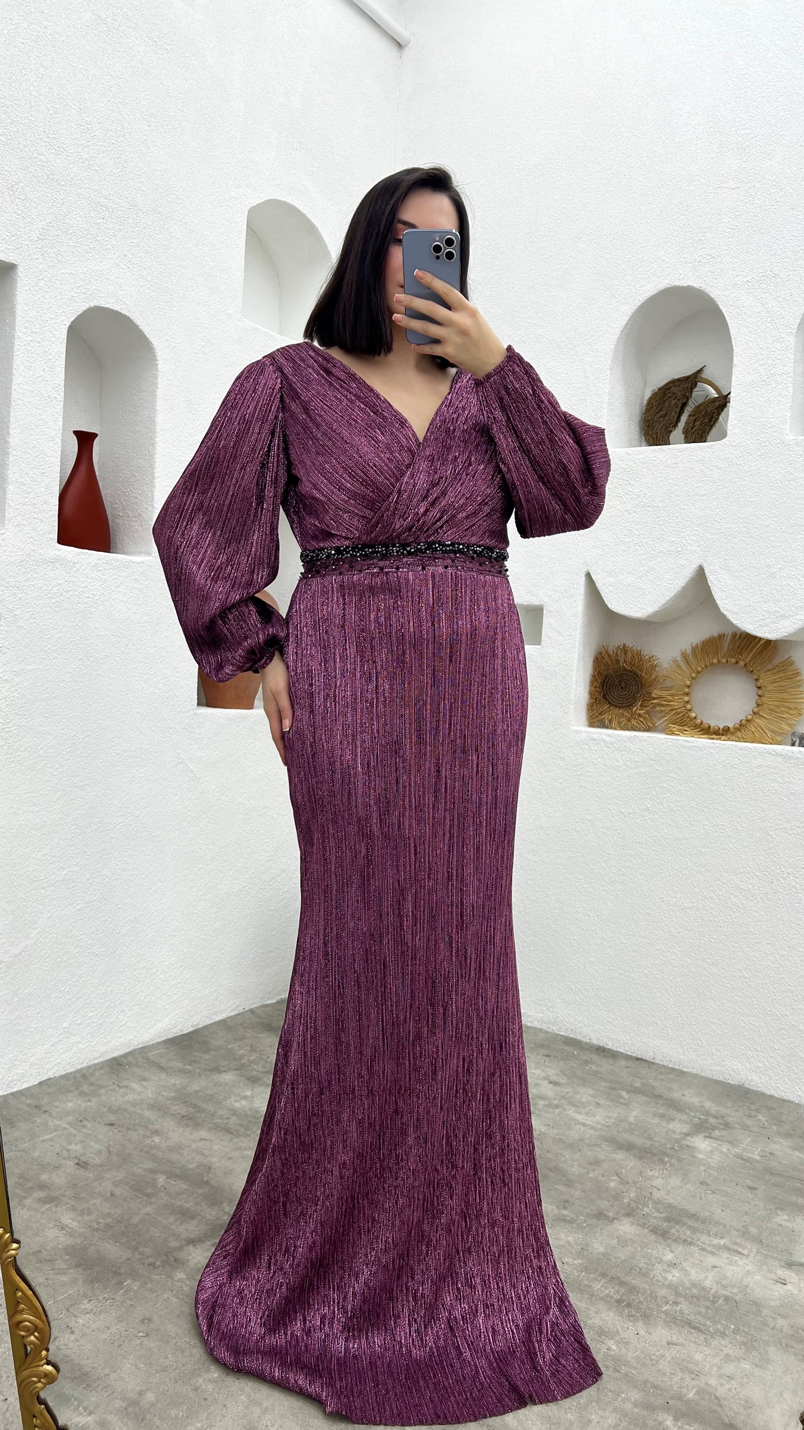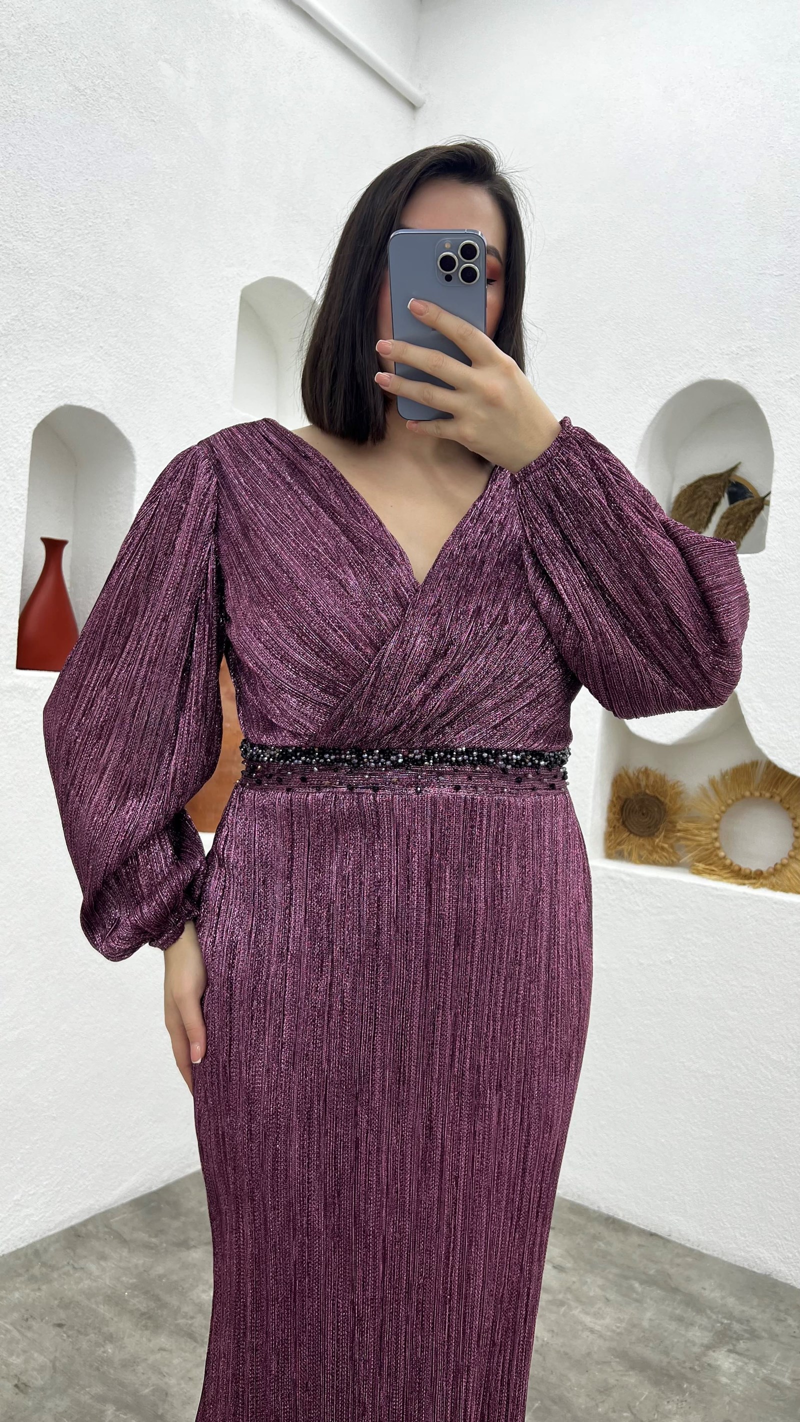 • Gül Kurusu Kruvaze Yaka Beli Motifli Büyük Beden Abiye Elbise