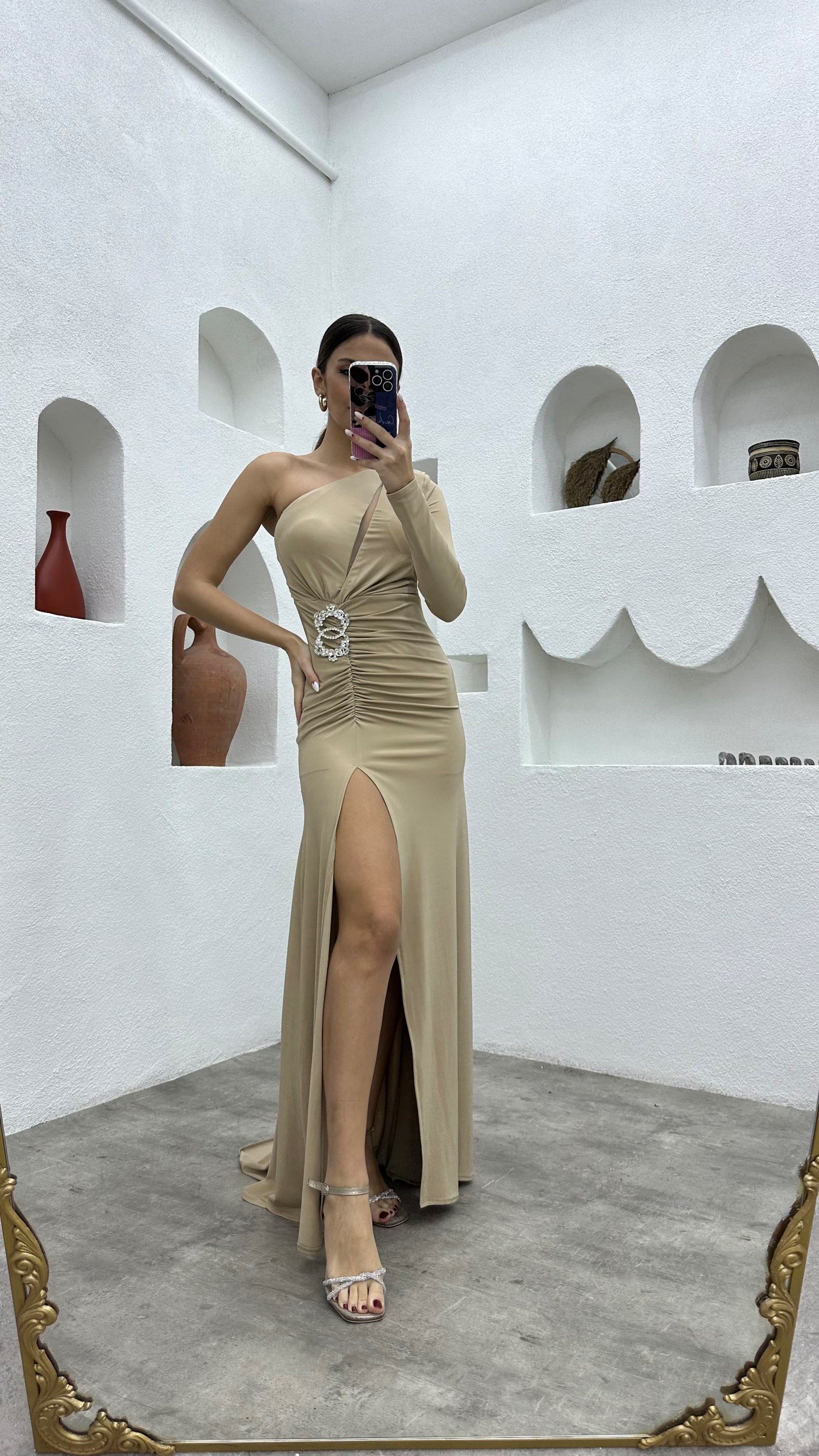 • Bej Broş Detay Tek Omuz Abiye Elbise
