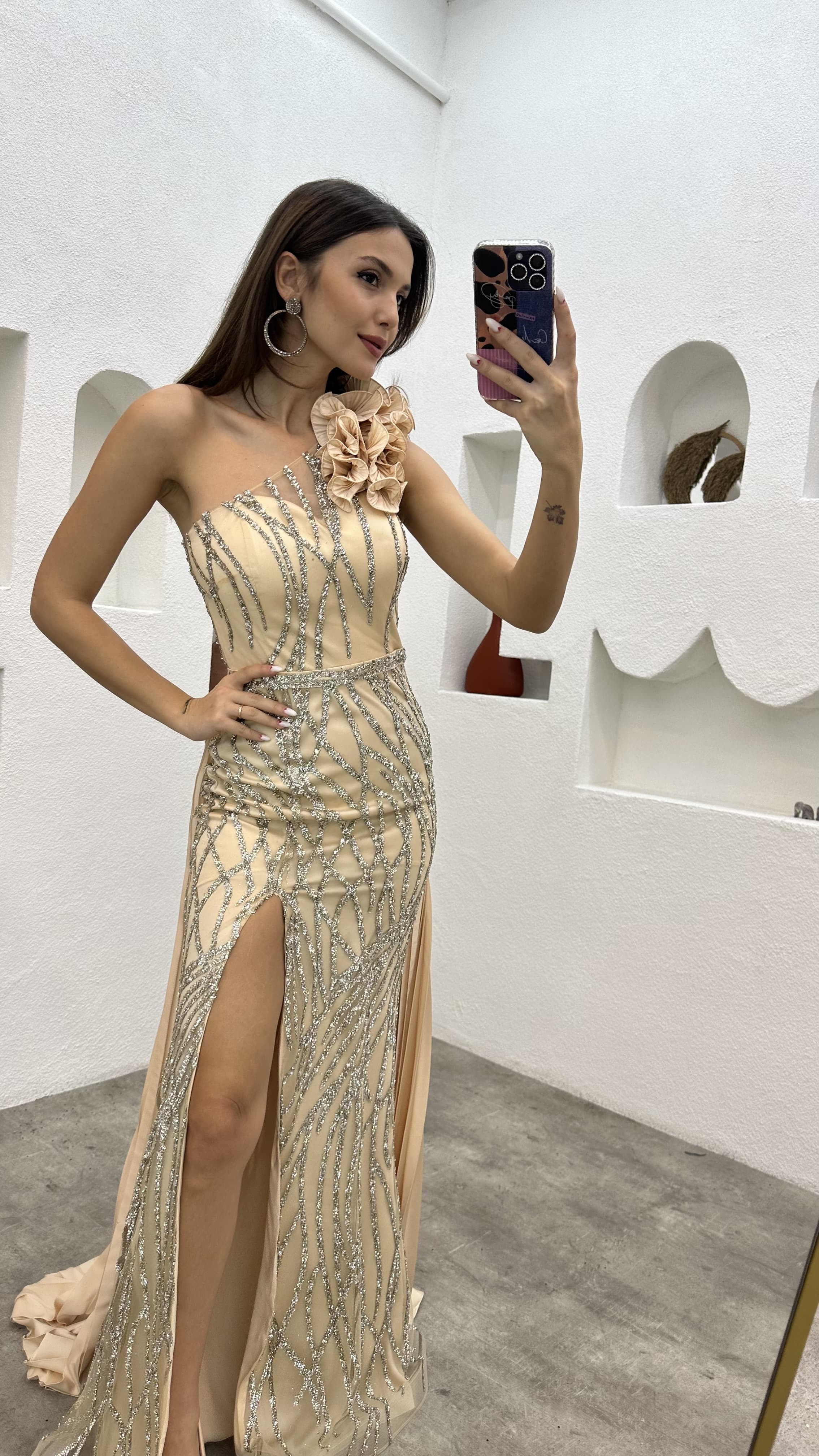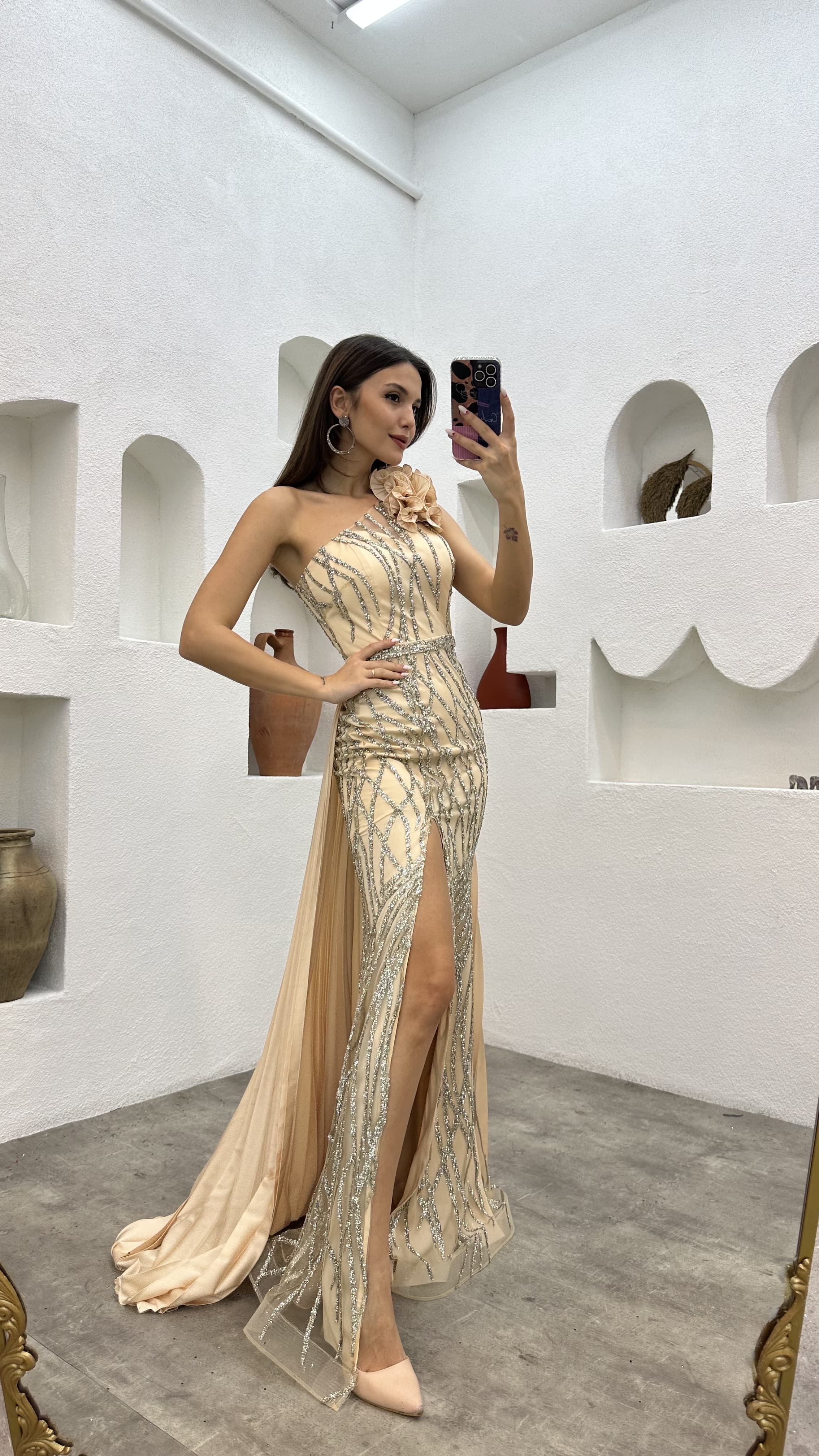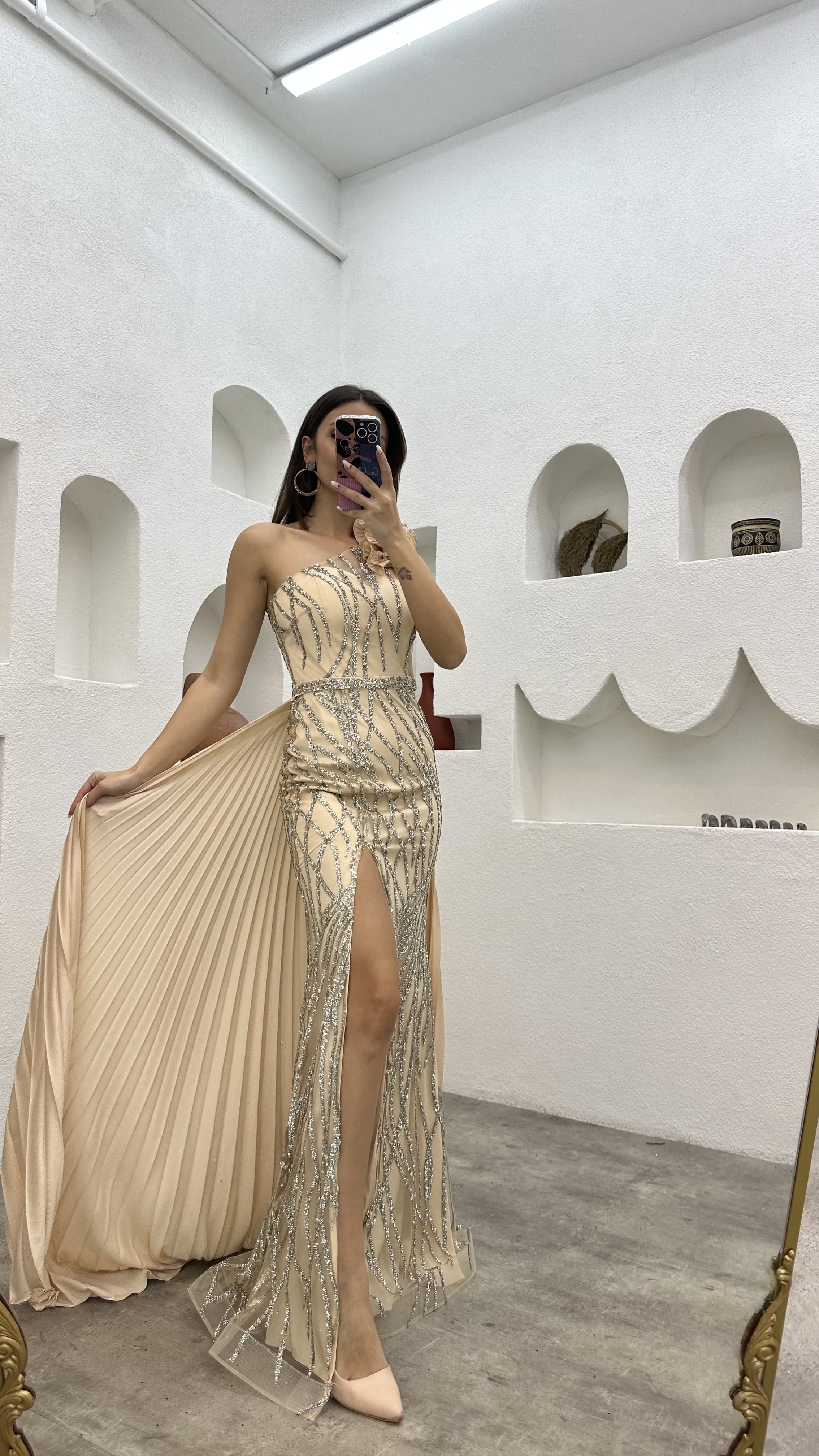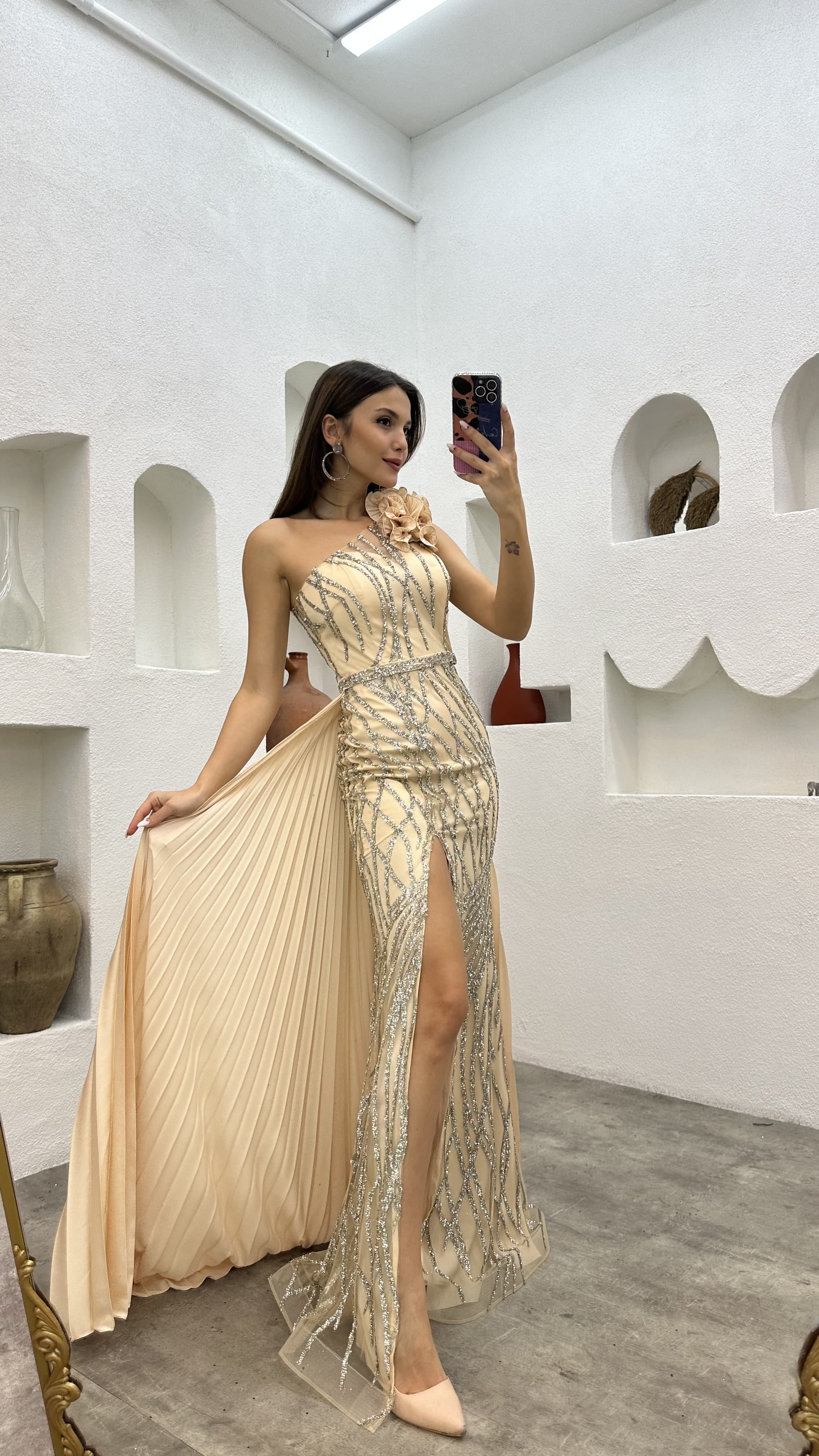 • Bej Tek Omuz Volanlı İşlemeli Abiye Elbise