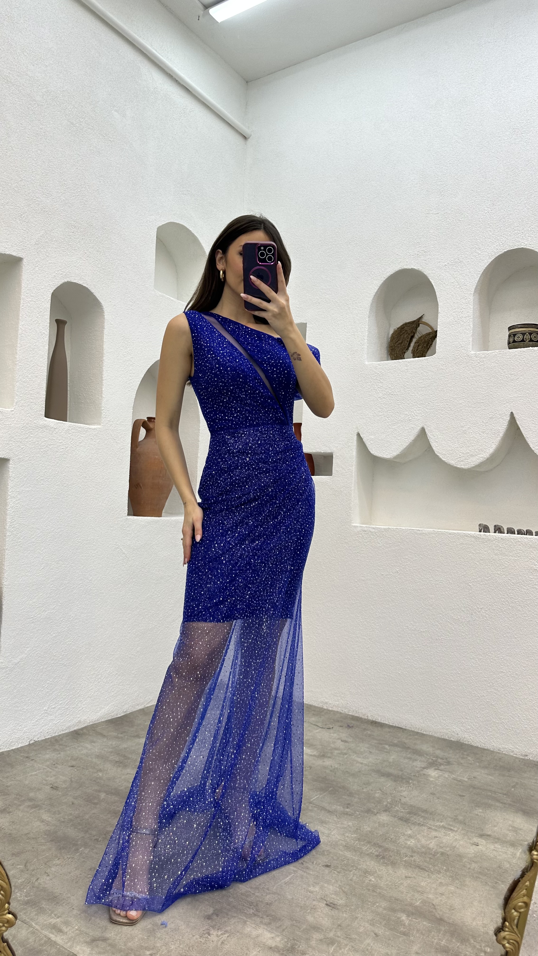 Saks Tek Omuz İşlemeli Simli Abiye Elbise