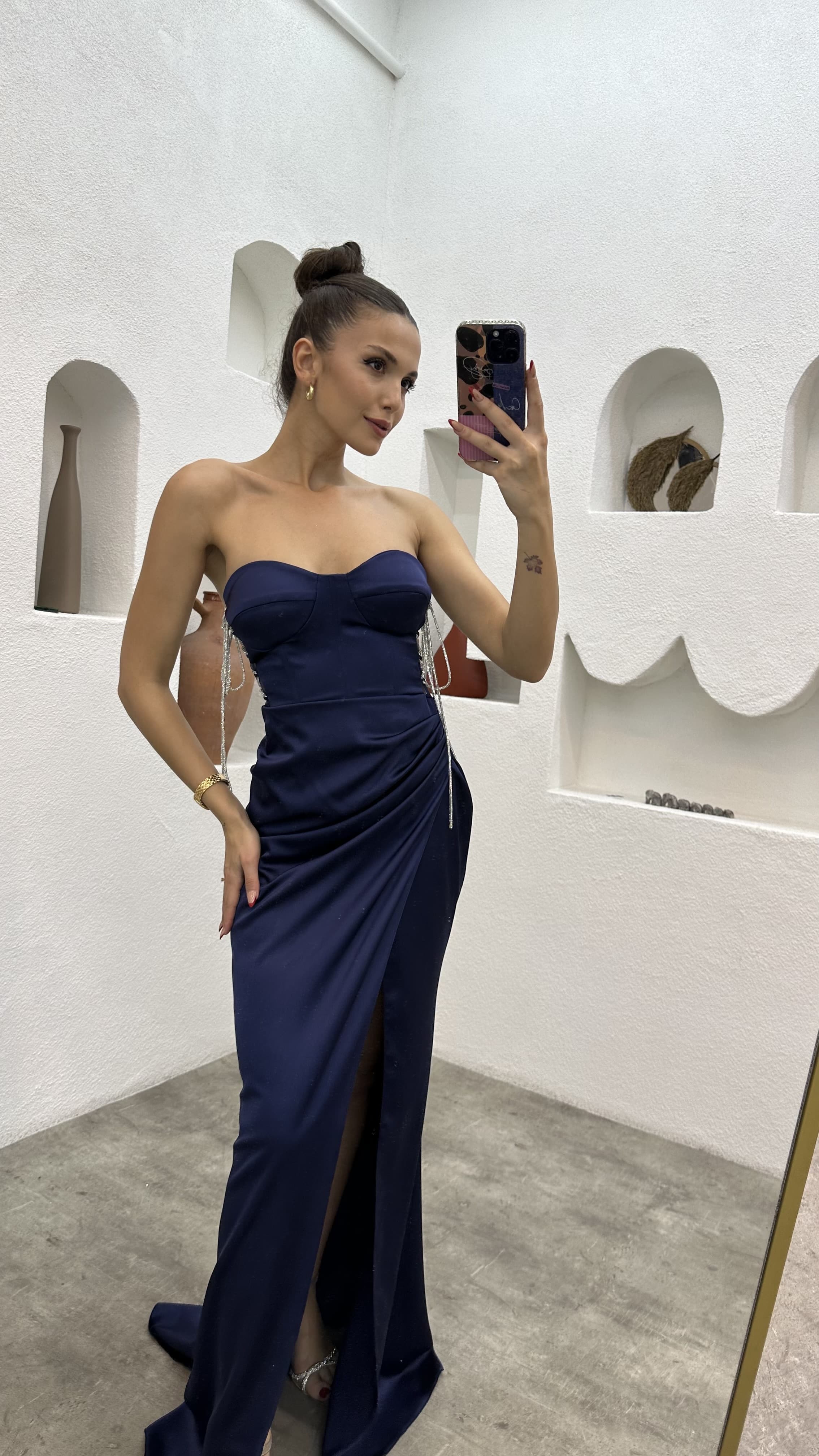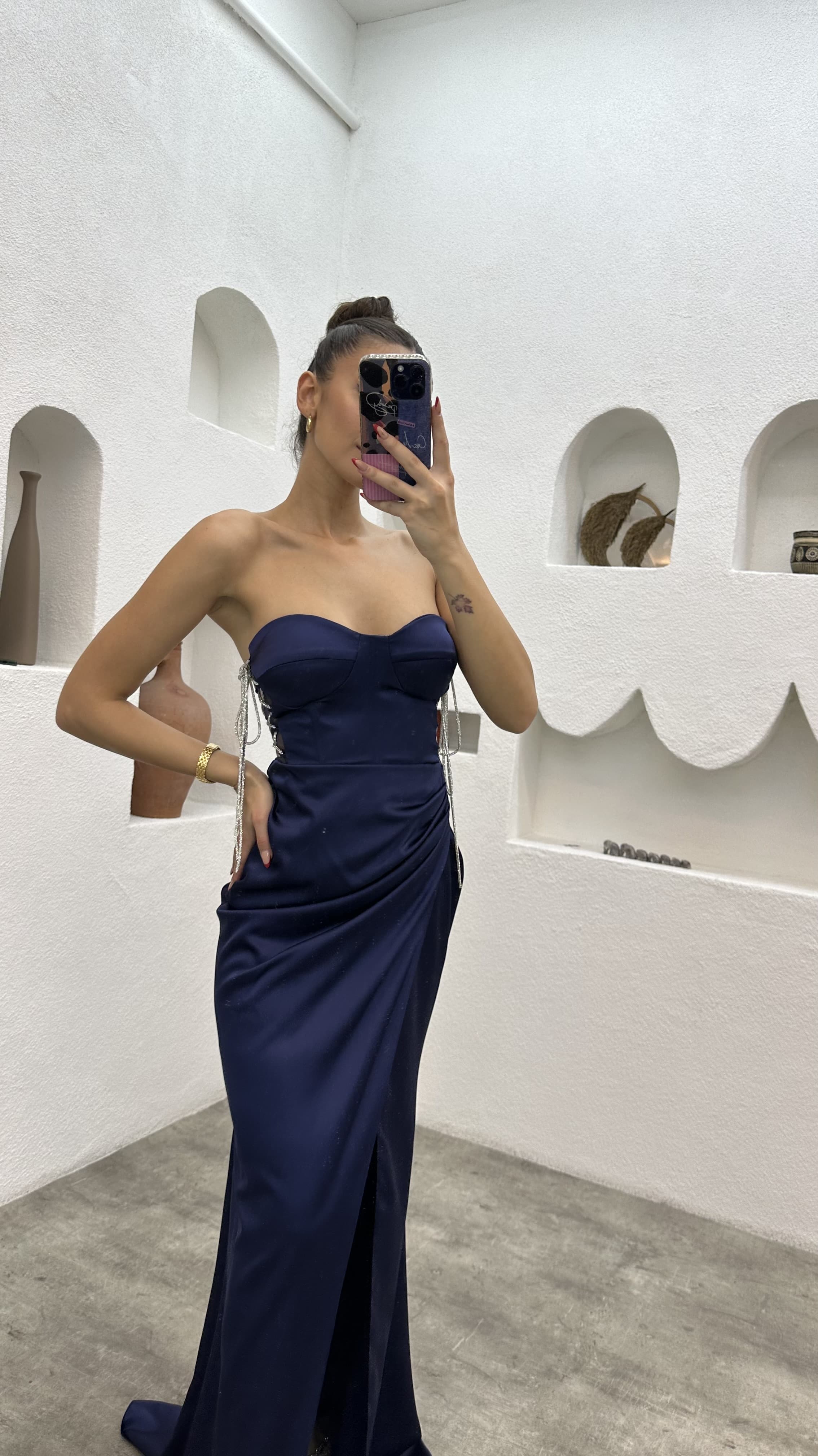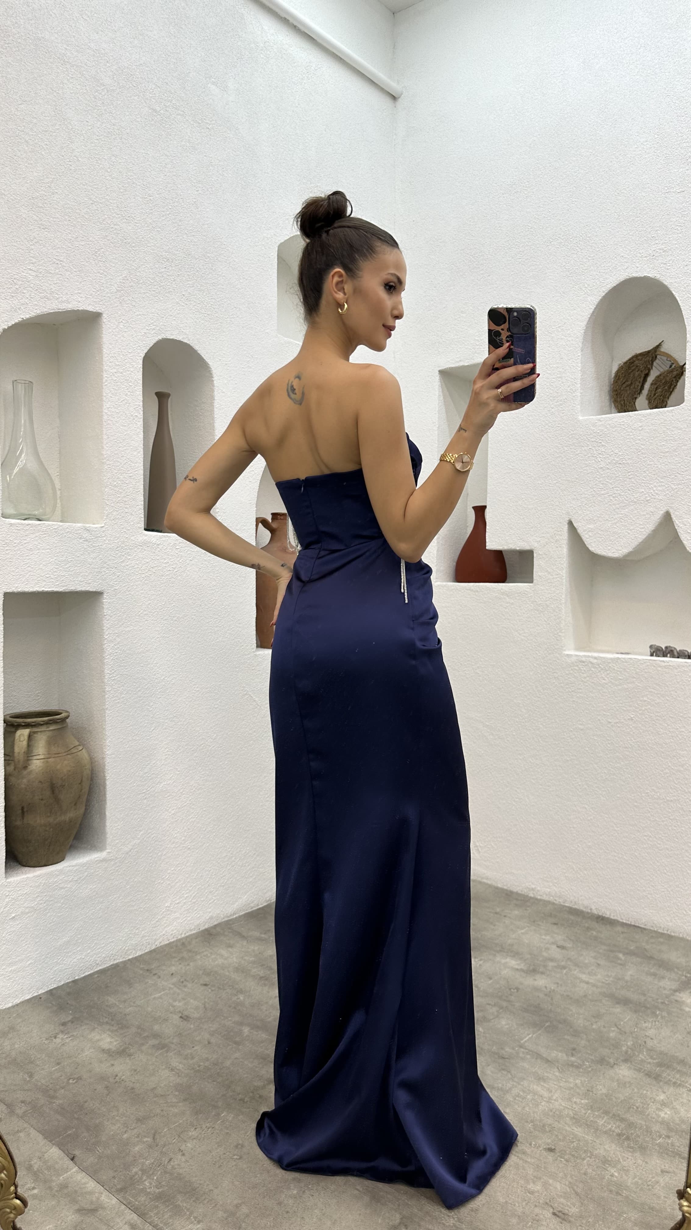 • Lacivert Straplez Drapeli Saten Abiye Elbise