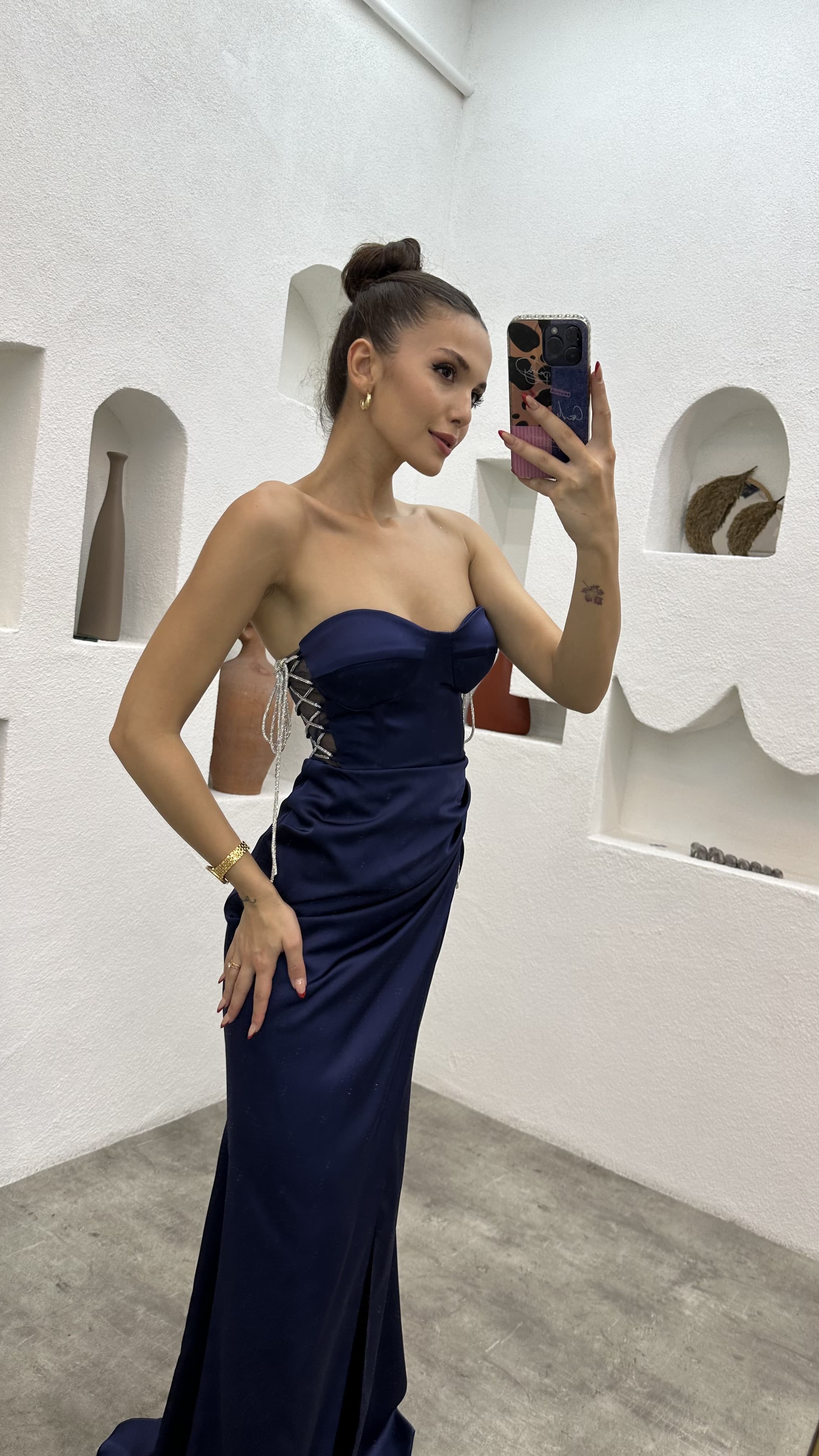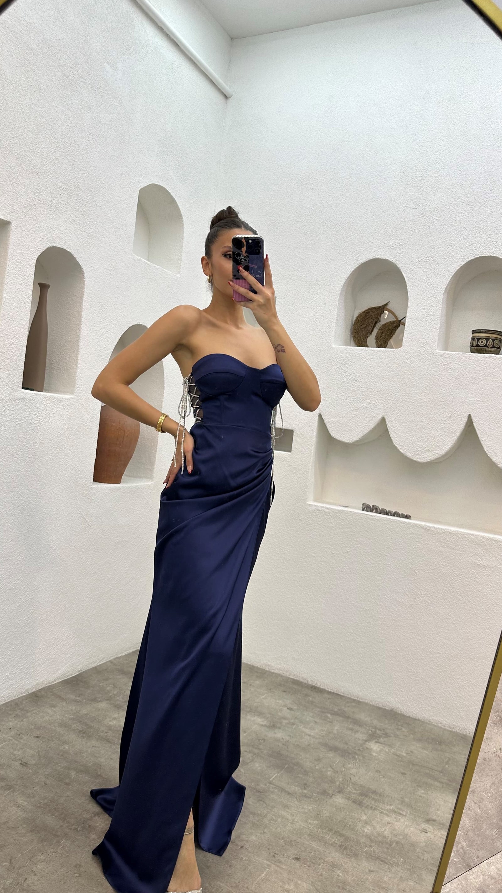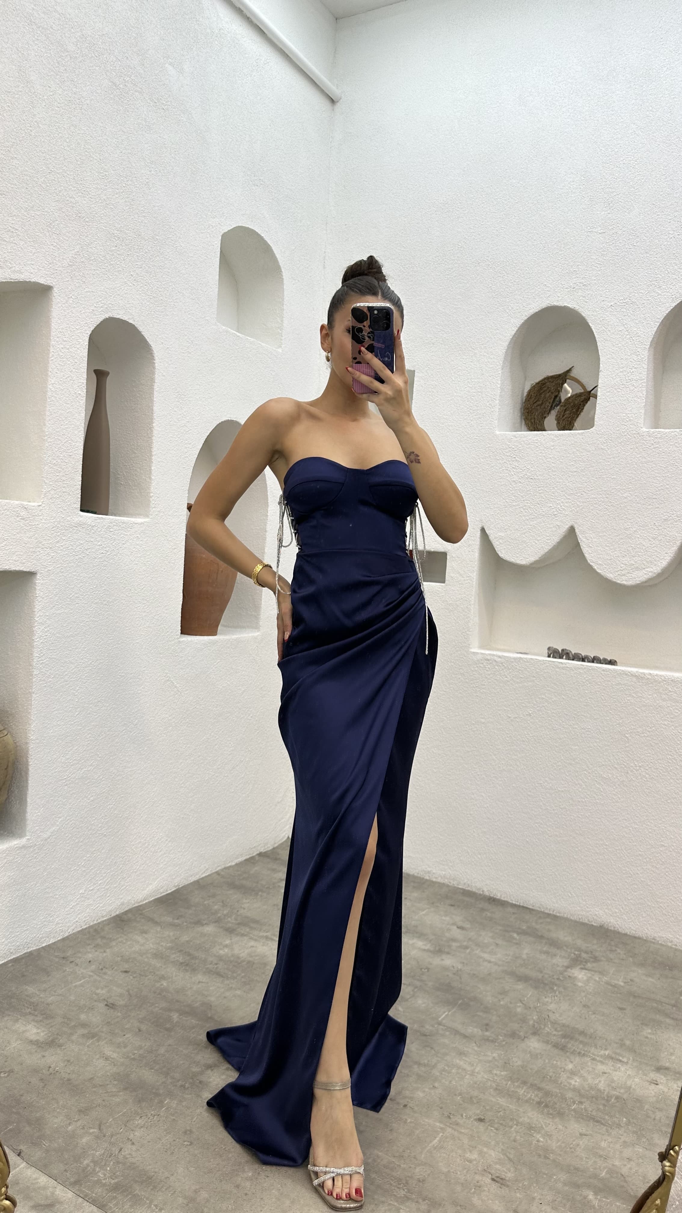 • Lacivert Straplez Drapeli Saten Abiye Elbise