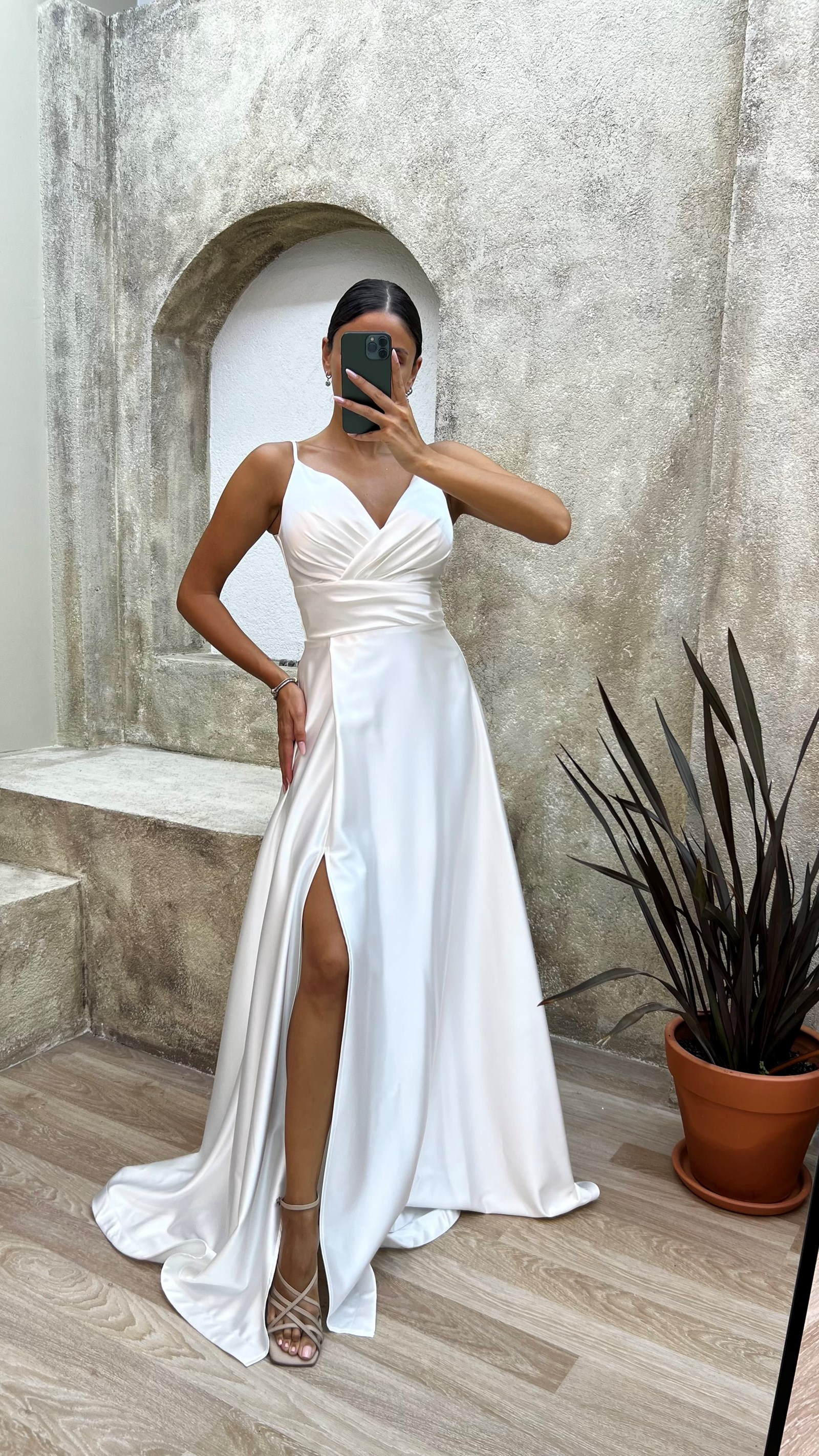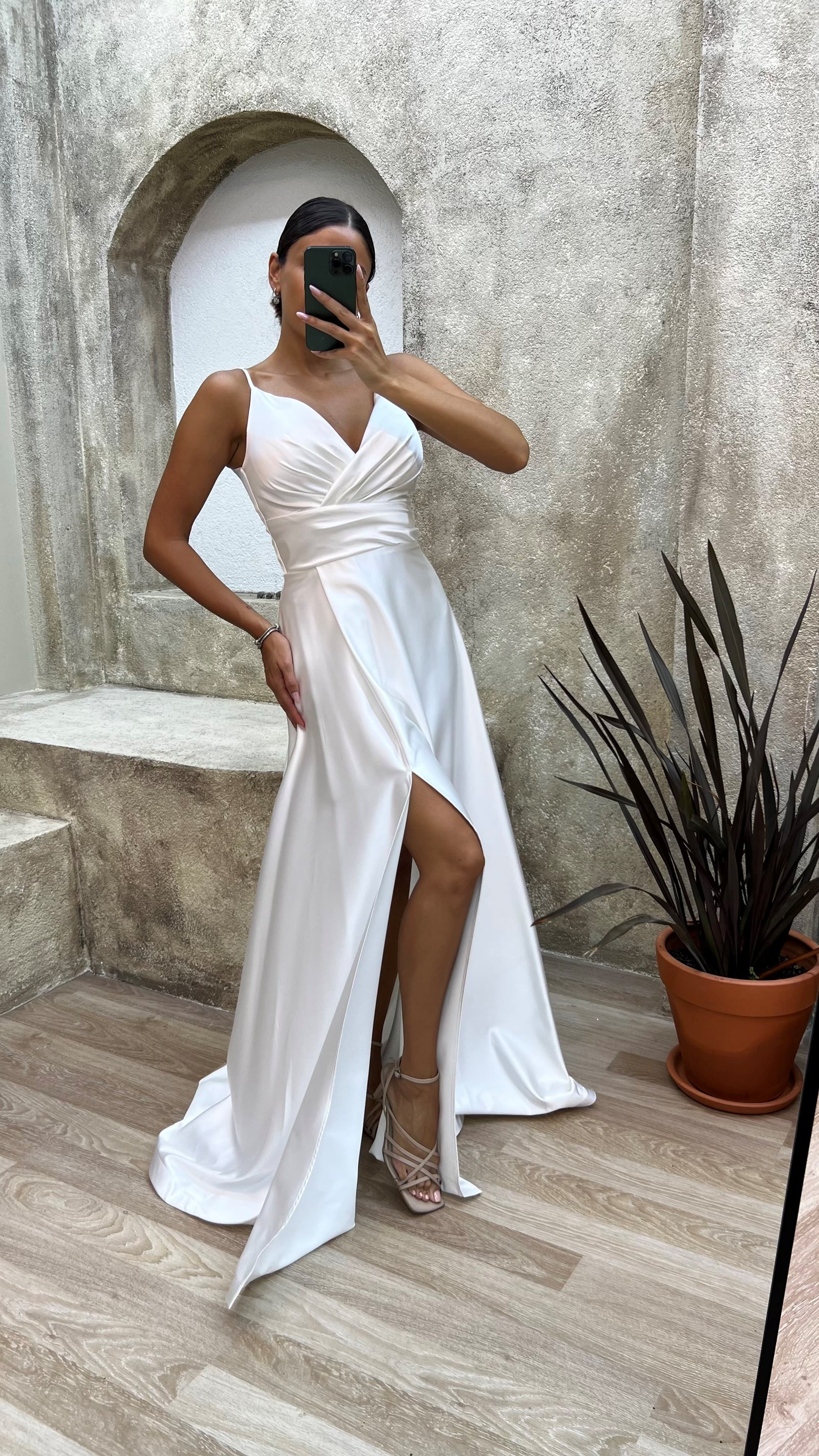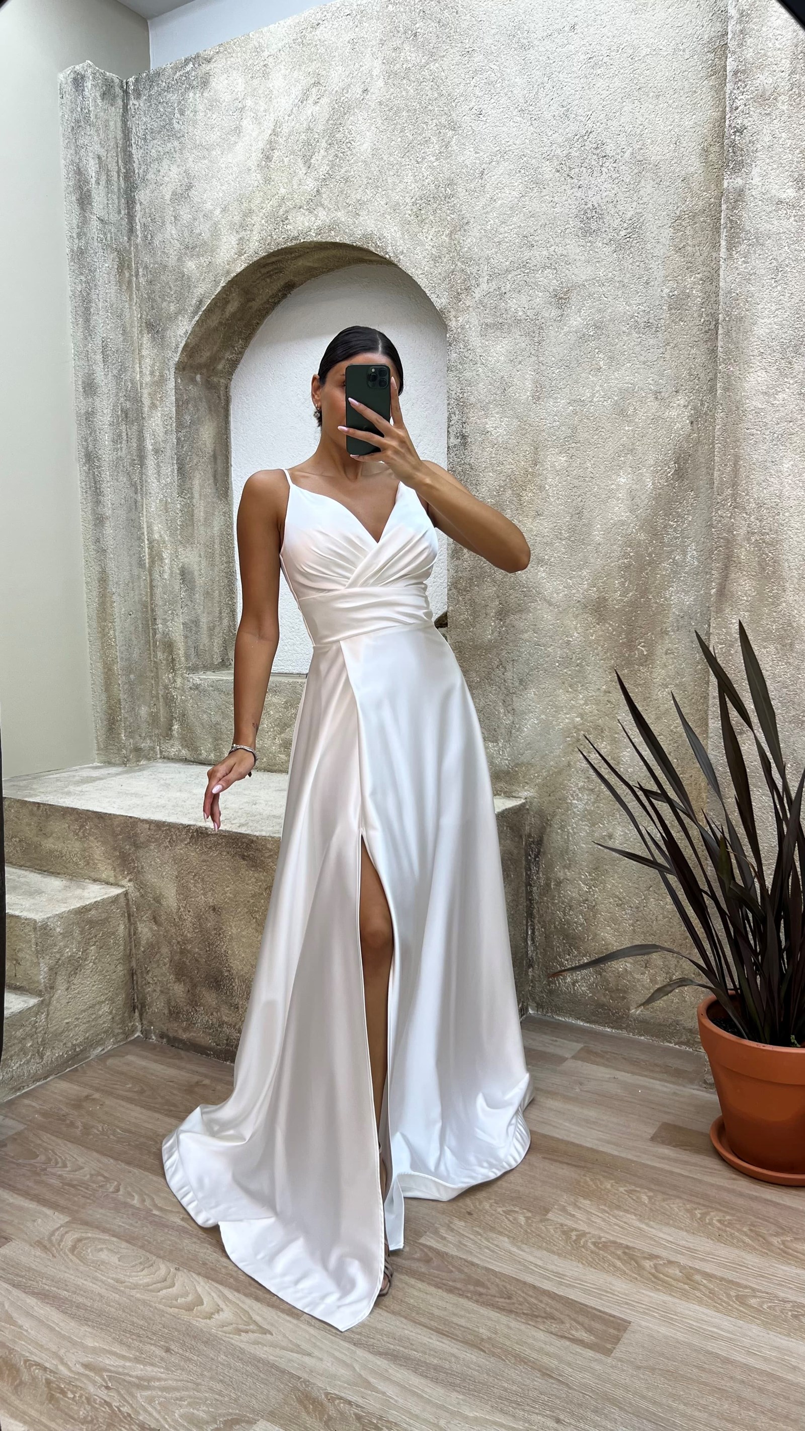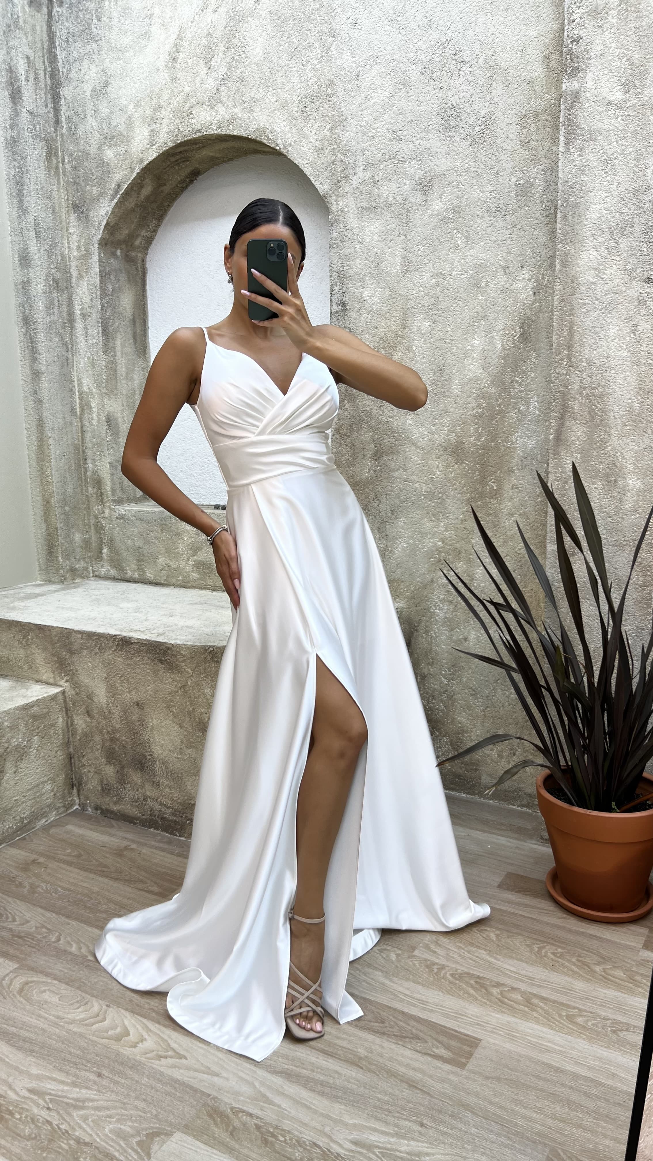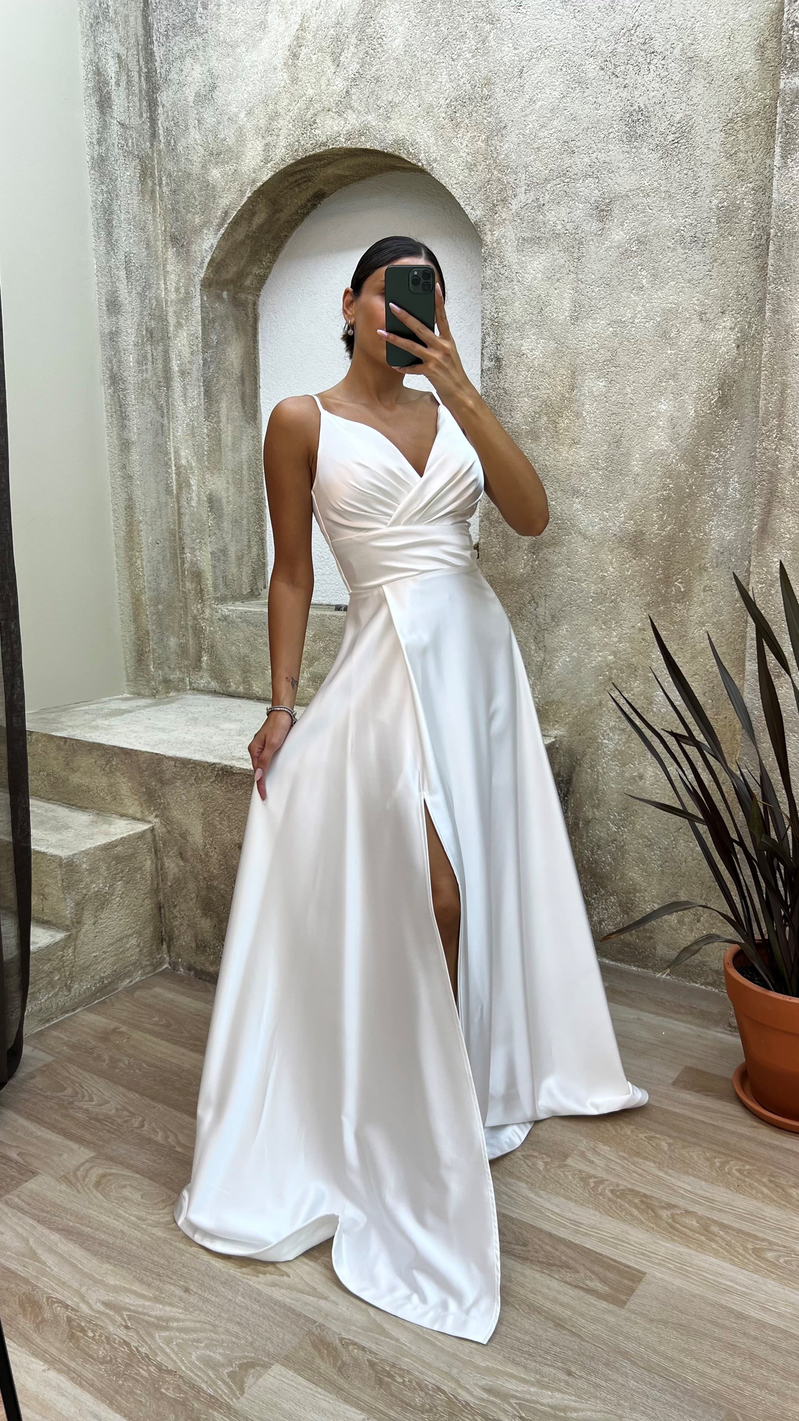 Beyaz İp Askılı Kalp Yaka Saten Abiye Elbise