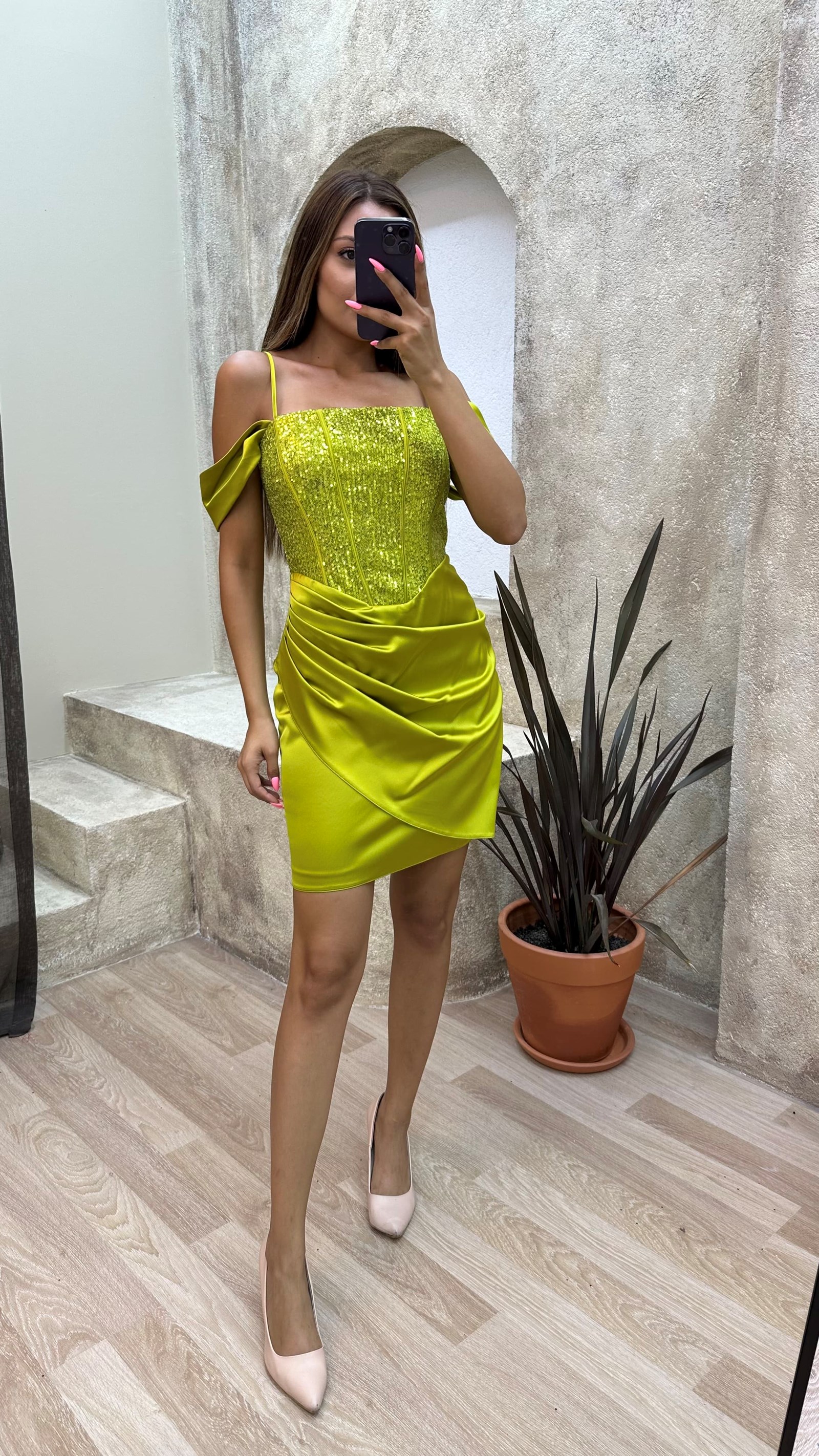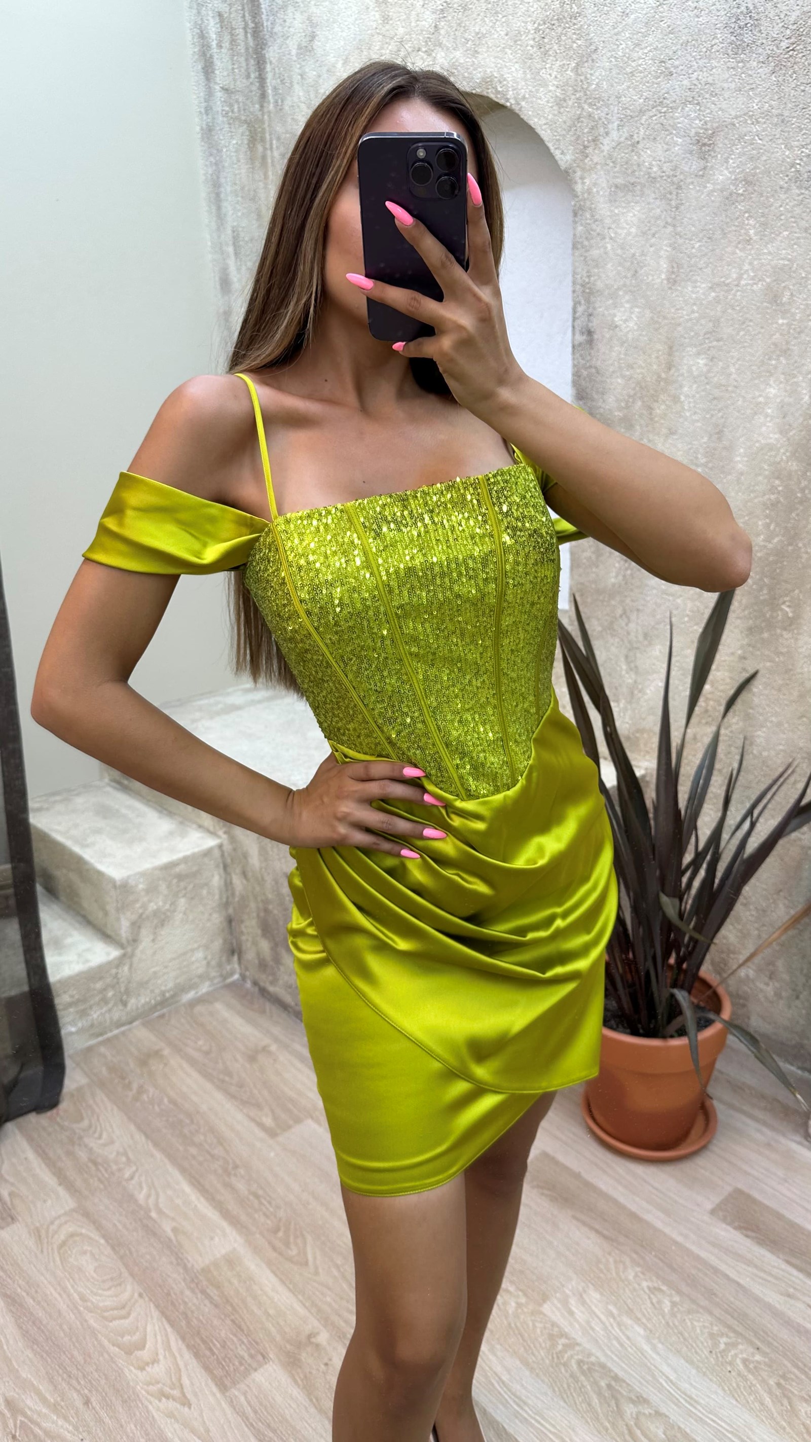 • Yeşil İp Askılı Göğsü İşlemeli Mini Elbise