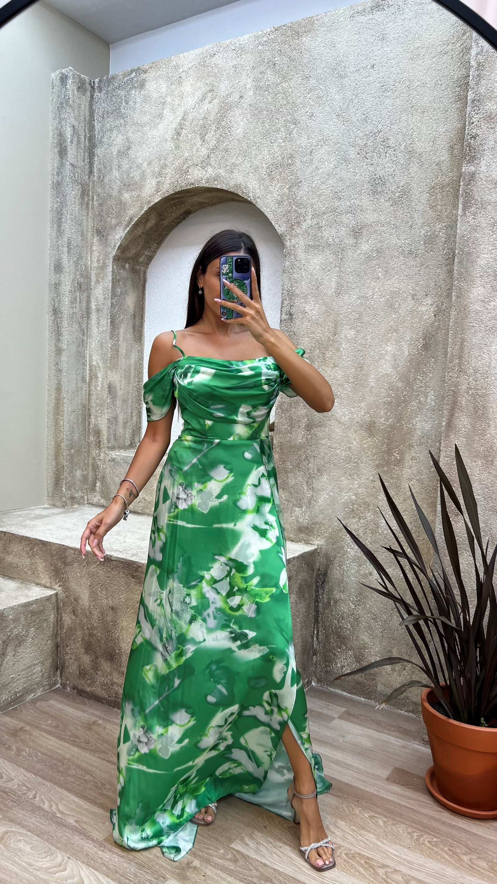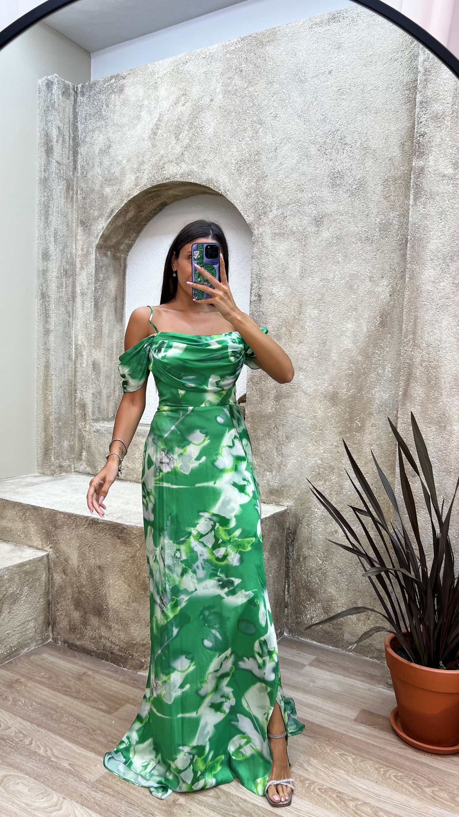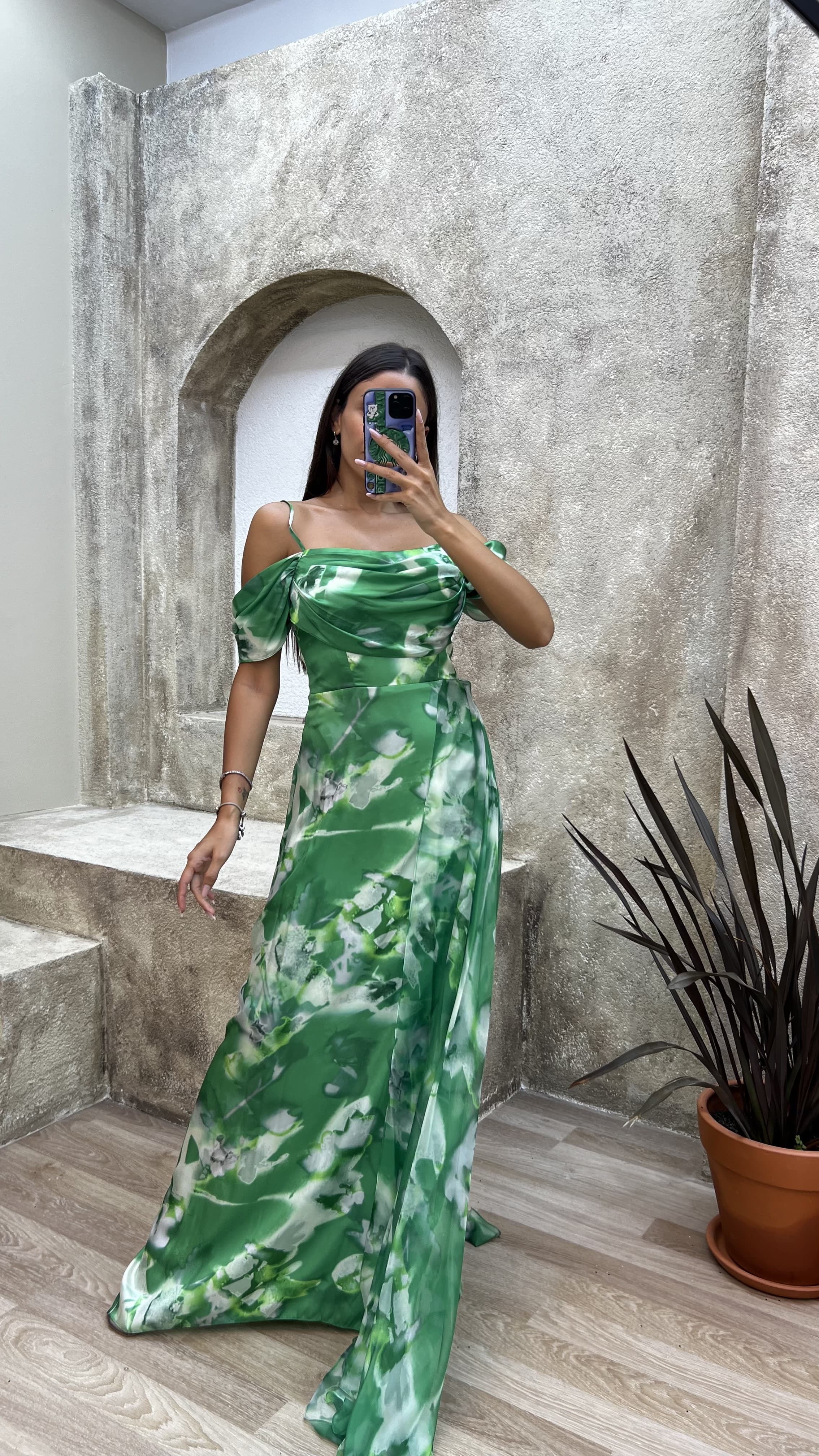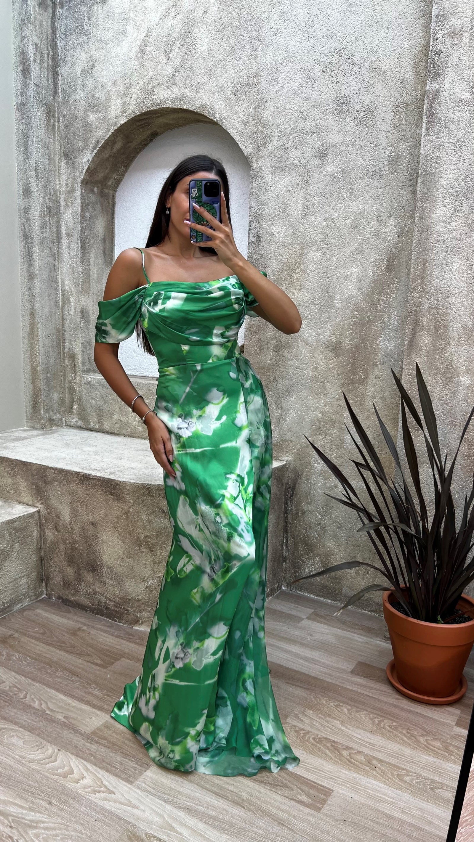 Yeşil İp Askılı Kol Detay Desenli Abiye Elbise