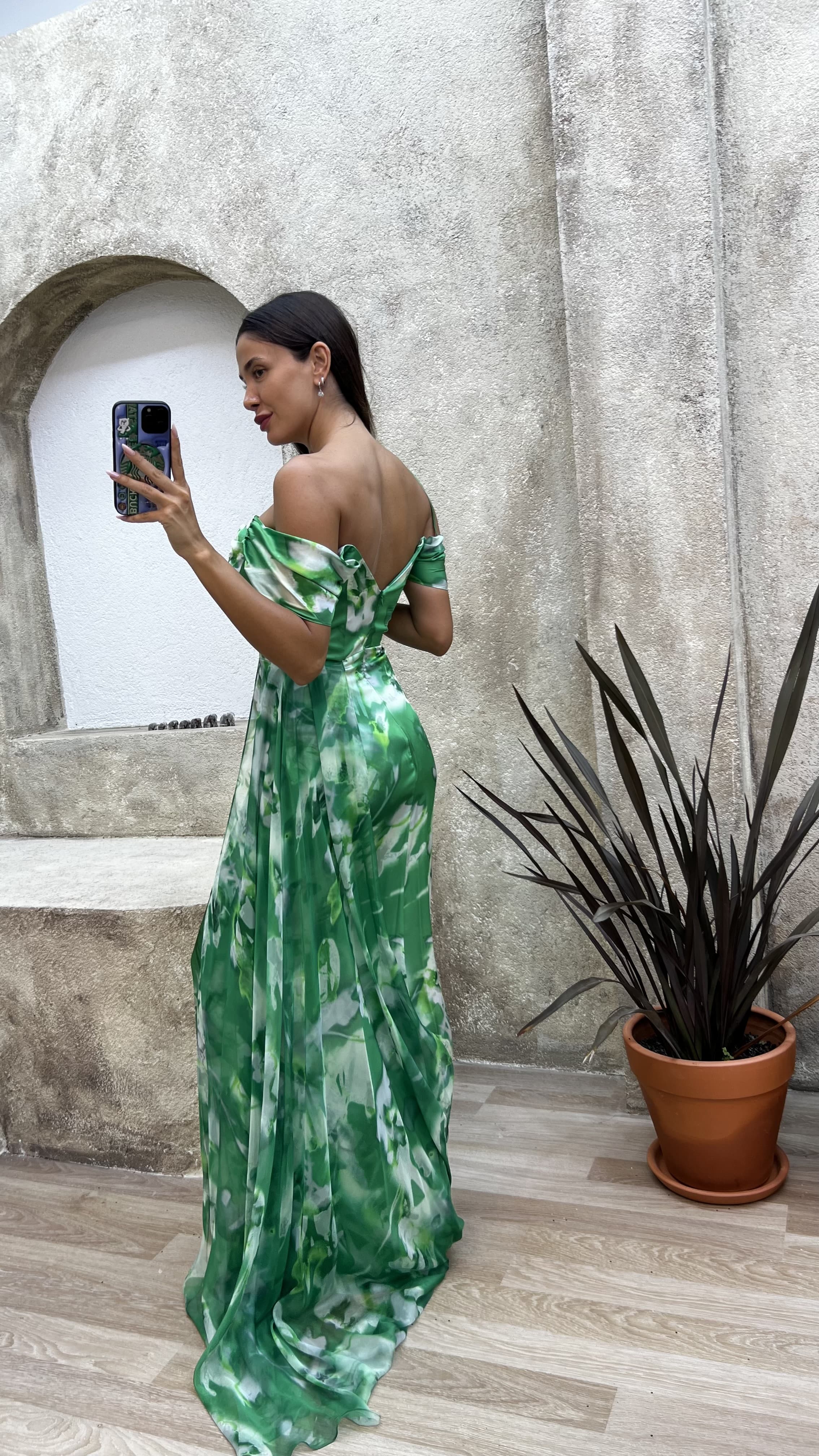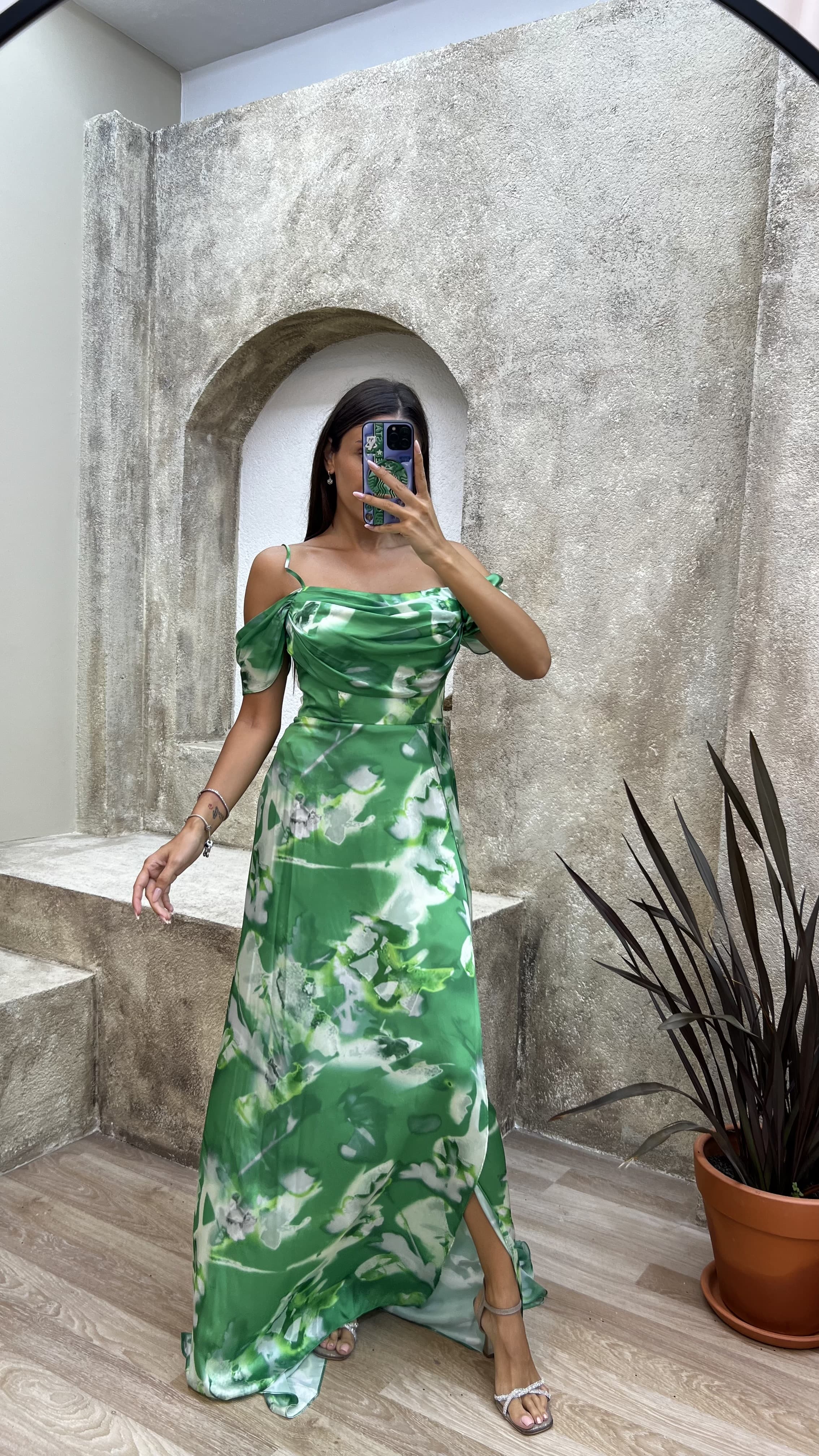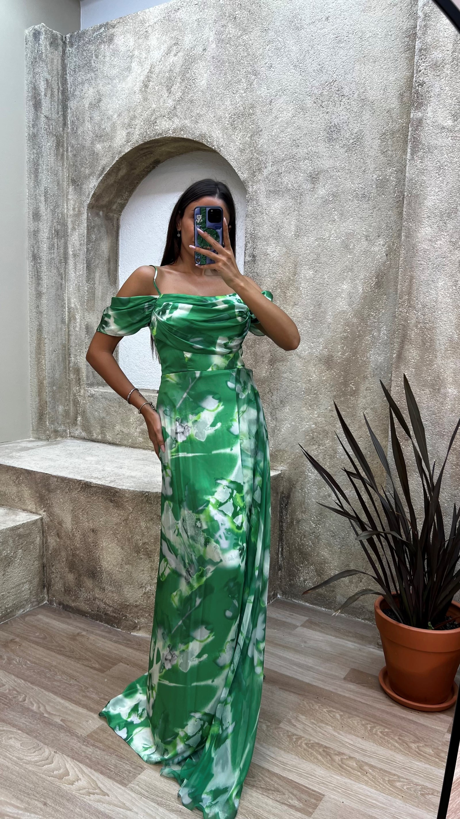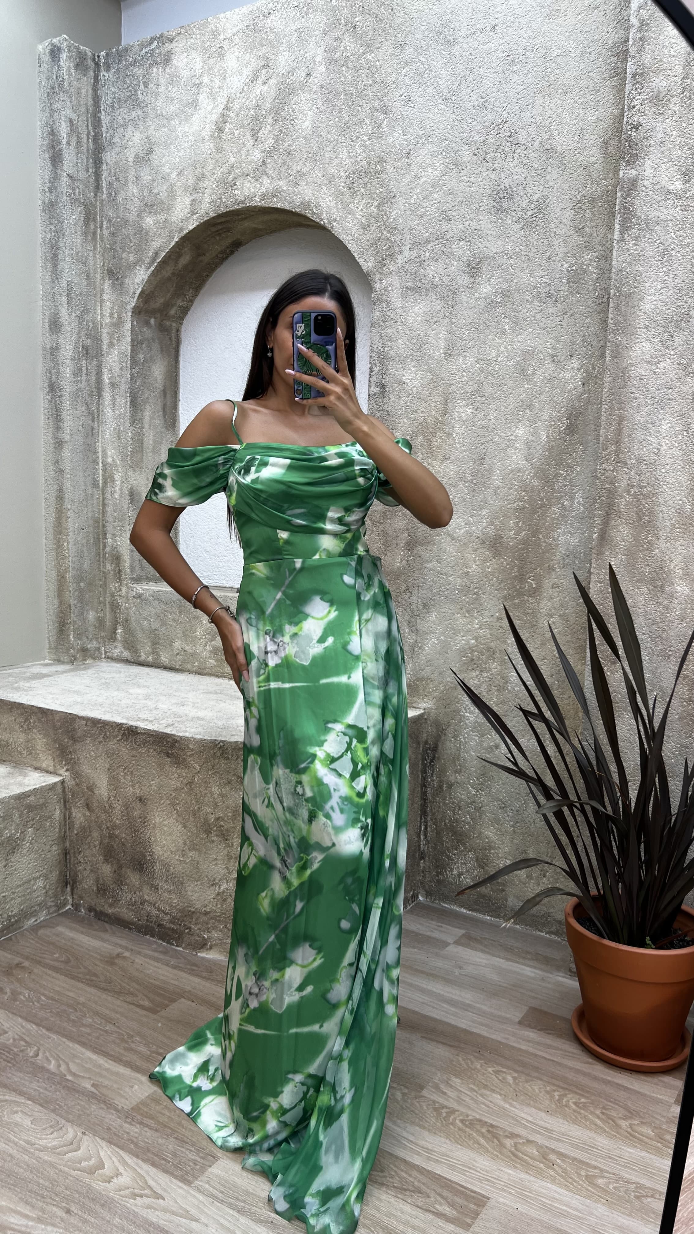 Yeşil İp Askılı Kol Detay Desenli Abiye Elbise
