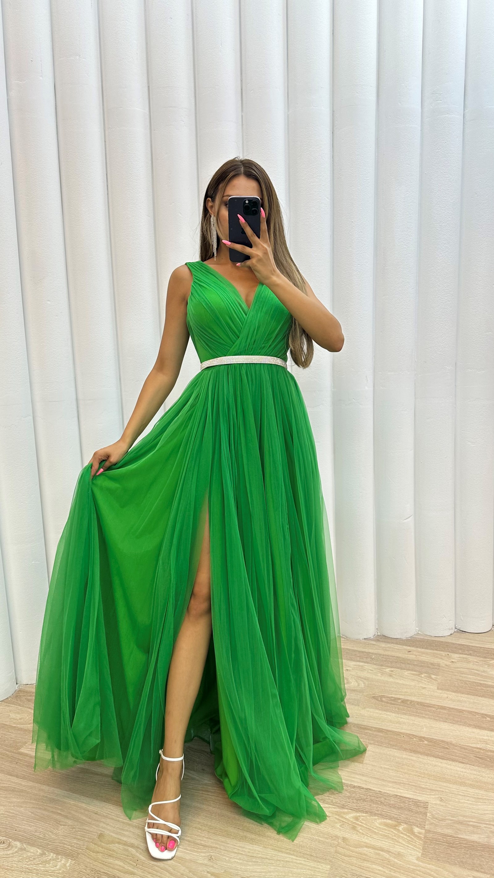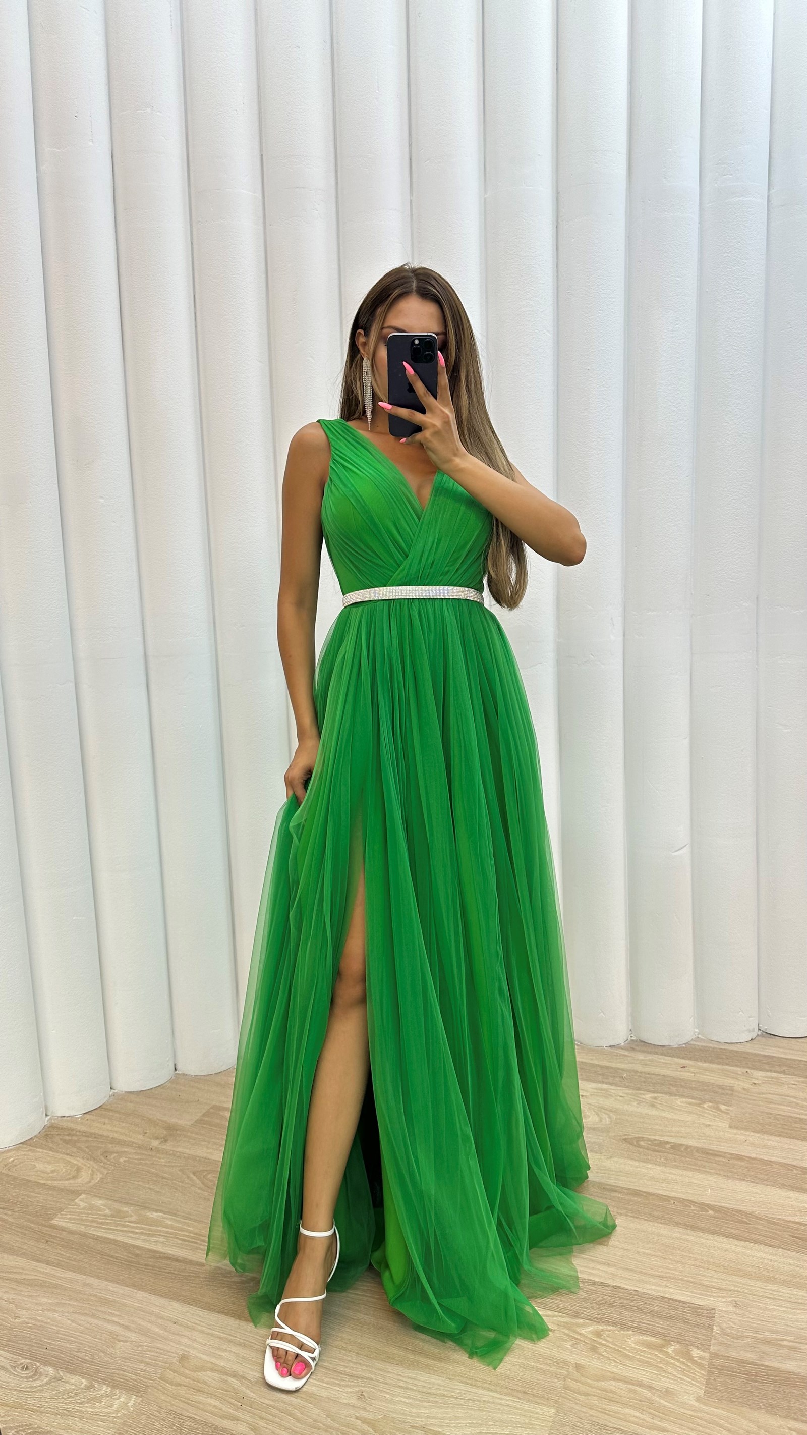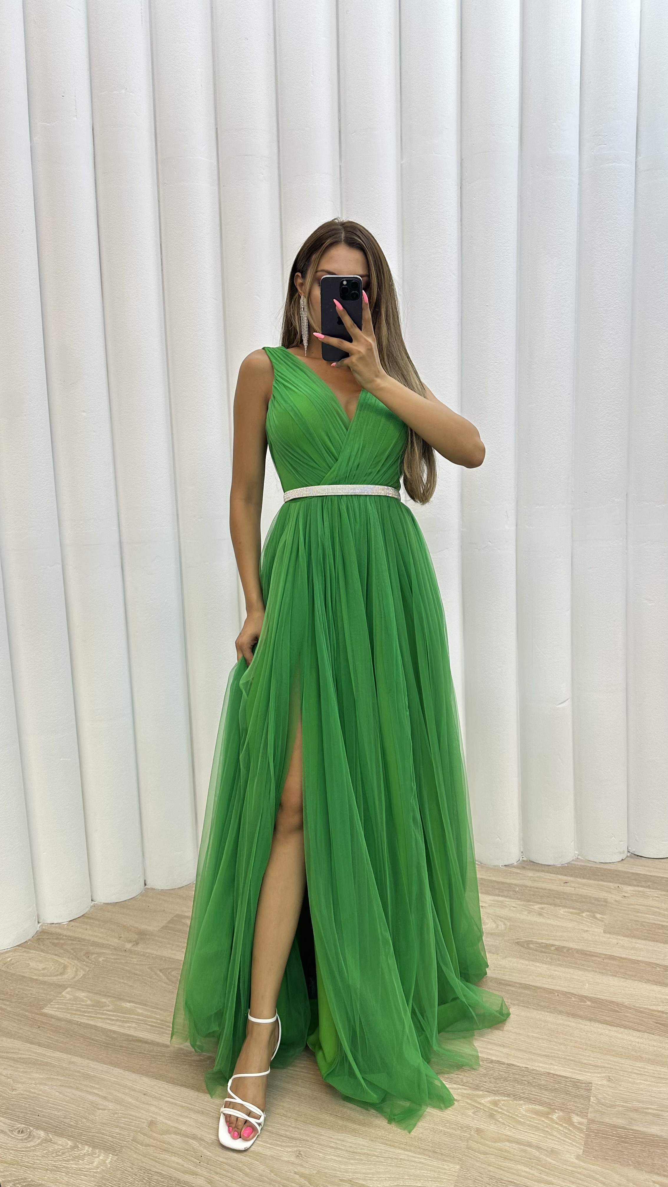 • Yeşil Kruvaze Yaka Kemerli Tül Abiye Elbise