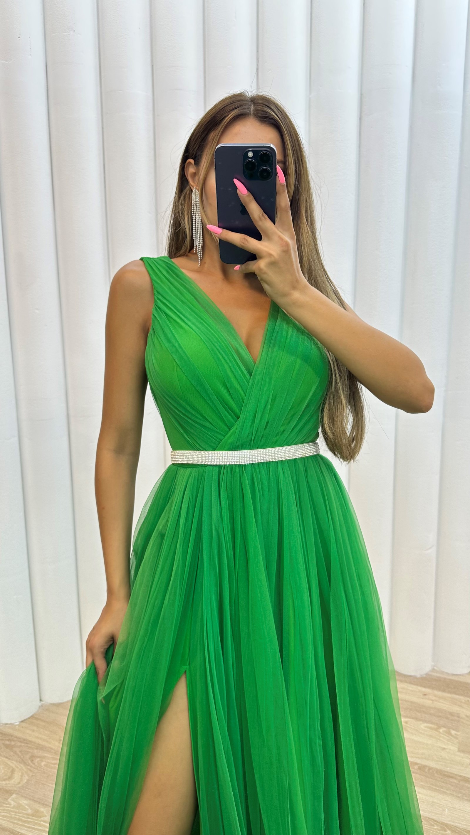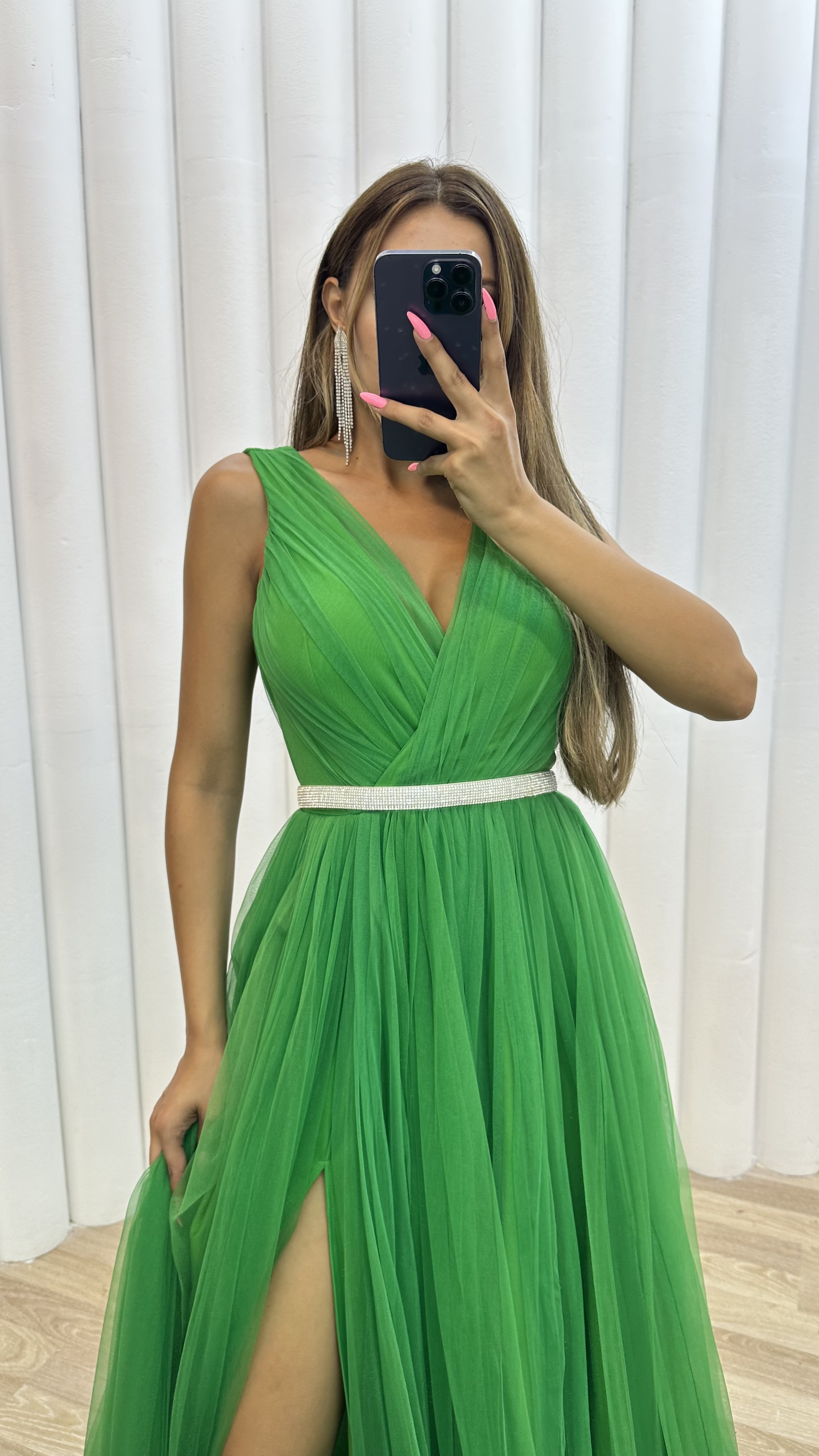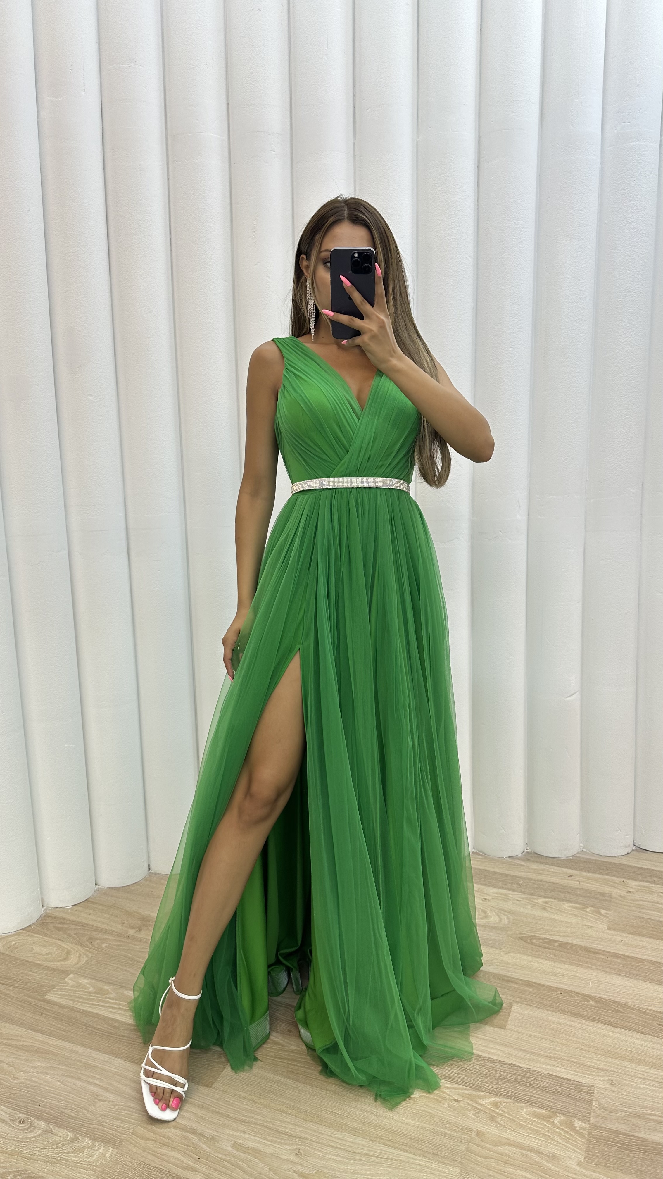 • Yeşil Kruvaze Yaka Kemerli Tül Abiye Elbise