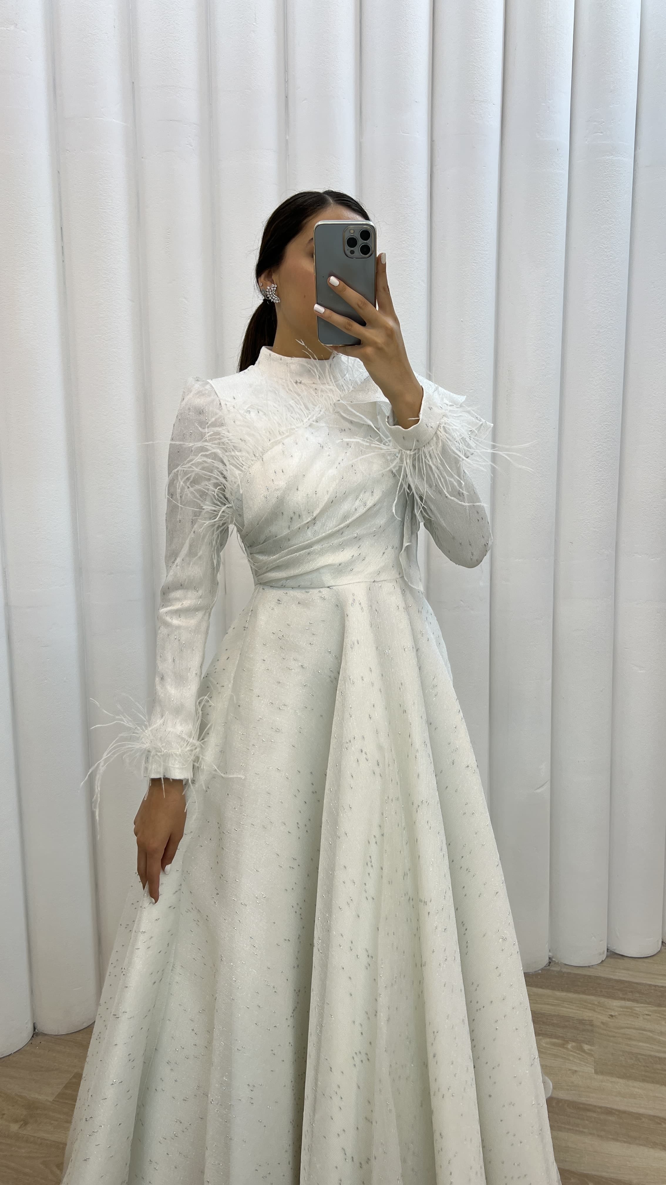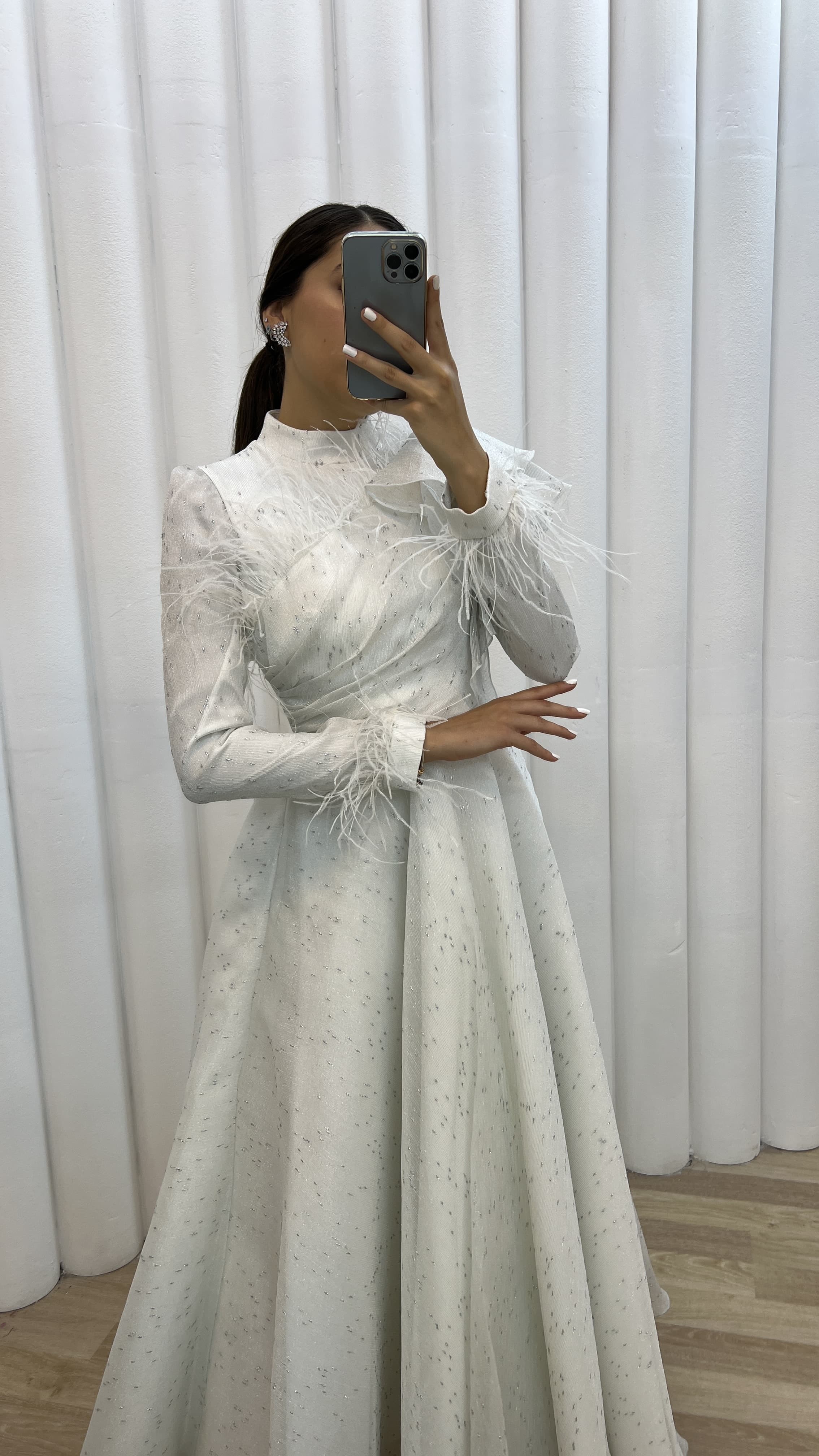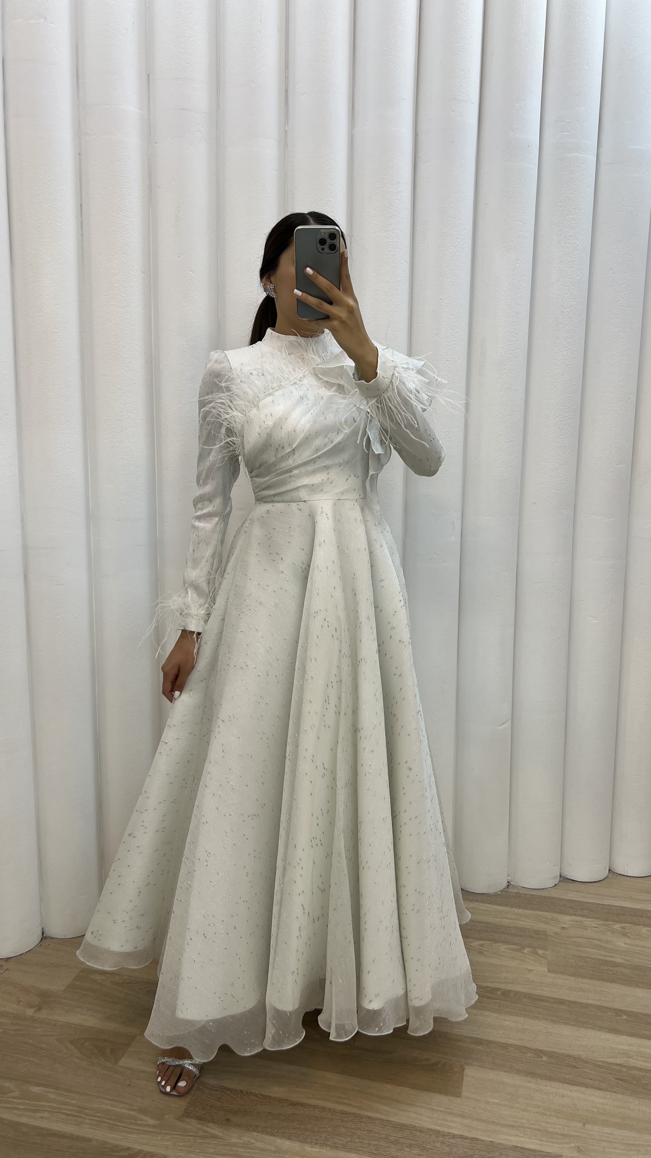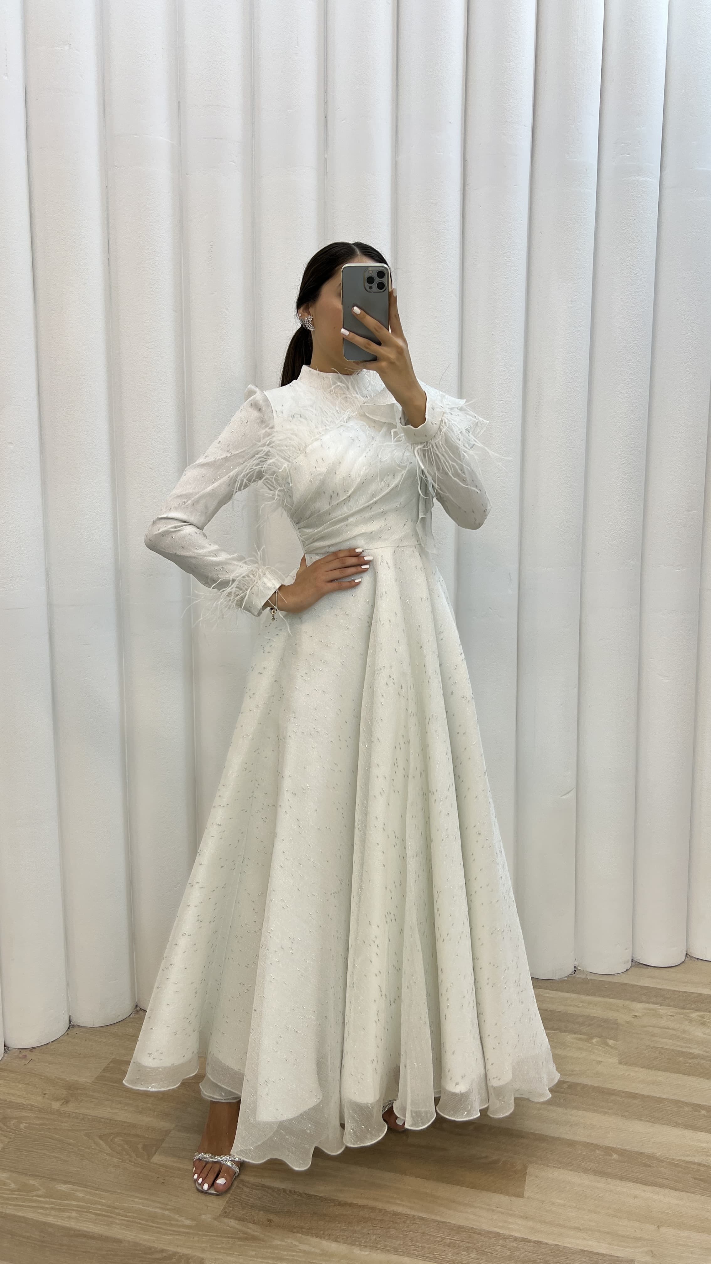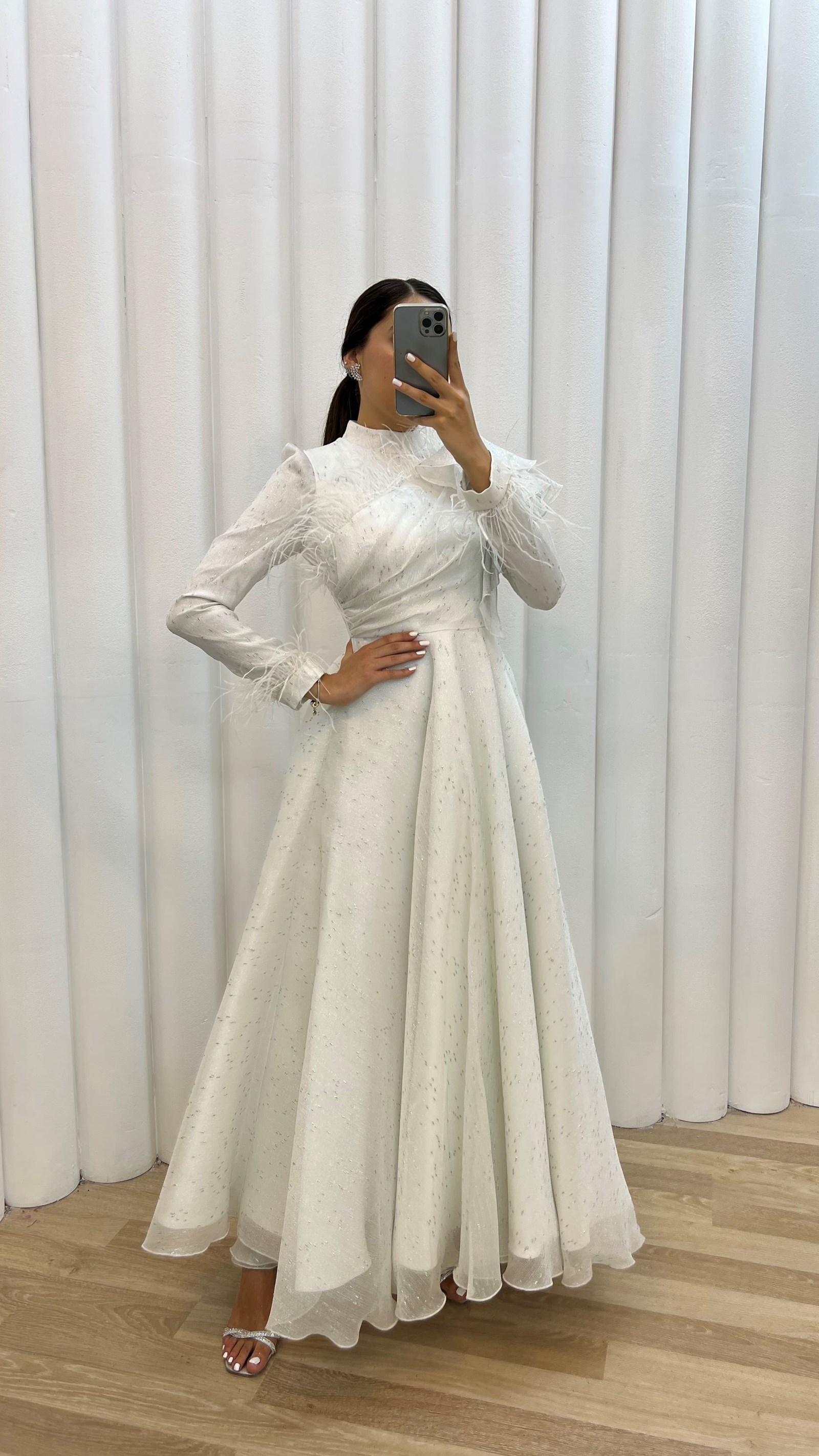• Beyaz Göğsü Volan Detay Tüylü Tasarım Abiye Elbise