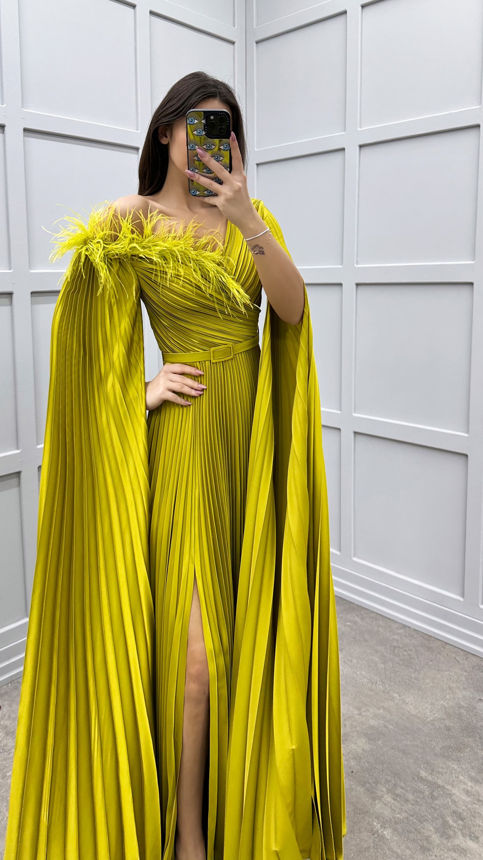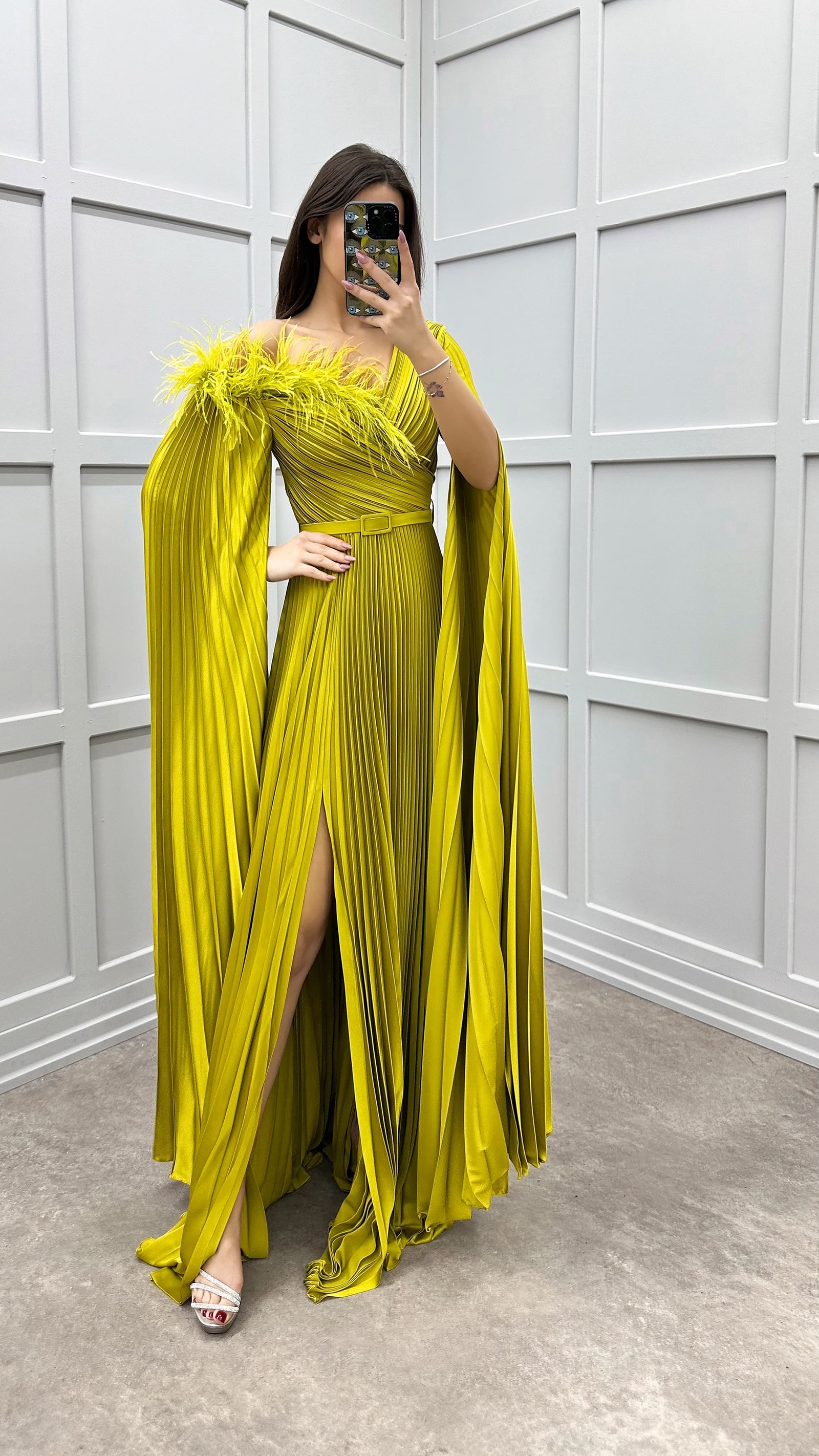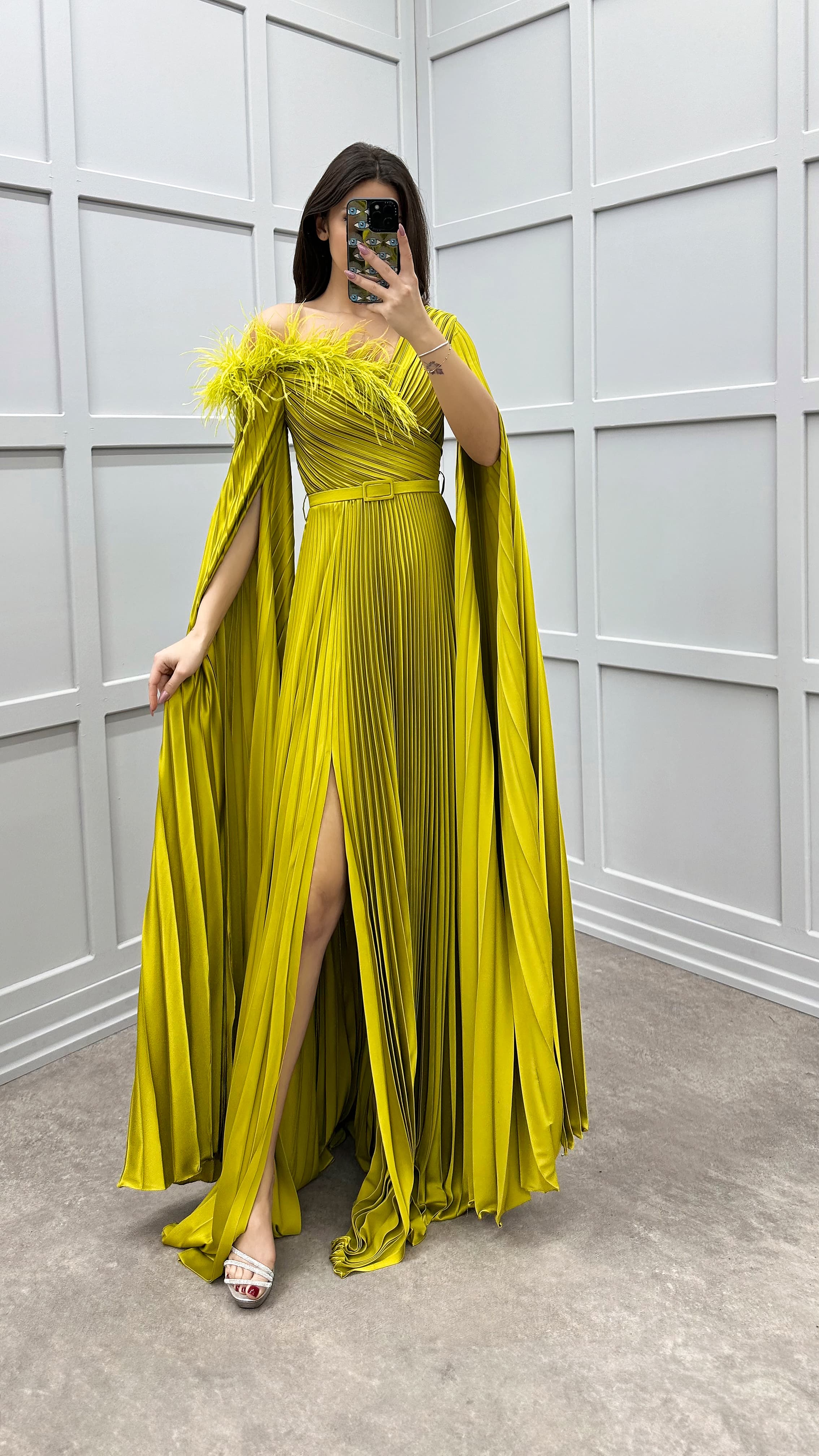 • Sarı Omuzu Tüy Pliseli Tasarım  Saten Abiye Elbise
