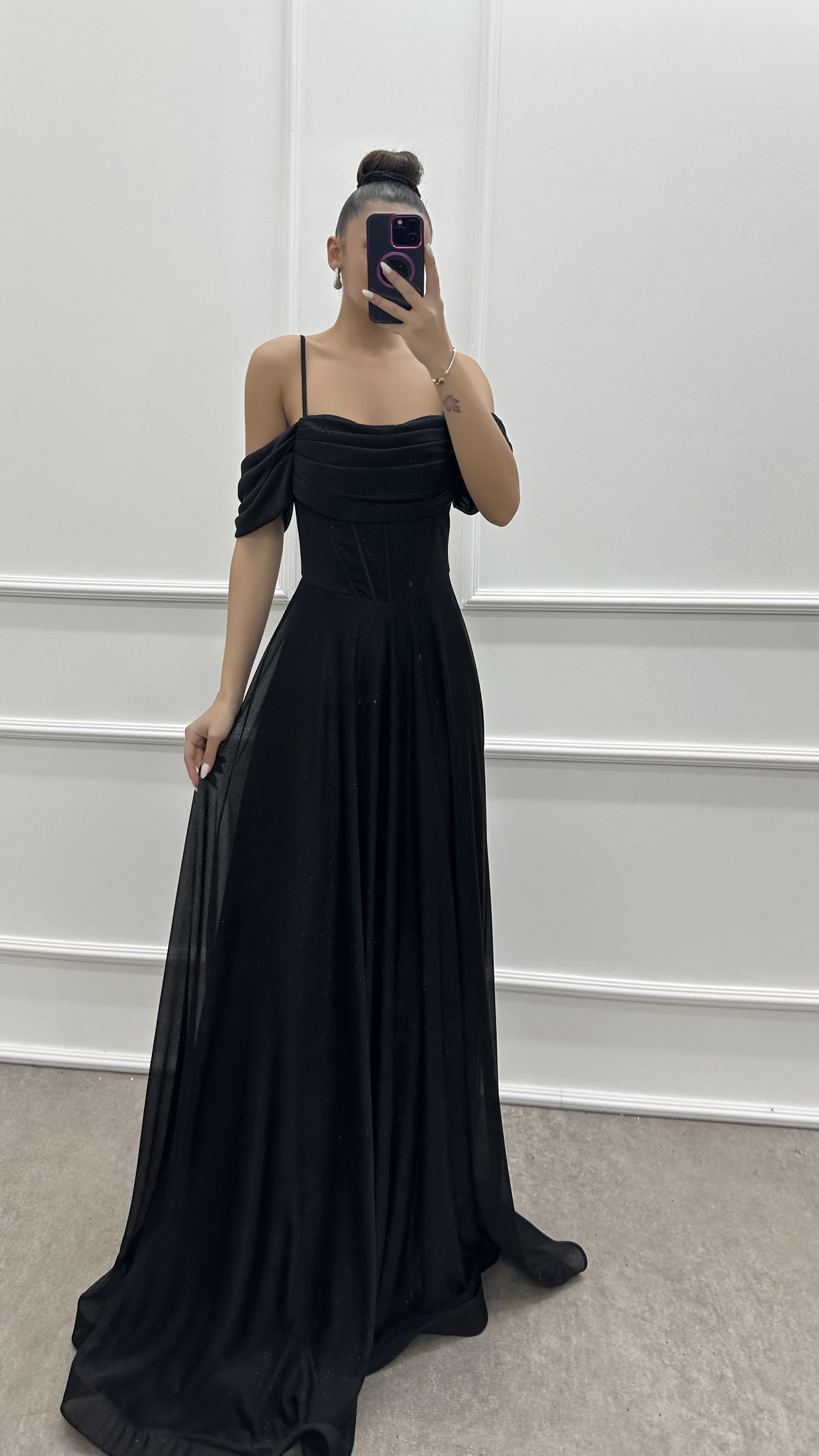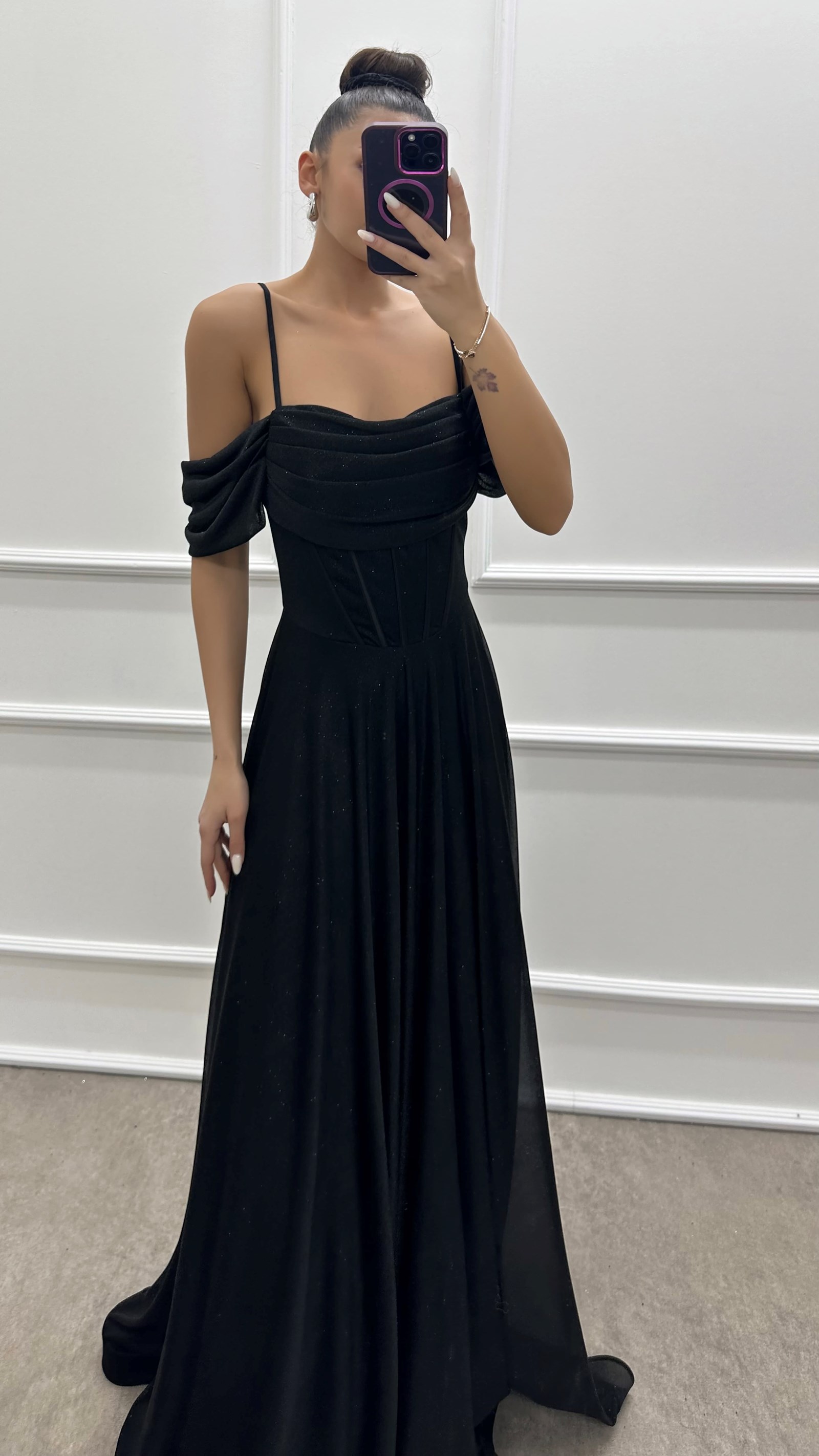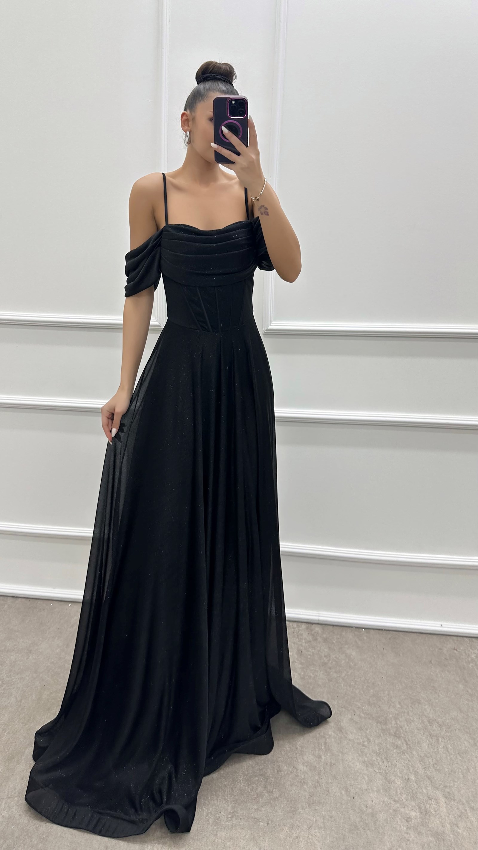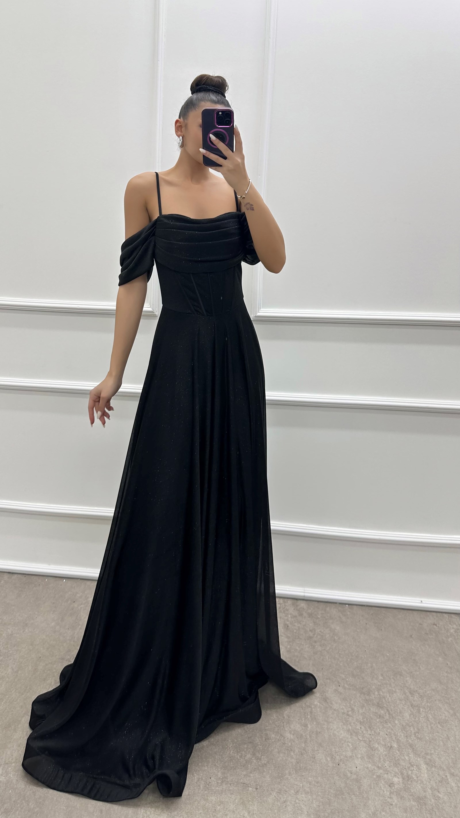 Siyah İp Askılı Omuz Detay Simli Elbise