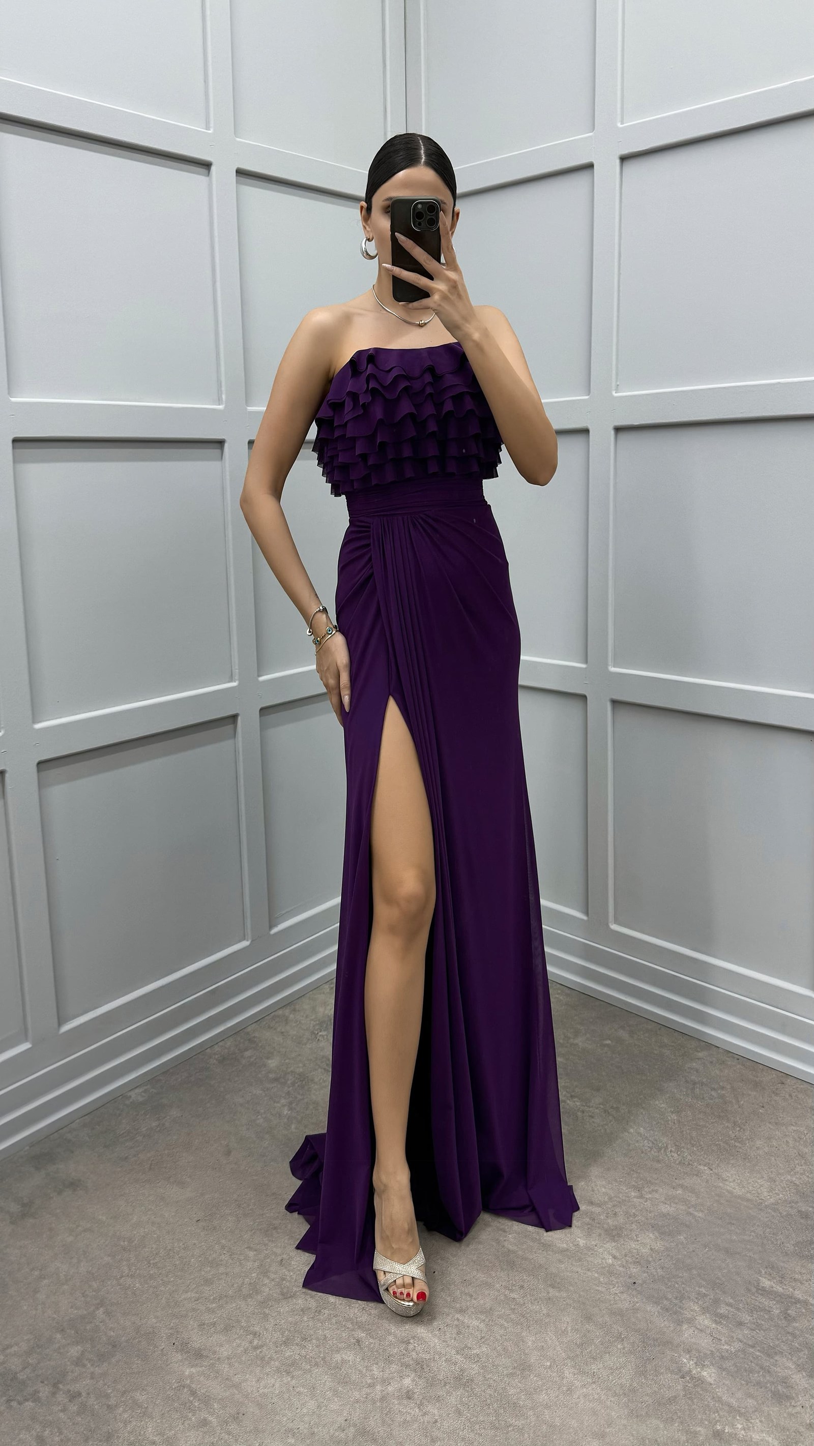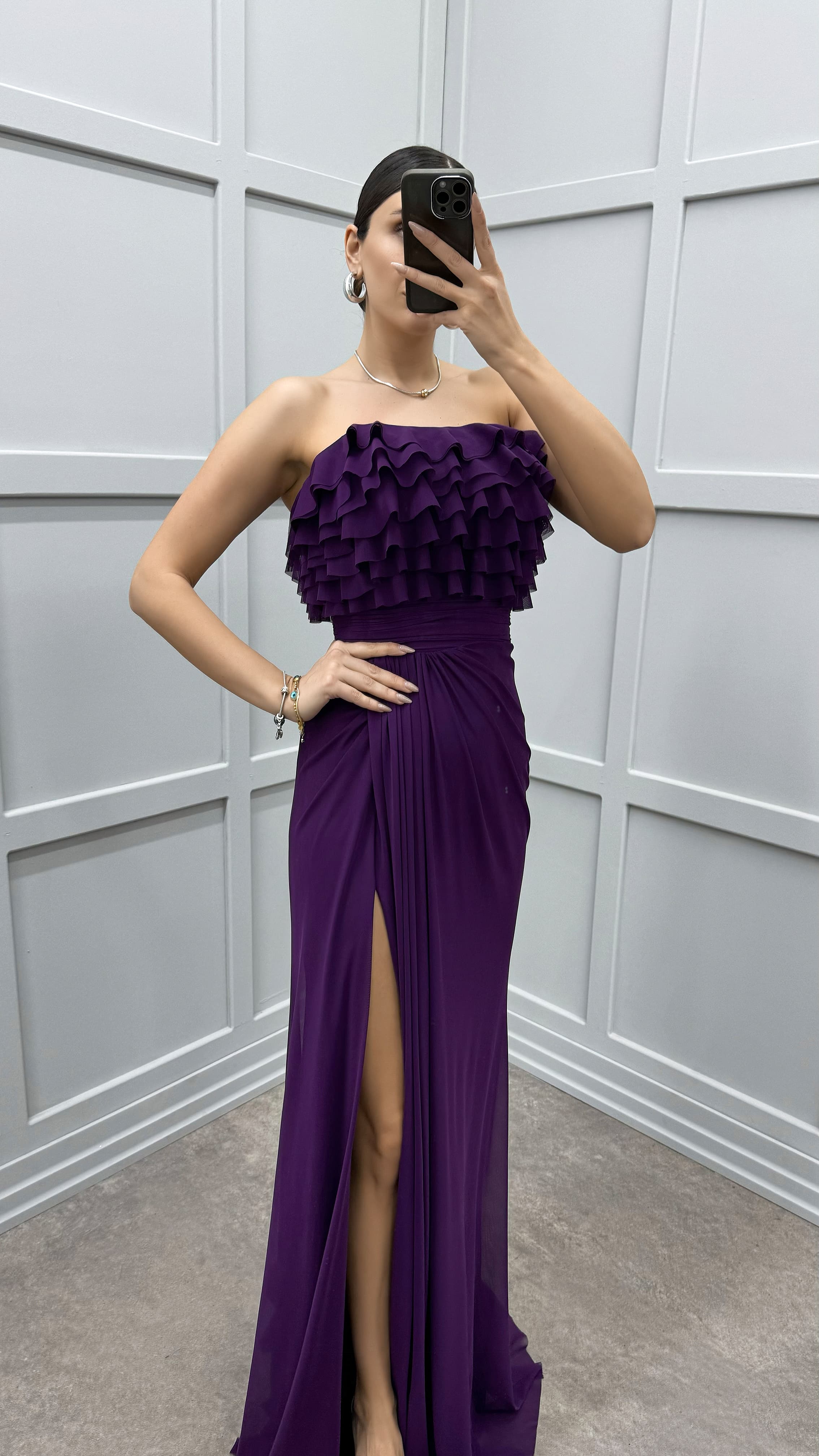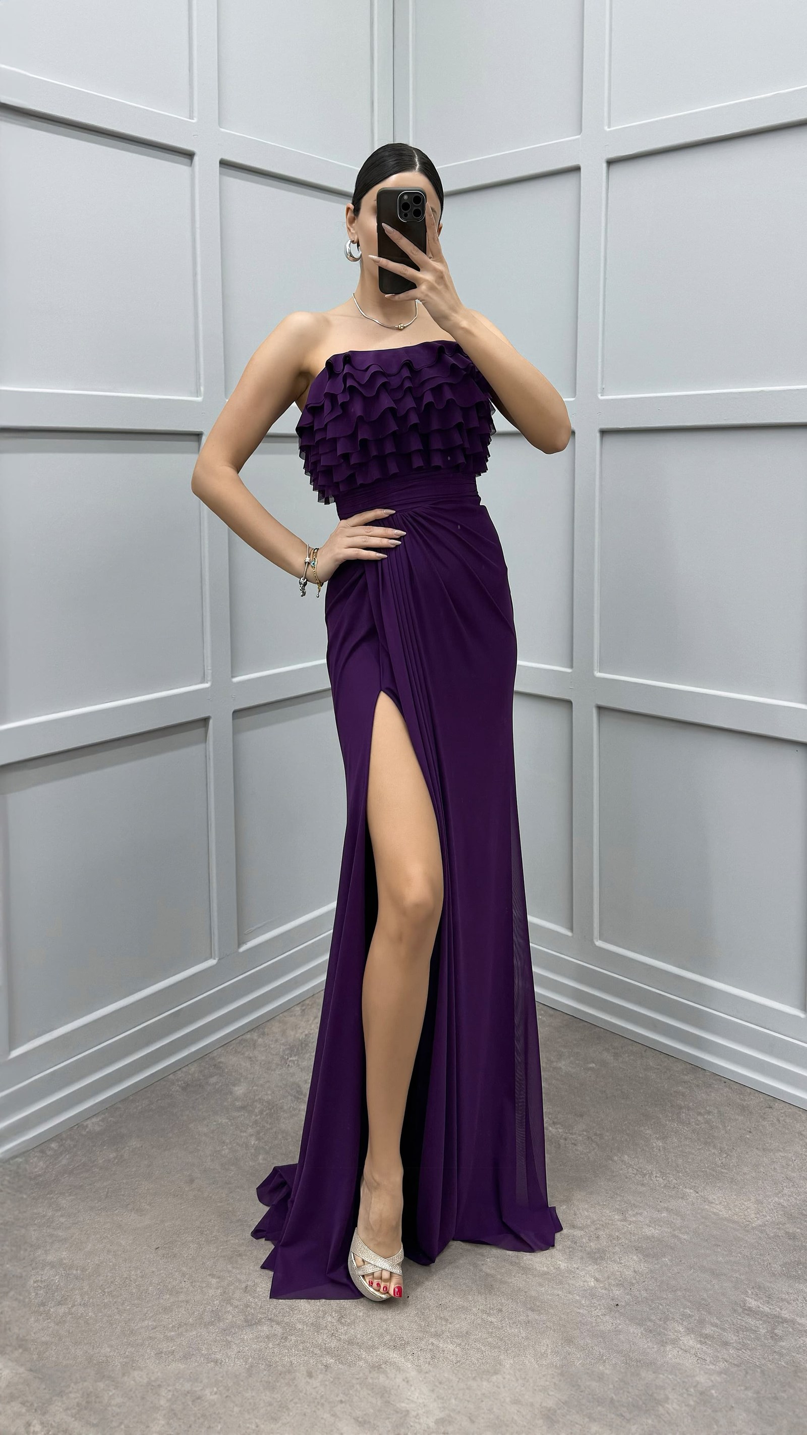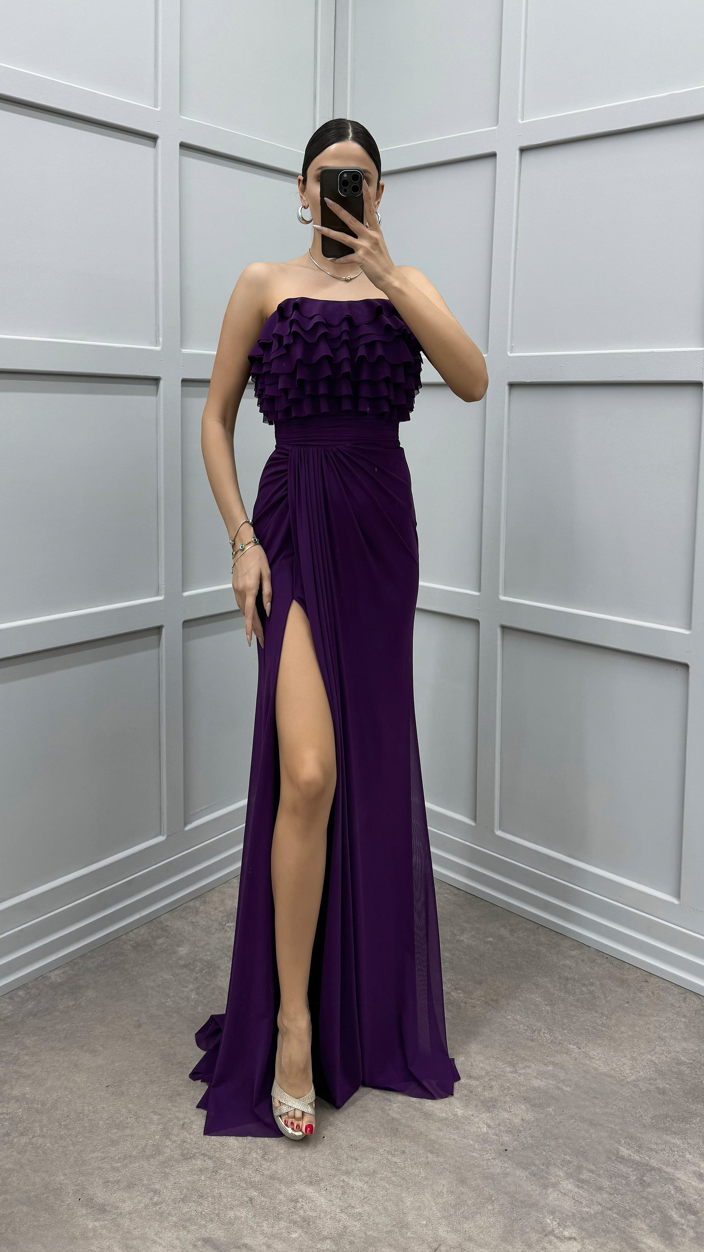 • Mürdüm Straplez Göğsü Volanlı Abiye Elbise