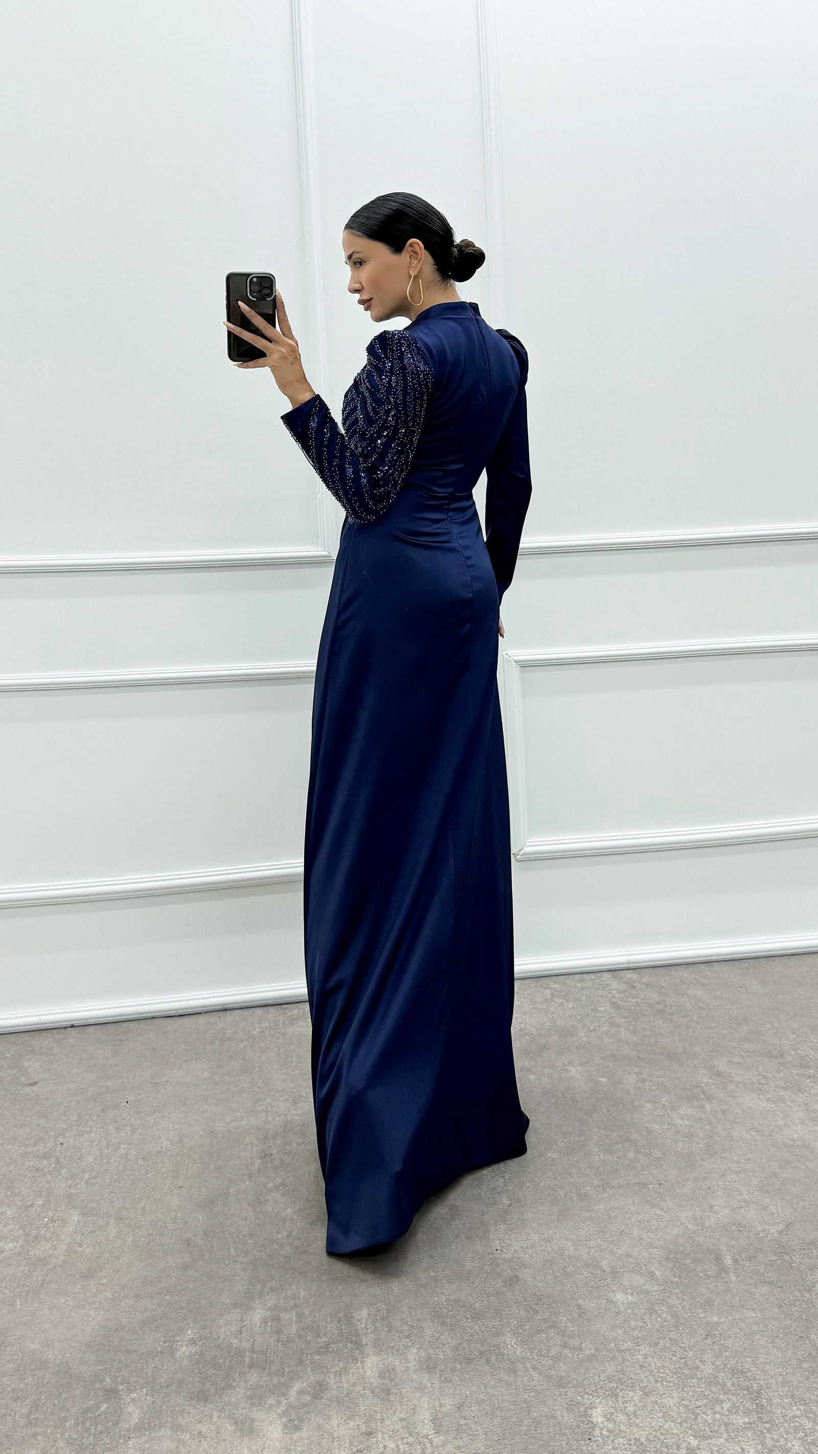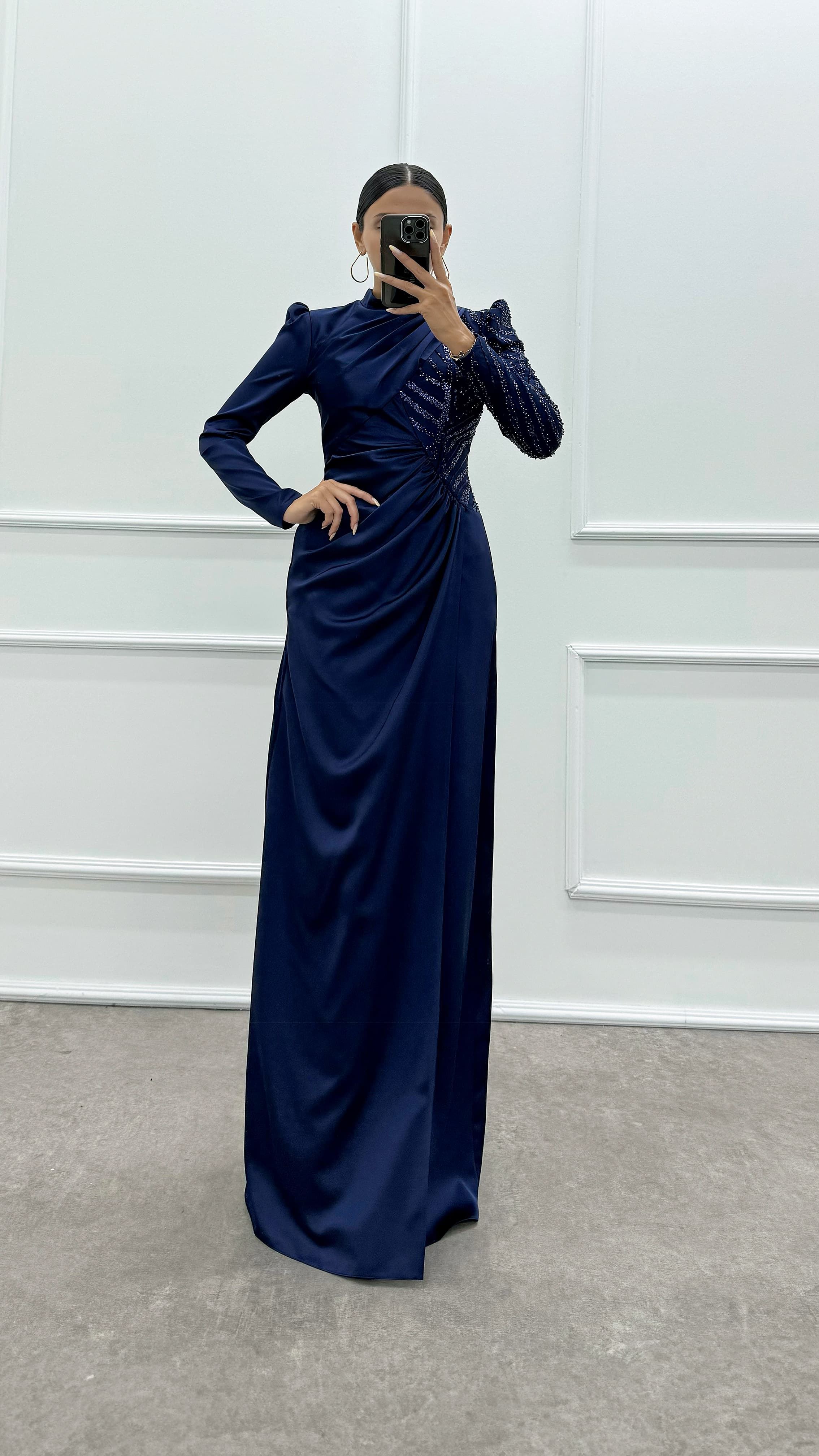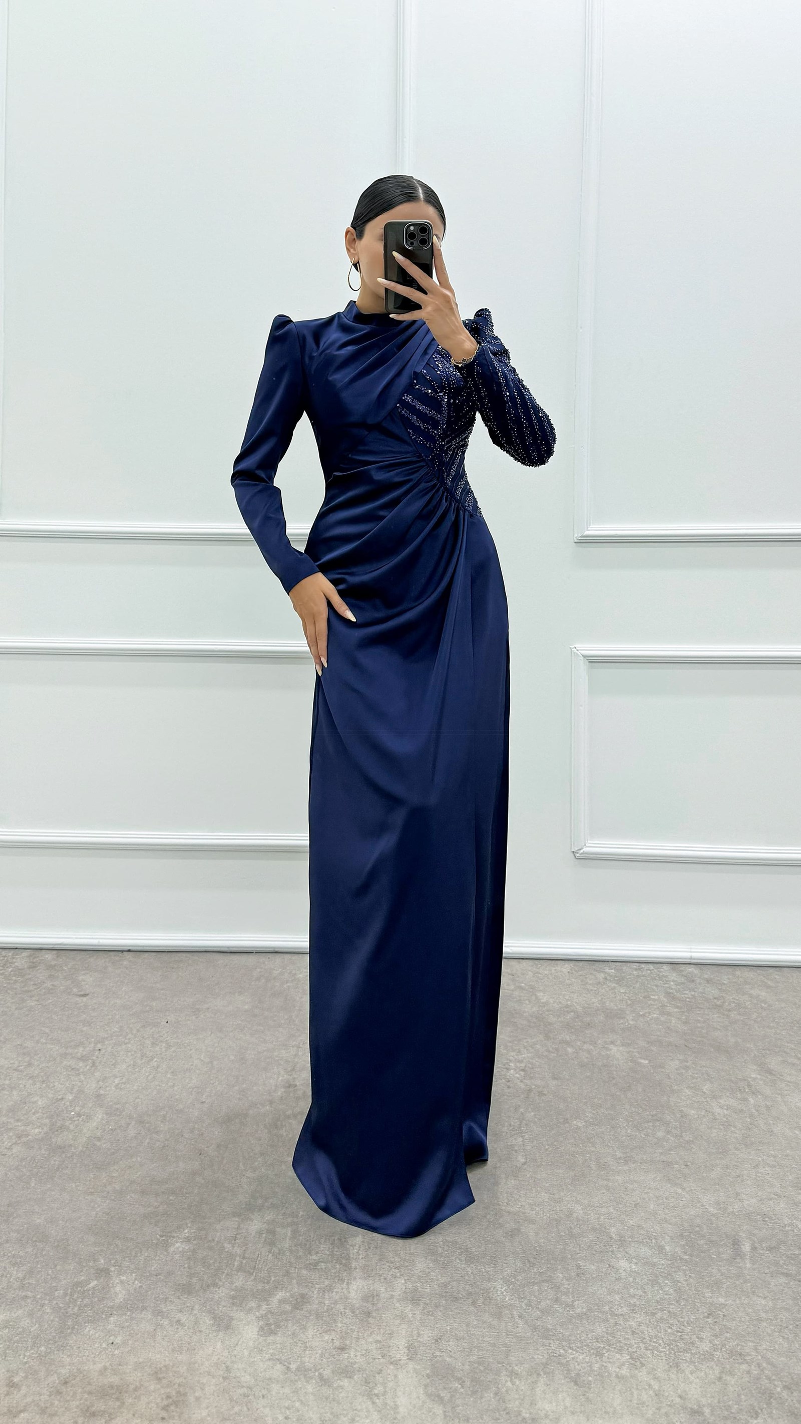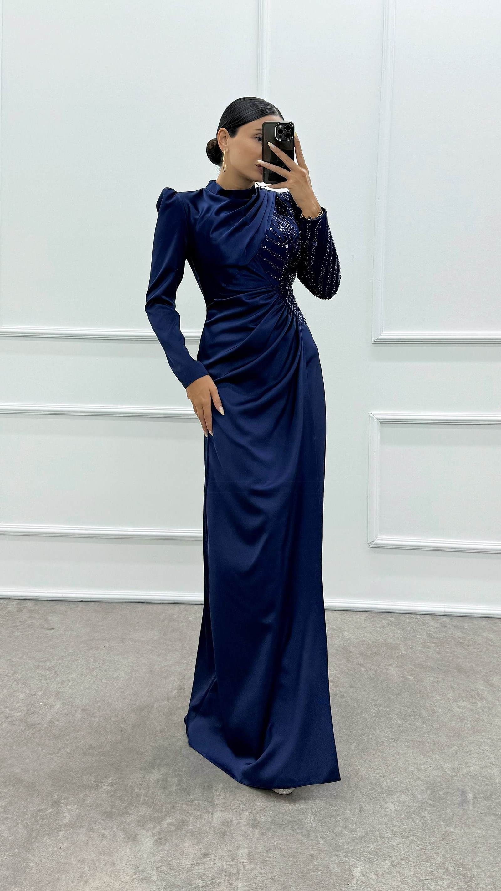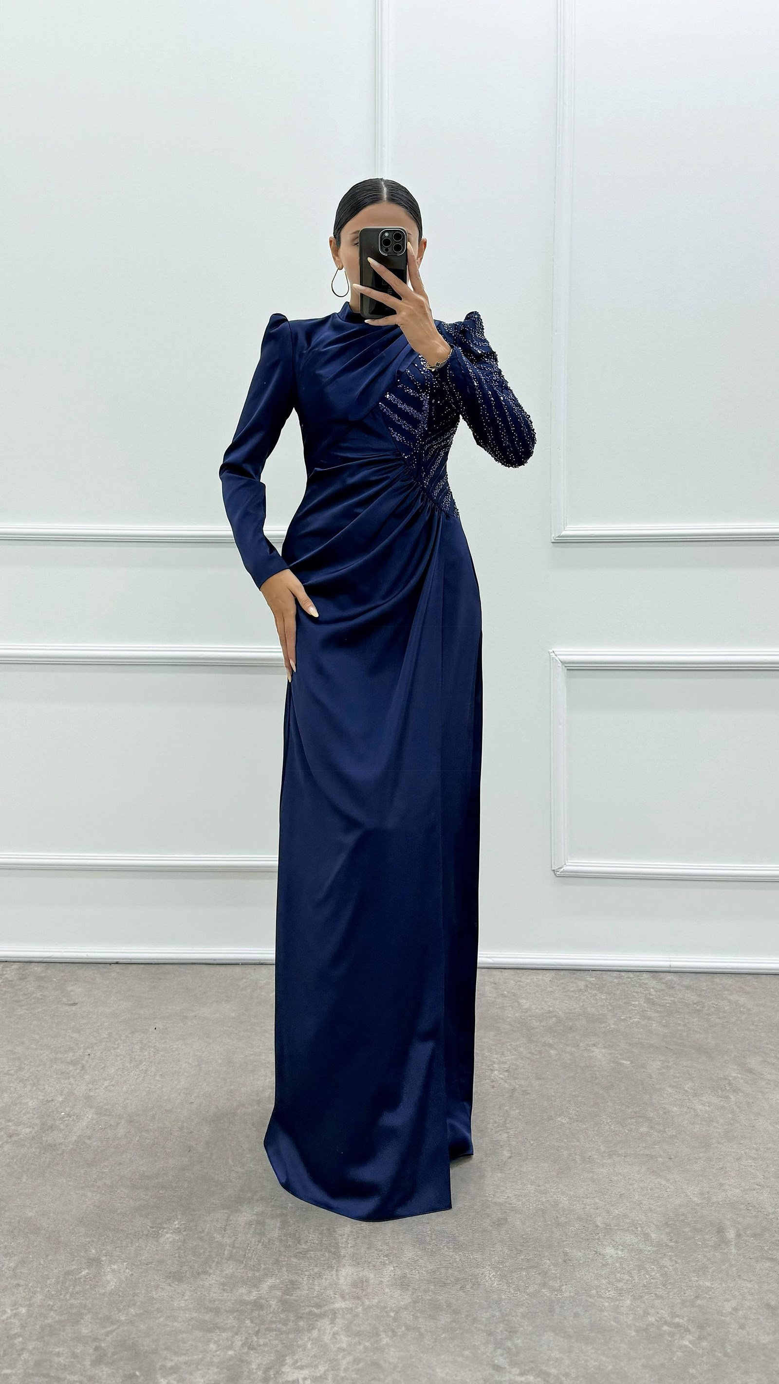 Lacivert Asimetrik Kesim İşleme Detay Tasarım Saten Abiye Elbise