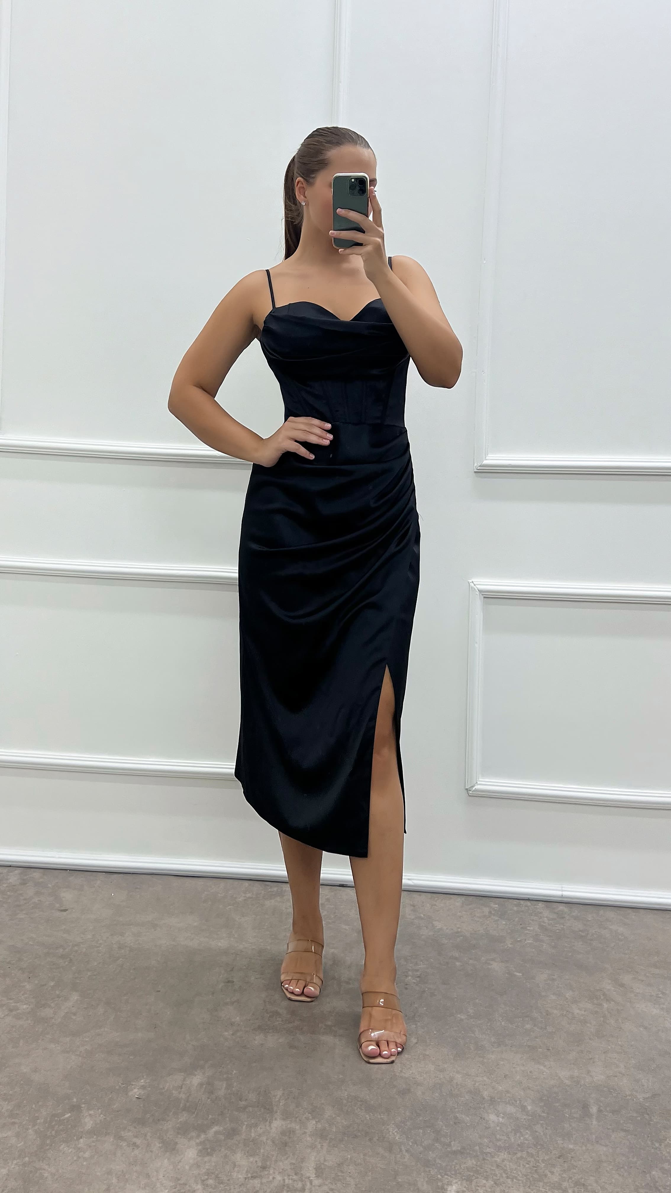 Siyah İp Askılı Göğüs Detay Tasarım Saten Büyük Beden Abiye Elbise