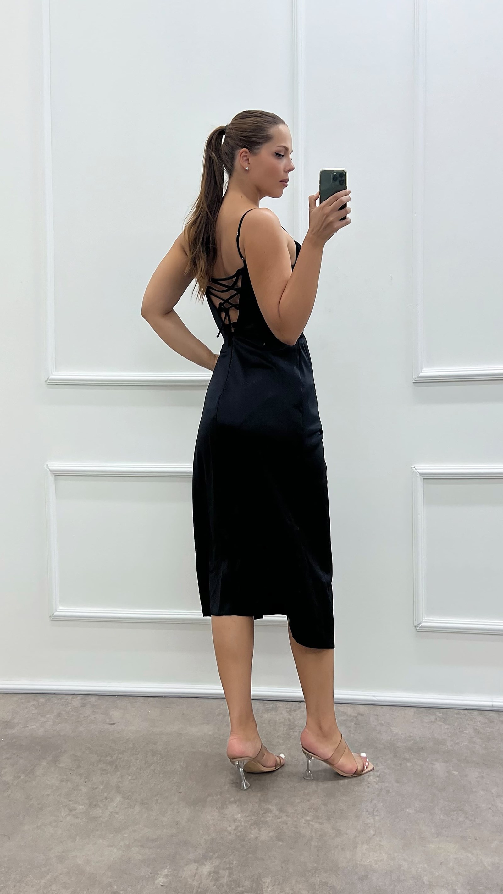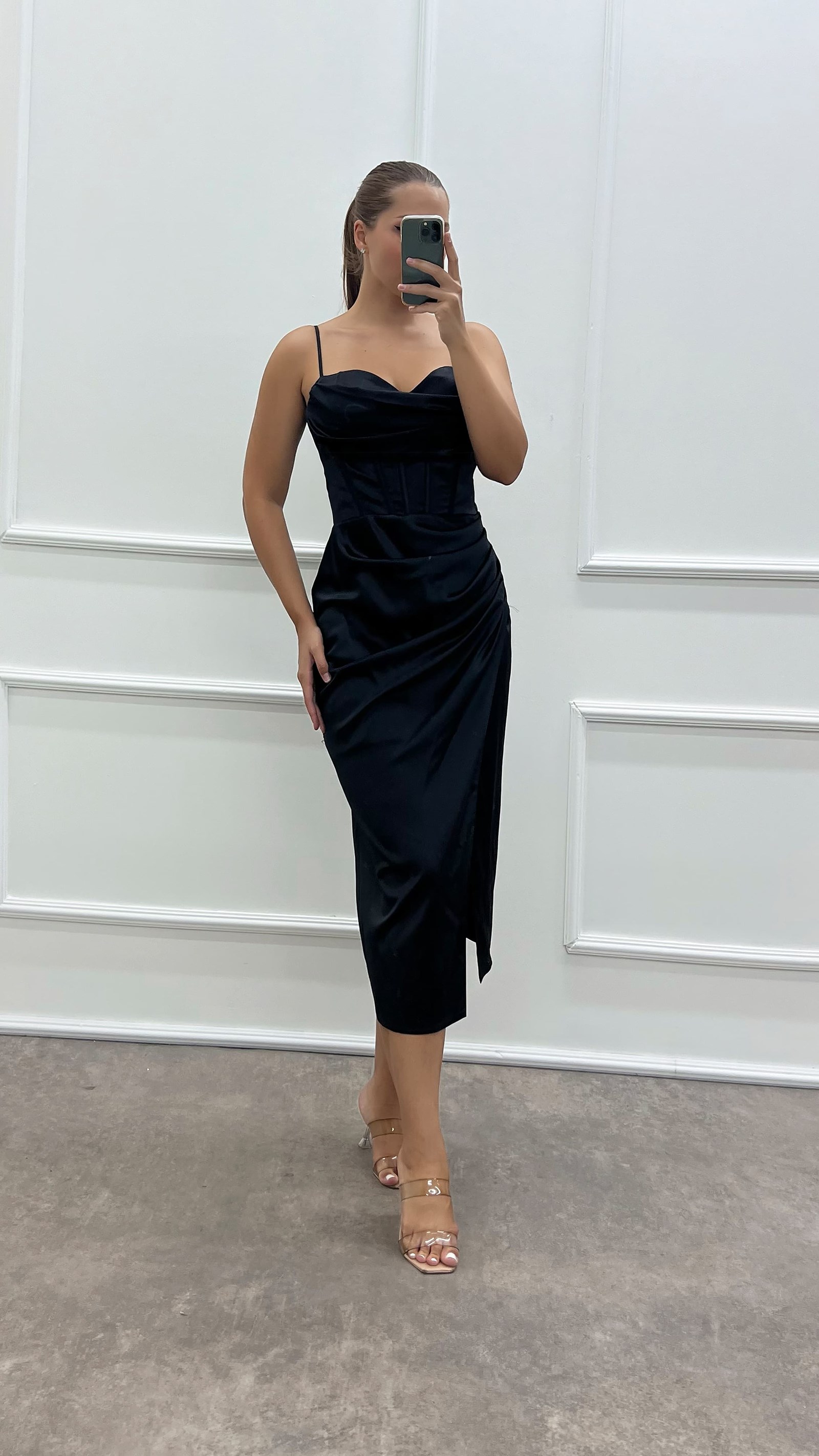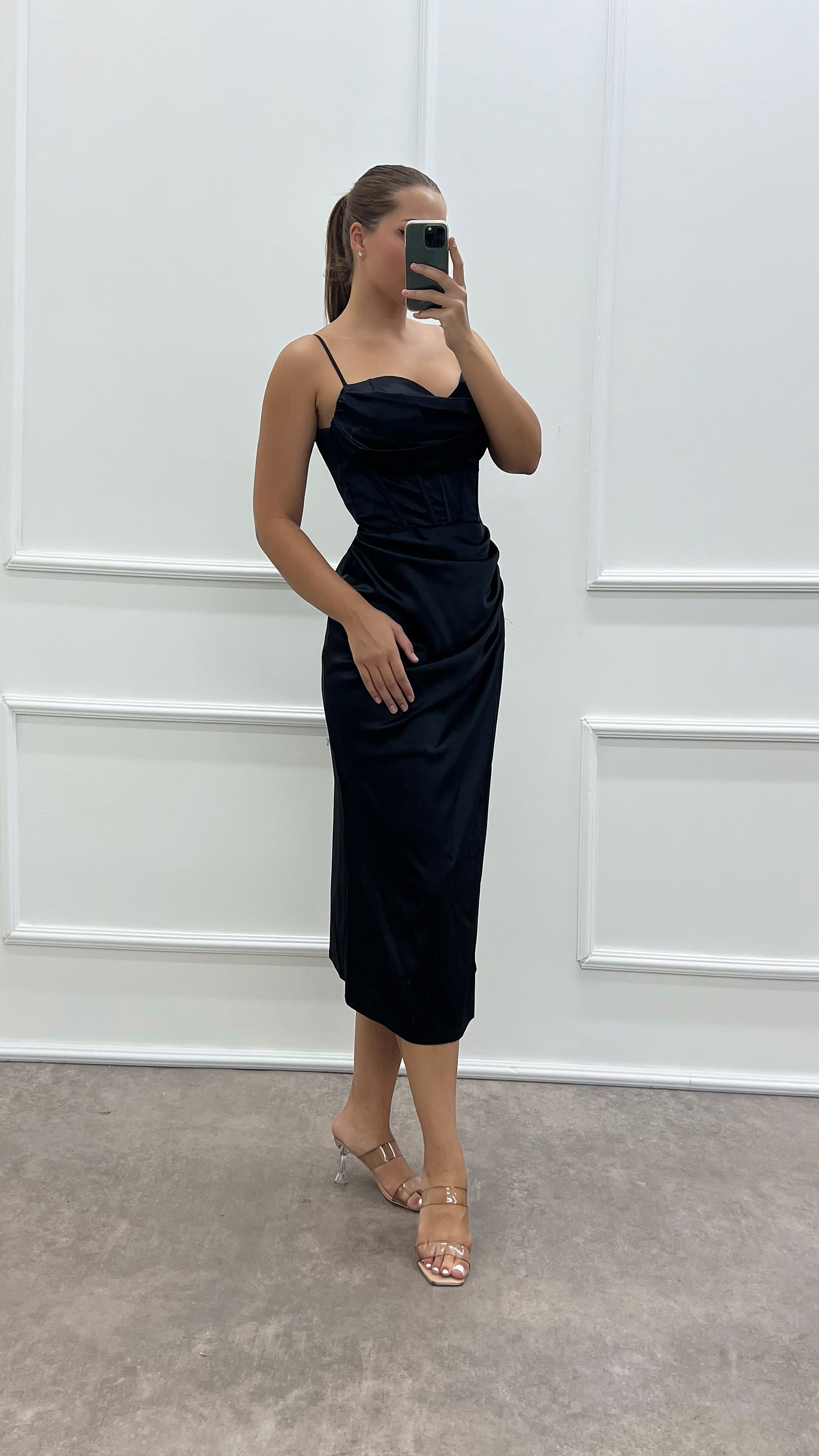 • Siyah İp Askılı Göğüs Detay Tasarım Saten Büyük Beden Abiye Elbise