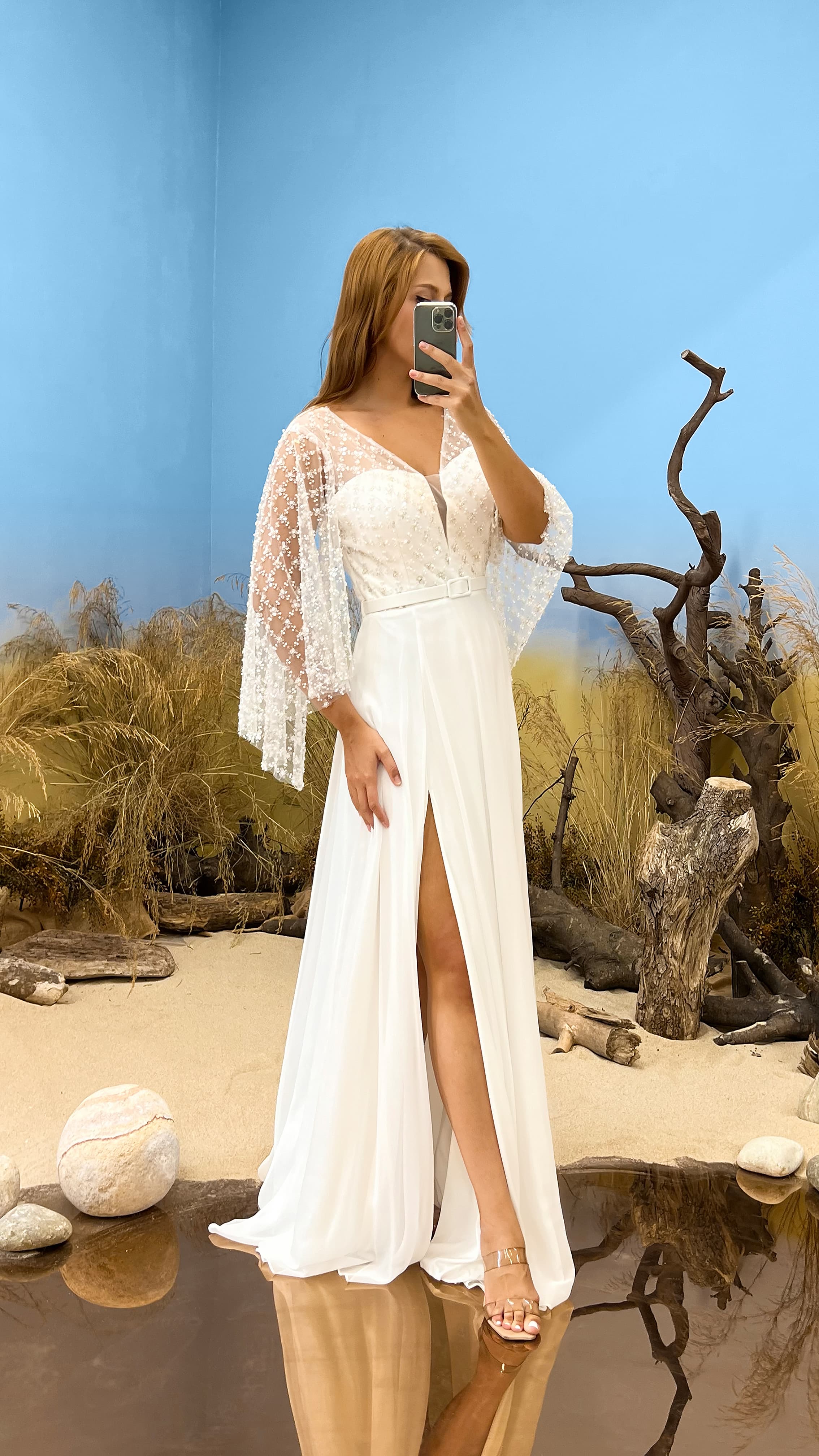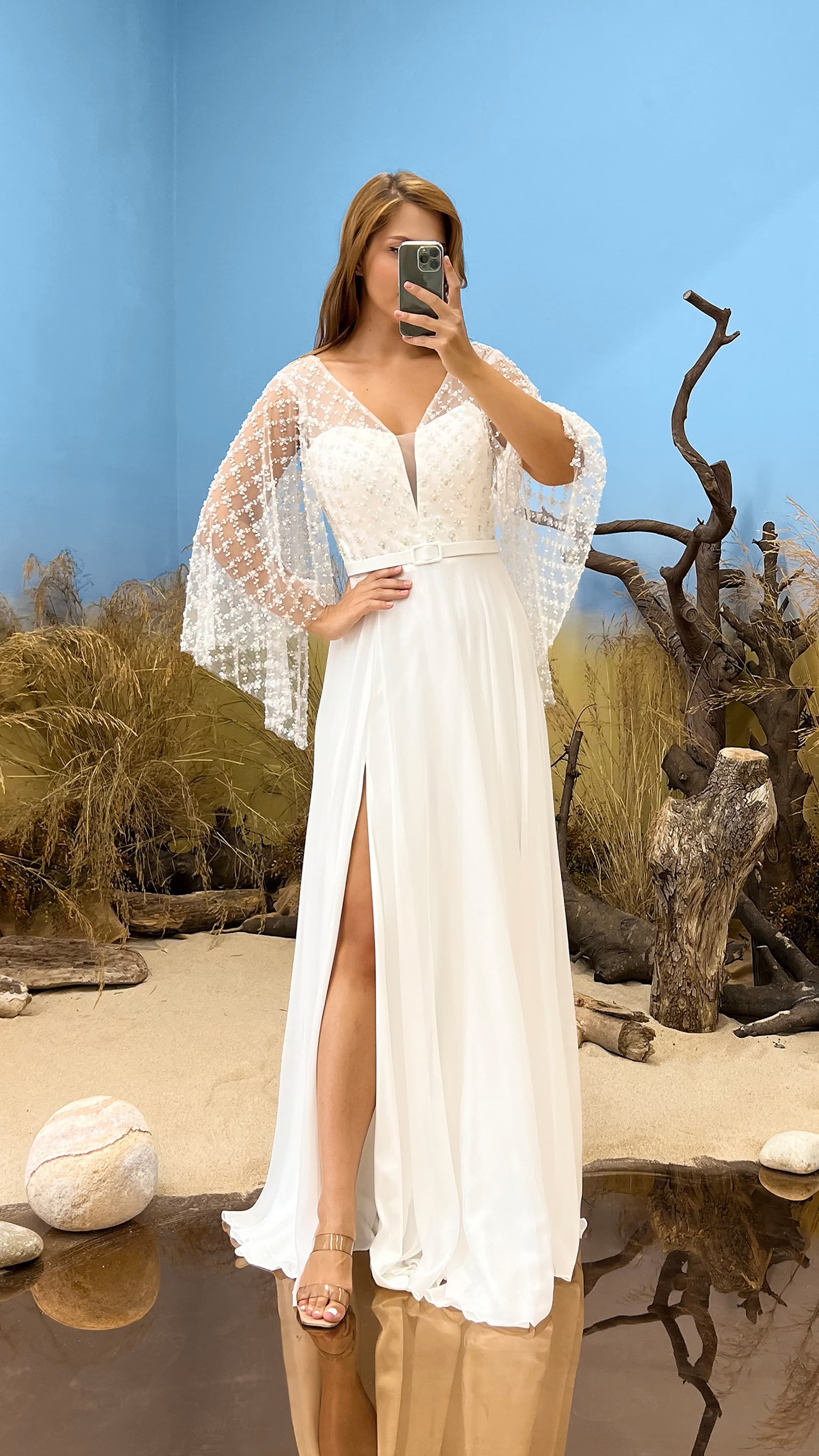 • Beyaz Yarasa Kol İşlemeli Büyük Beden Abiye Elbise
