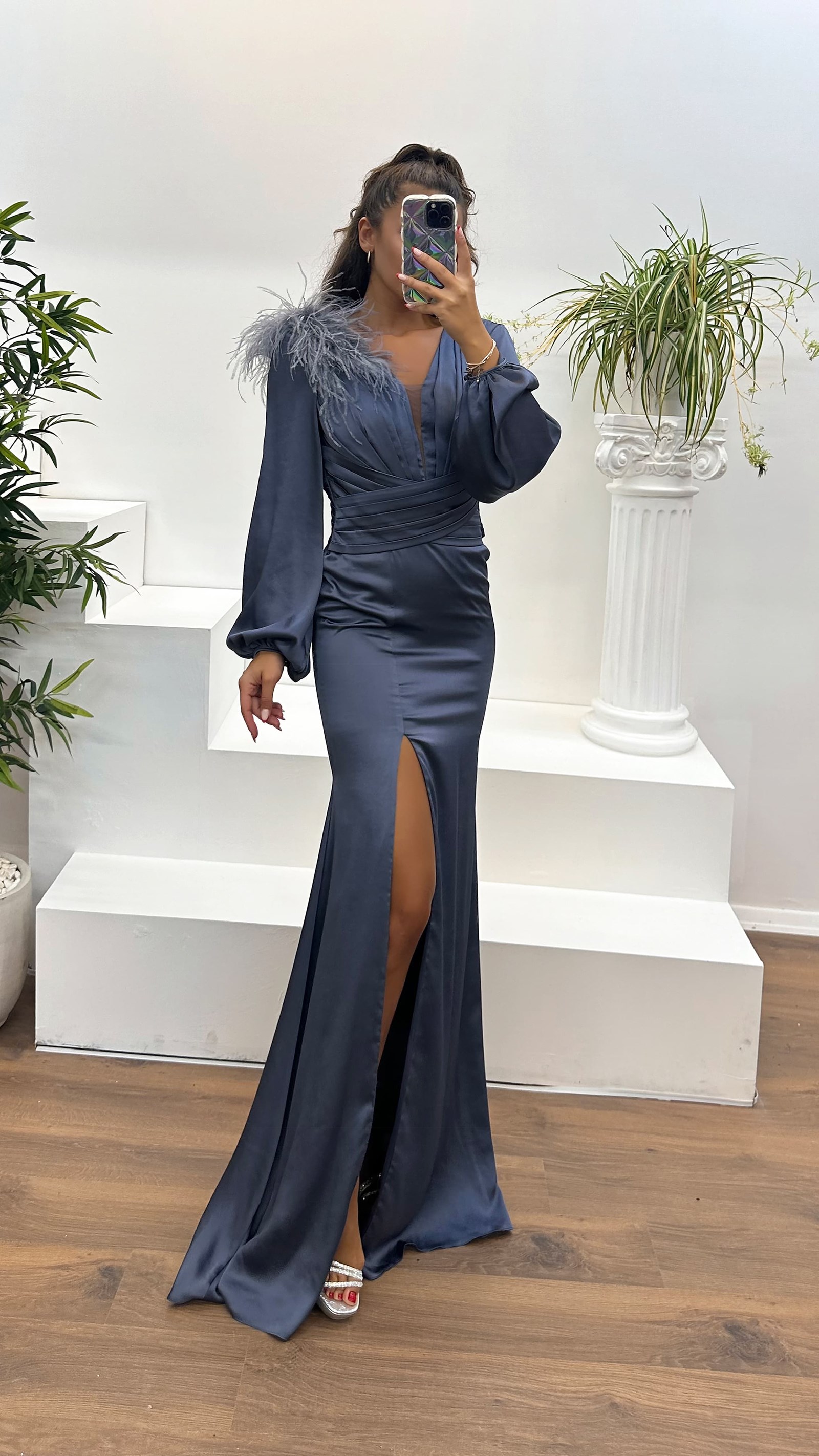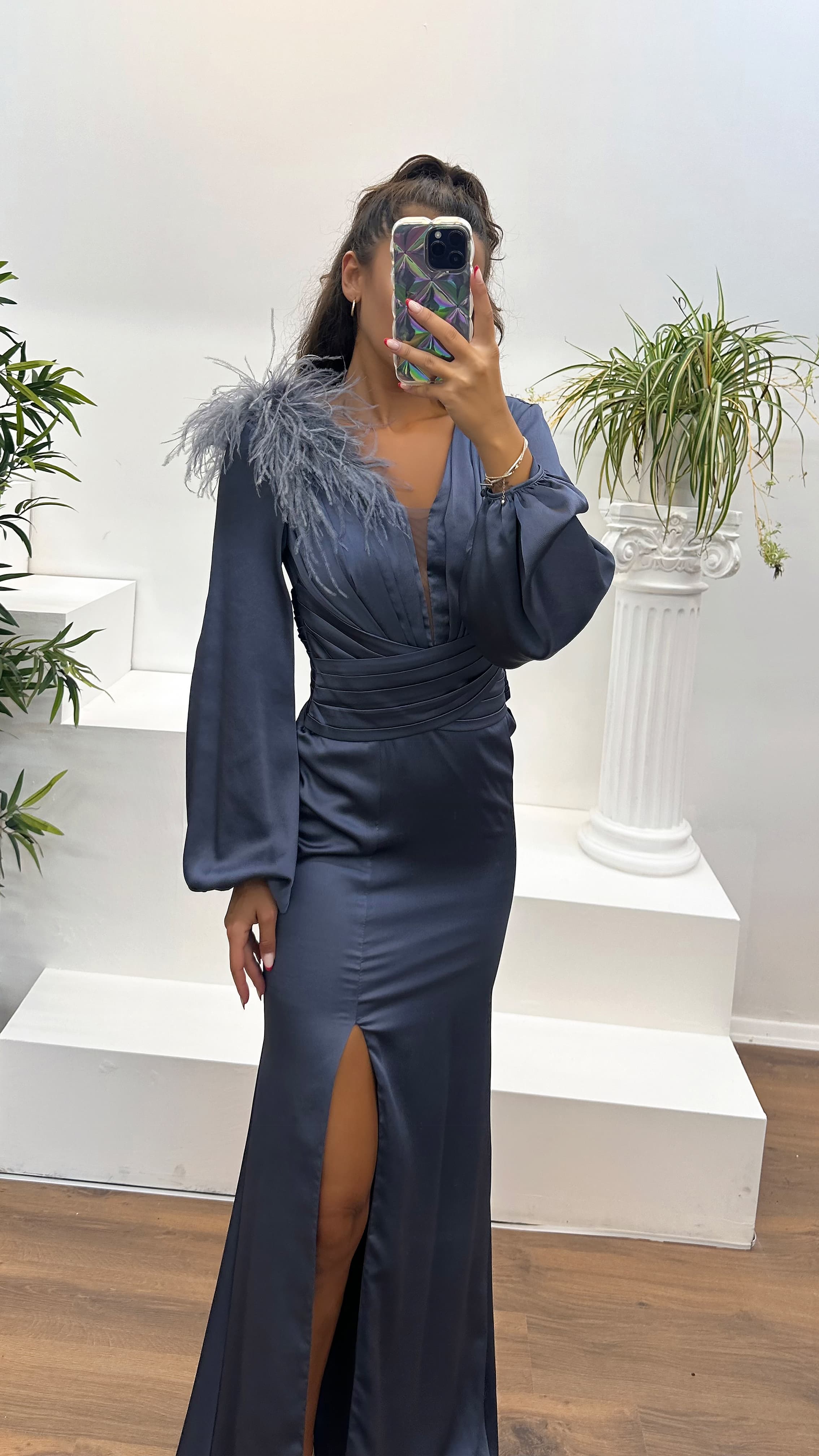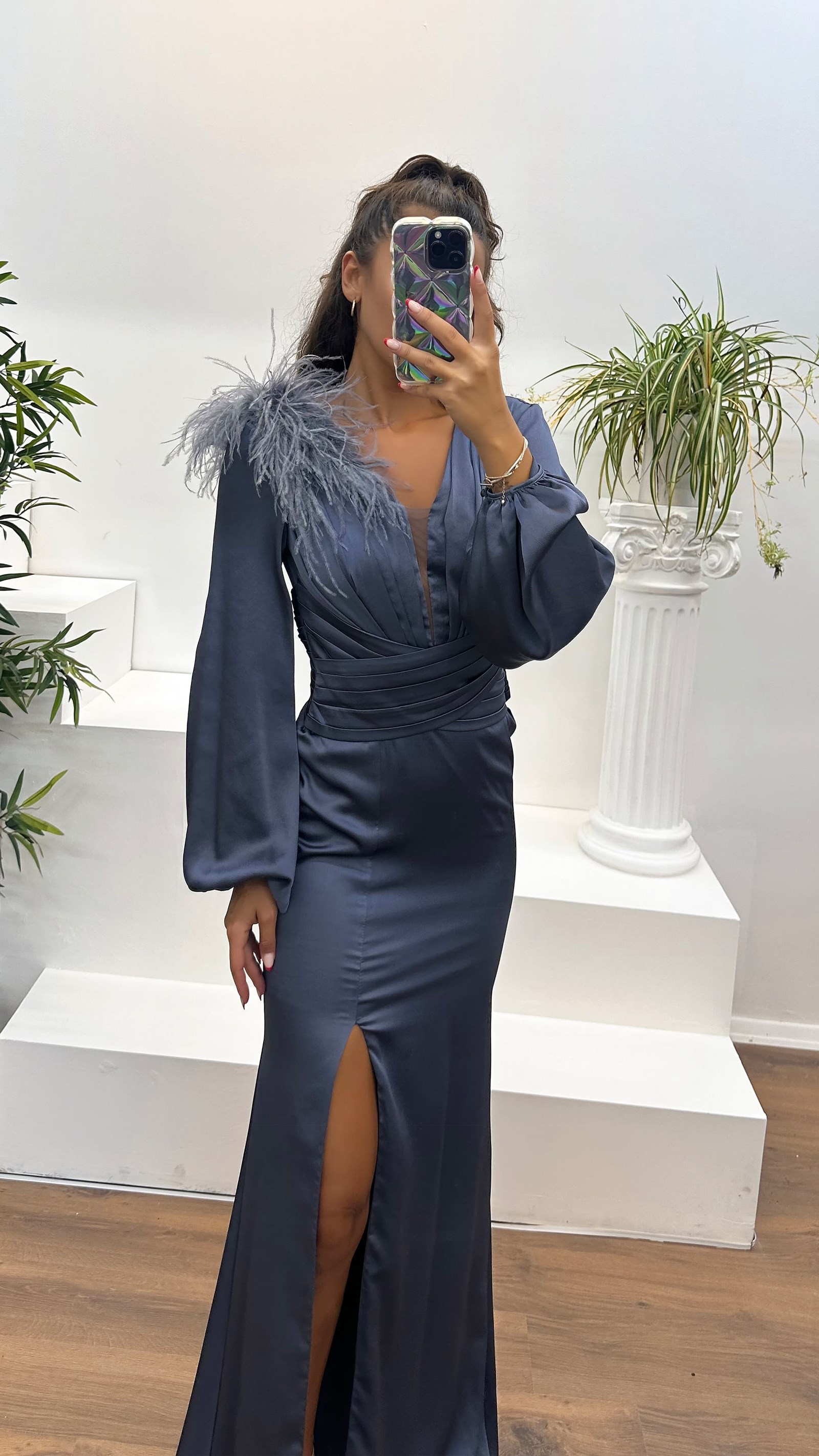Antrasit Uzun Kollu Yaka Tüy Detay Abiye Elbise