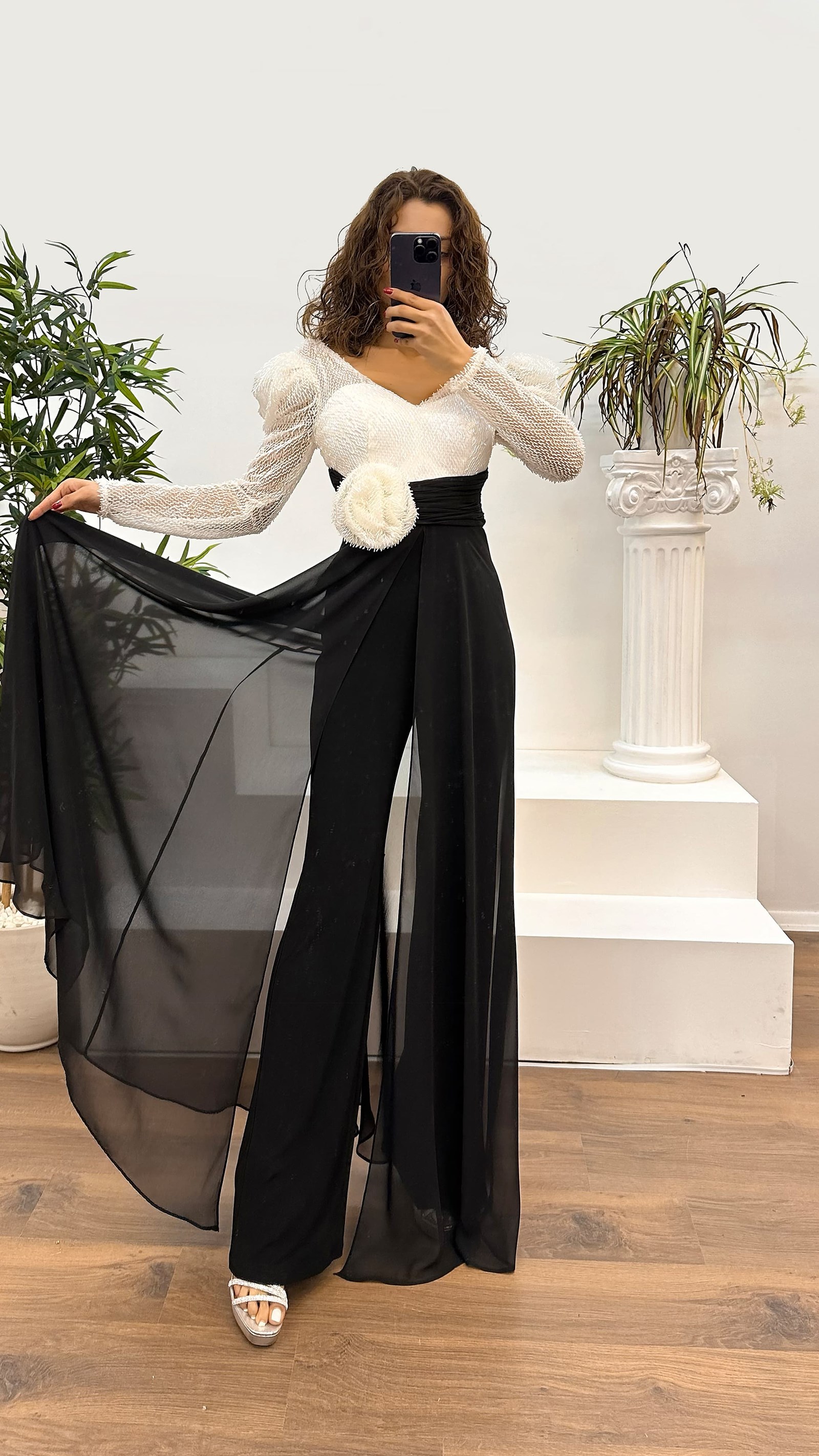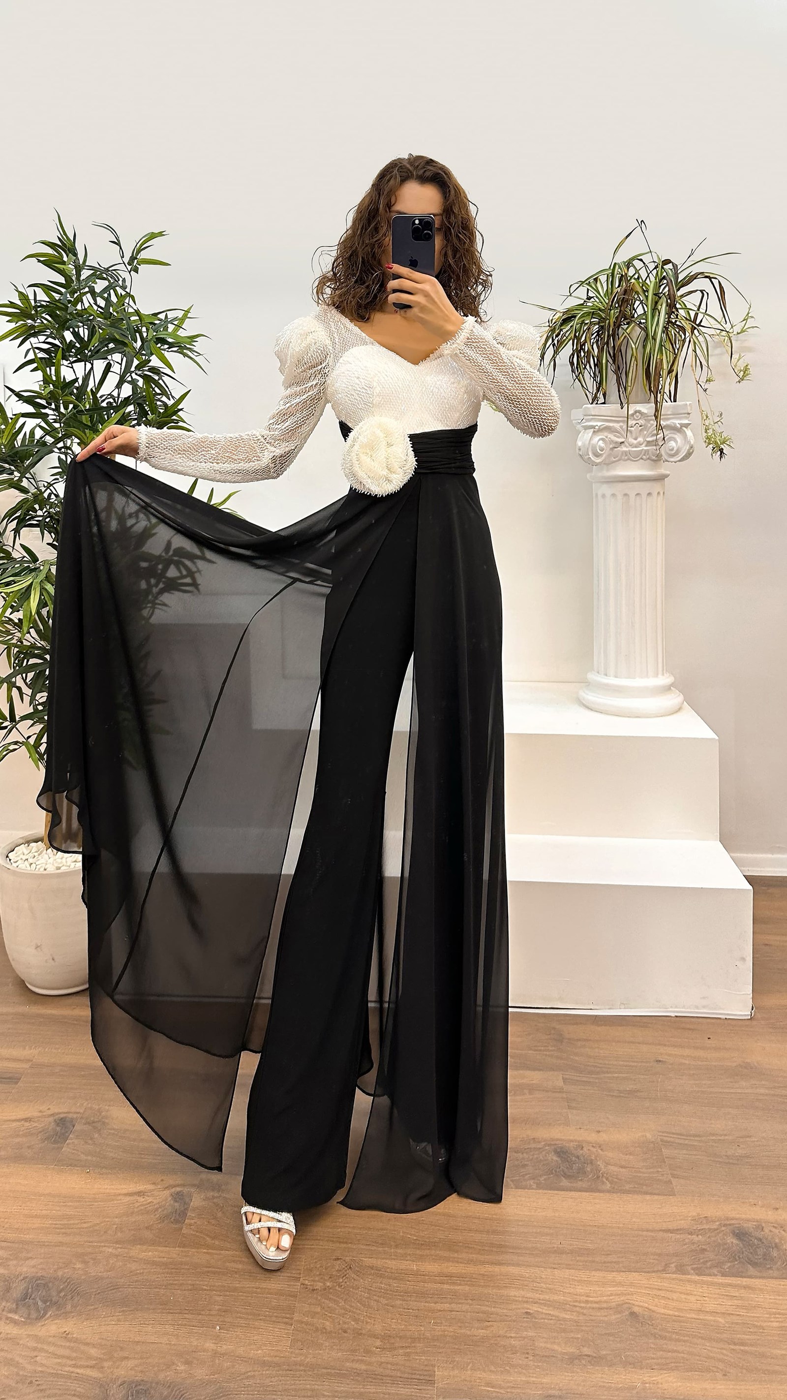 • Beyaz Boncuk İşlemeli V Yakalı Tulum