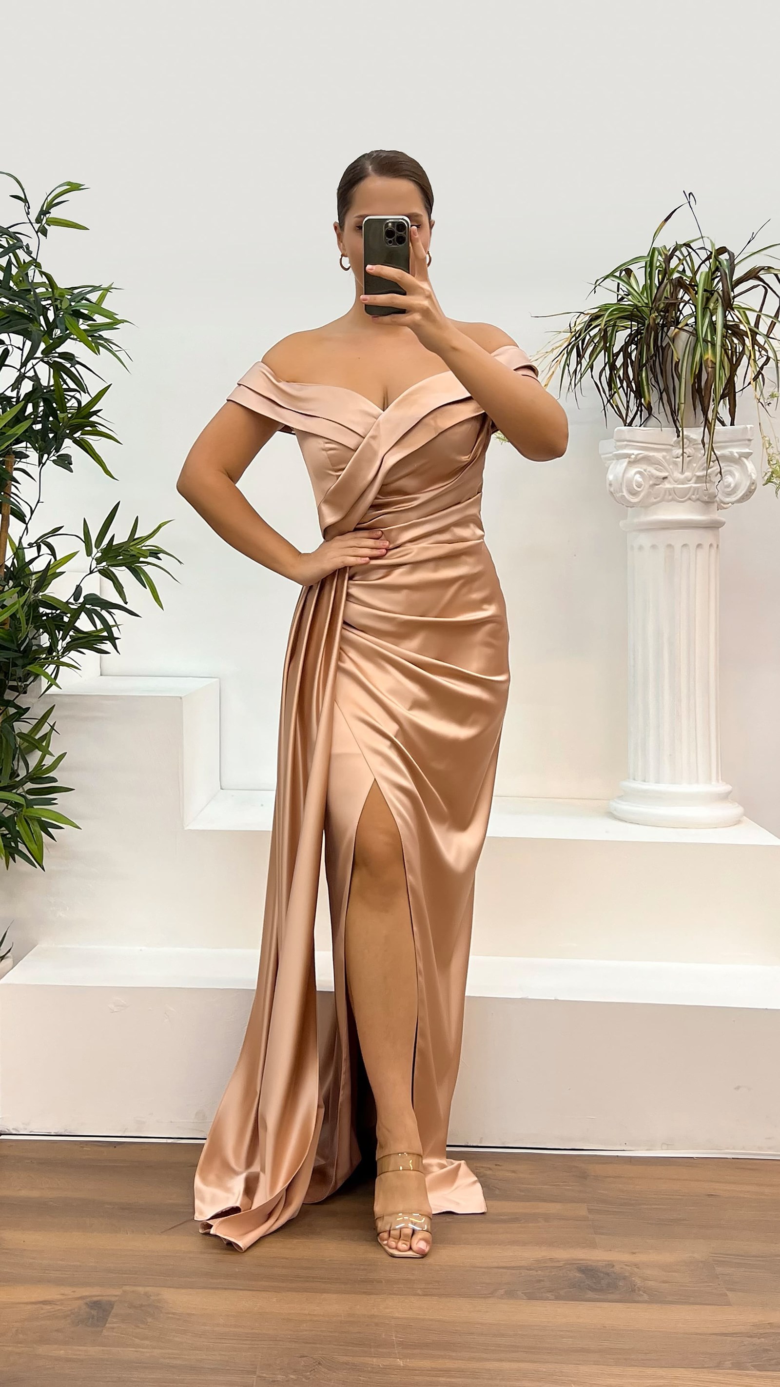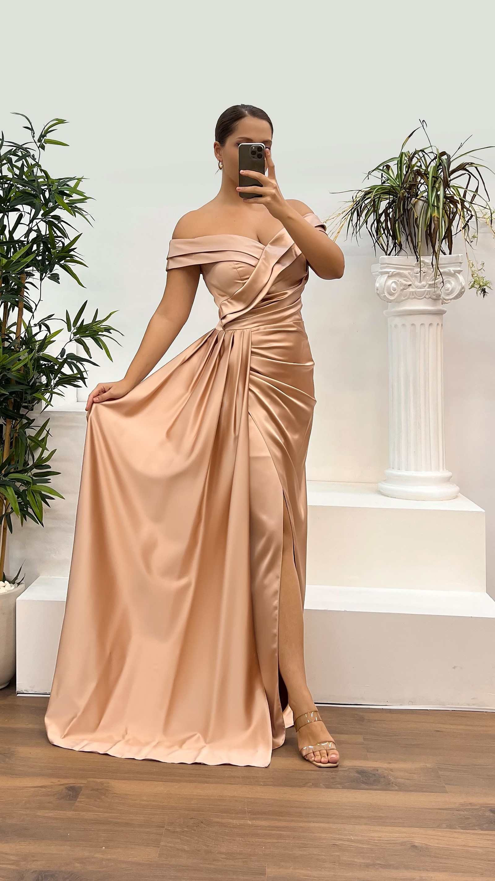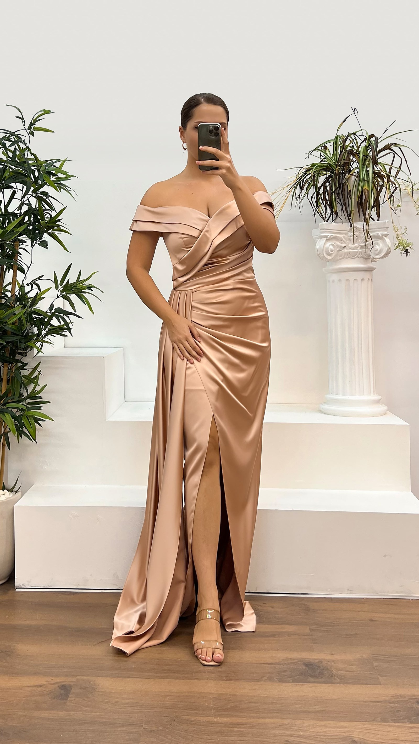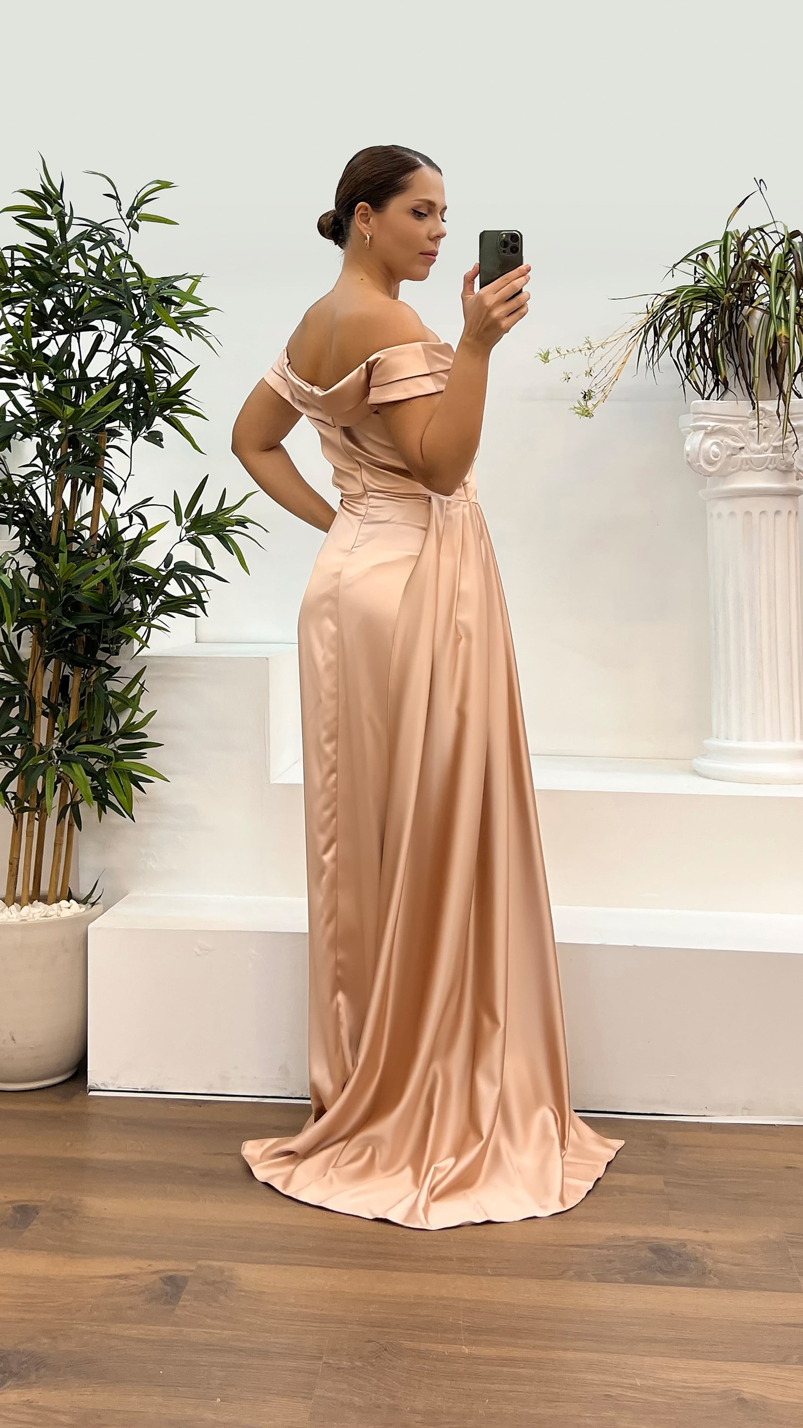 Gold Kayık Yaka Saten Büyük Beden Abiye Elbise