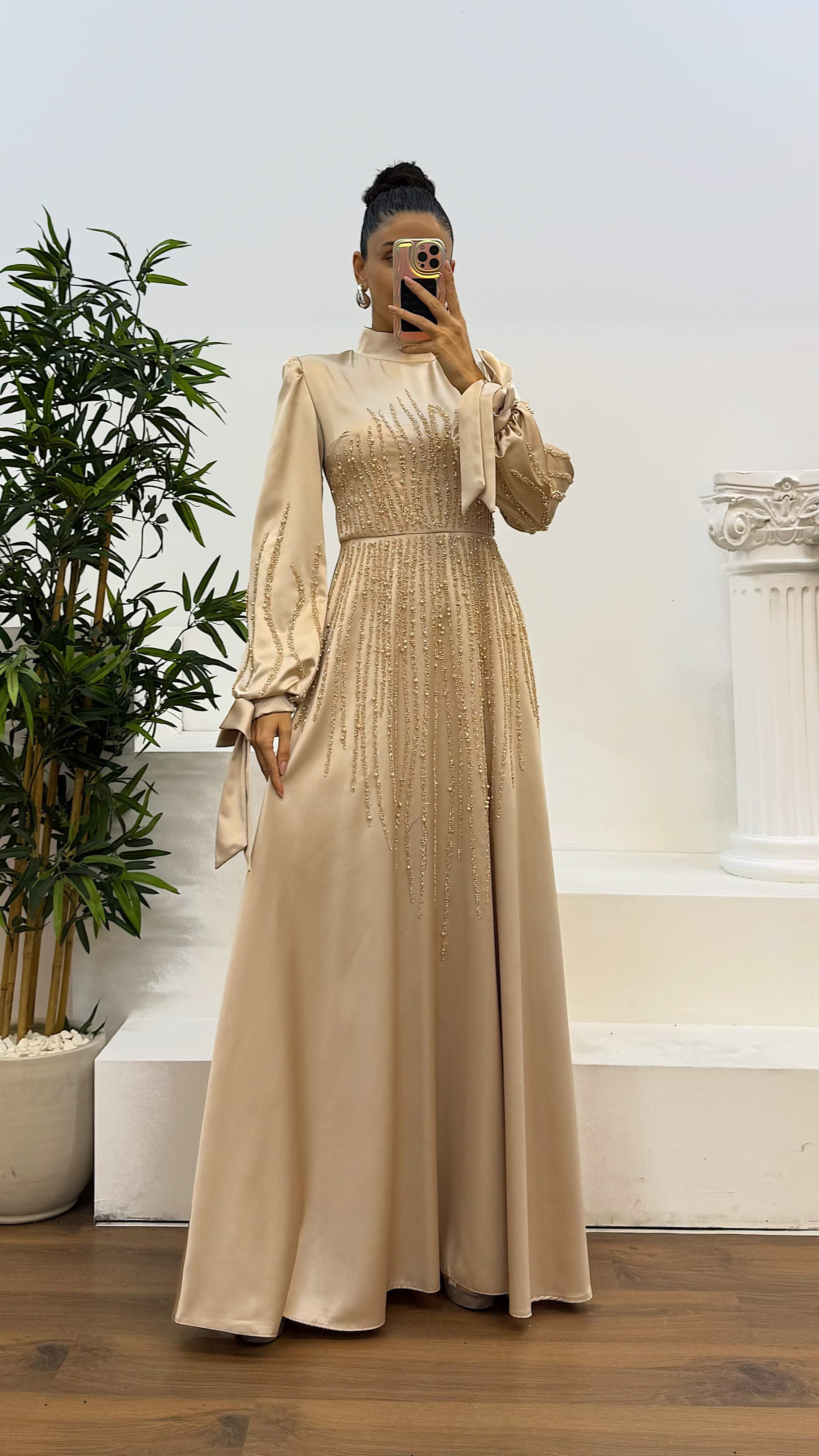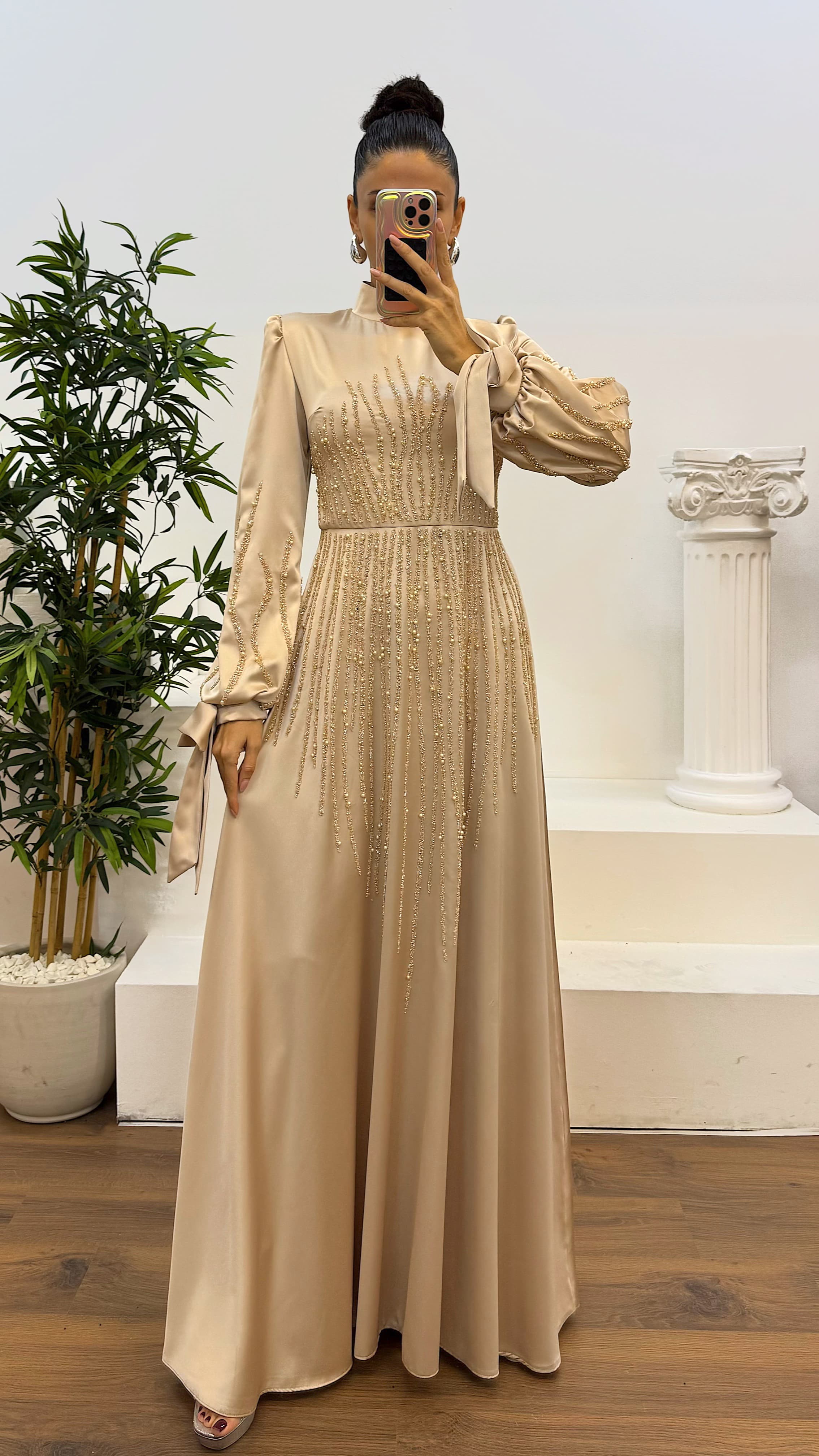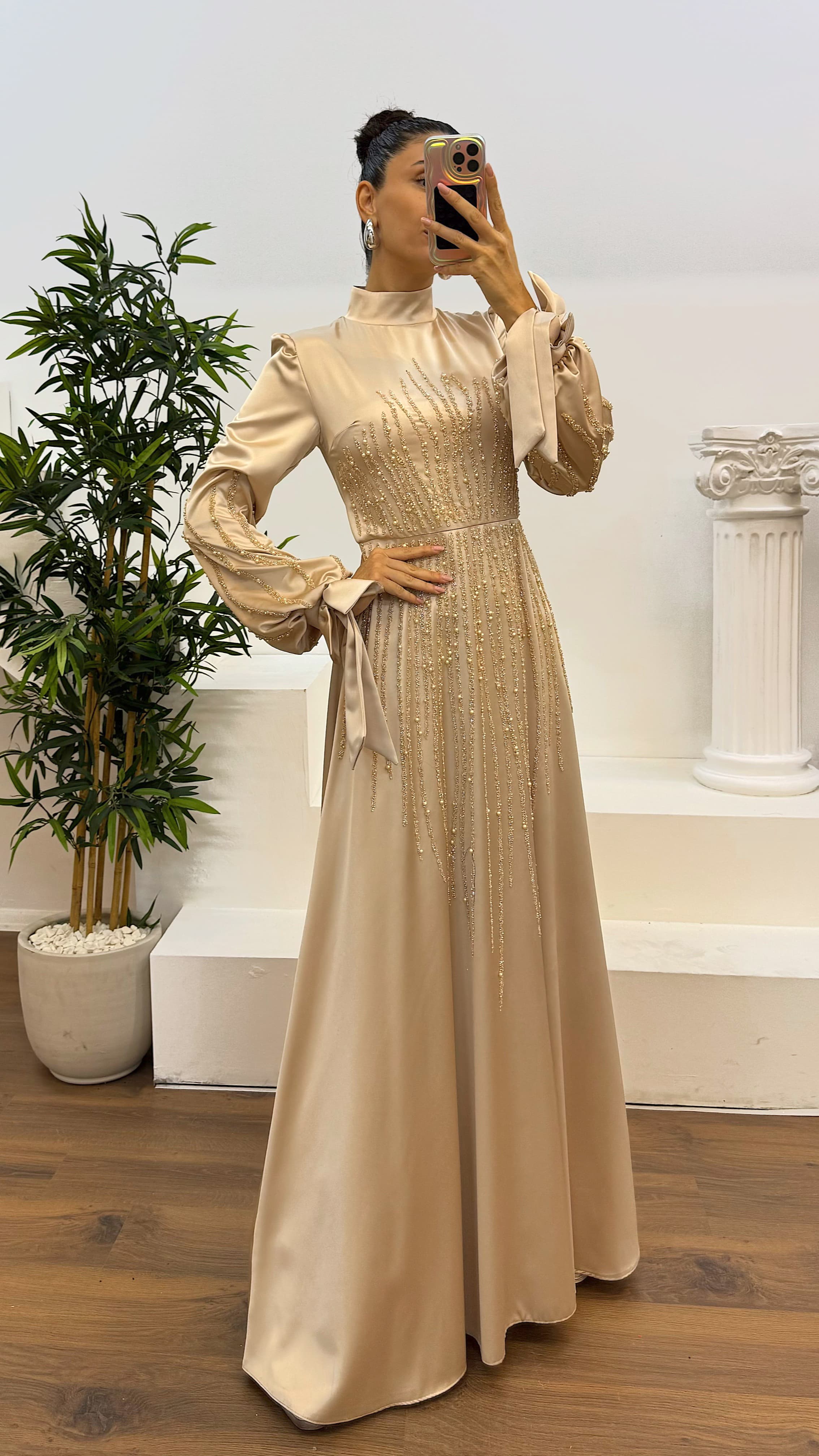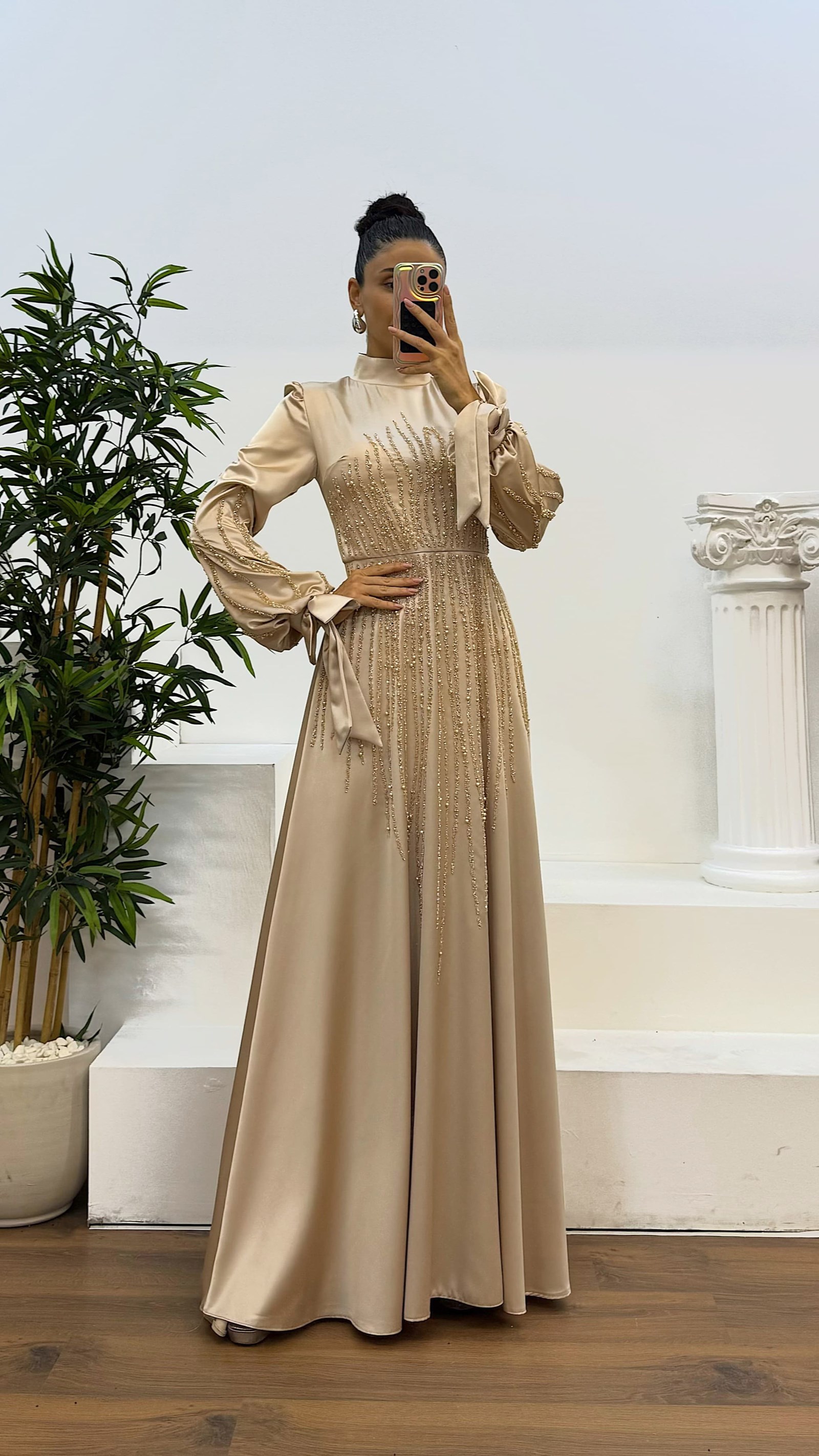 • Gold Balon Kol İşlemeli Tesettür Abiye Elbise