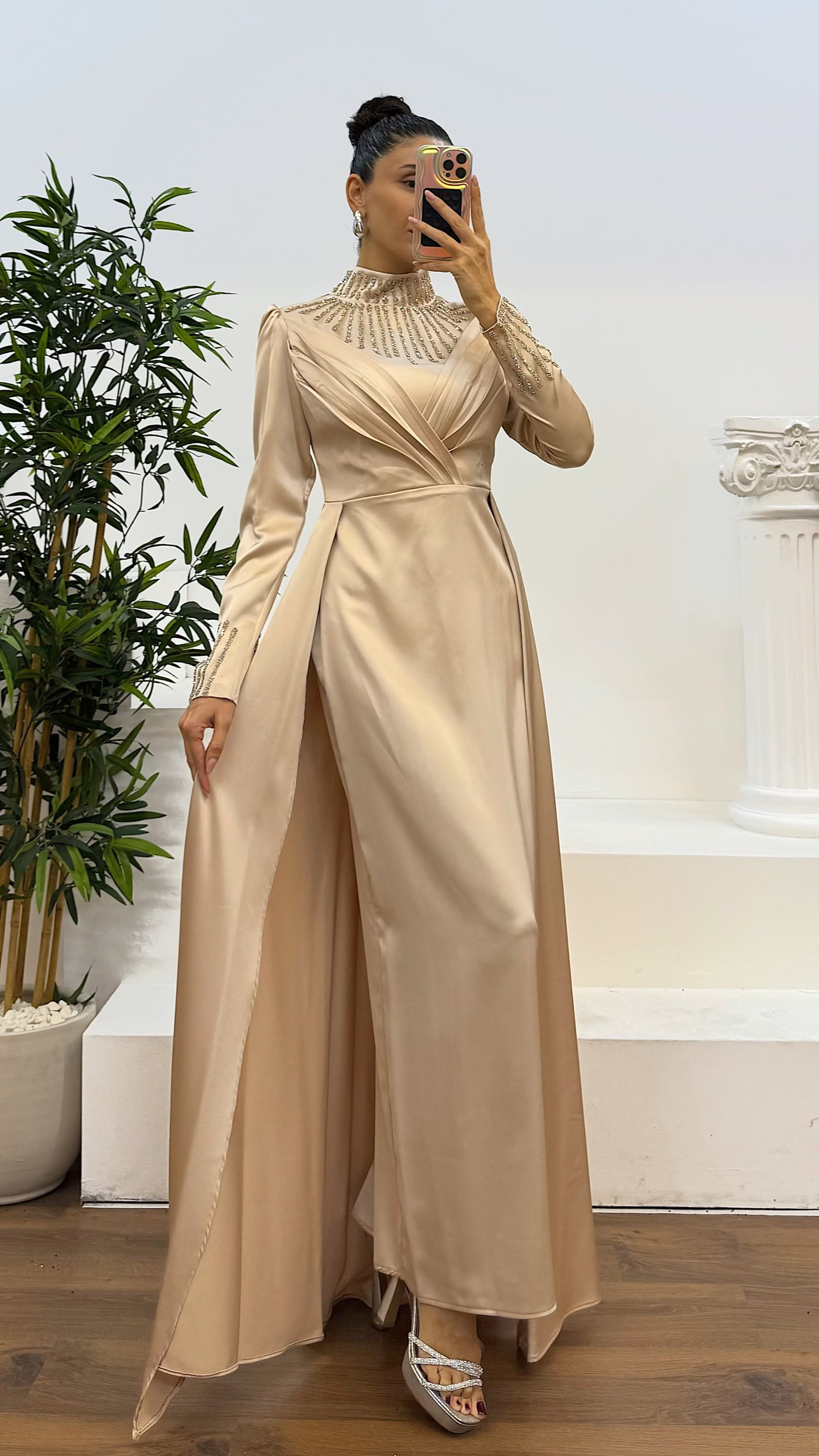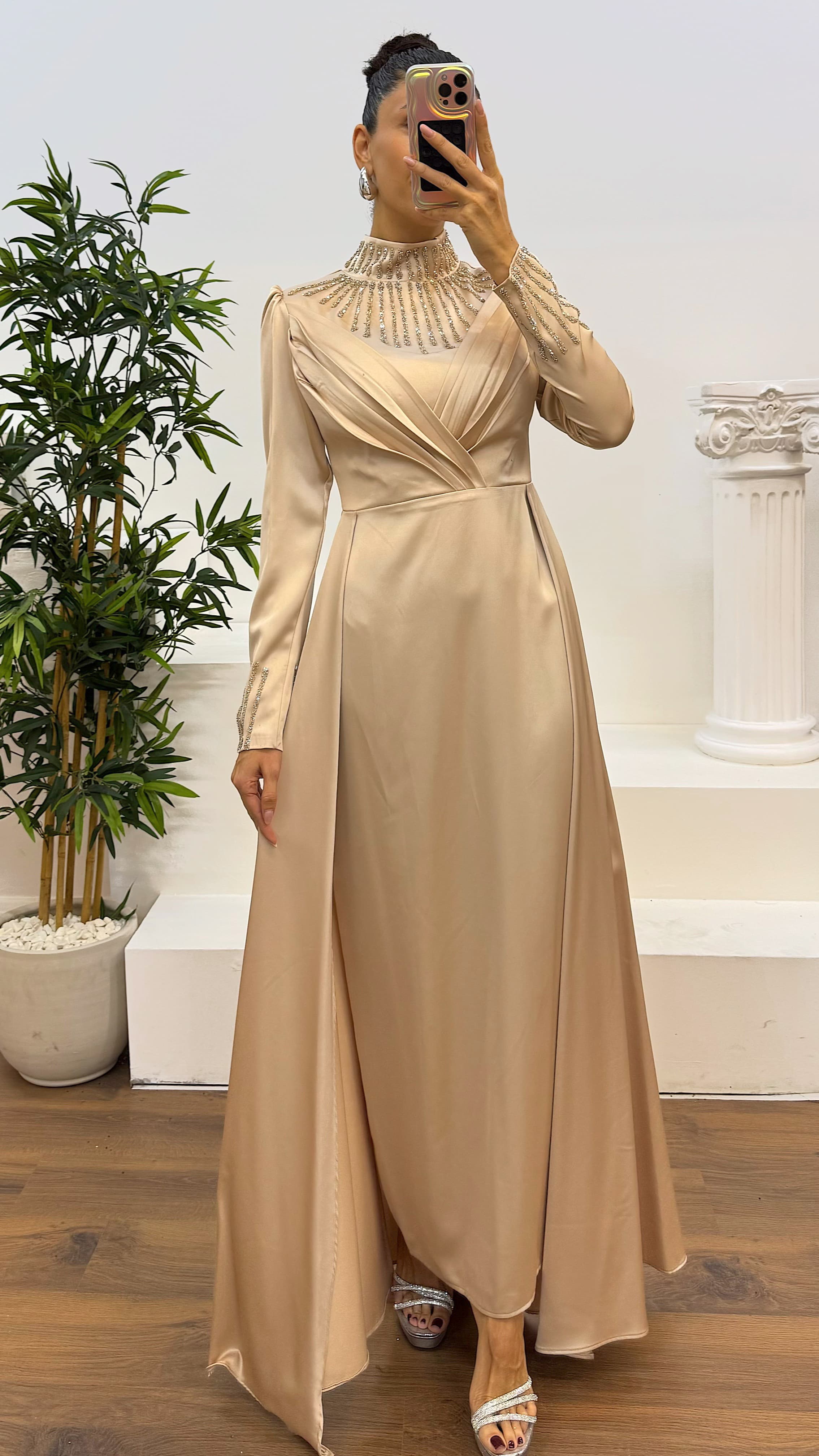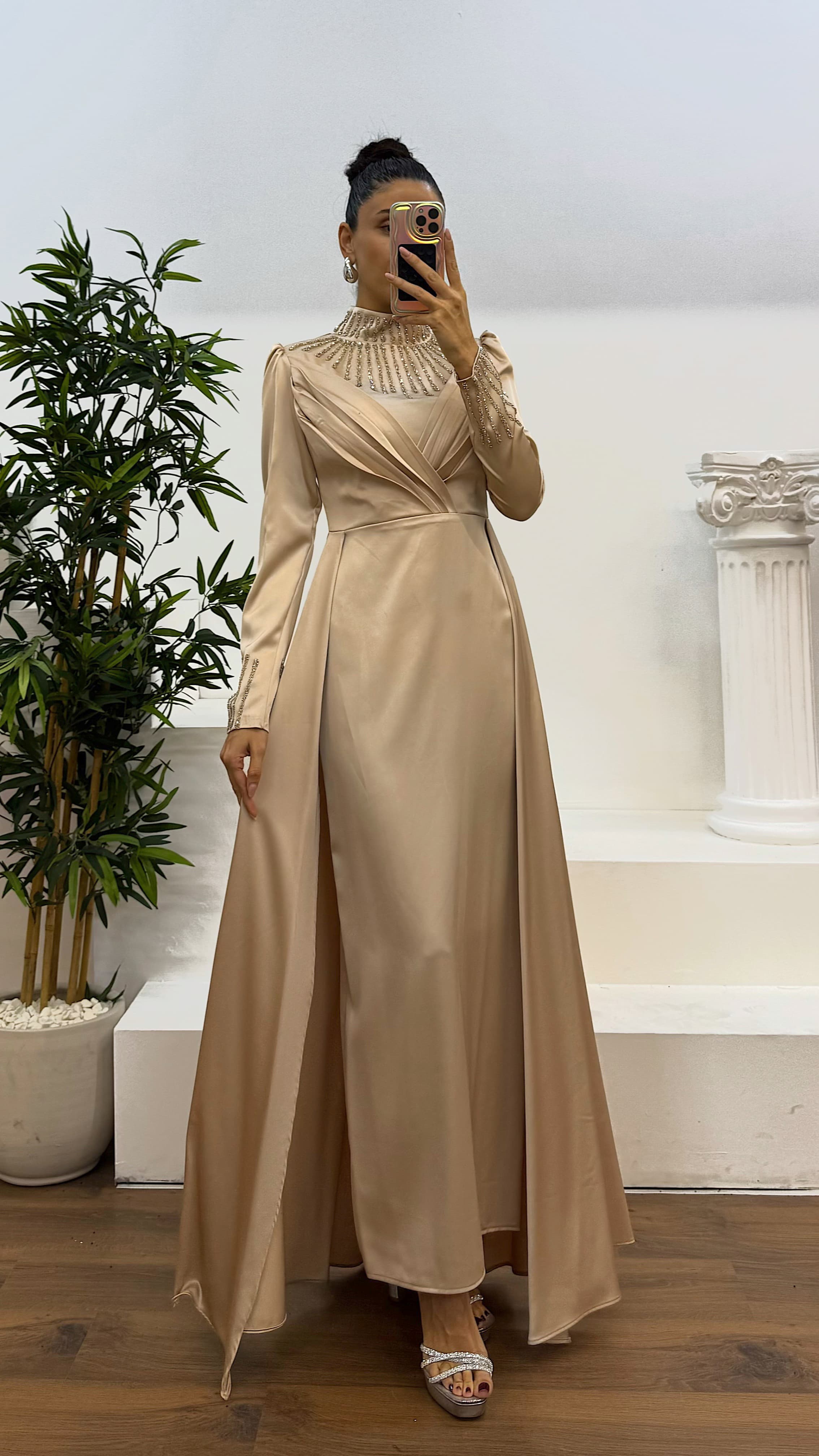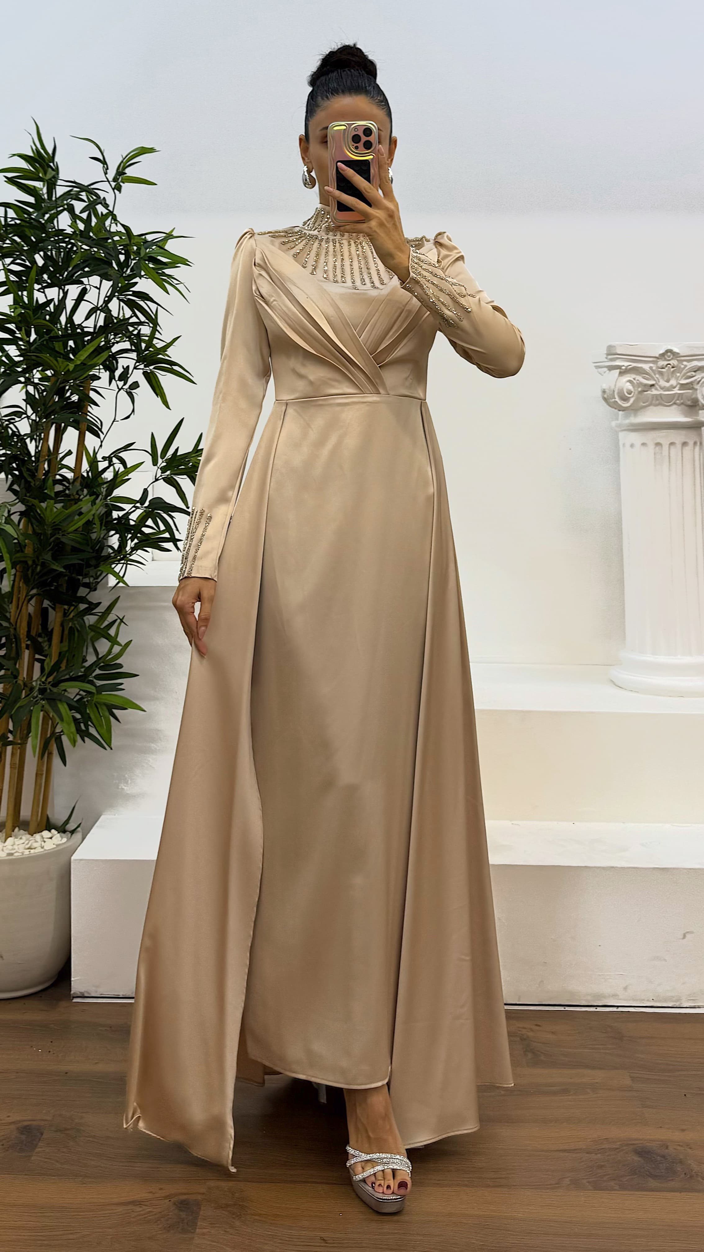 Kol ve boyun işlemeli tesettür abiye elbise